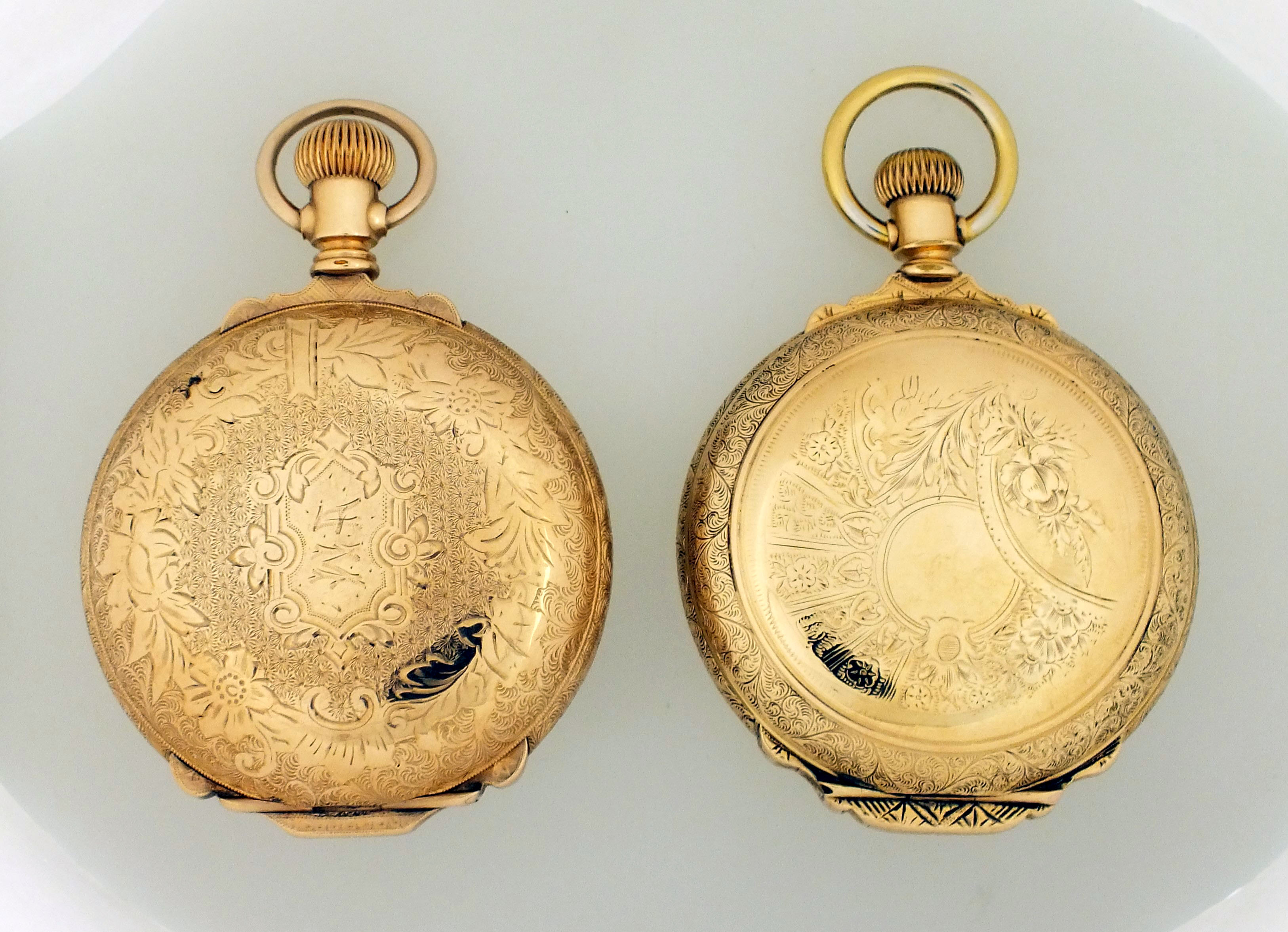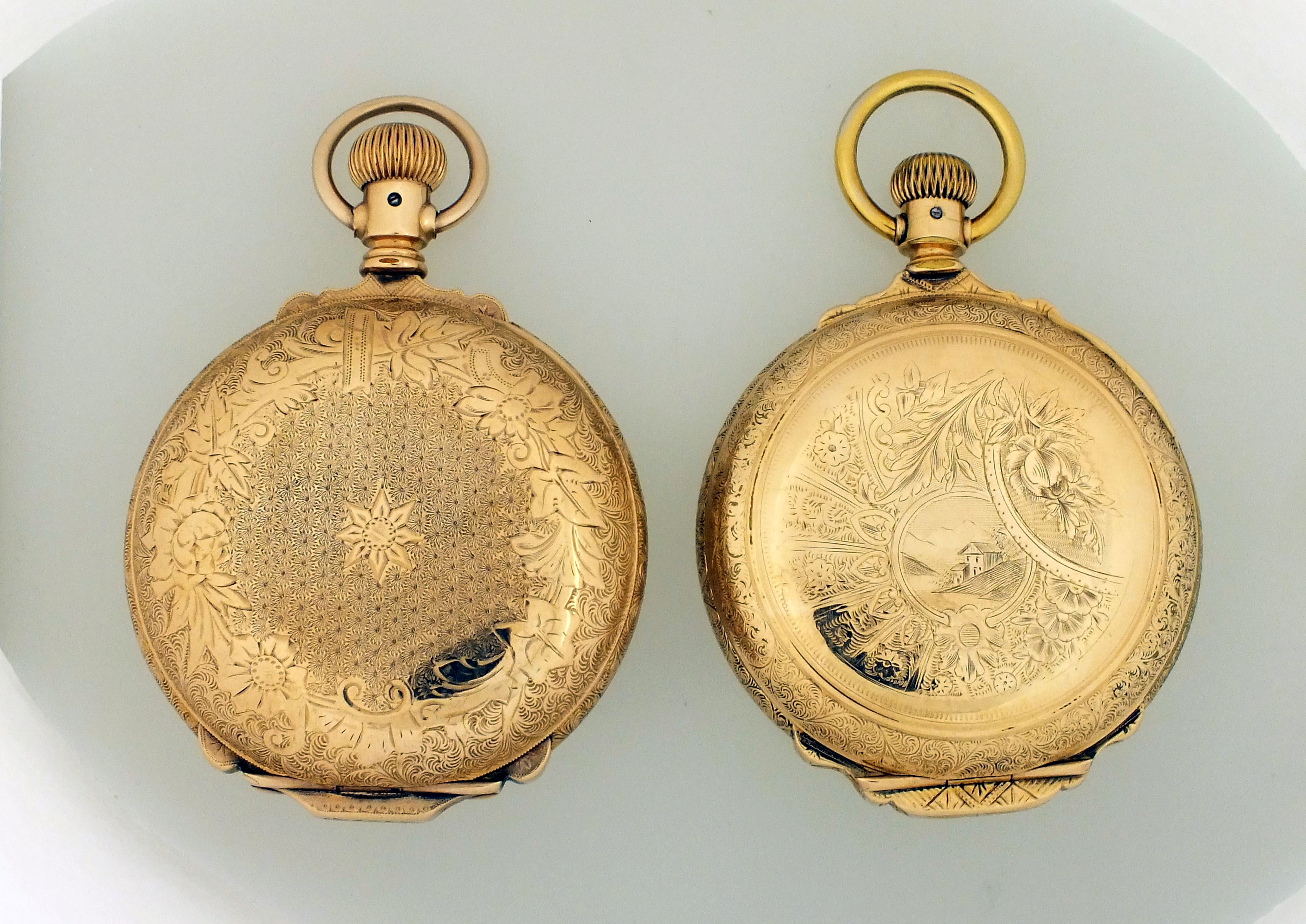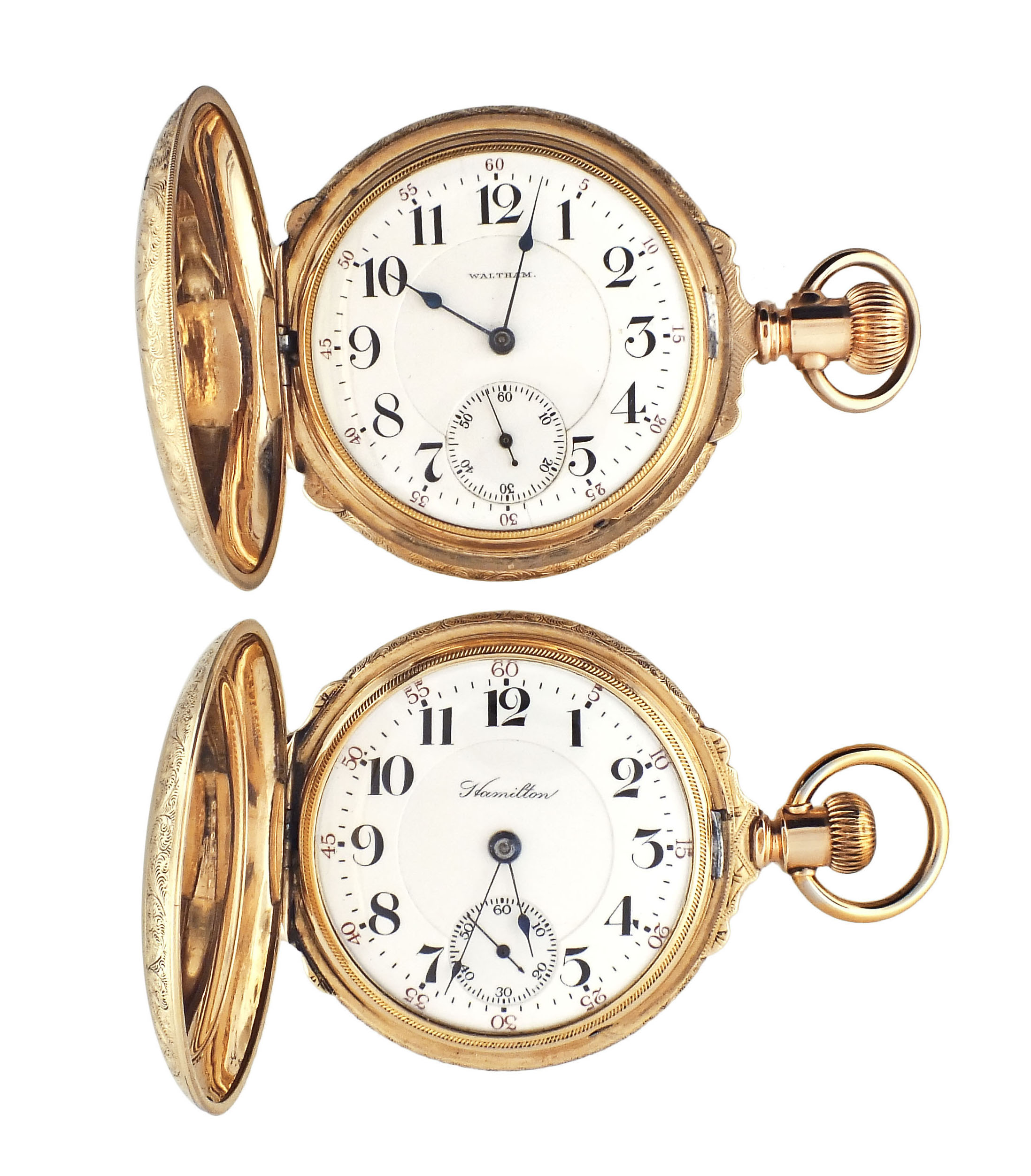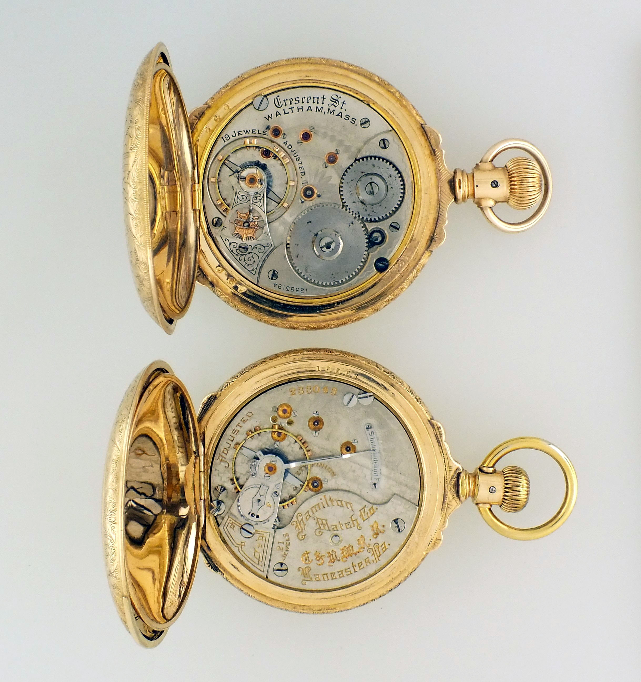2 (Two) American pocket watches, 18 size, arabic numeral enamel dial, damascened nickel movements in gold filled hunting cases, including a Waltham, model 1892, "Crescent St.", 19 jewel, serial #12553194, and a Hamilton, model 2, grade 941, 21 jewel, serial #233043