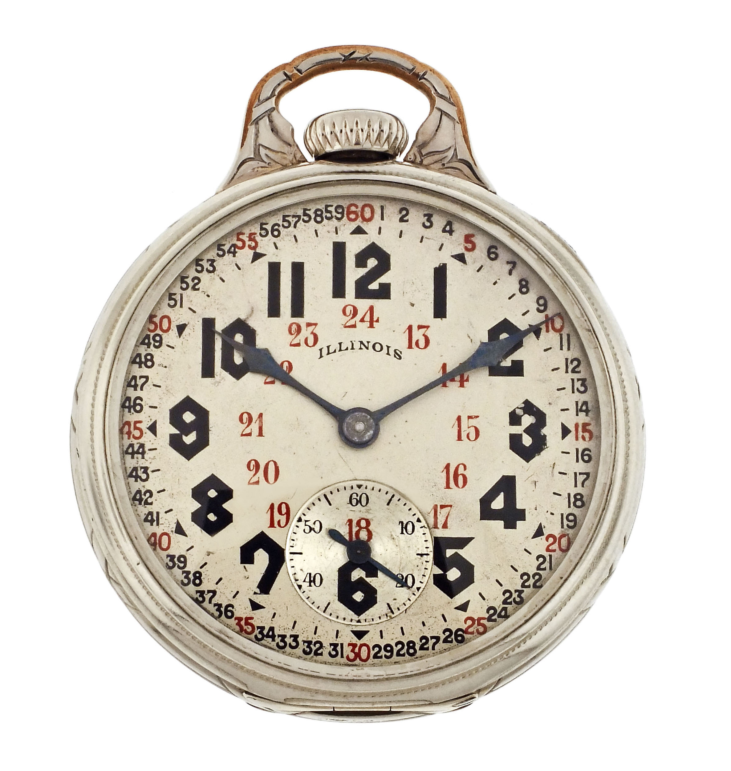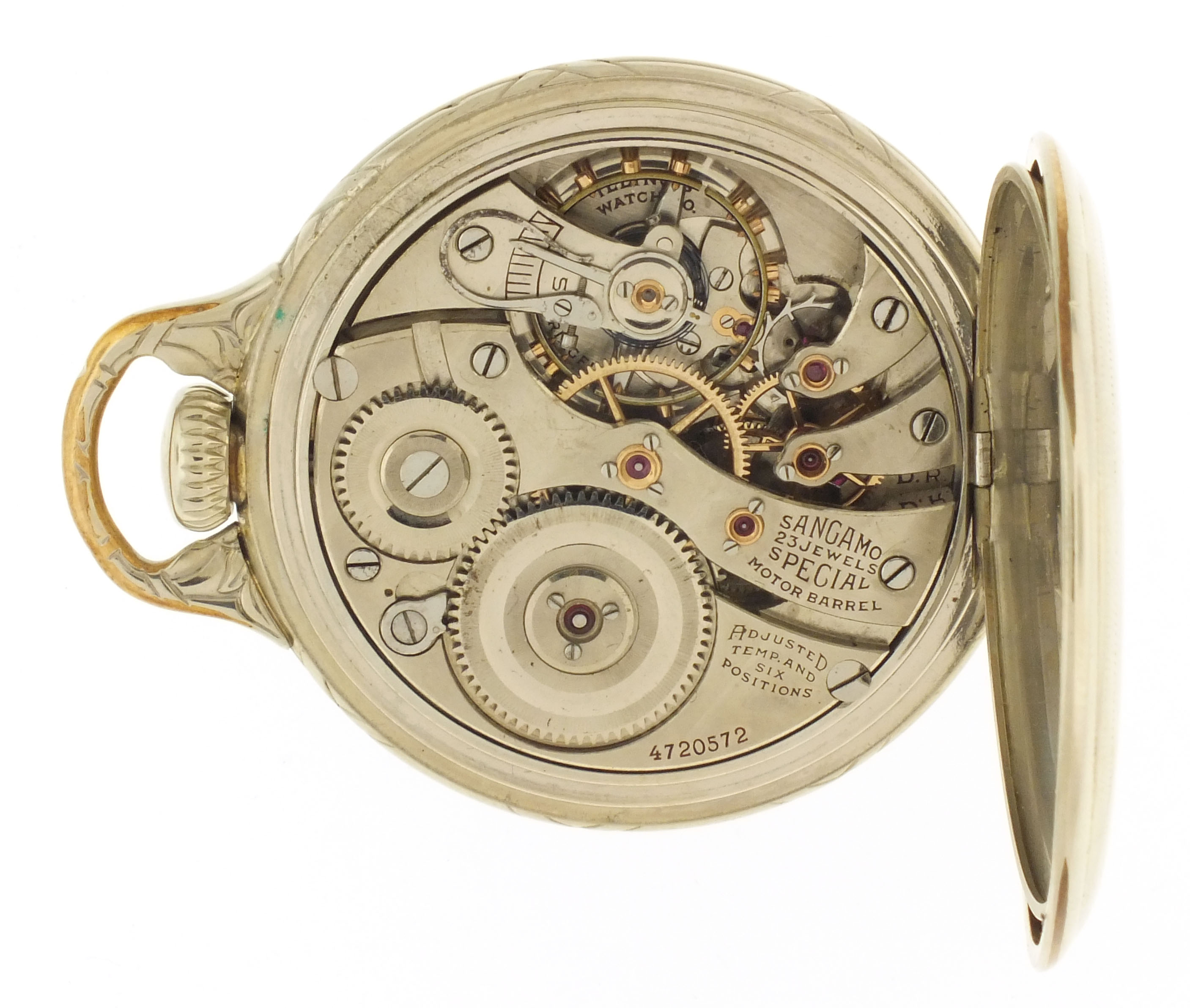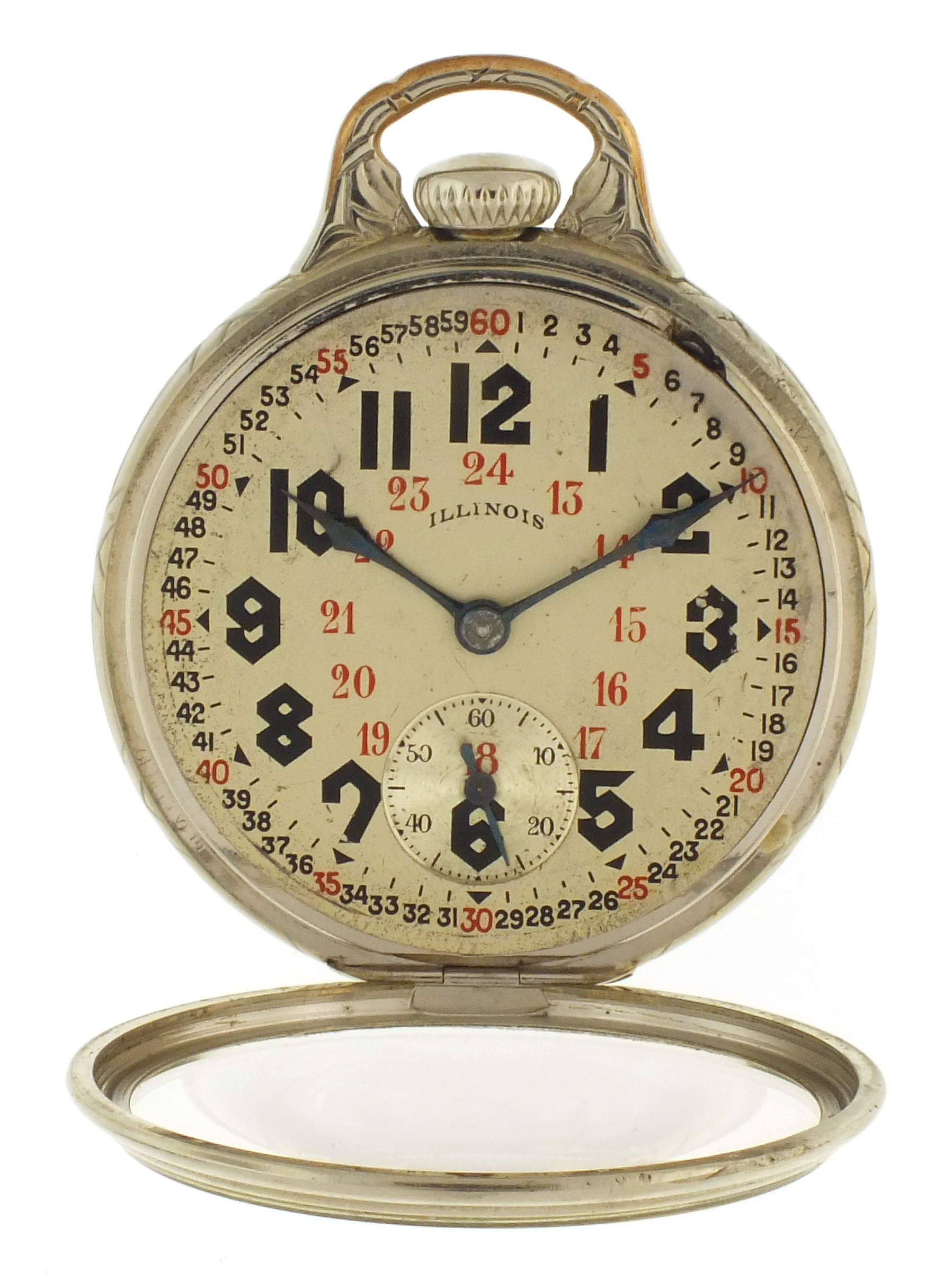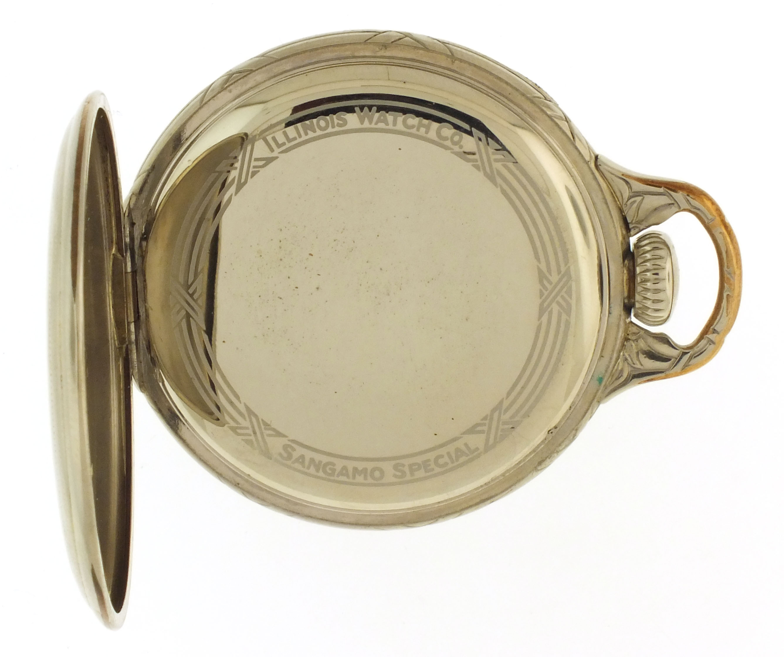 Illinois Watch Co., Springfield, Illinois, an early 20th century 60 hour "Sangamo Special" pocket watch, 17 size, 23 jewels, stem wind and lever set, adjusted to 6 positions, temperature and isochronism, damascened nickel plate movement with lever escapement, cut bimetallic balance with gold screws, gold jewel settings, gold wheel train, and whiplash micrometric regulator in a hinged back and bezel, engraved, open face Sangamo Special case, Canadian 24 hour arabic numeral, single sunk metal dial with marginal minutes, and blued steel Sangamo hands, serial #4720572