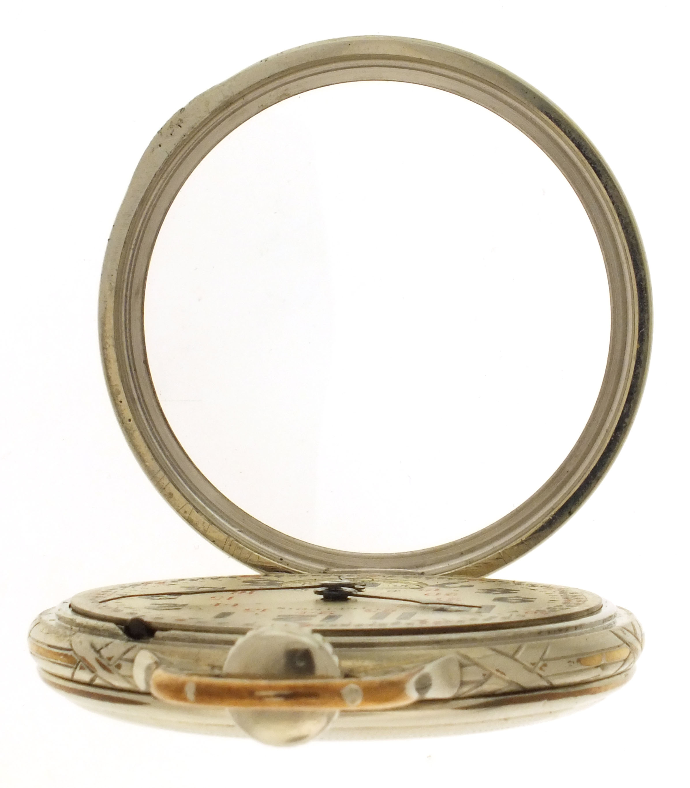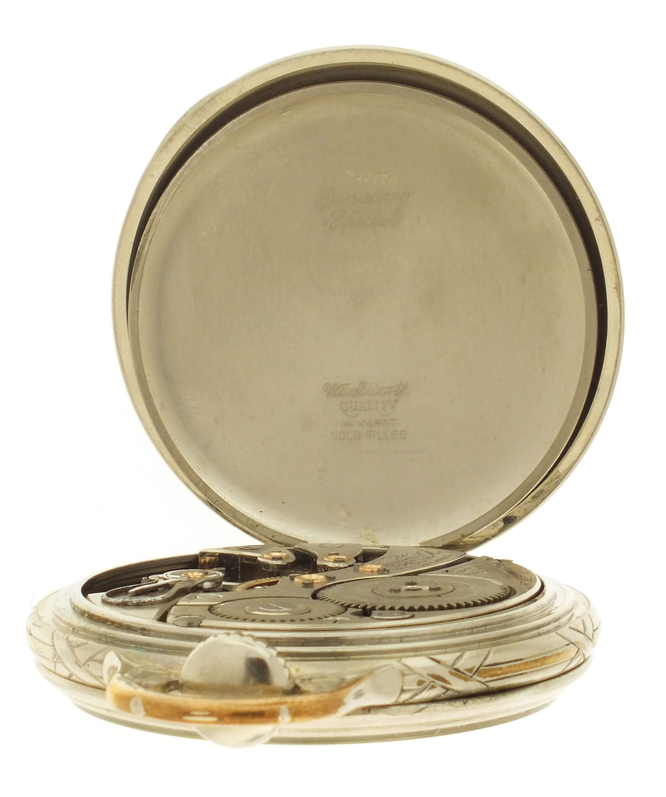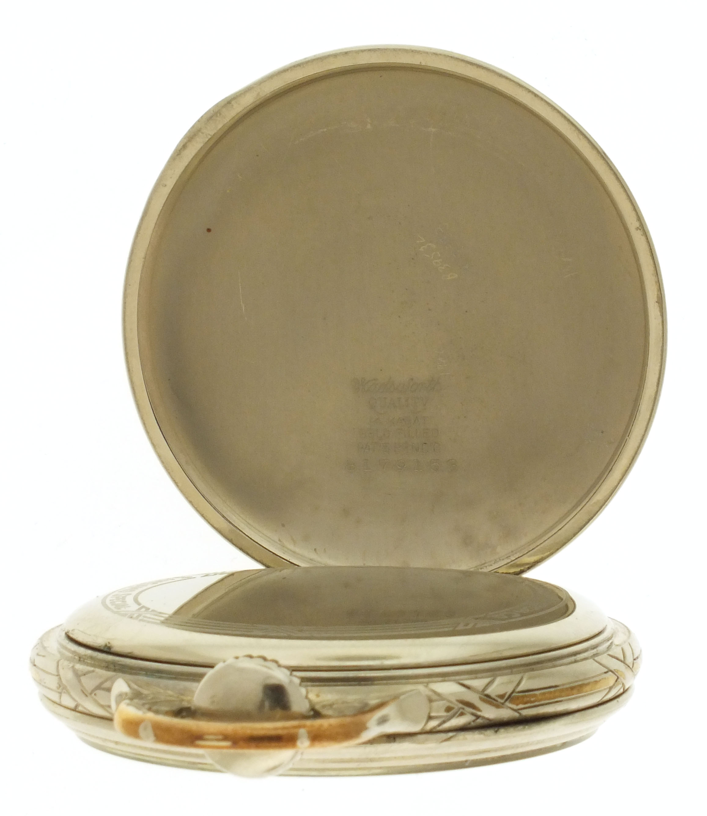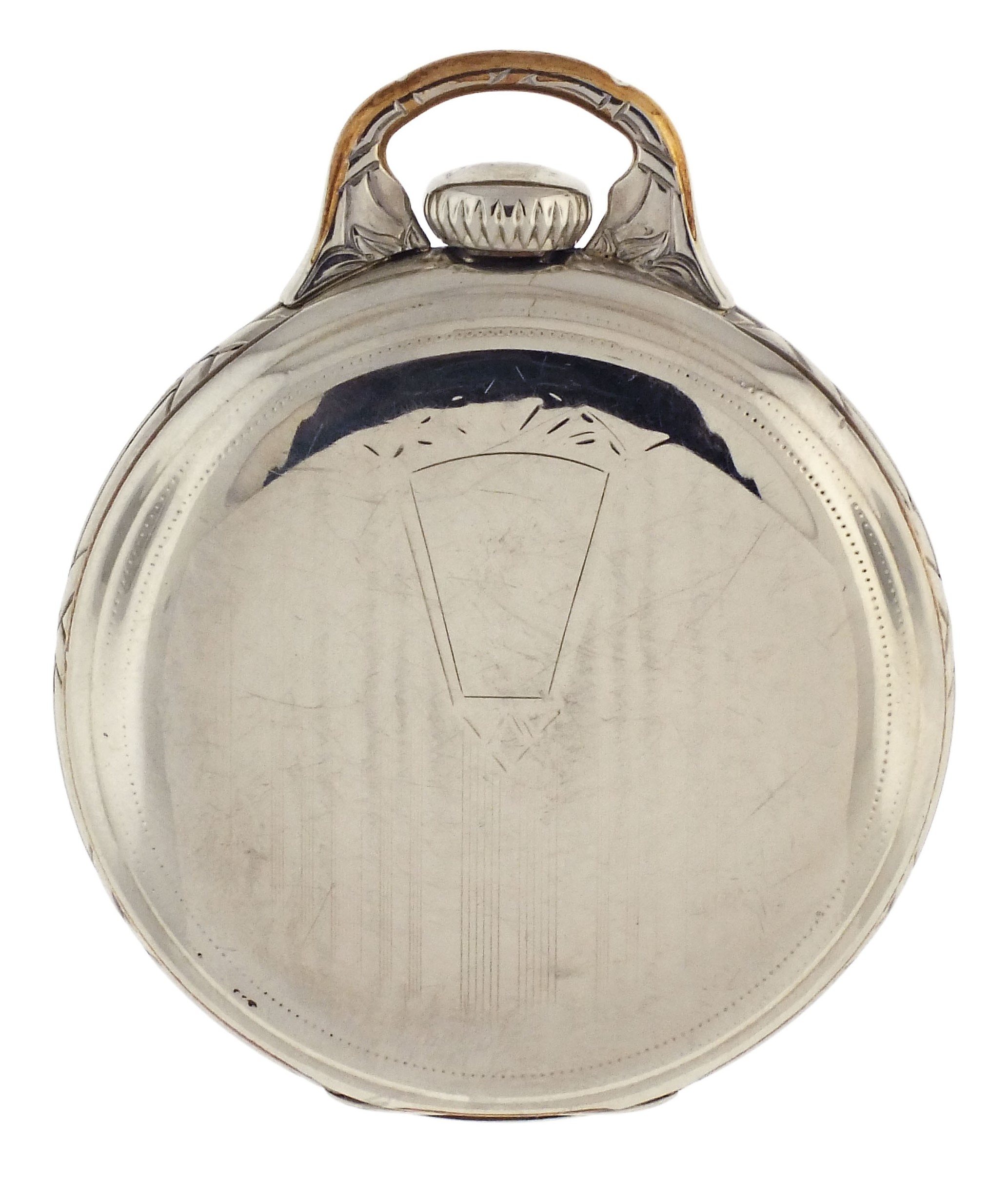 Illinois Watch Co., Springfield, Illinois, an early 20th century 60 hour "Sangamo Special" pocket watch, 17 size, 23 jewels, stem wind and lever set, adjusted to 6 positions, temperature and isochronism, damascened nickel plate movement with lever escapement, cut bimetallic balance with gold screws, gold jewel settings, gold wheel train, and whiplash micrometric regulator in a hinged back and bezel, engraved, open face Sangamo Special case, Canadian 24 hour arabic numeral, single sunk metal dial with marginal minutes, and blued steel Sangamo hands, serial #4720572