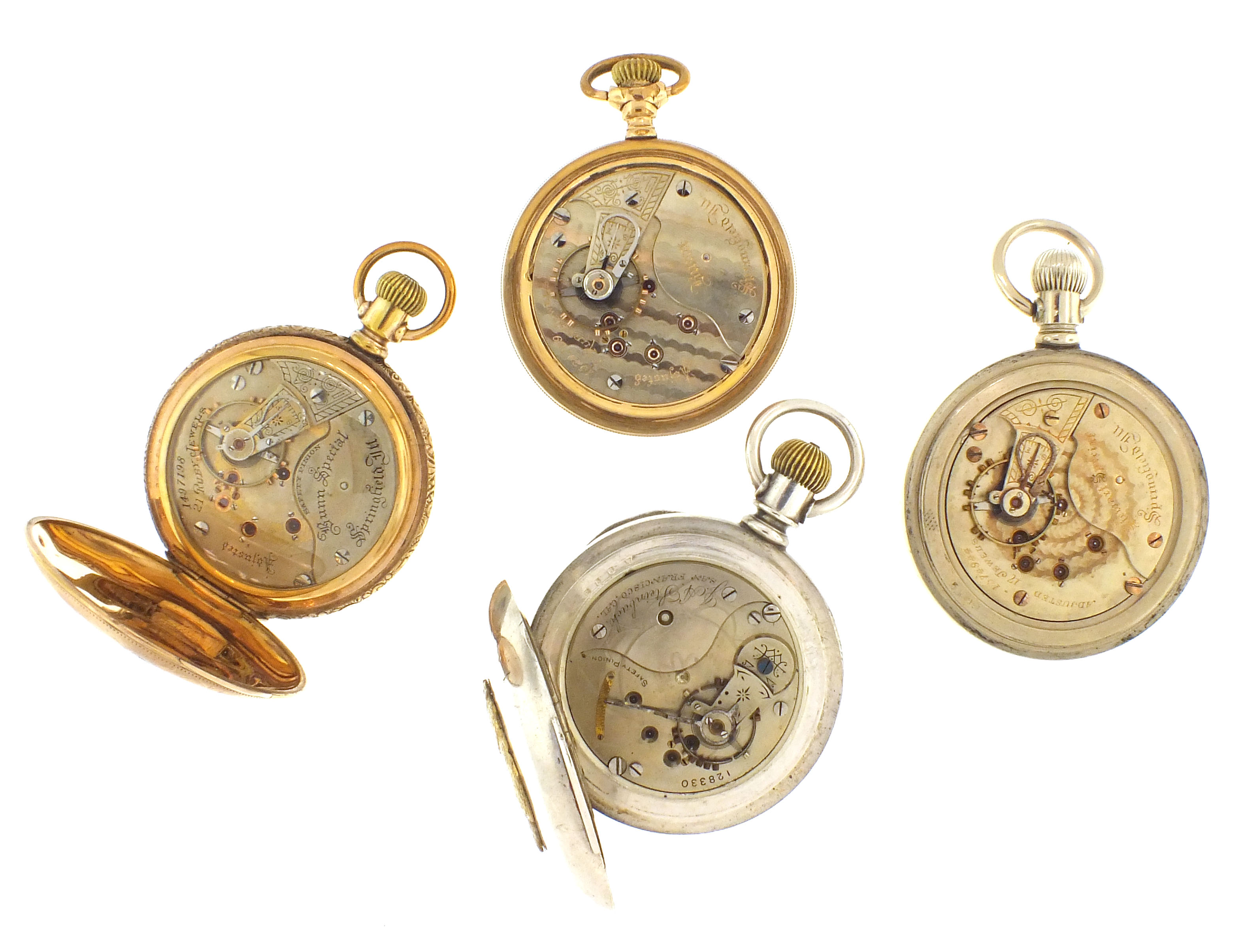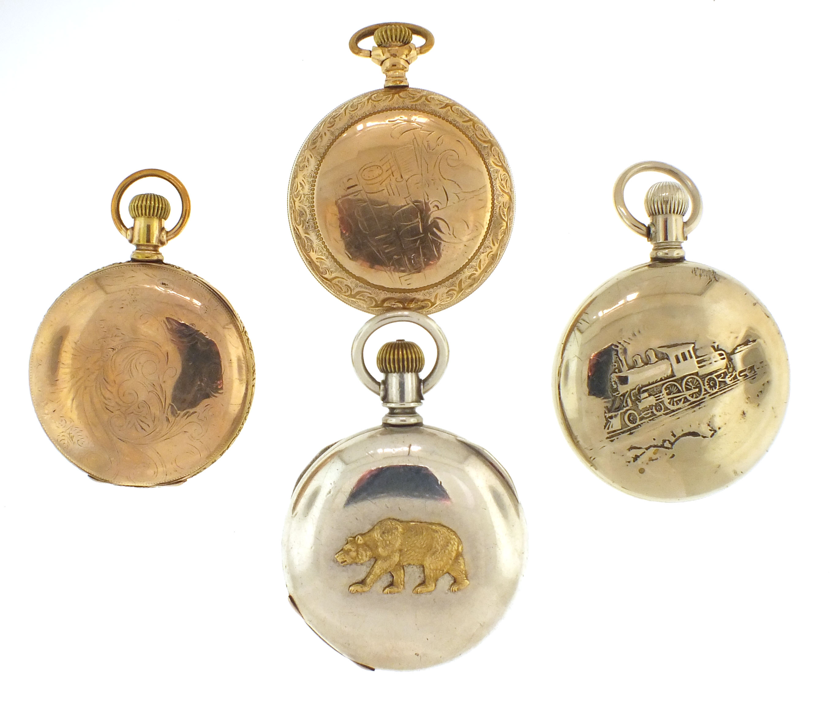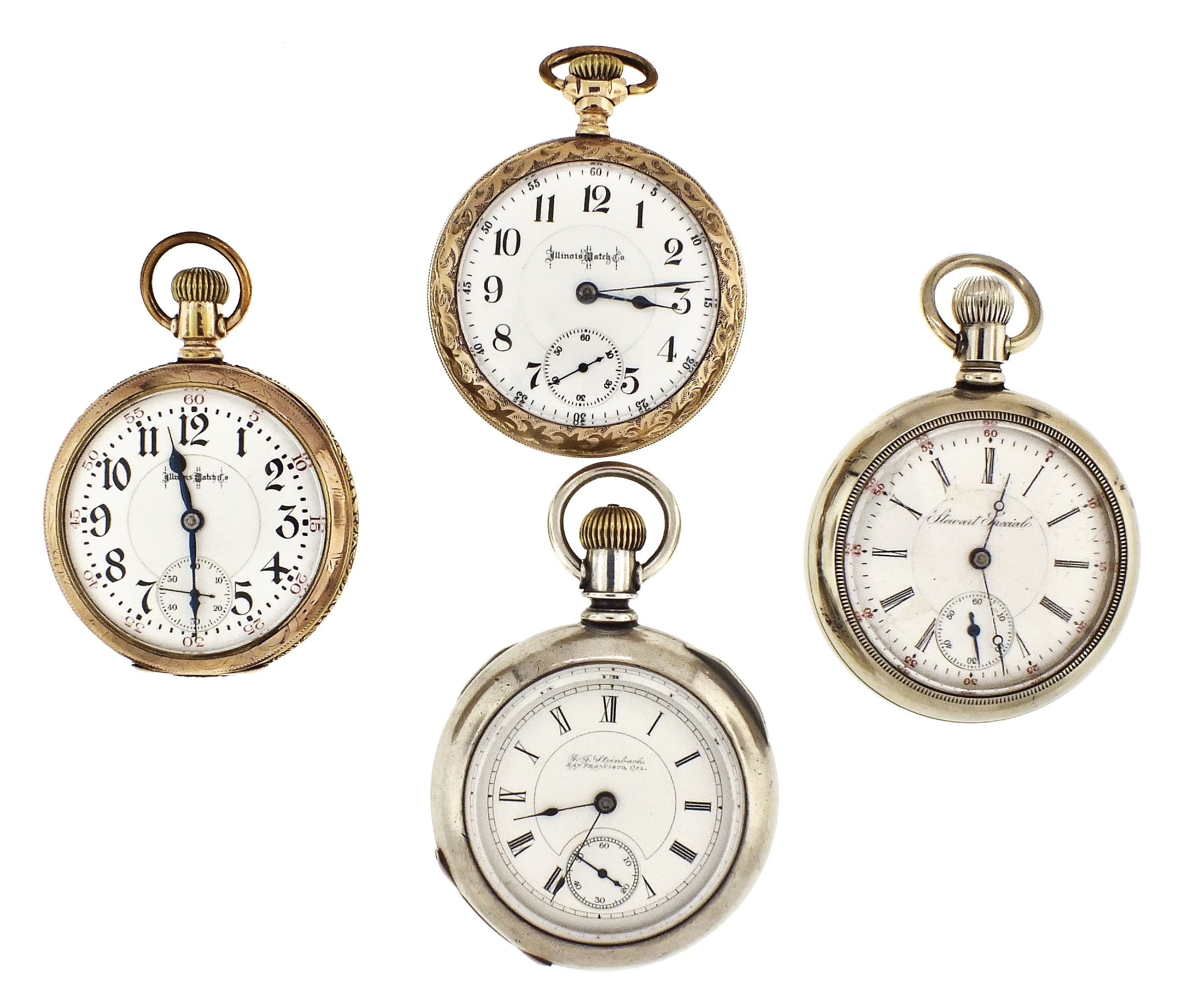 4 (Four) American pocket watches, 18 size, roman and arabic numeral white enamel dials, damascened movements, open face and hunting case, including a Columbus, 15 jewel movement in coin silver case with gold bear in relief, serial #128330, an Illinois, model 6, "Bunn Special" 21 jewel movement in gold filled case, serial #1497198, an Illinois, model 6, "Bunn", 17 jewel movement in gold filled case, serial #1529709, an Illinois, model 6, grade 64, 17 jewel movement in nickel case, serial #1574944
