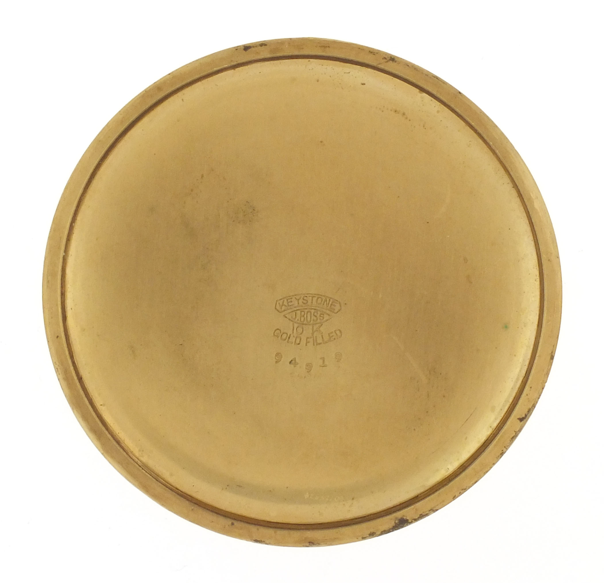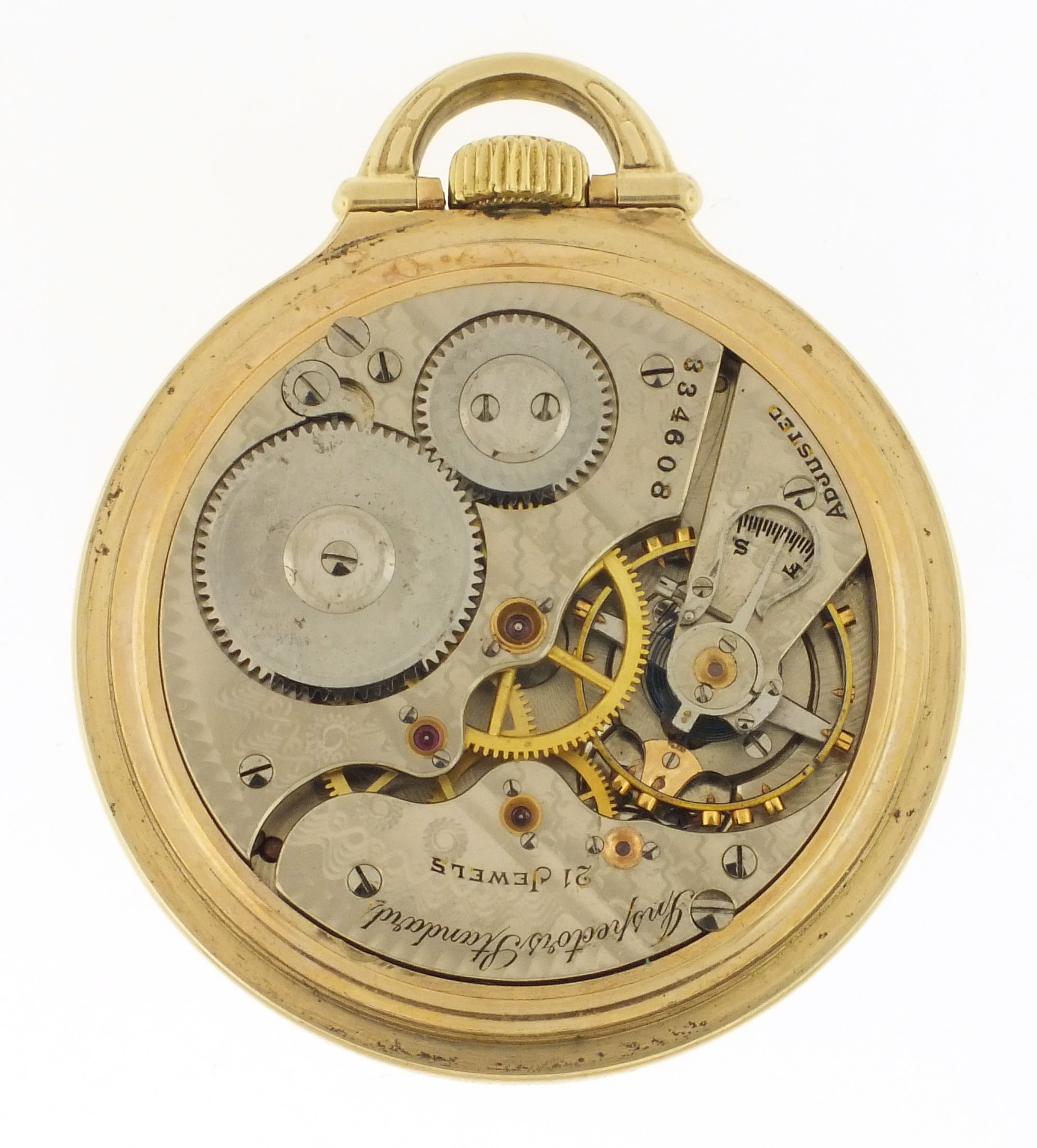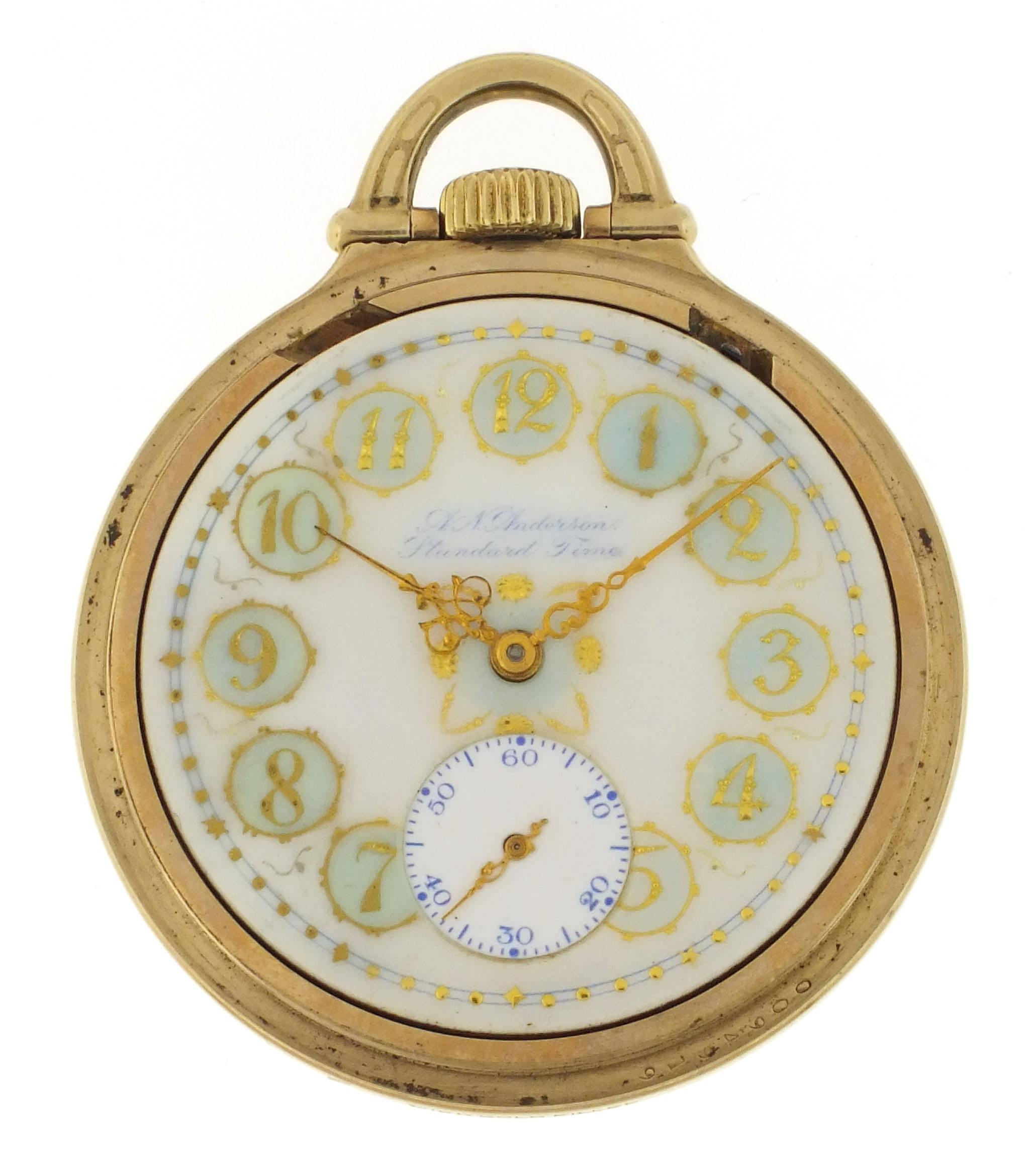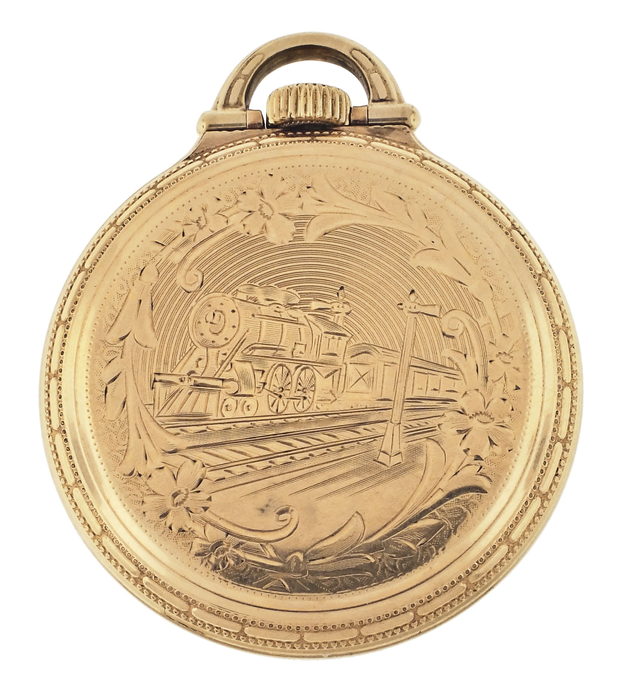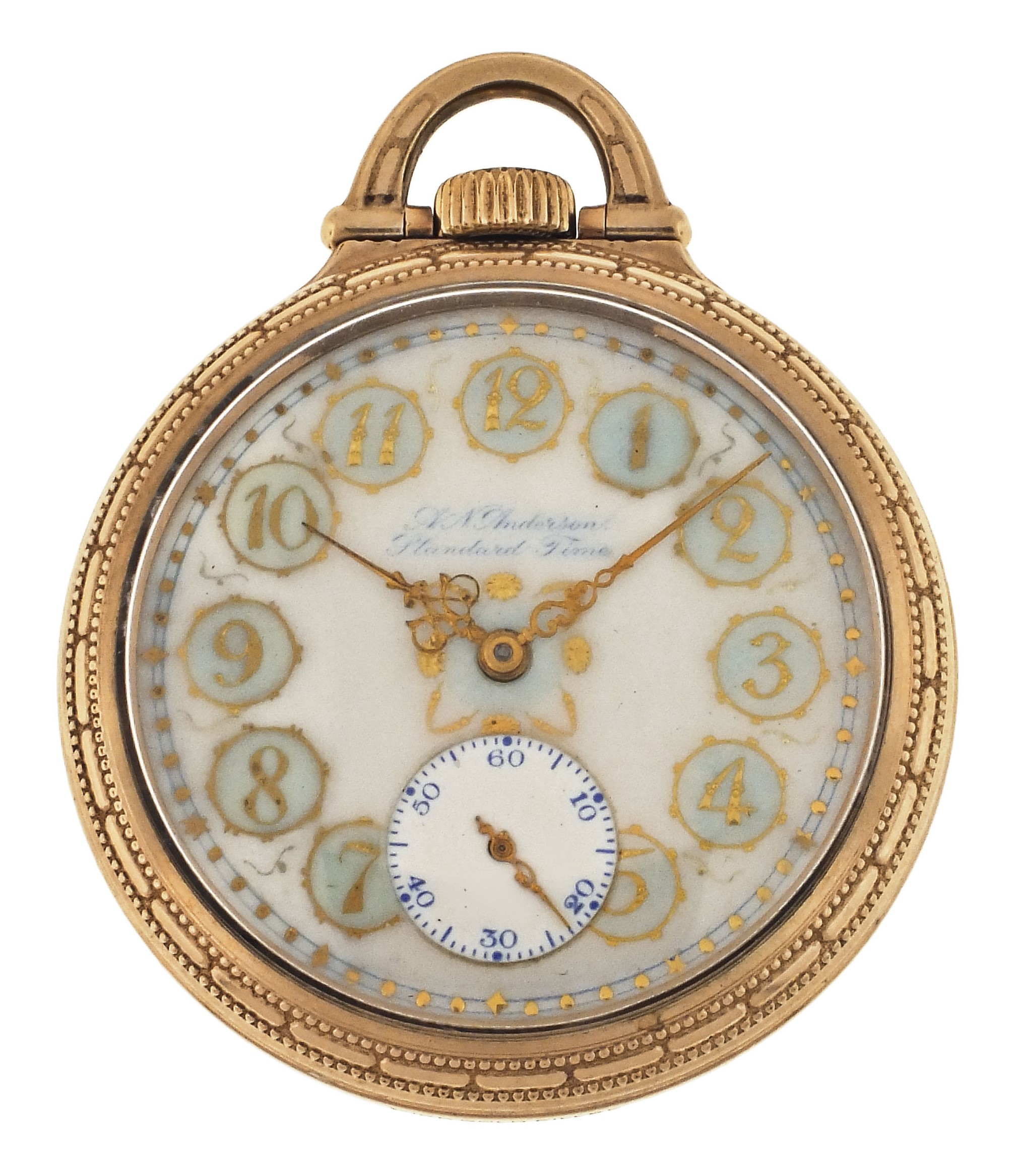 Hamilton Watch Co., Lancaster, Penn., for A.N. Anderson, Minneapolis, a grade 992 "Inspectors Standard", 16 size, 21 jewels, stem wind and lever set, adjusted to 5 positions, temperature and isochronism, damascened nickel plate movement with lever escapement, cut bimetallic balance with gold screws, and whiplash micrometric regulator in a gold filled, screw back and bezel open face case with engraved locomotive on back, arabic numeral, single sunk O'Hara style multicolor enamel dial with gilt Louis XIV style hands, serial #334608