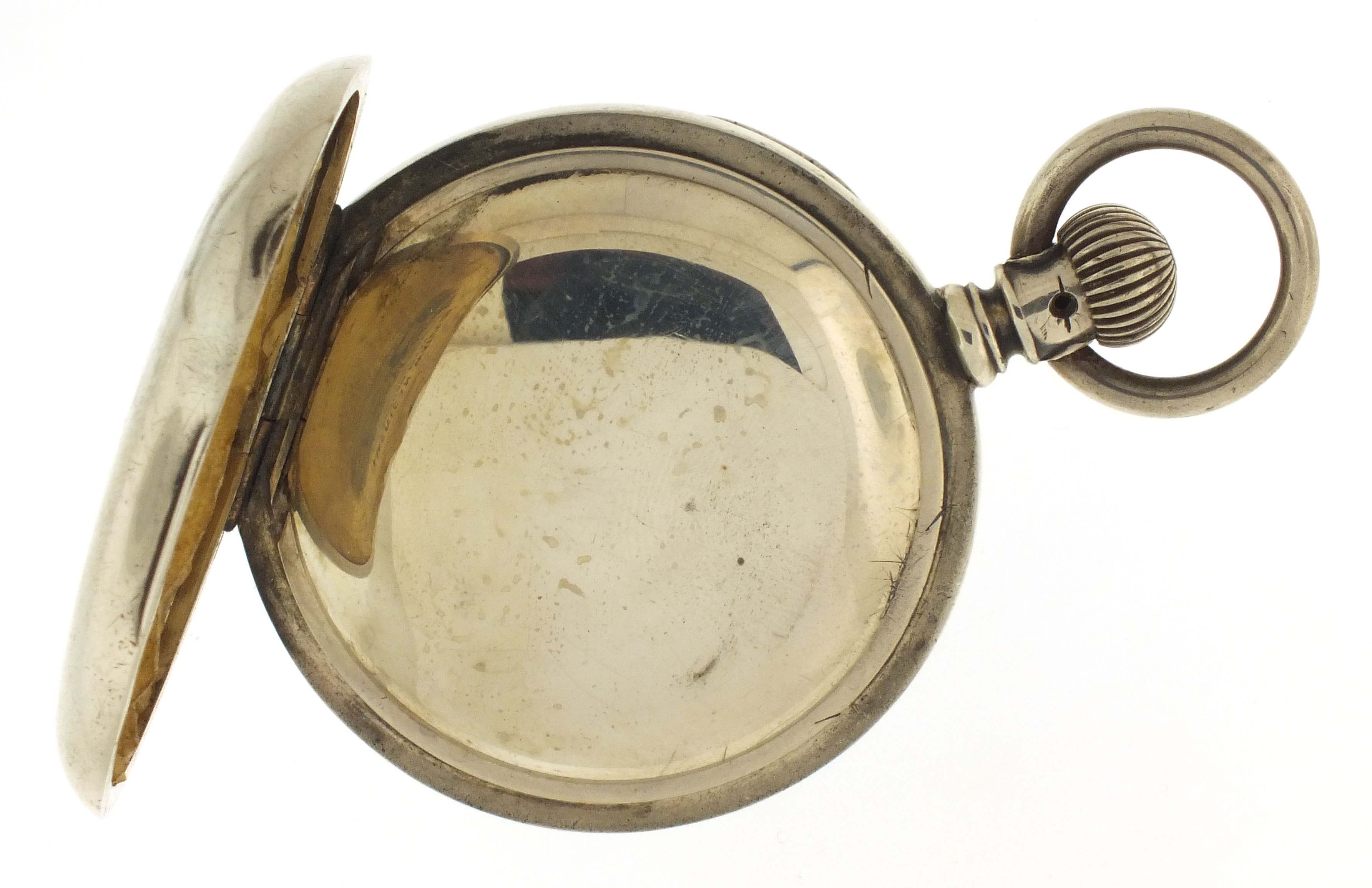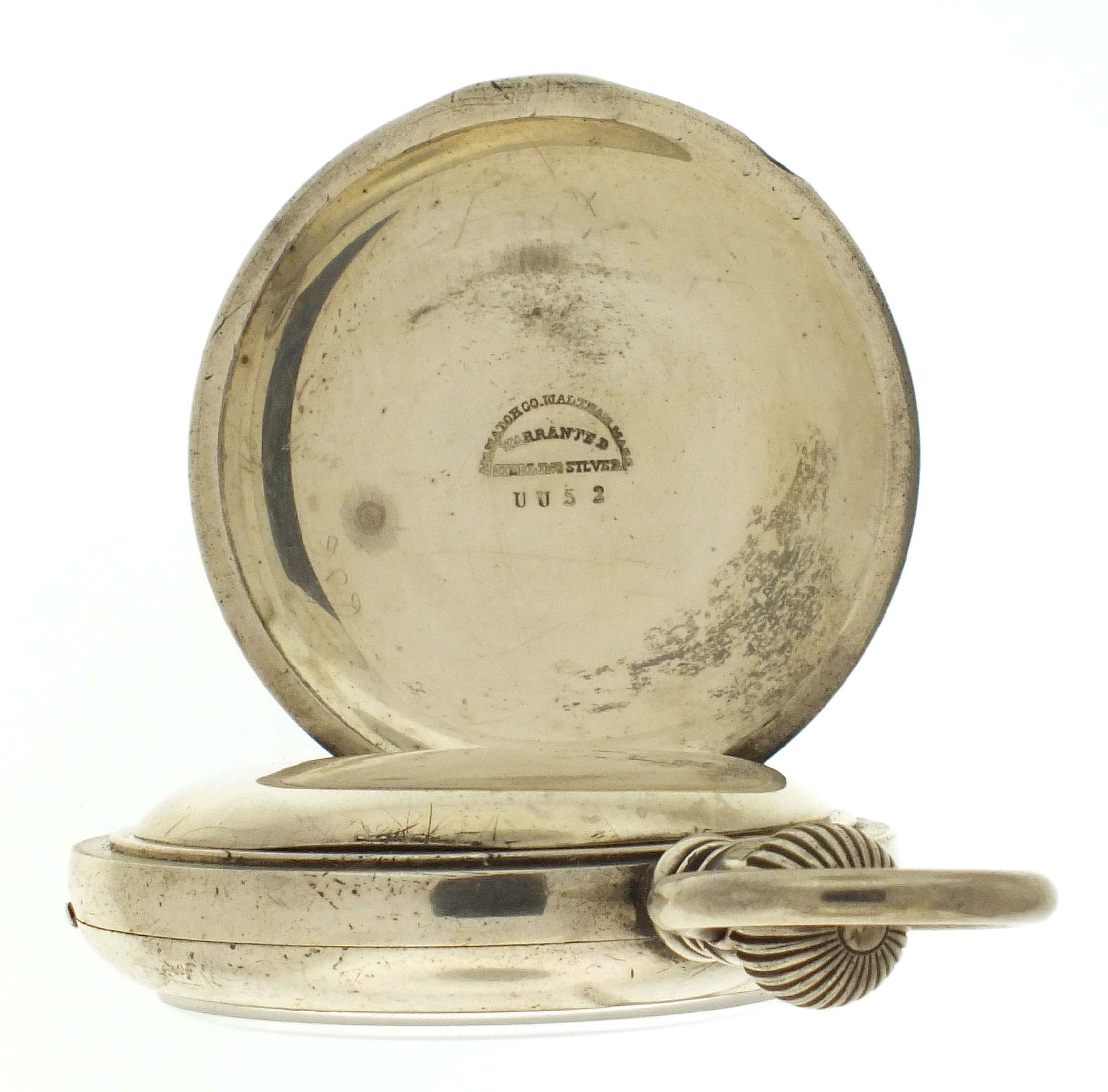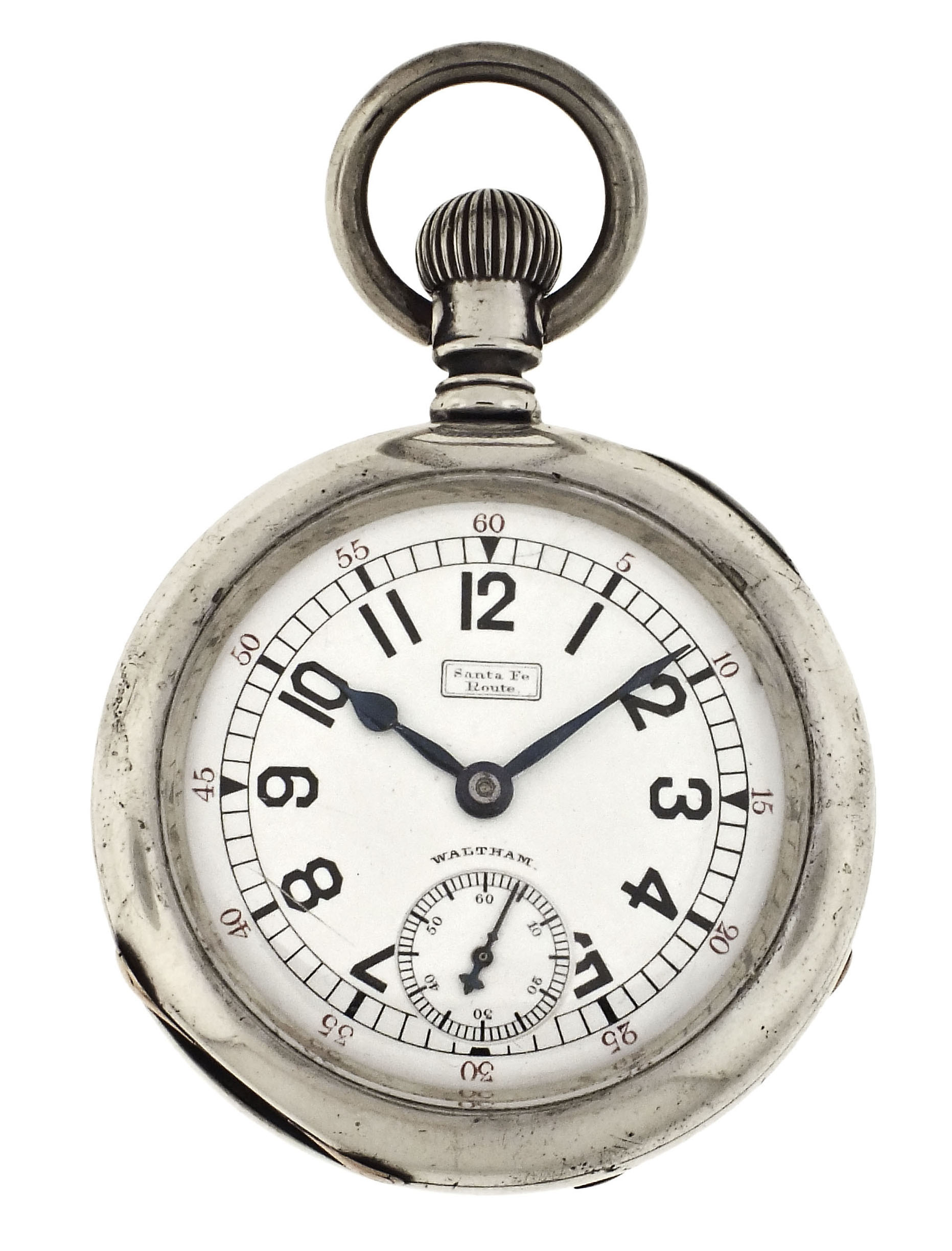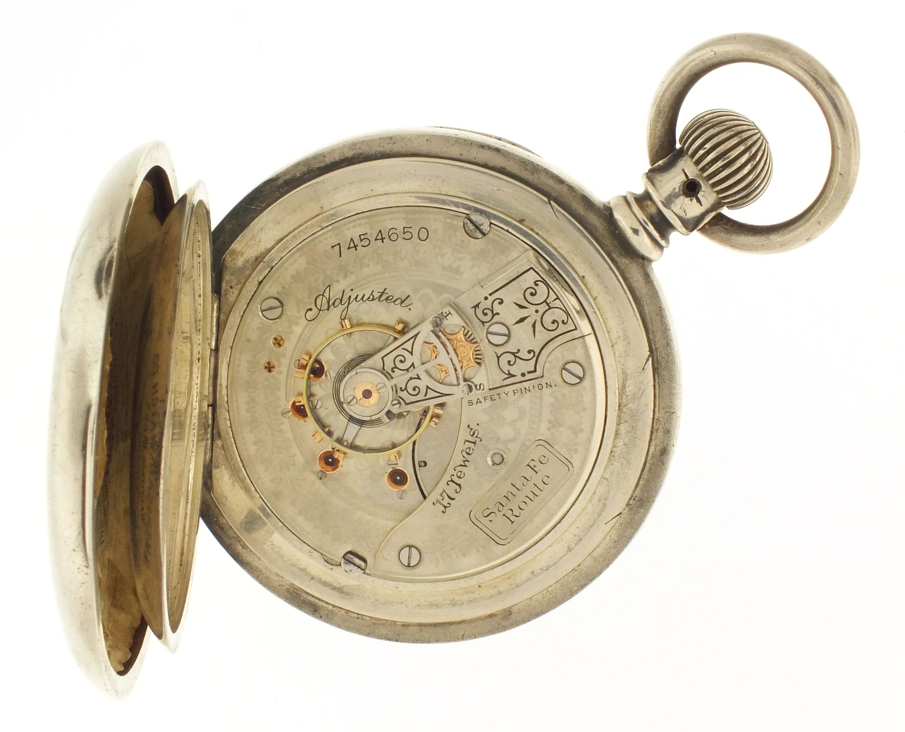 American Waltham Watch Co., Waltham, Mass., an early 20th century model 1883 "Santa Fe Route" pocket watch, 18 size, 17 jewels, stem wind and lever set, adjusted, damascened nickel plate movement with lever escapement, cut bimetallic balance with gold screws, gold jewel settings, and Church micrometric regulator, the barrel bridge marked "Santa Fe Route", in a sterling silver, hinged back and bezel, engraved open face case, arabic numeral, outer red 5-minute markers, single sunk white enamel dial with blued steel spade and poker hands, and also with "Santa Fe Route" marking, serial #7454650.