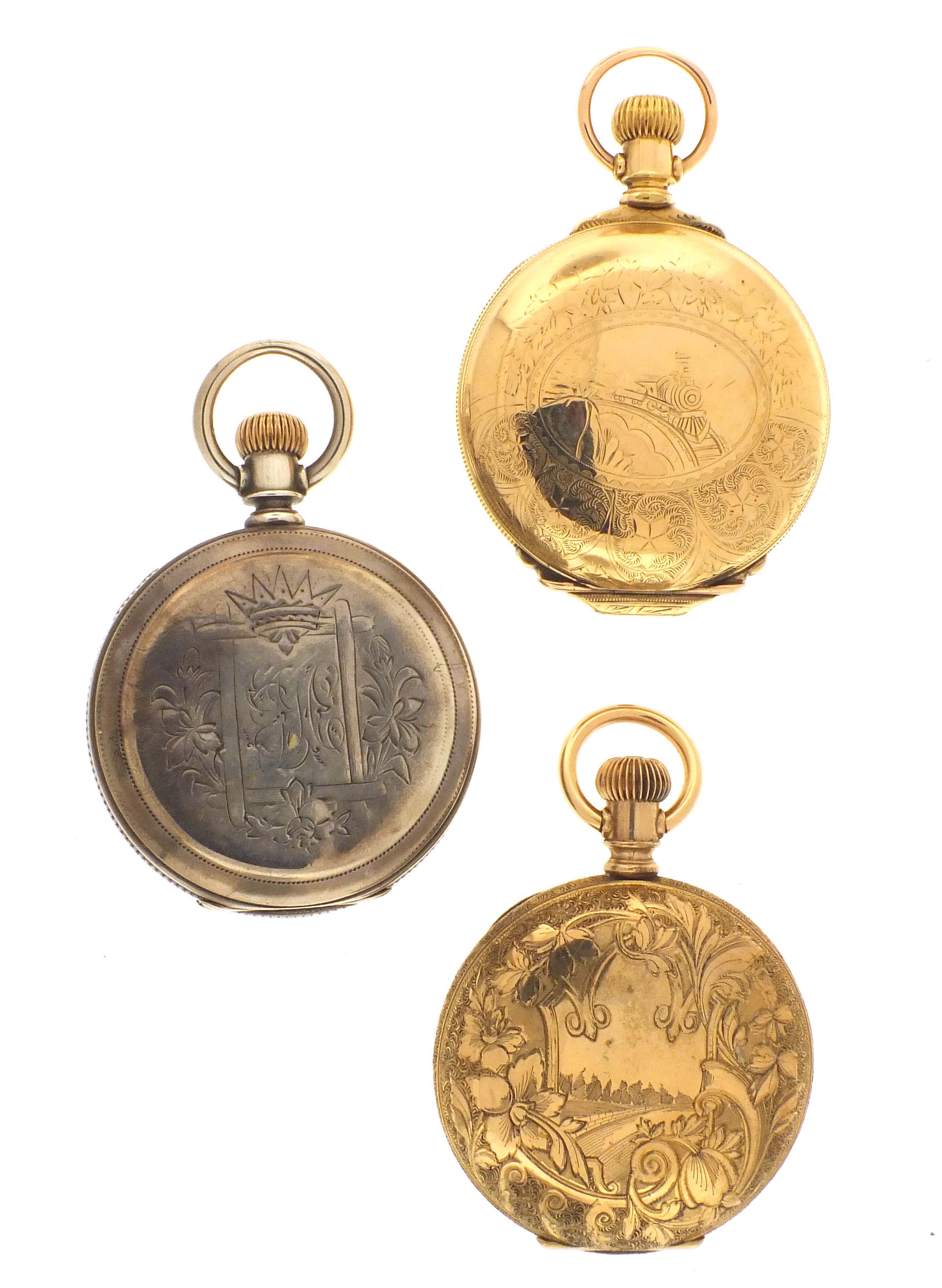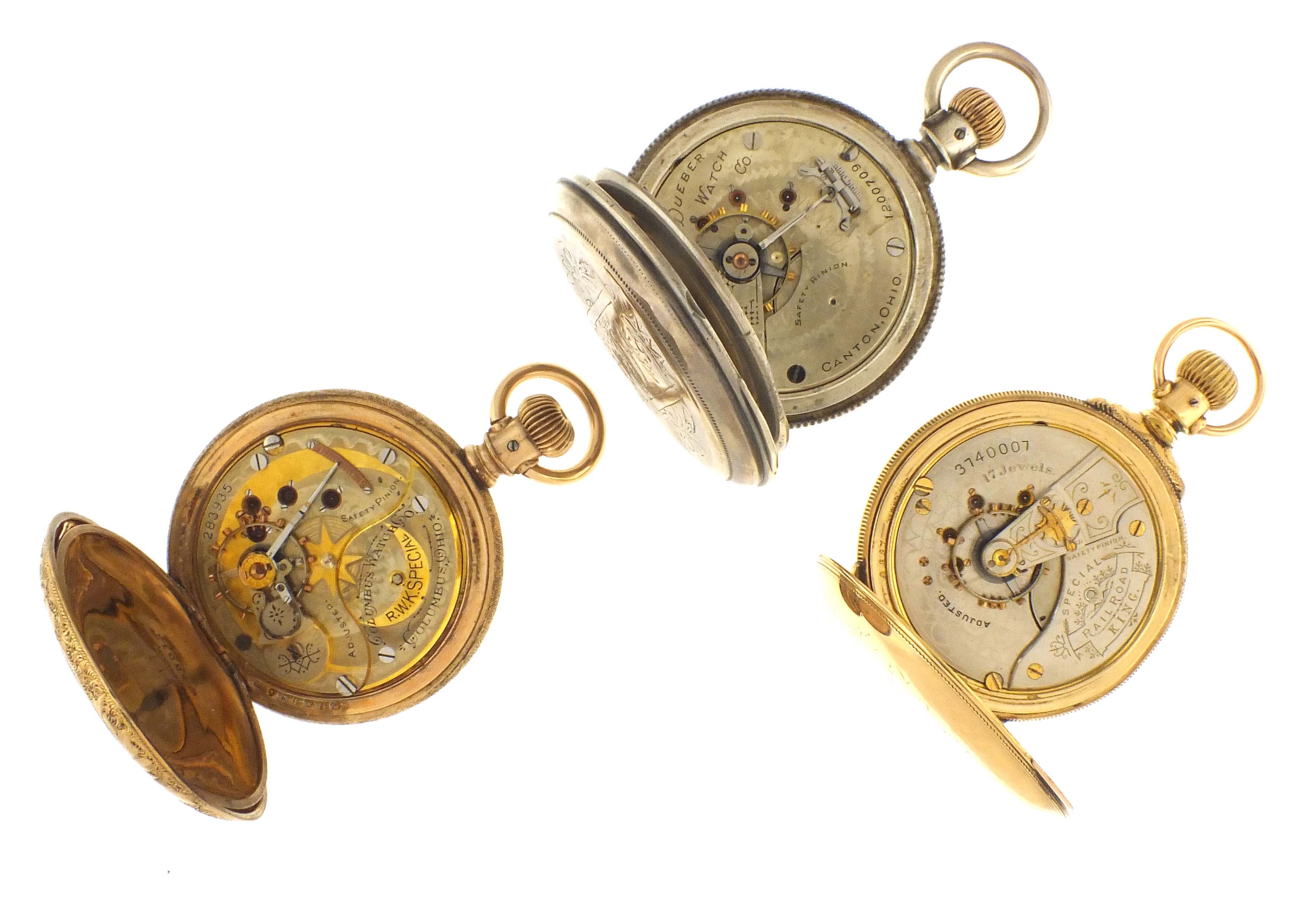 3 (Three) American pocket watches, 18 size, roman and arabic white enamel dials, damascened plates, hunting cases, including a Columbus, model 2, 16 jewel two tone movement in gold filled case serial #283935, a Waltham, model 1883, grade 25, "Railroad King", 15 jewel movement in gold filled case, serial #3740007, and a Hampden model 4, ""Deuber Watch Co."with O'Hara style dial, 15 jewel movement in coin silver case, serial #1200709