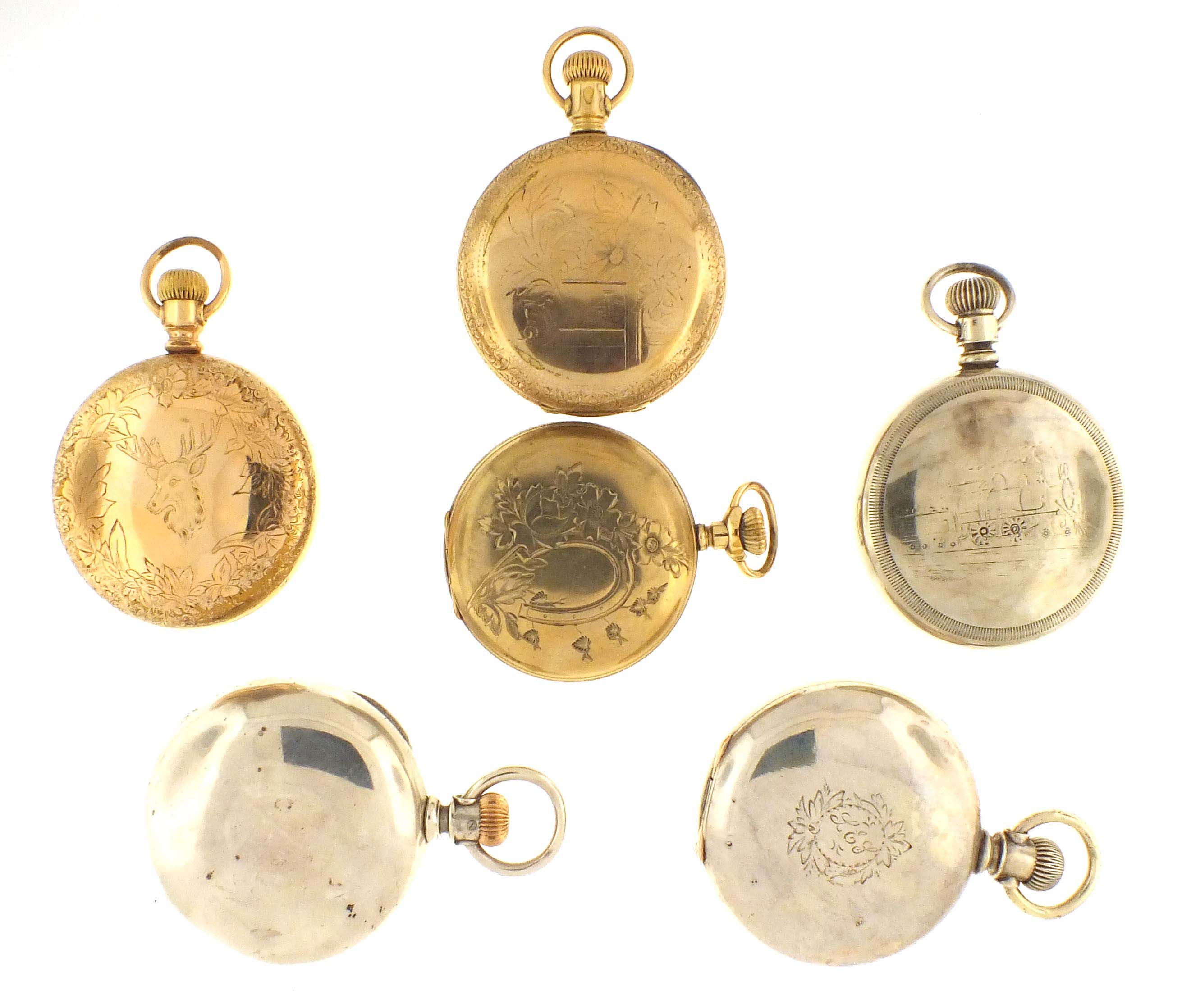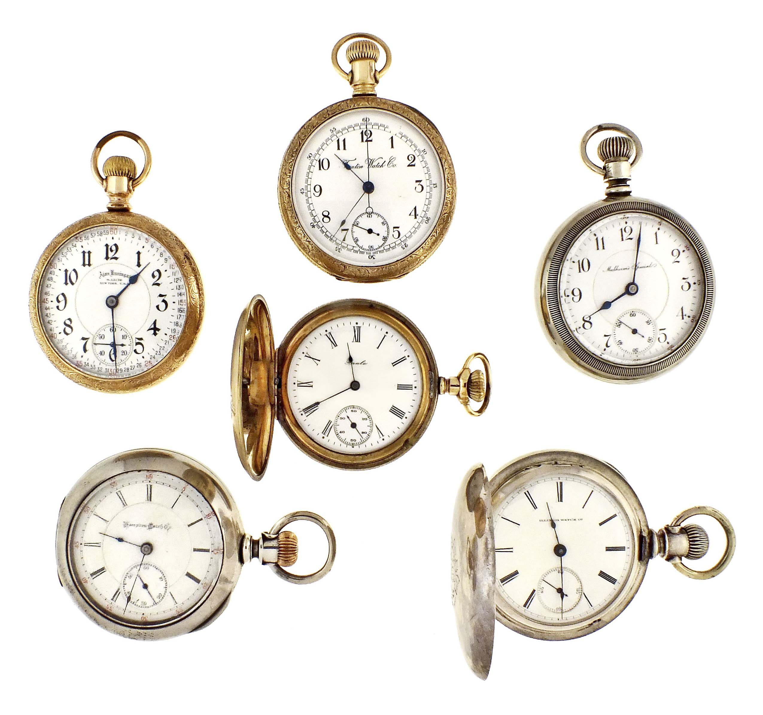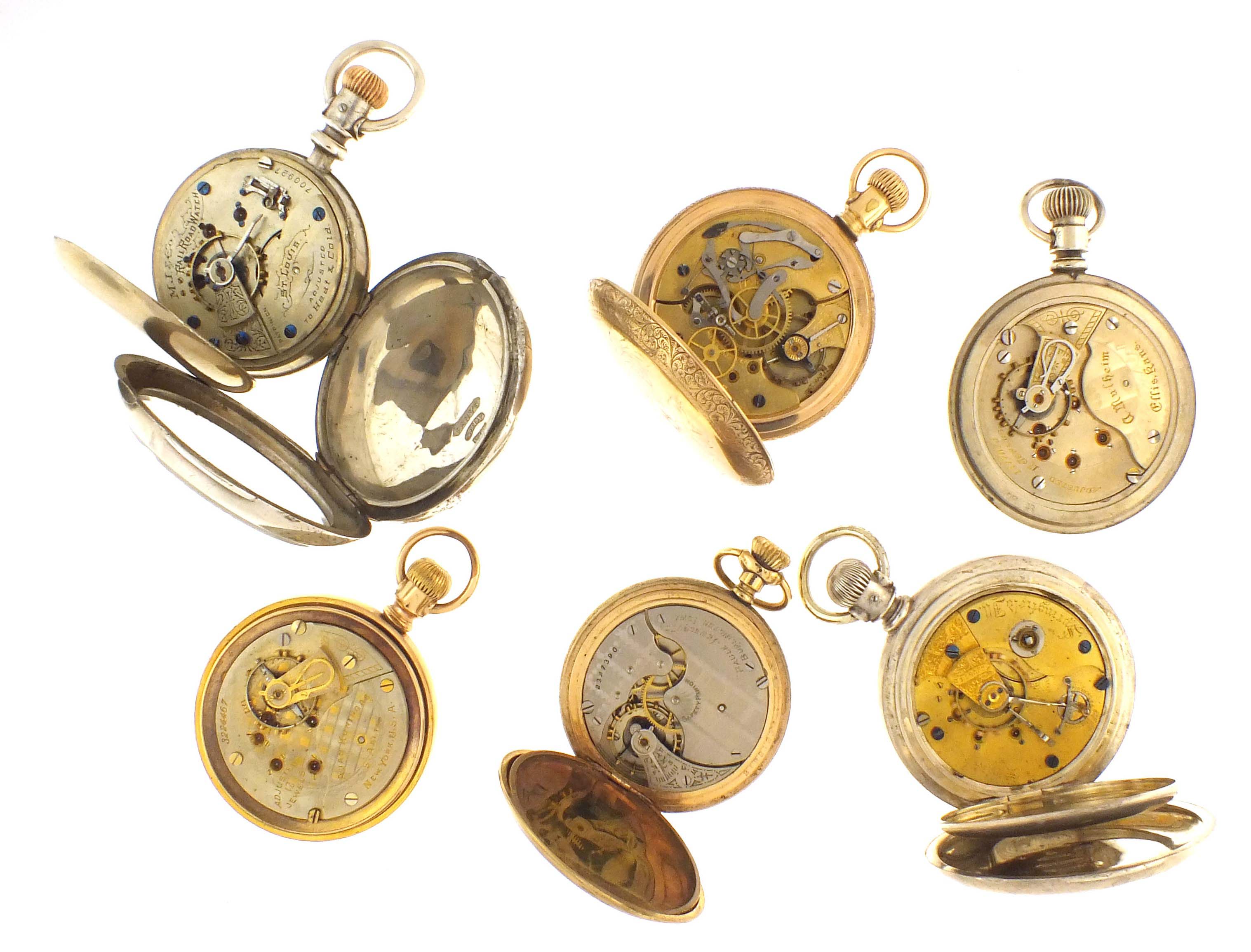 6 (Six) American pocket watches, 18 size, stem and key wind, arabic and roman numeral enamel dials, hunting and open face, up to 15 jewels, some with gilt and damascened movements, makers including Hampden with hinge back case, Trenton, Illinois, New York and others, all in gold filled and silverine cases