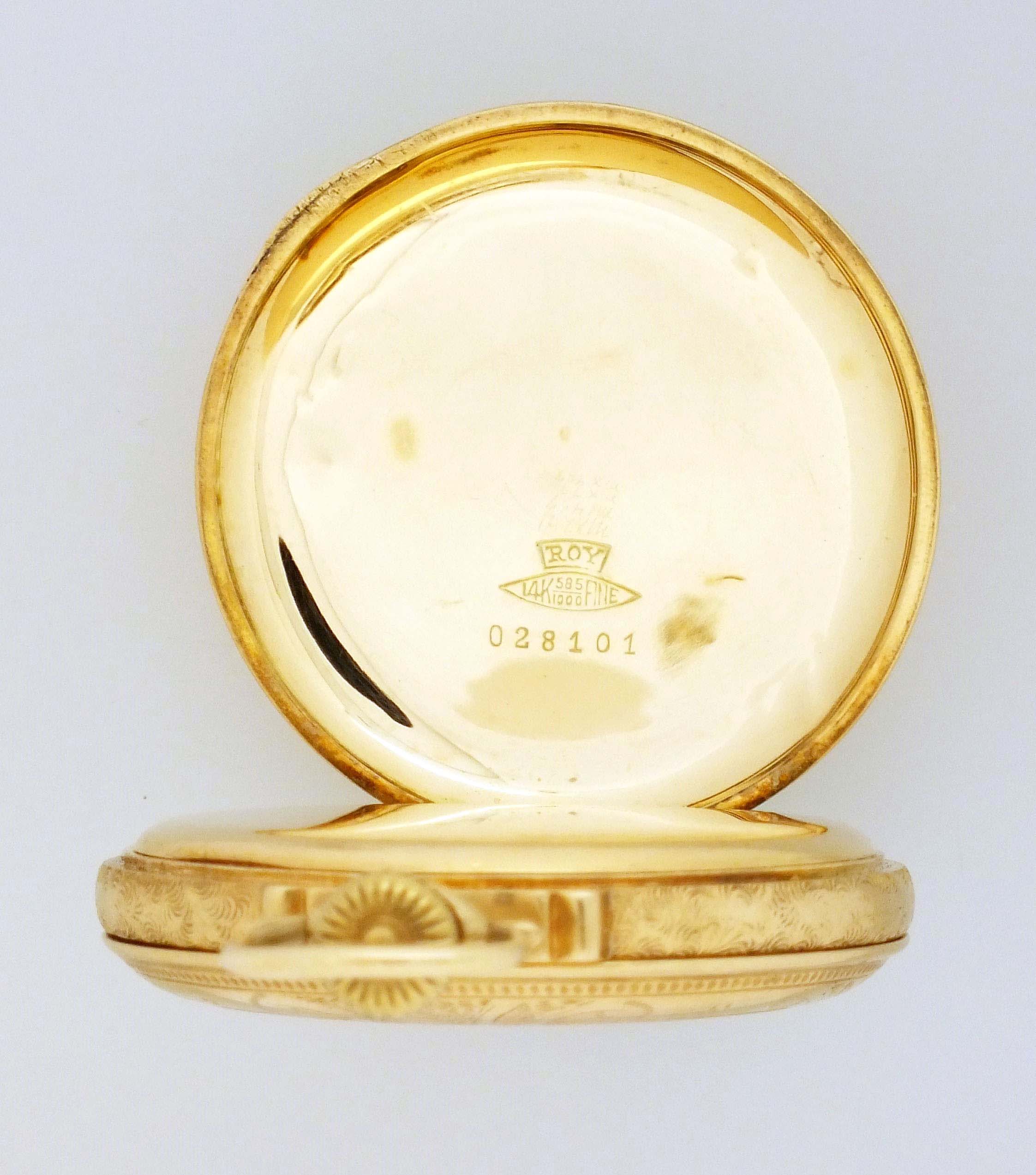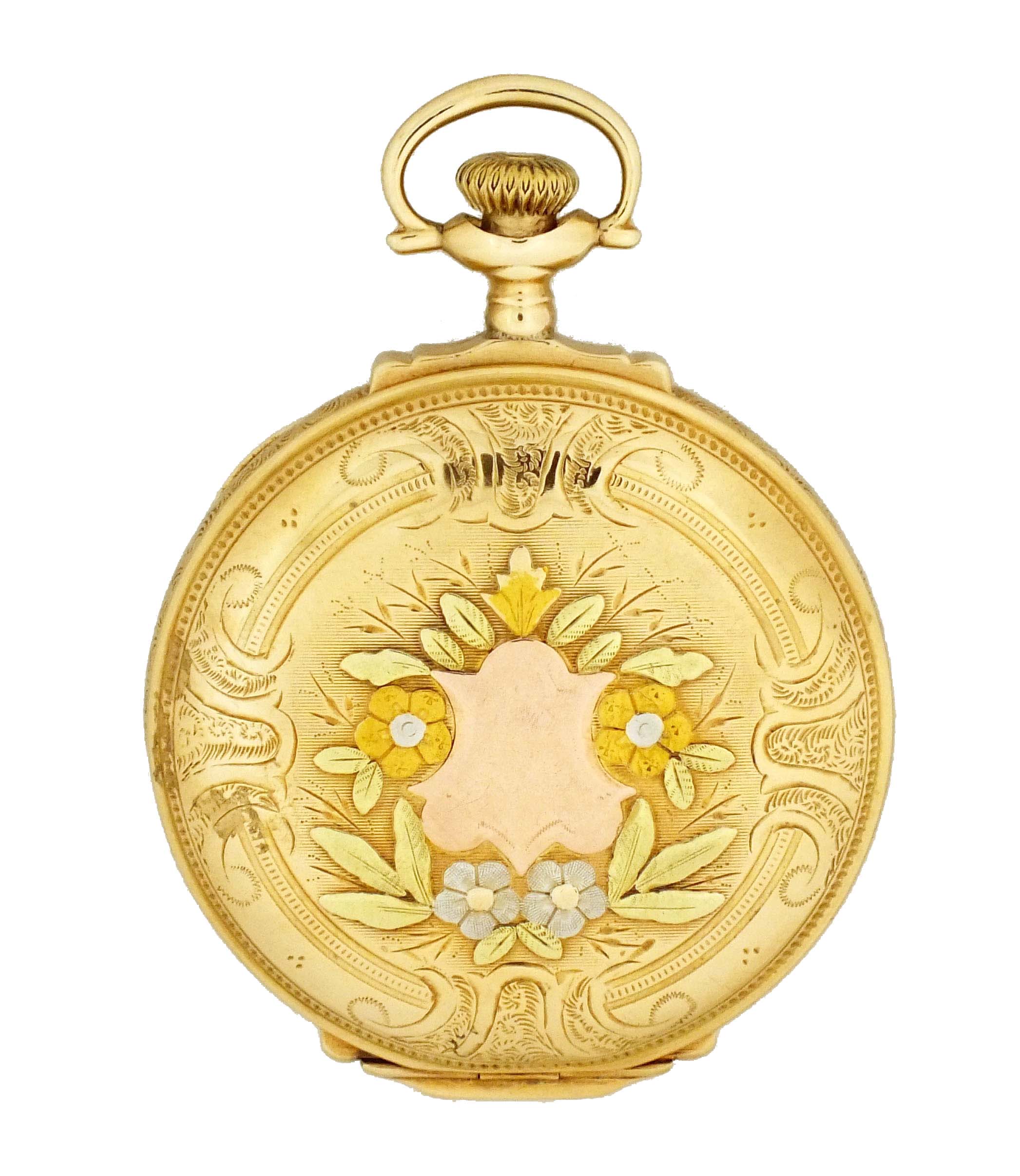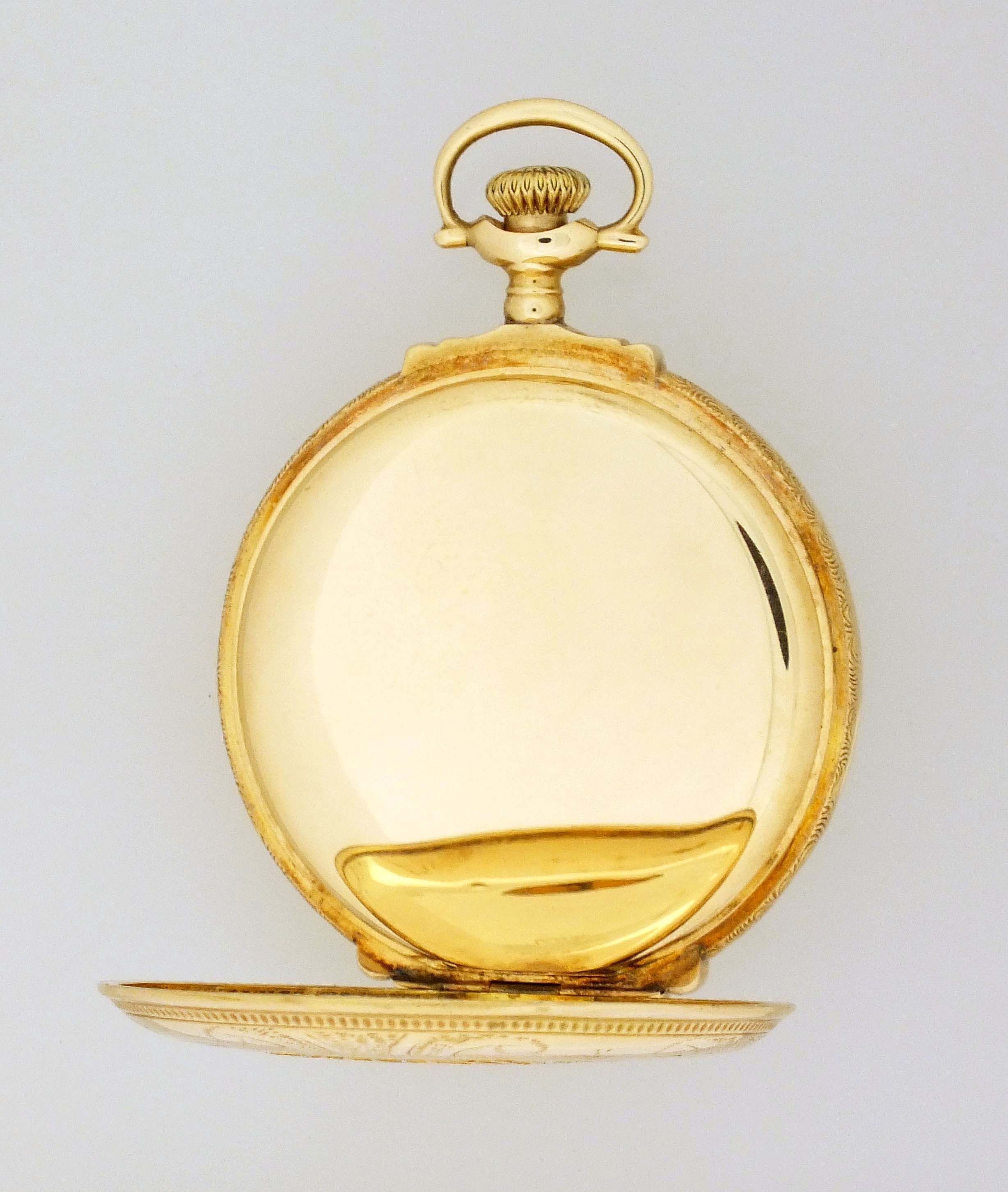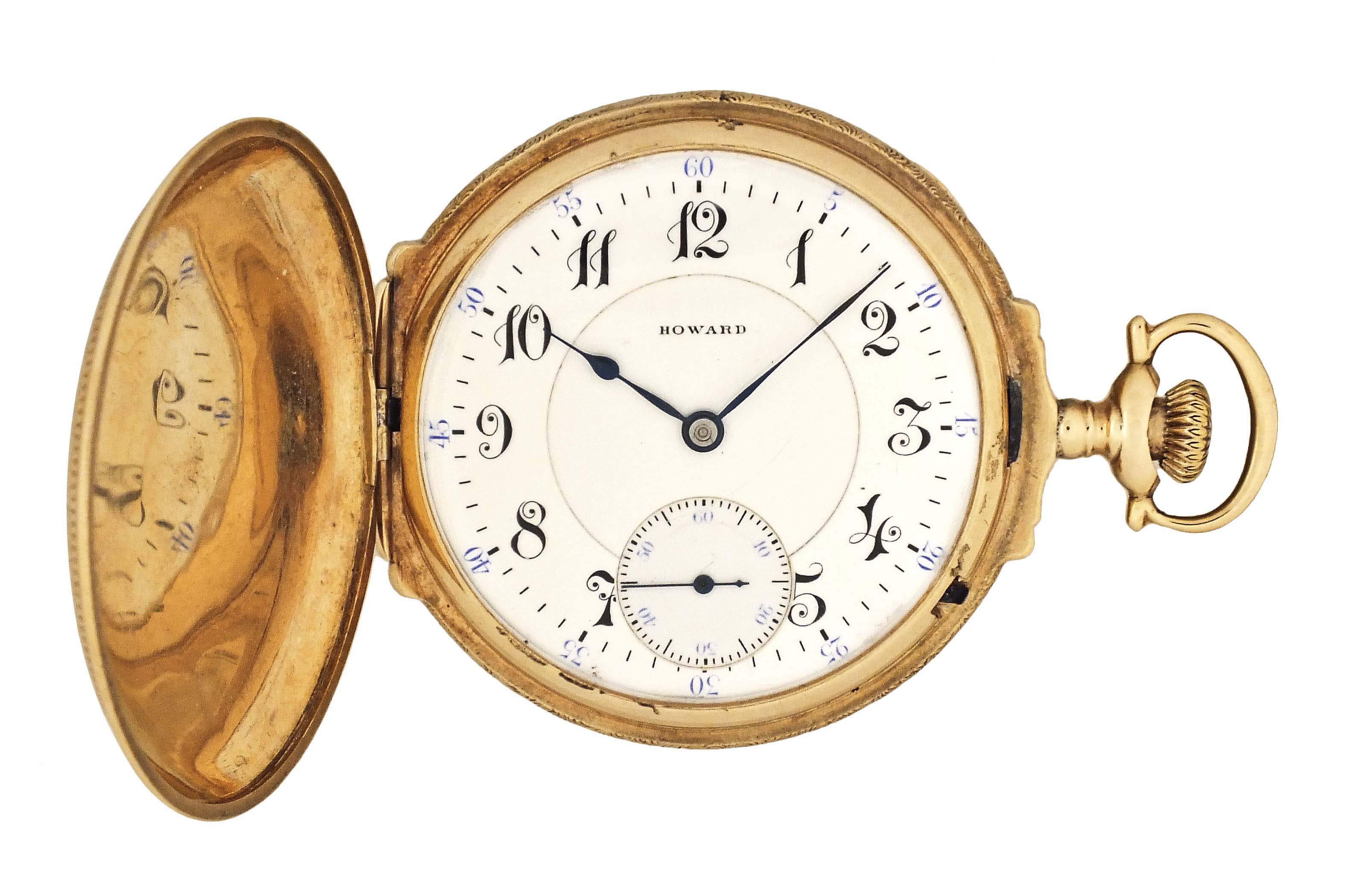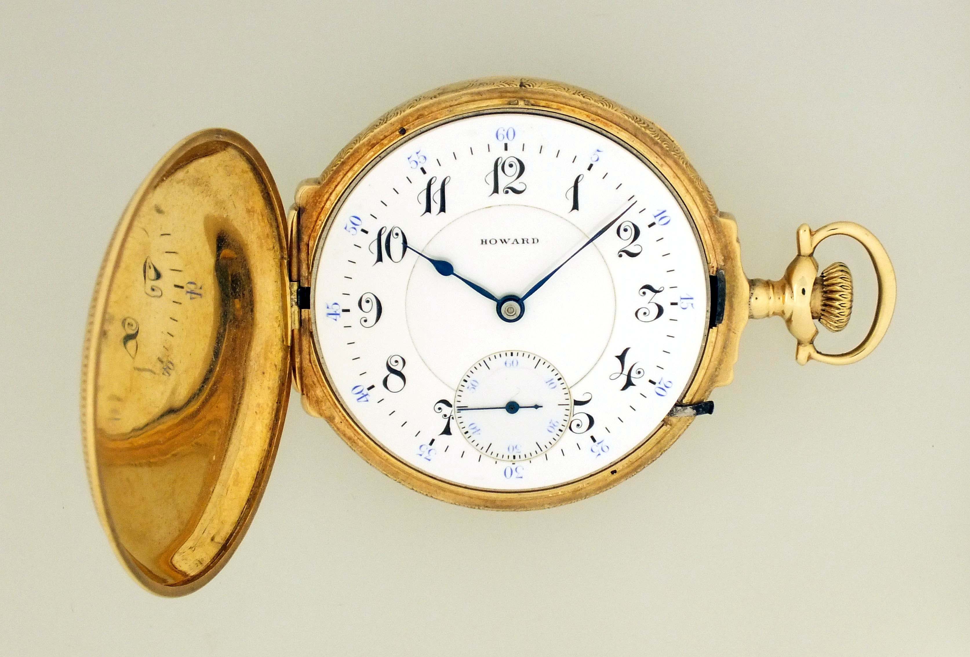 E. Howard Watch Co. (Keystone), Waltham, Mass., a series 0 pocket watch with four color gold case, 16 size, 23 jewel, stem wind and lever set, adjusted to 5 positions and temperature, damascened nickel bar movement with lever escapement, cut bimetallic balance, and whiplash micrometric regulator in a 14 karat, yellow gold, engraved, faux box hinge hunting case with three color gold floral and foliate ornament, the covers also with rose gold shield and standing buck, fancy arabic numeral, outer blue 5-minute markers, double sunk white enamel dial, blued steel spade and whip hands, serial #1143080, 87g TW, with associated box and license.