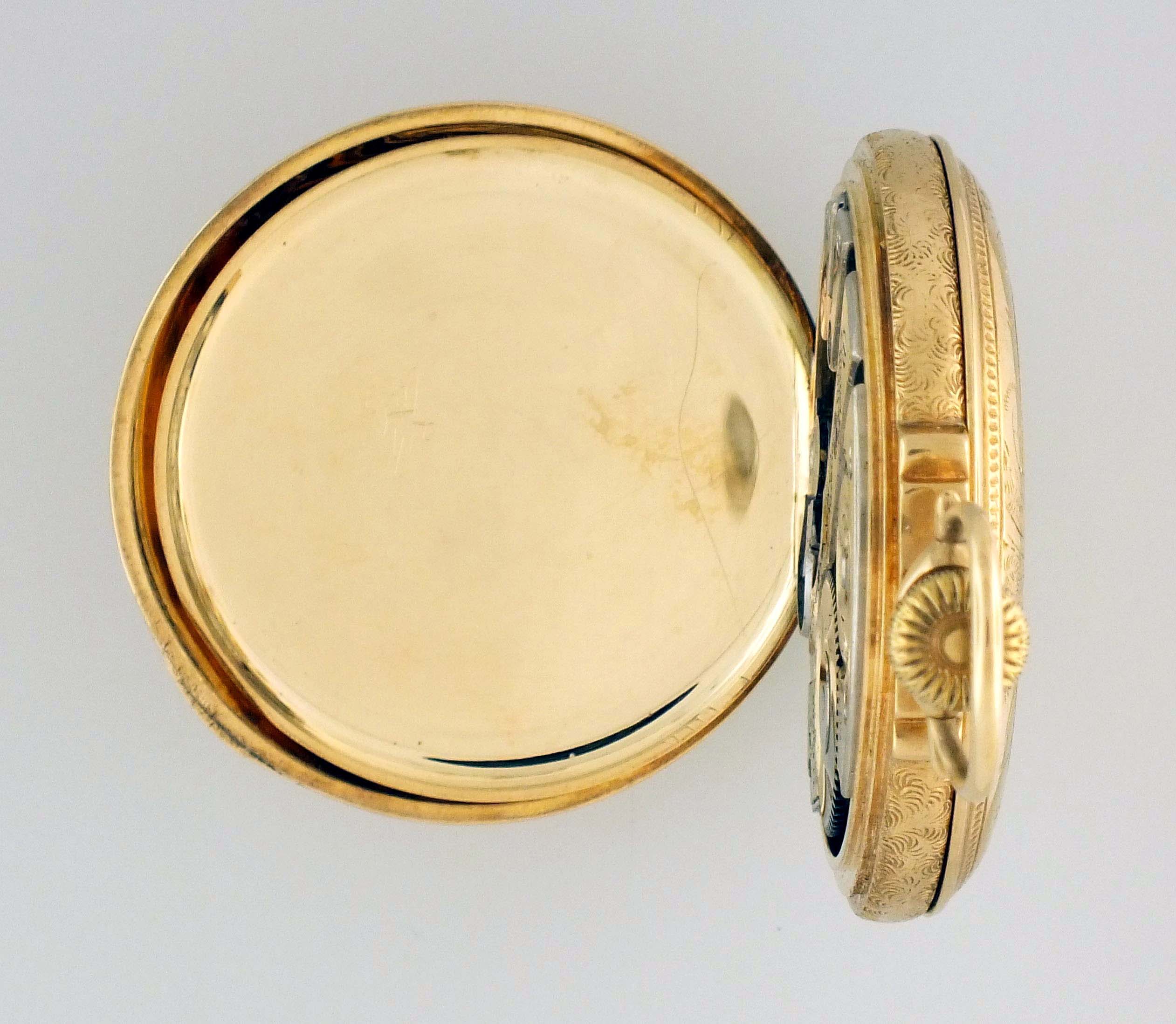 CASE: Minor dents, band and back cover; Very fine scratches on outer surface of case; Very fine scratches on inner surface of case; Scratch and tiny dent on inner surface of cuvette: Engraving with moderate wear; Bezel replaced; Cover extends beyond 90 degrees when opened, 110 deg.; Acrylic crystal cracked and with glue residue; Crown shell worn through; Bow not centered; Precious metal content marked. DIAL: Faint, circular hairlines, seconds bit; Crystal glue residue. HANDS: Oxide, tip of minute. MOVEMENT PLATES: Fine scratches on plate; Pin pricks; Center bridge with circular, deep scratches and gouging around center wheel upper hole jewel; Center wheel upper hole jewel replaced and now with brass setting; A few fine scratches on winding wheels; Scratches on crown wheel washer; Dirty. MOVEMENT FUNCTION: Running order (winds, sets and ticks); Low amplitude, needs service. Box minor dents, wear, and surface flaws; Lining replaced.