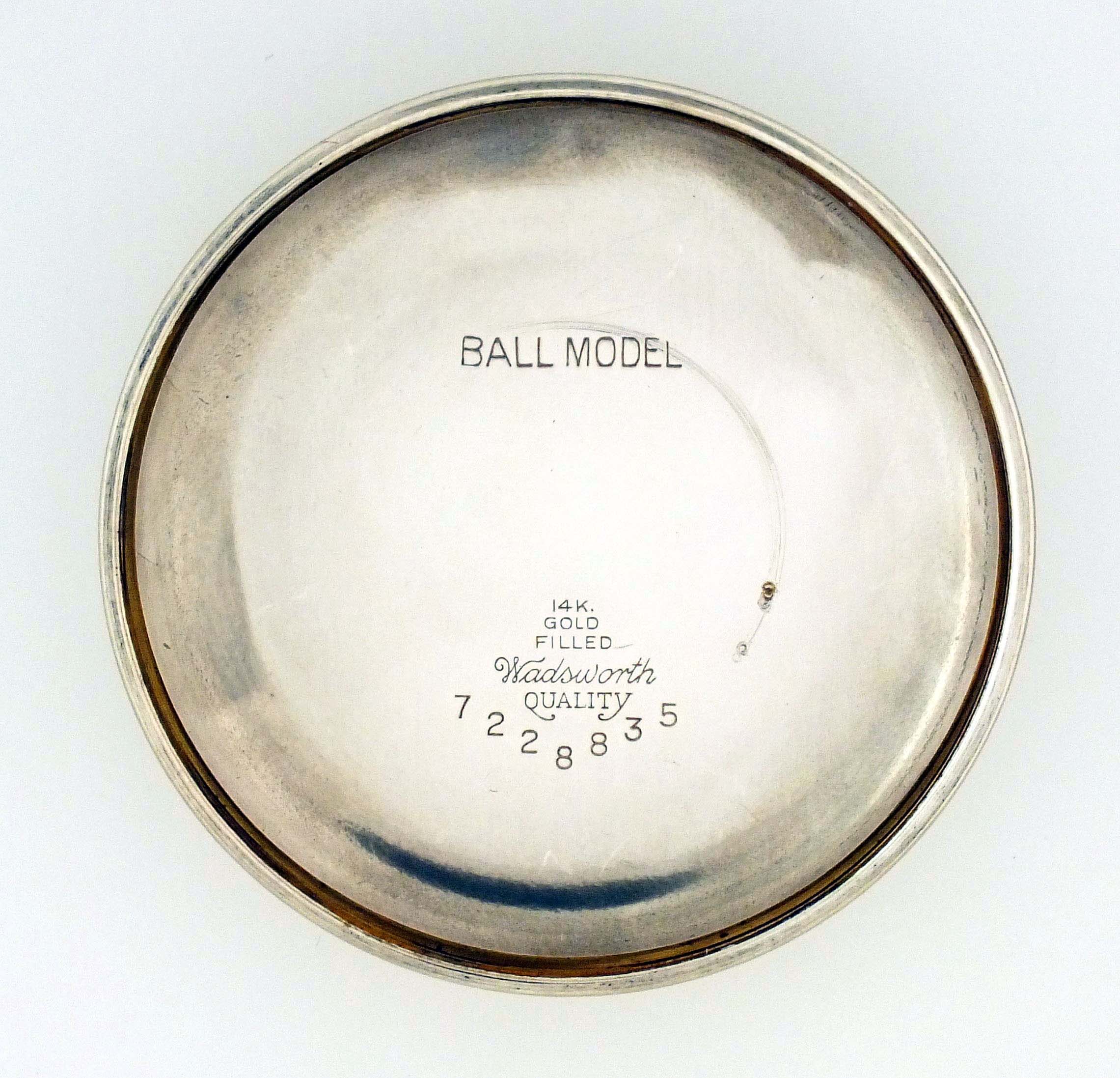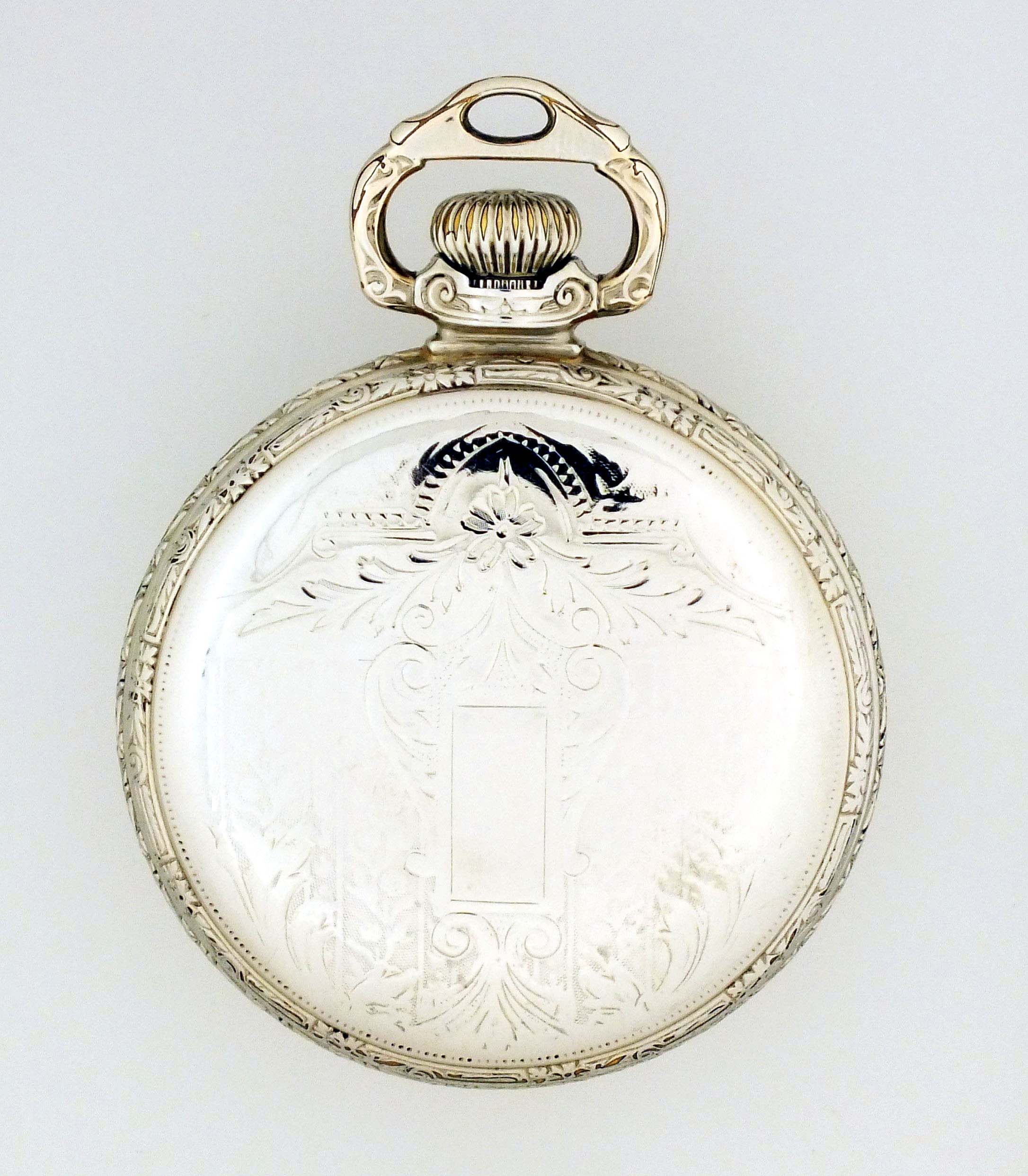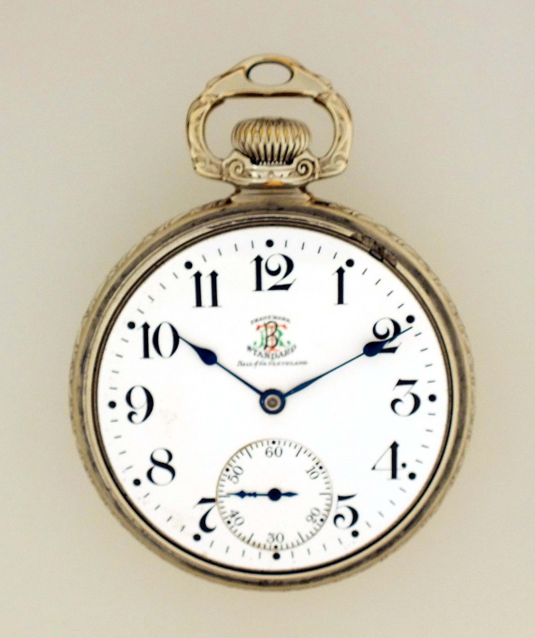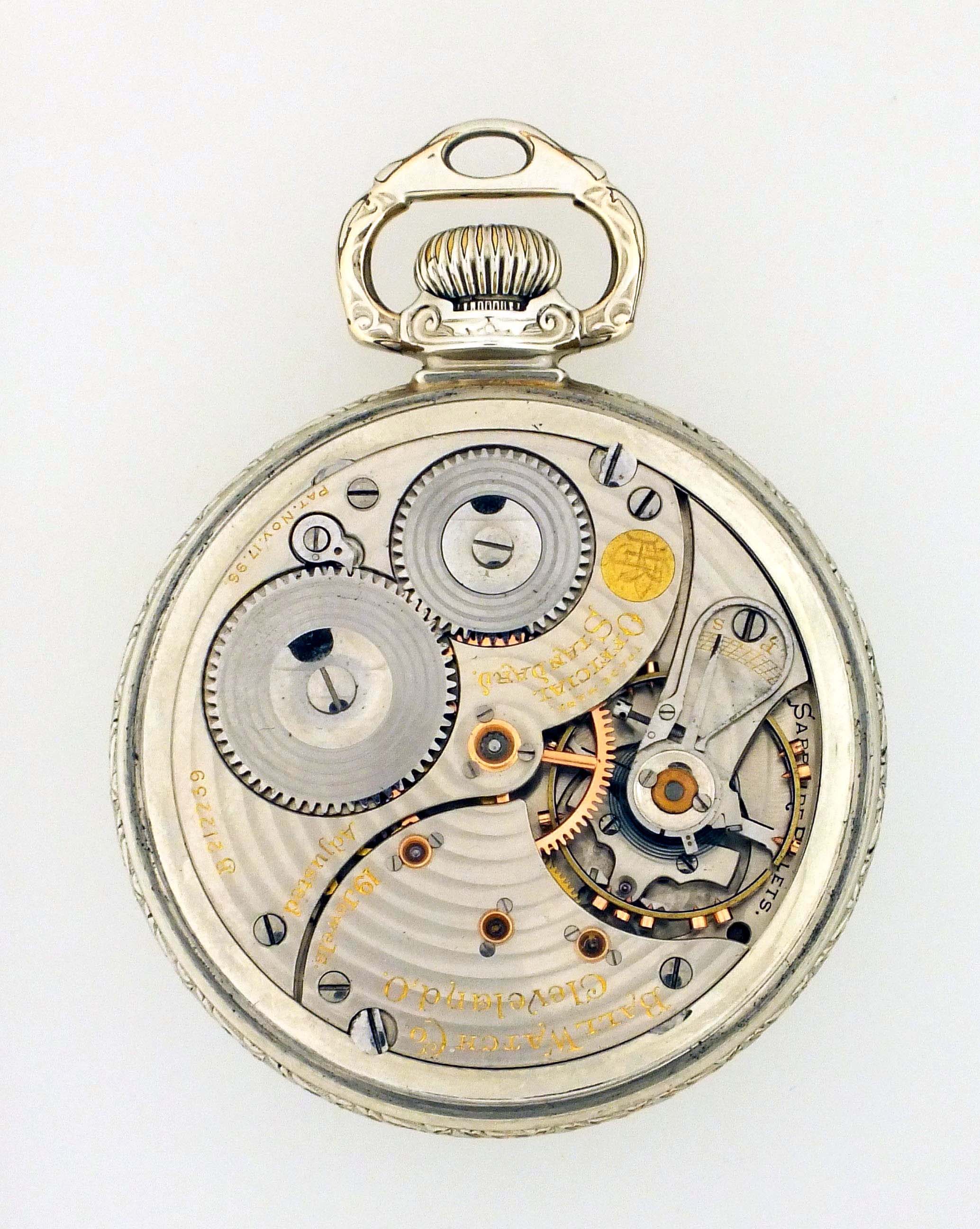 Ball Watch Co., Cleveland, Ohio, a Ball Waltham model 1899 "Brotherhood of Railroad Trainmen", 16 size, 19 jewels, stem wind and lever set, adjusted, circular damascened nickel plate movement with lever escapement, cut bimetallic balance with gold screws, gold jewel settings, and whiplash micrometric regulator in a white gold filled, engraved, Ball Model screw back and bezel open face case with stirrup bow, arabic numeral, single sunk white enamel dial with polychrome BRT insignia, blued steel spade hands, serial #B212239, with red silk and velvet lined Ball Watch Co. box.