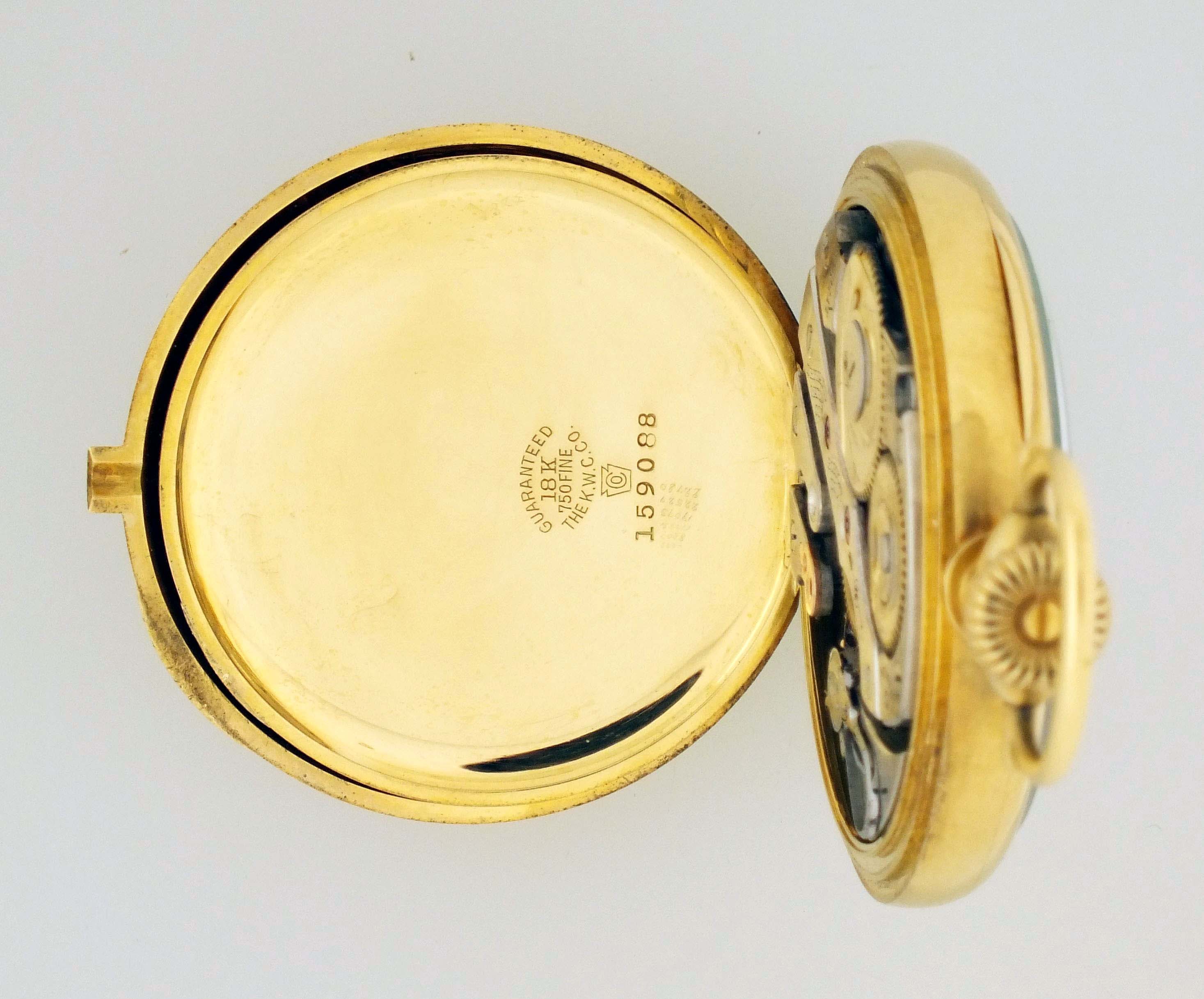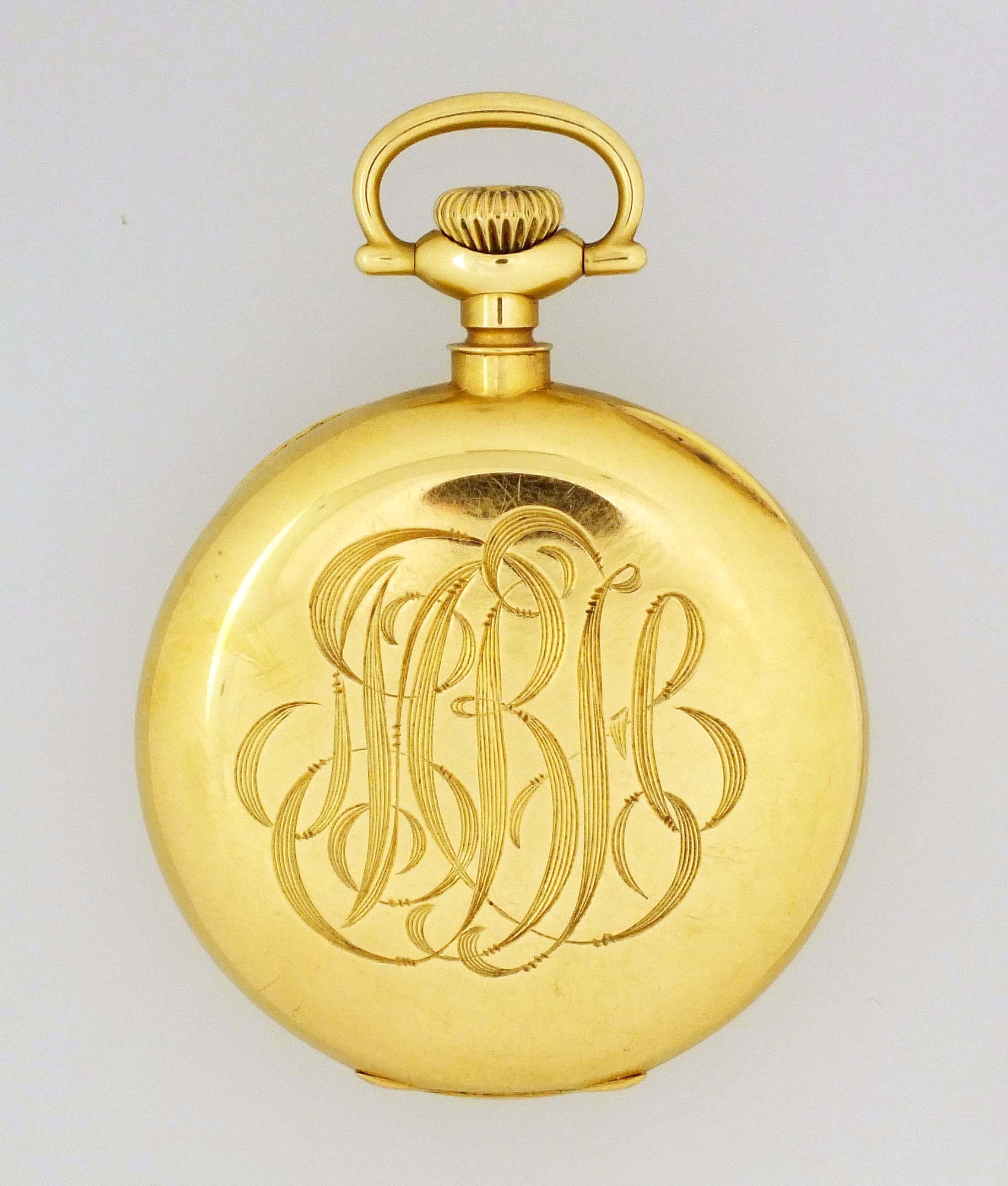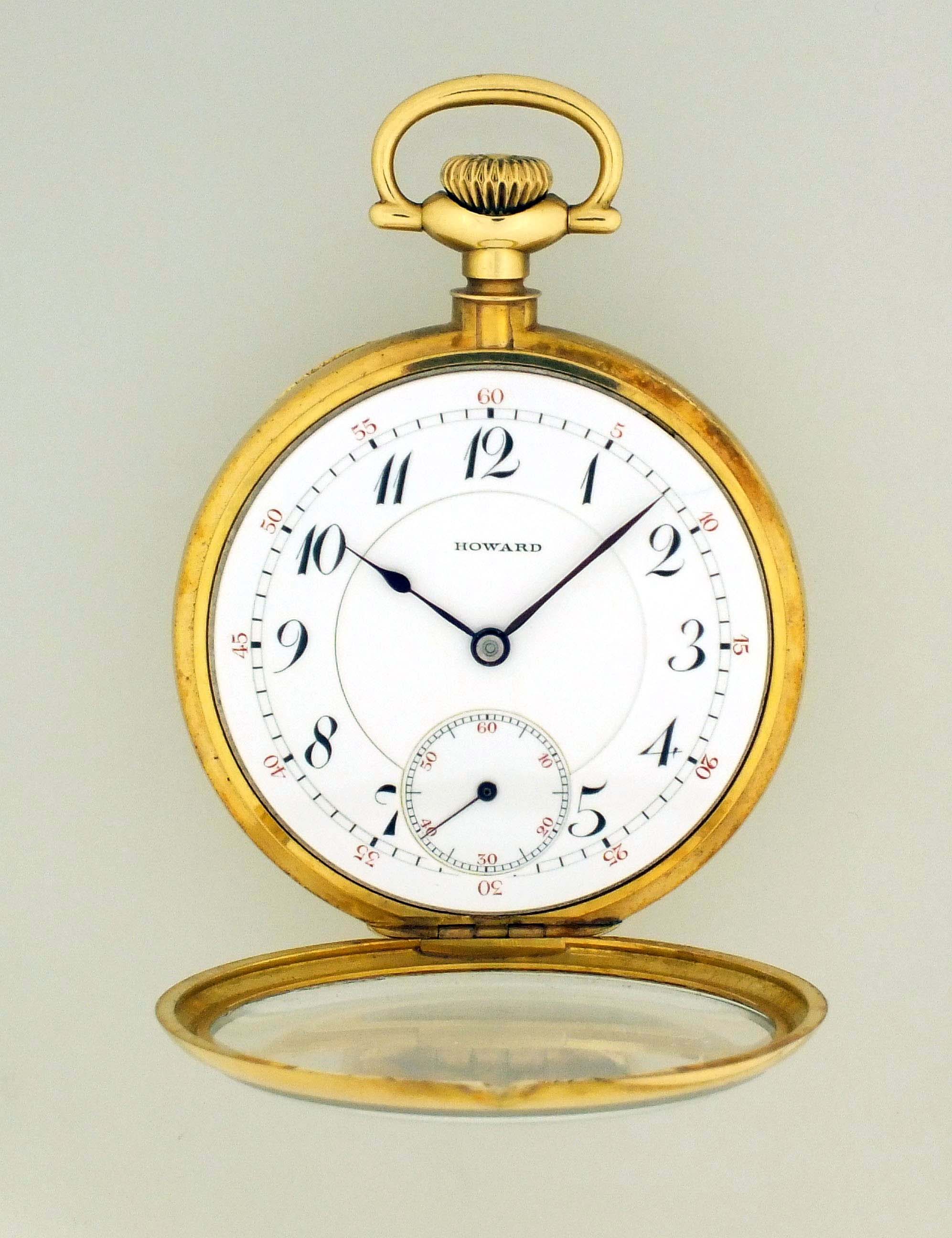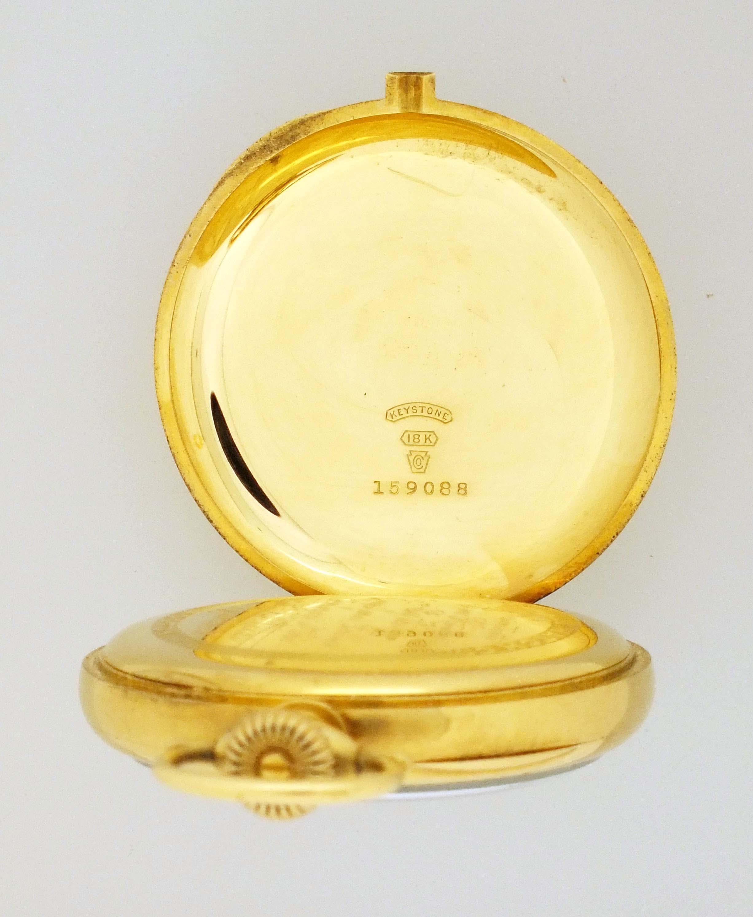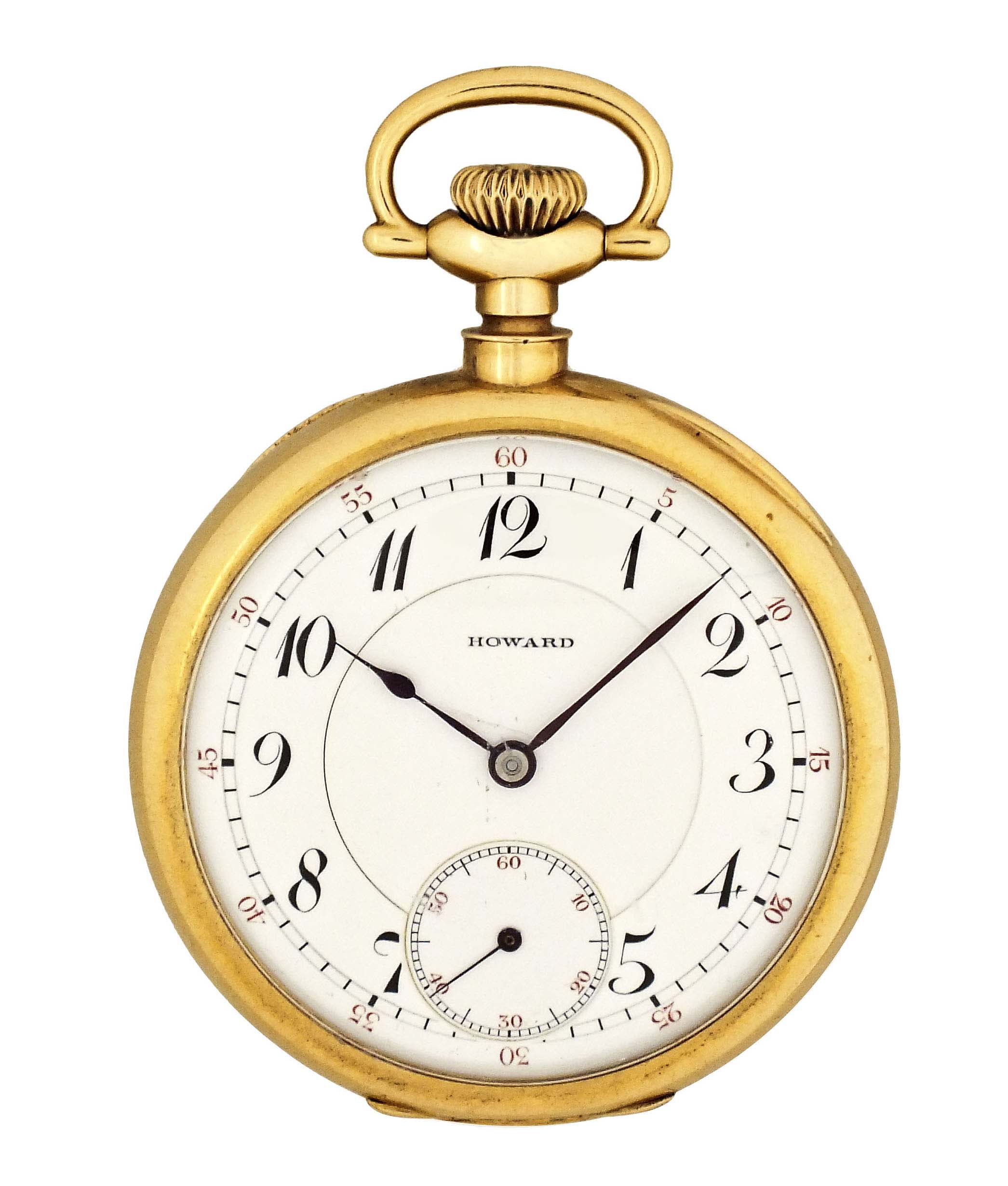 E. Howard Watch Co. (Keystone), Waltham, Mass., an early 20th century series 0 pocket watch, 16 size, 23 jewel, stem wind and set, adjusted to 5 positions, temperature and isochronism, damascened nickel bar movement with lever escapement, cut bimetallic balance with gold screws, gold jewel settings, and whiplash micrometric regulator in an 18 karat, yellow gold, plain polished open face case with Jurgensen lips, monogram on back cover and maker's details and presentation engraved on gold cuvette, arabic numeral, outer red 5-minute markers, double sunk white enamel dial with plum colored steel whip and spade hands, serial #1159122, 92.1g TW, with associated Howard box and license