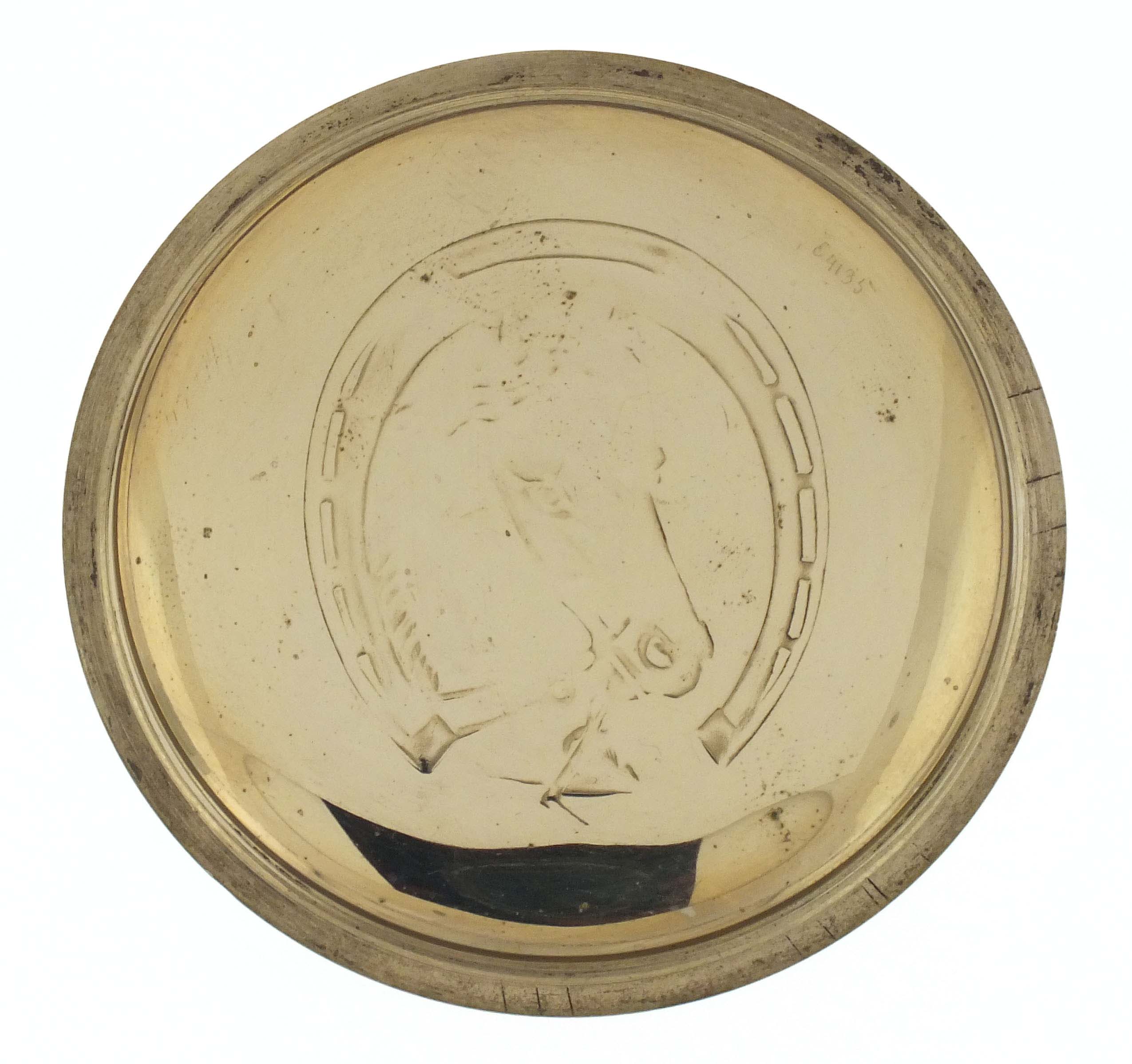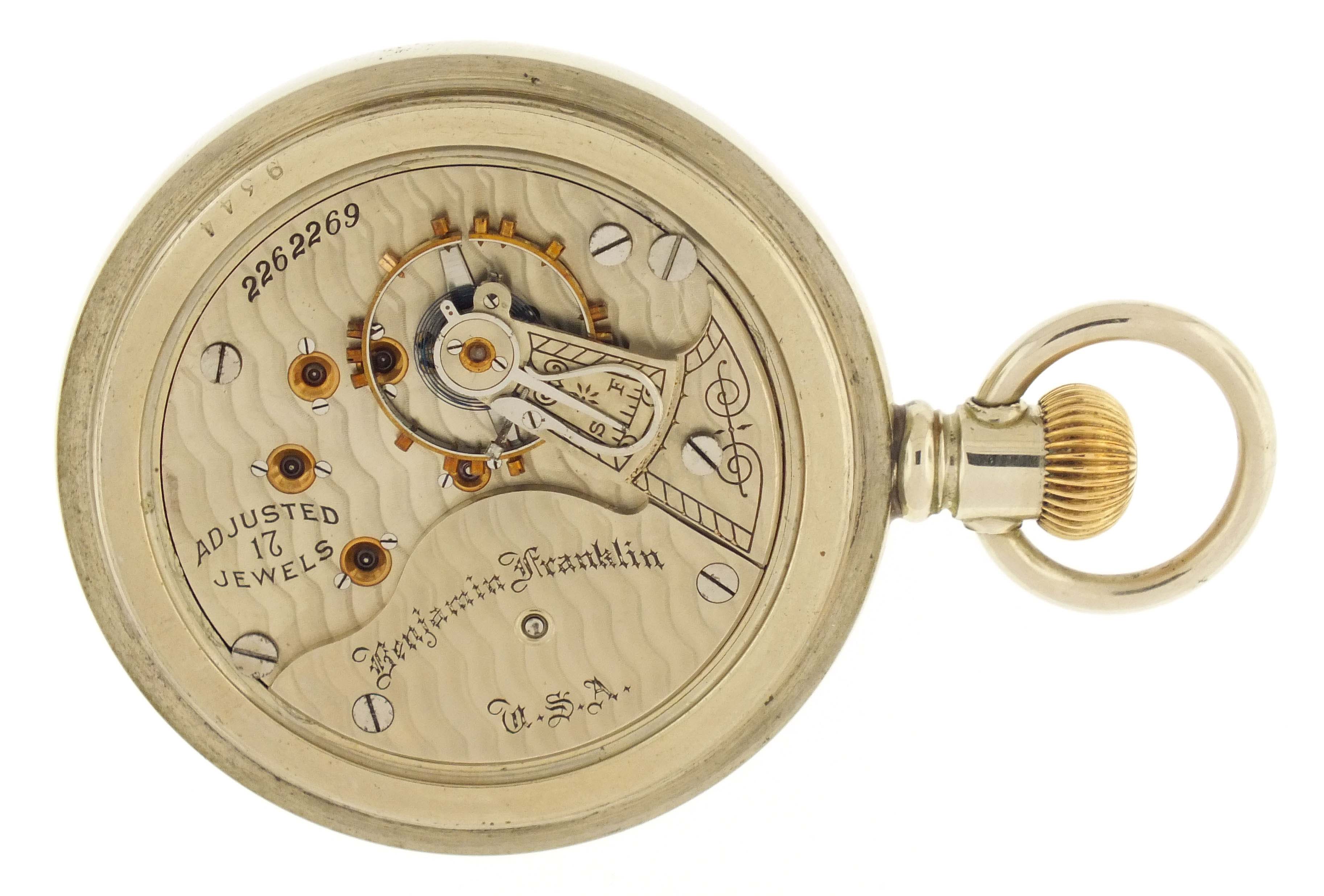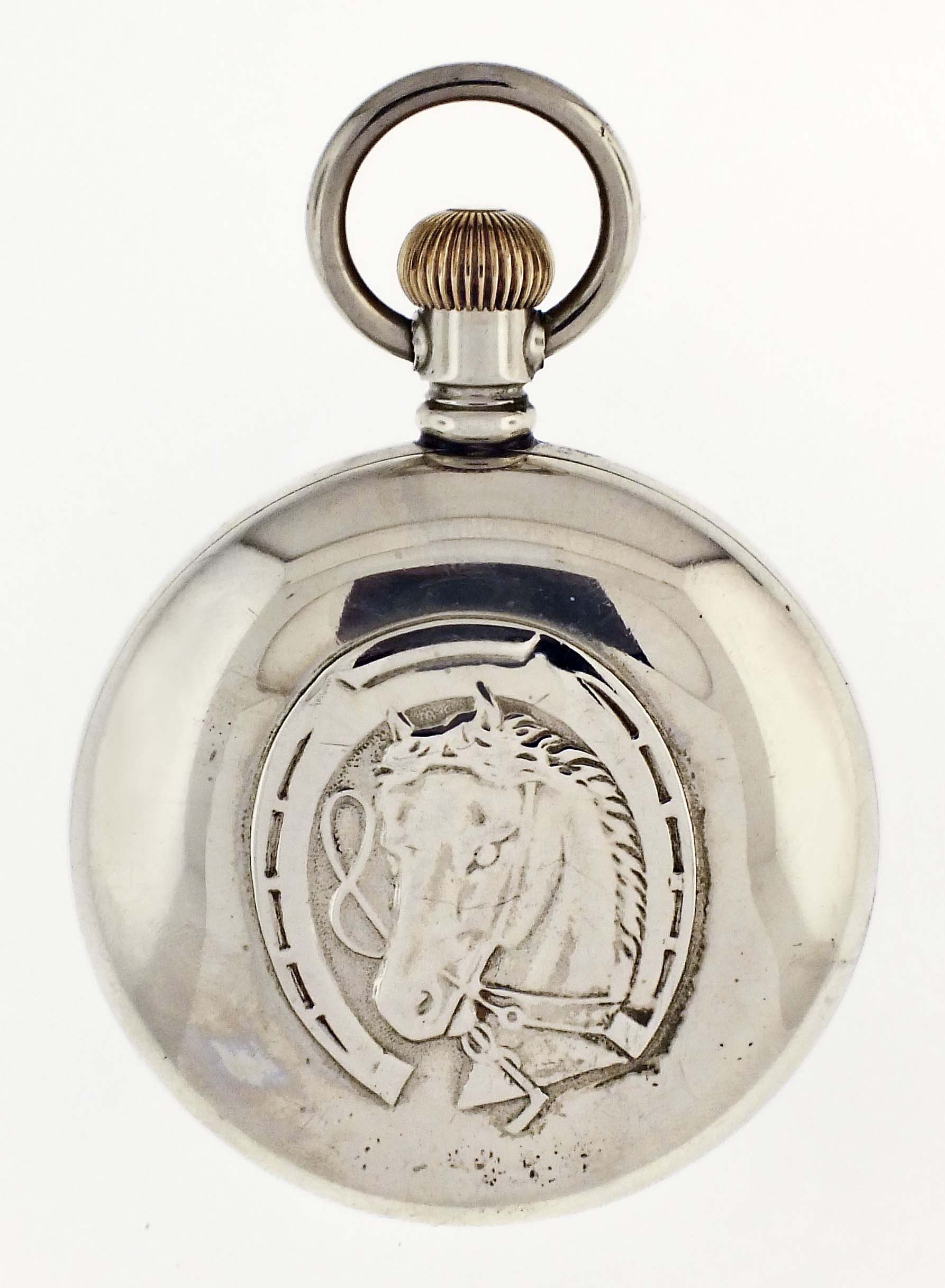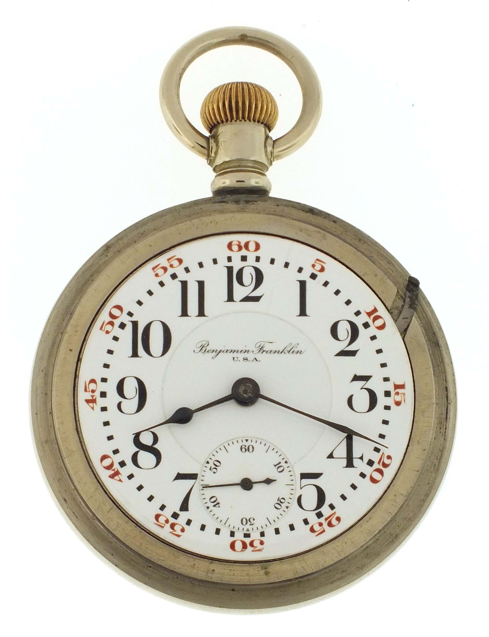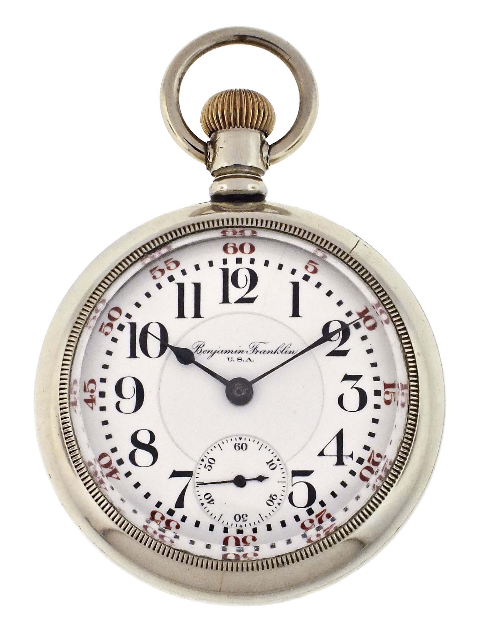 Illinois Watch Co., Springfield, Illinois, for Oskamp - Nolting Co., a "Benjamin Franklin" pocket watch, 18 size, 17 jewels, stem wind, lever set, adjusted to 3 positions and temperature, damascened nickel plate movement with lever escapement, cut bimetallic balance, and whiplash micrometric regulator in a nickel, screw back and bezel open face case with embossed horse within a horseshoe on back, arabic numeral outer red 5-minute markers double sunk white enamel dial, blued steel spade and poker hands, serial #2262269