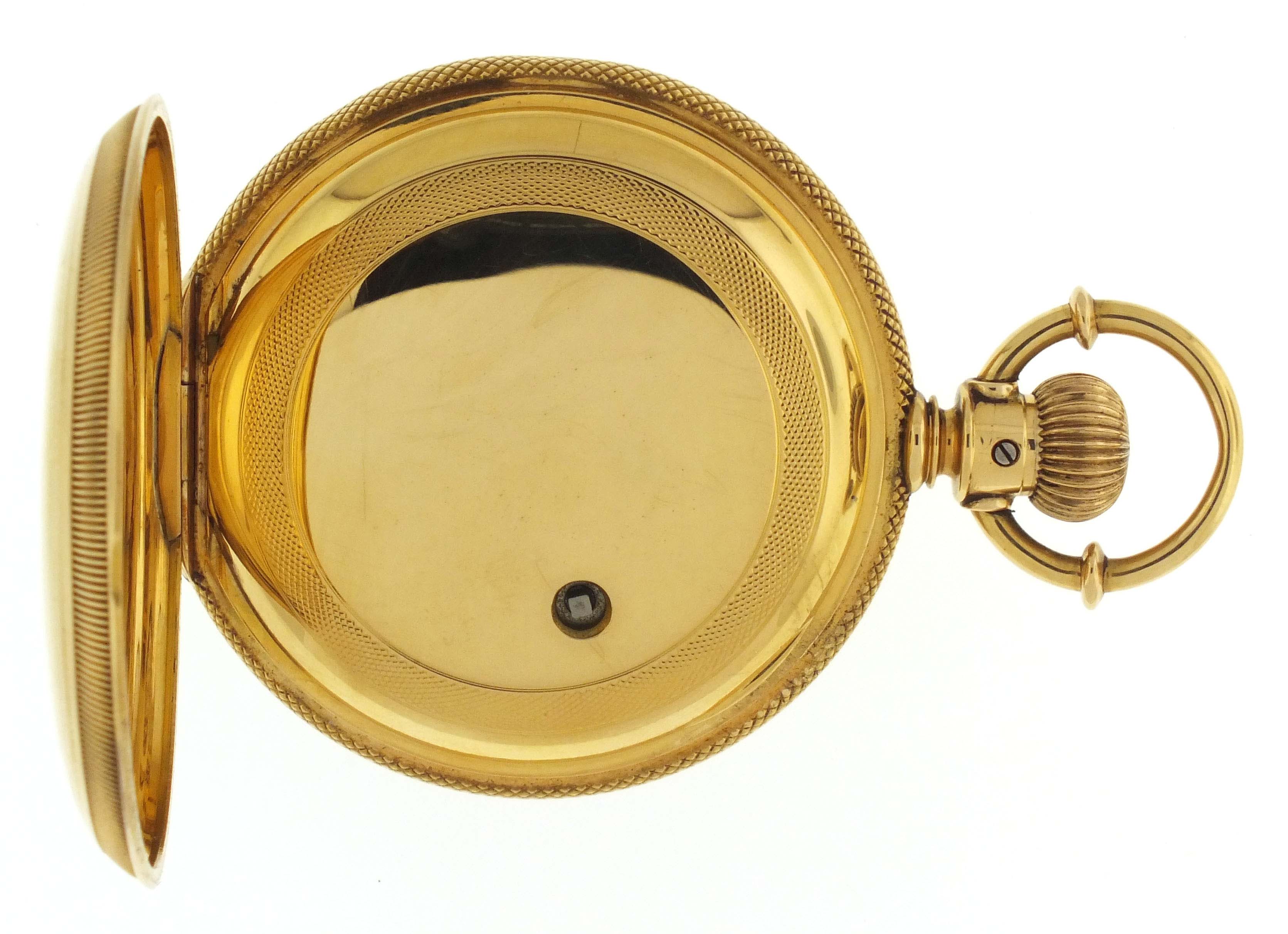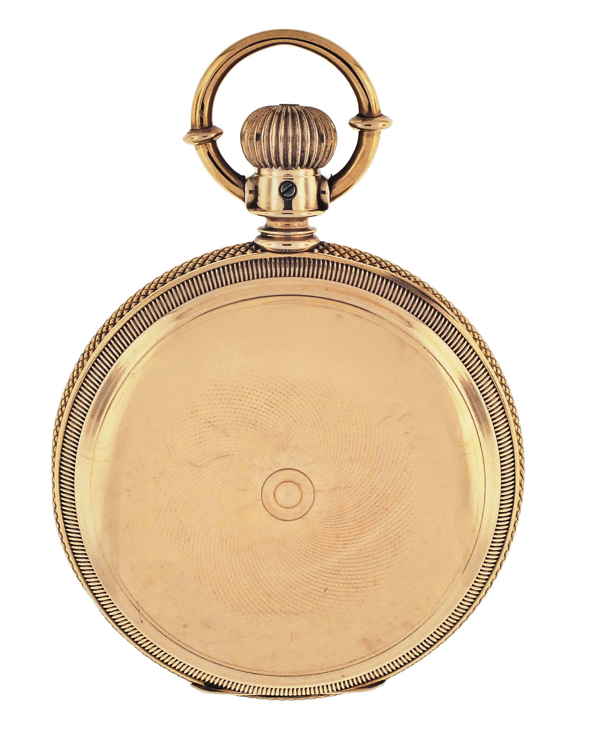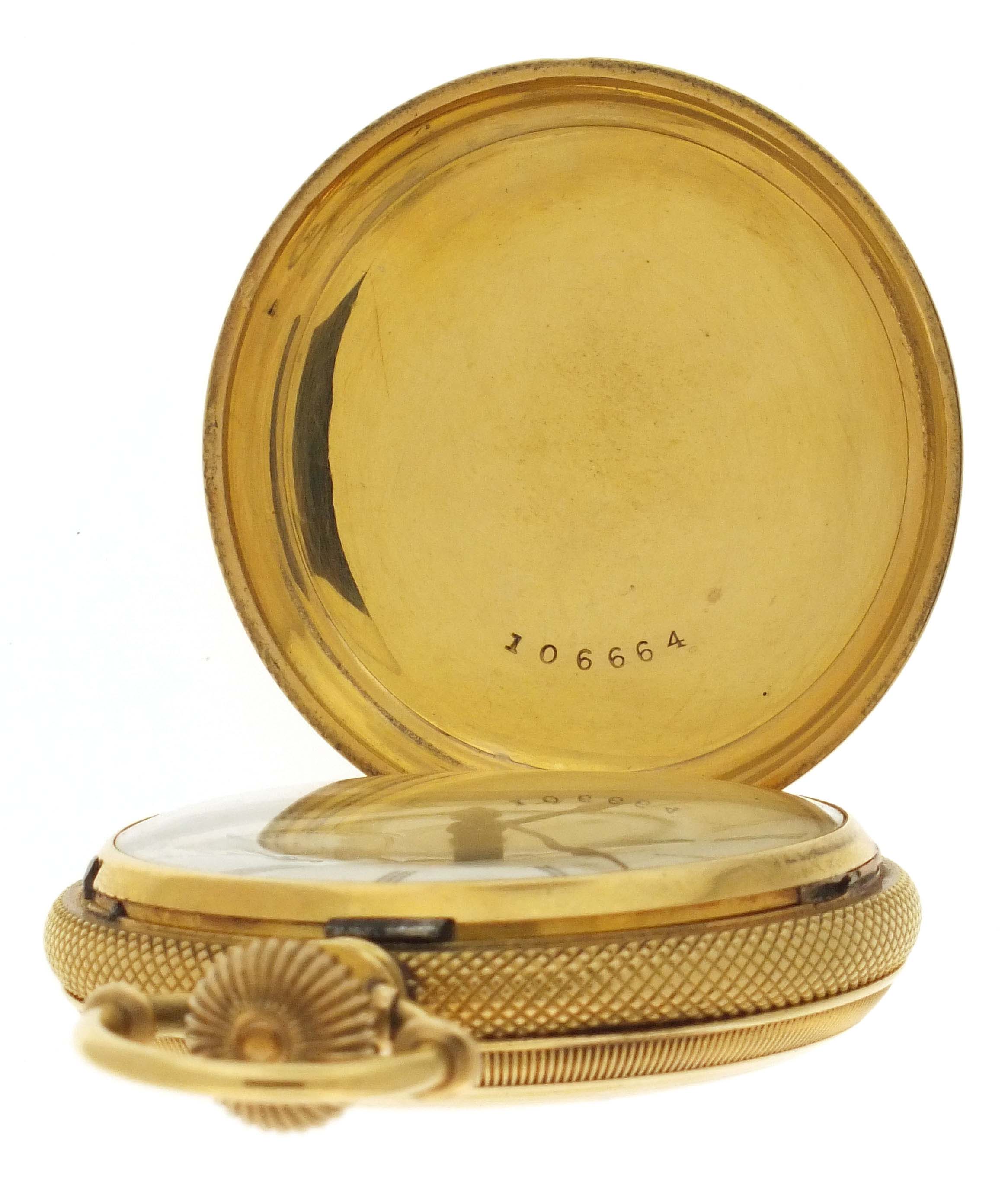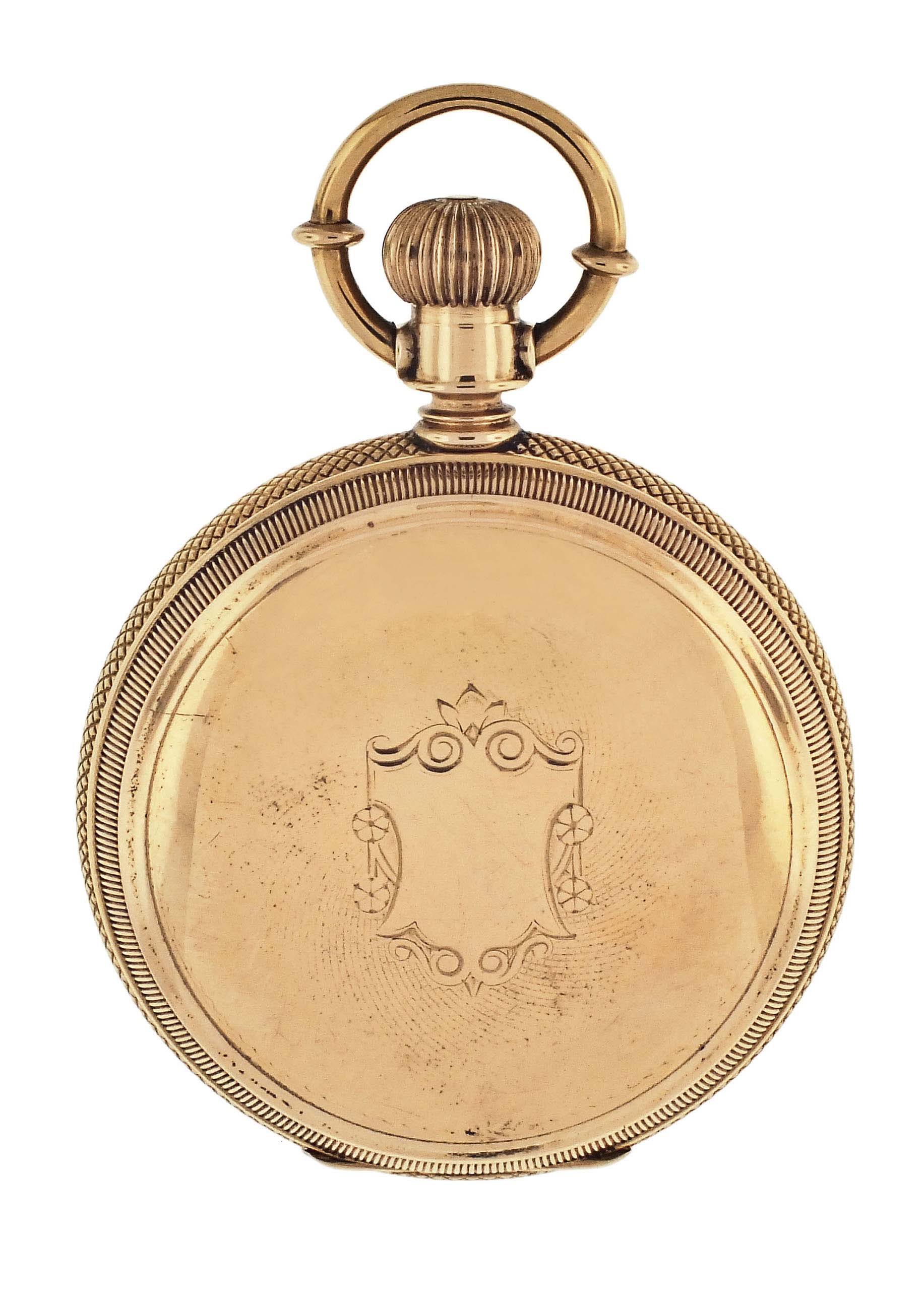 CASE: Small, shallow dents; Very fine scratches on outer surface of case; Very fine scratches on inner surface of case; Short scratch on inside of back cover; Cuvette with a few case knife marks and scratches; Front cover hinge a bit sticky; Engine turning nearly worn smooth; Bow with minor wear; Bezel lacking hinge pin and with one broken tube; Precious metal content marked. DIAL: Dirty, otherwise very good. HANDS: Minor oxide. MOVEMENT PLATES: Very fine scratches on plate; A more significant scratch to the right of the balance cock; Balance cock foot with minor gouge; Regulator and stud with specks of oxide; Dirty. MOVEMENT FUNCTION: Running order (winds, sets and ticks); Would benefit from service.