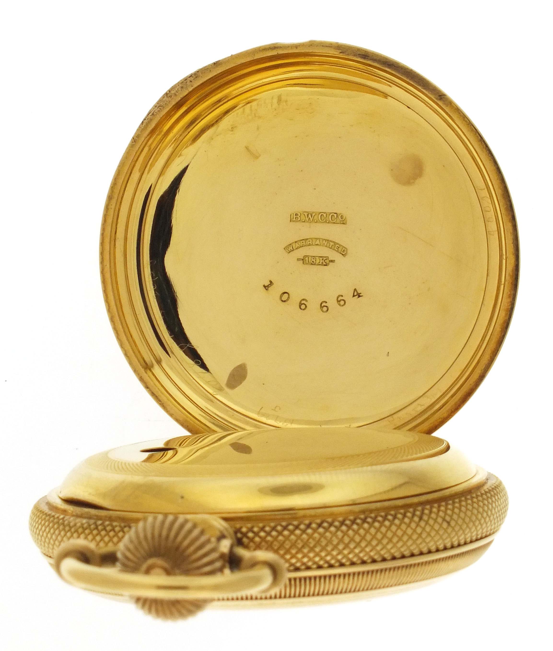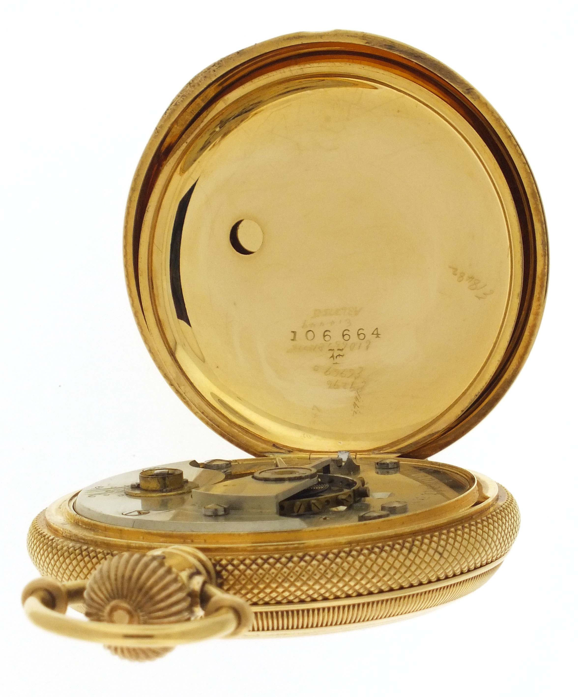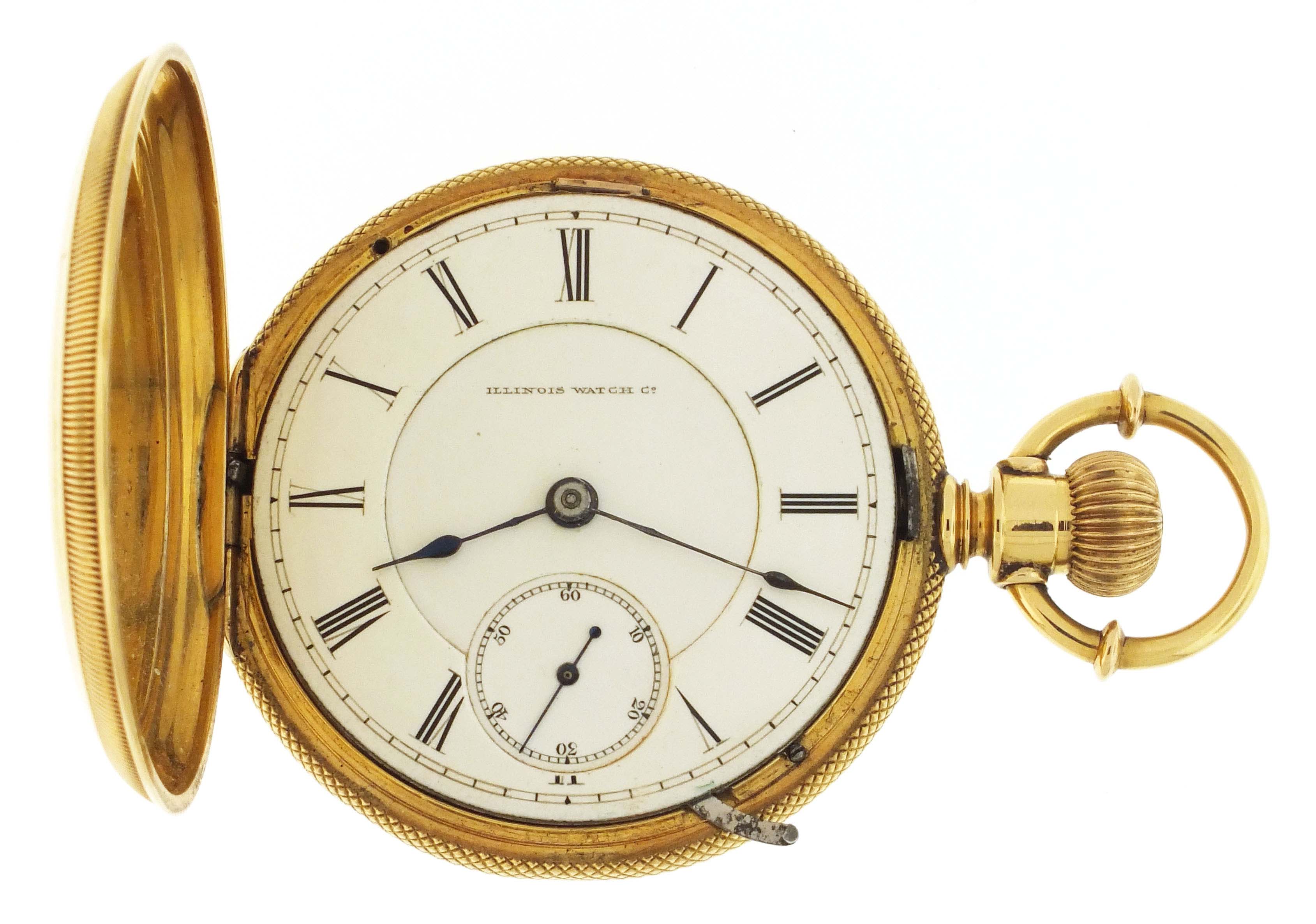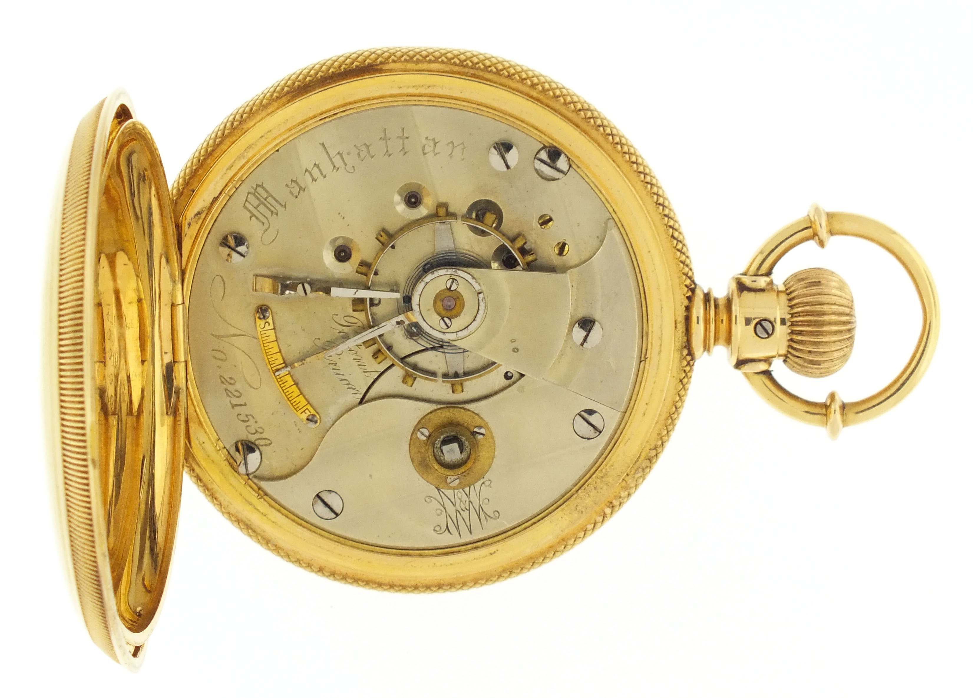 Illinois Watch Co., Springfield, Illinois, a gold "Manhattan" pocket watch, 11 jewels, 18 size, transitional stem wind and lever set, damascened nickel plate movement with lever escapement and cut bimetallic balance in an 18 karat, yellow gold engine turned and engraved hunting case, roman numeral, double sunk white enamel dial with blued steel spade hands, serial #221530, 136.2g TW