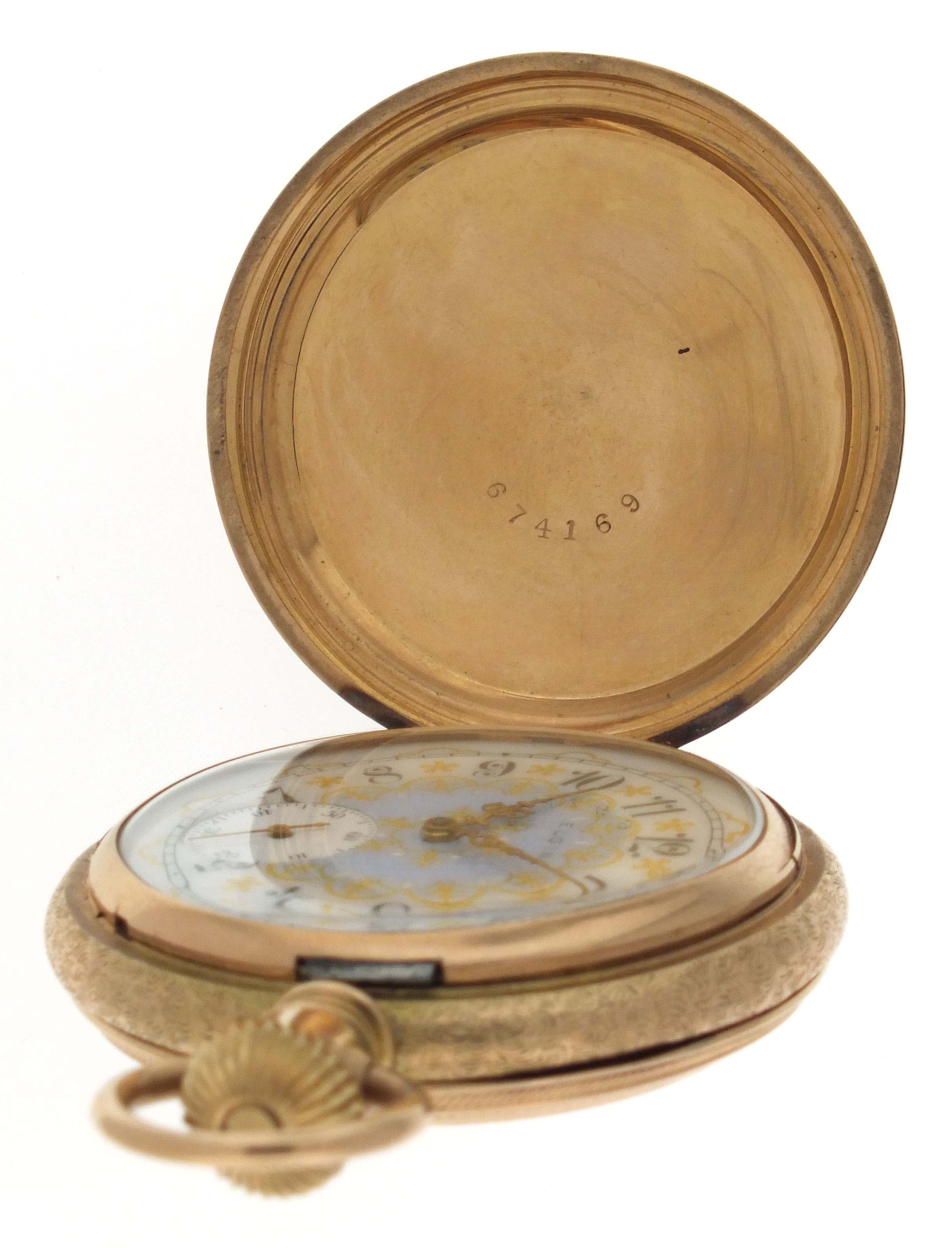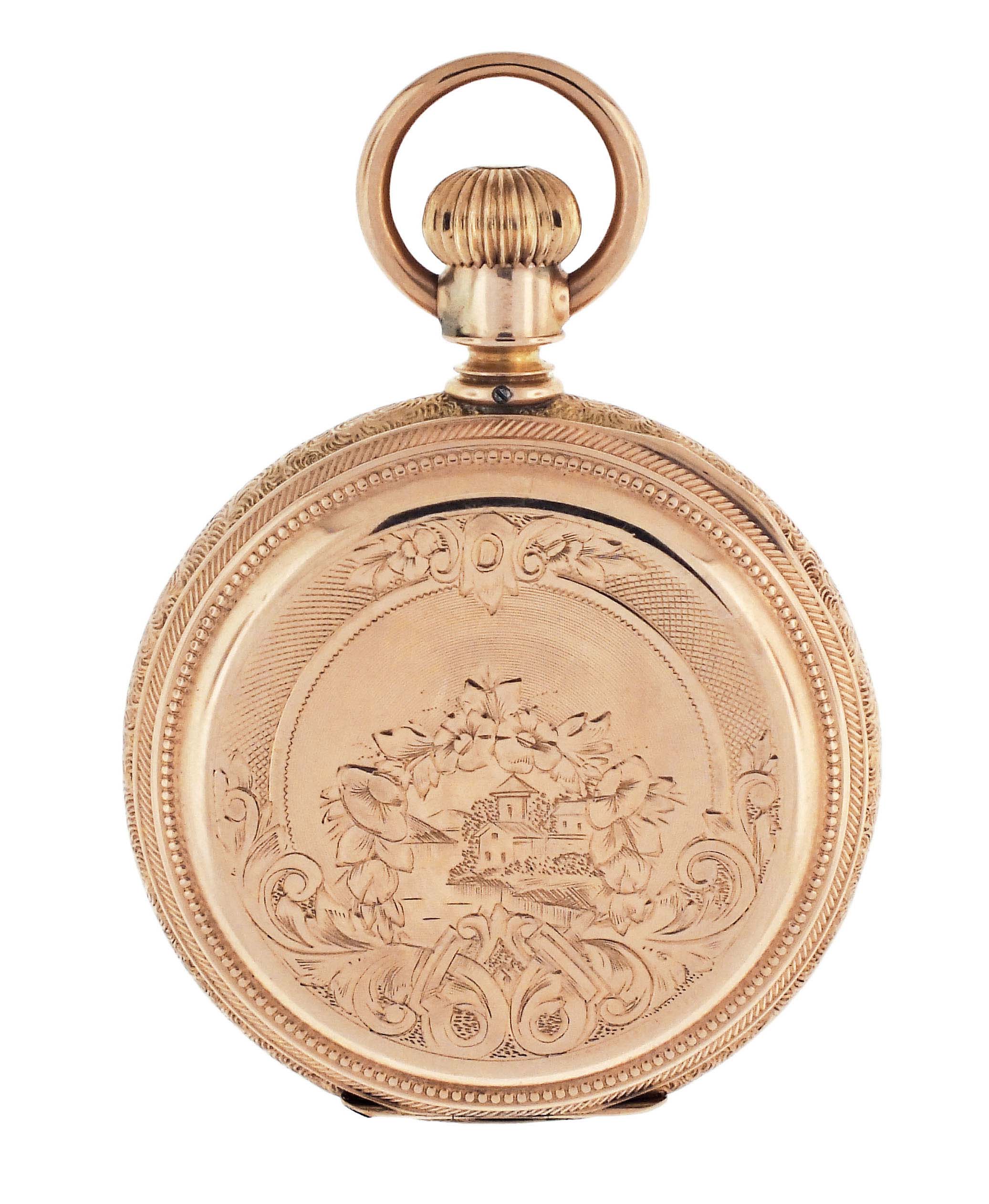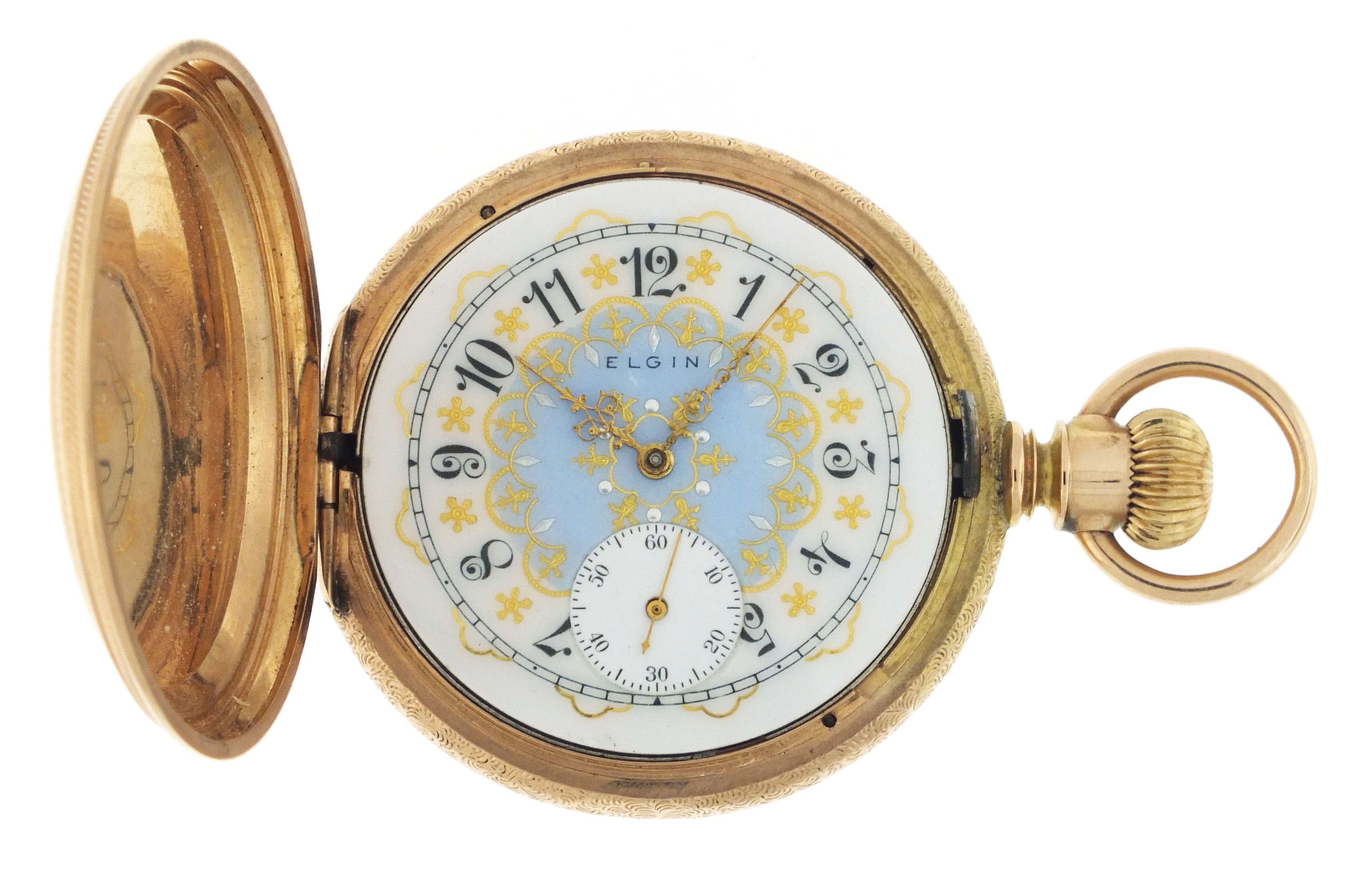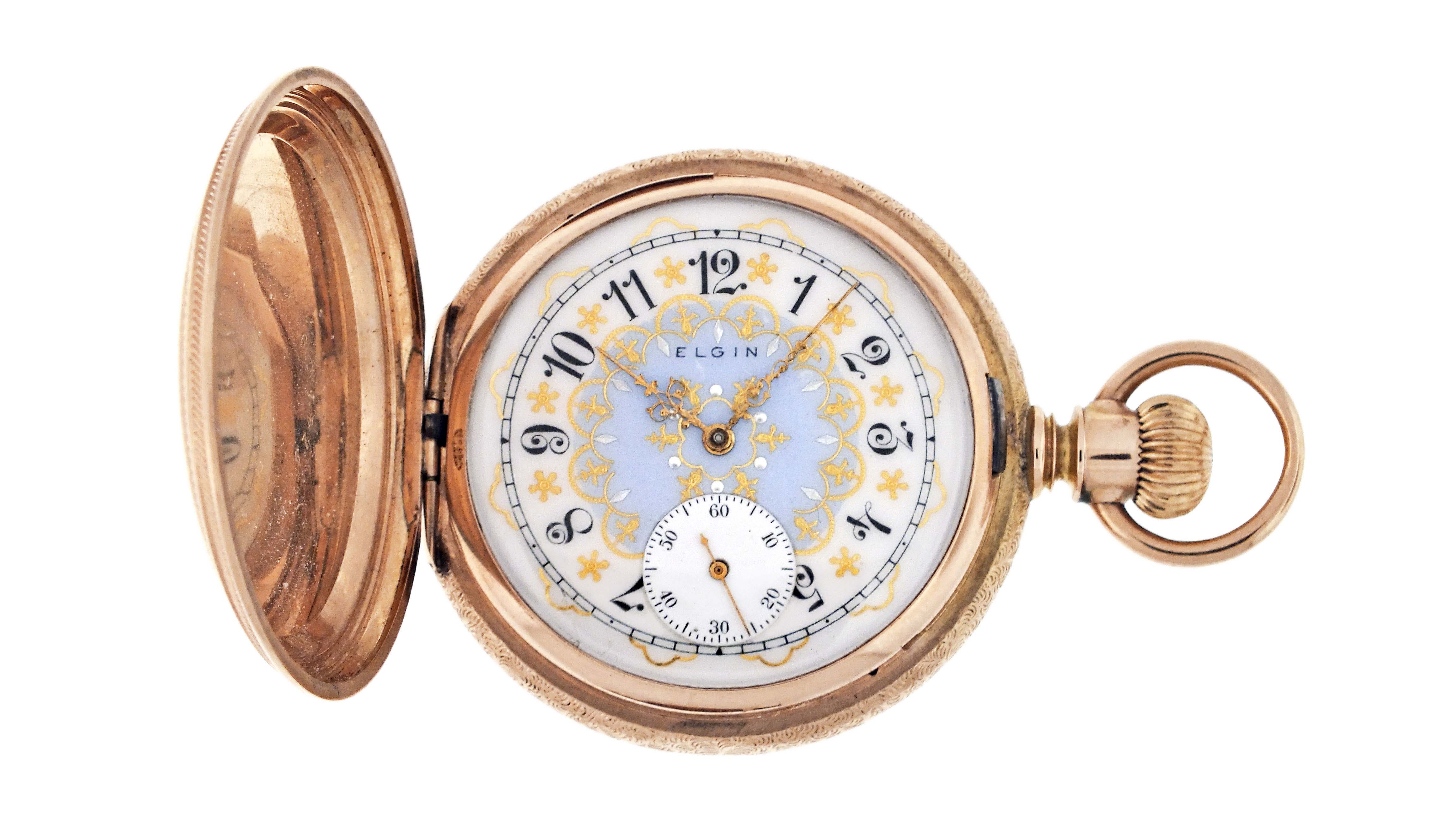 Elgin National Watch Co., Elgin, Illinois, an early 20th century gold pocket watch with fancy dial, 16 size, 17 jewels, stem wind and set, damascened, nickel plate movement with lever escapement, cut bimetallic balance, and Moseley micrometric regulator in a 14 karat, rose gold, engine turned and engraved hunting case, arabic numeral, single sunk O'Hara style multicolor enamel dial with gilt Louis XIV style hands, serial #14470179, 103.8g TW