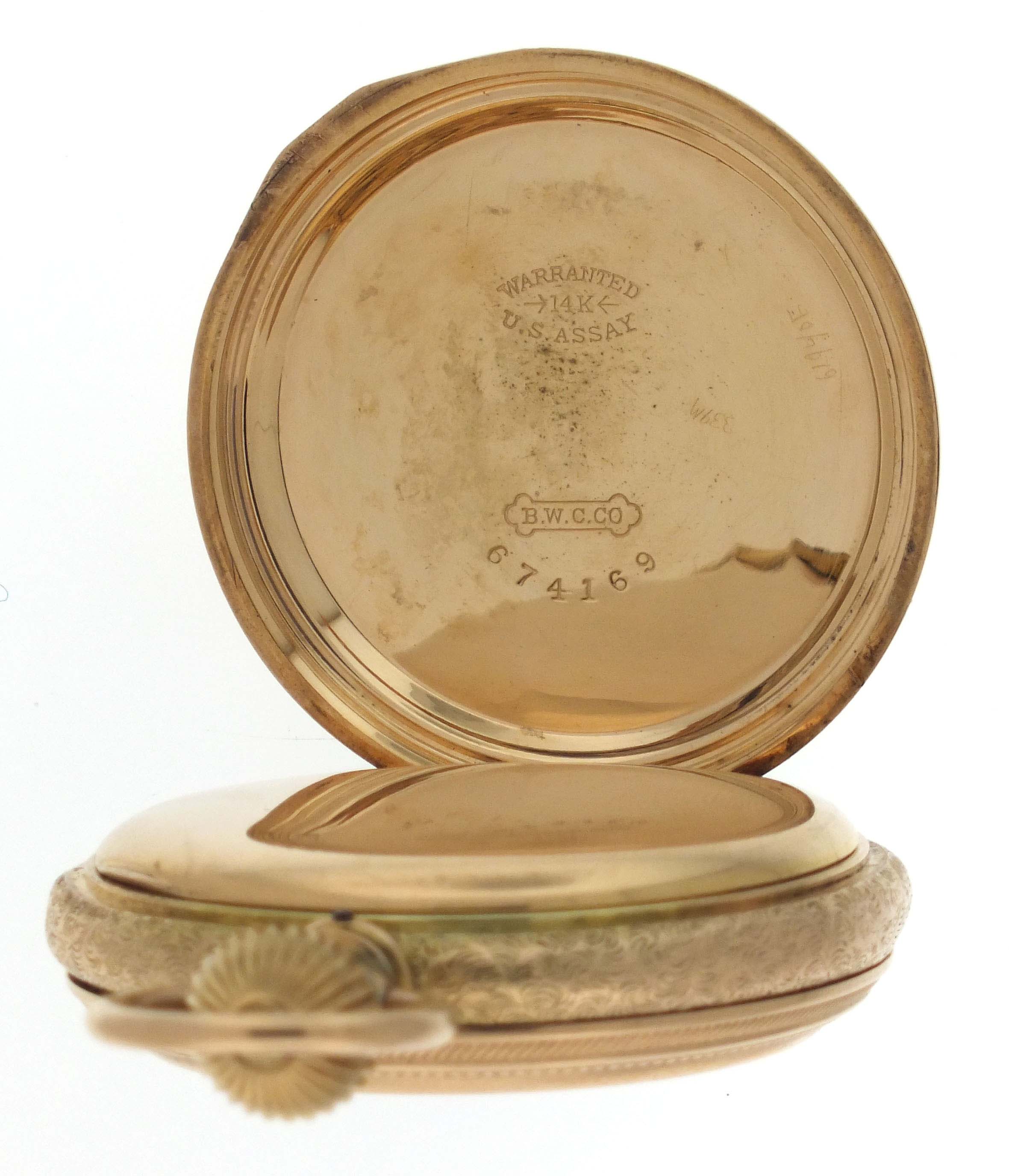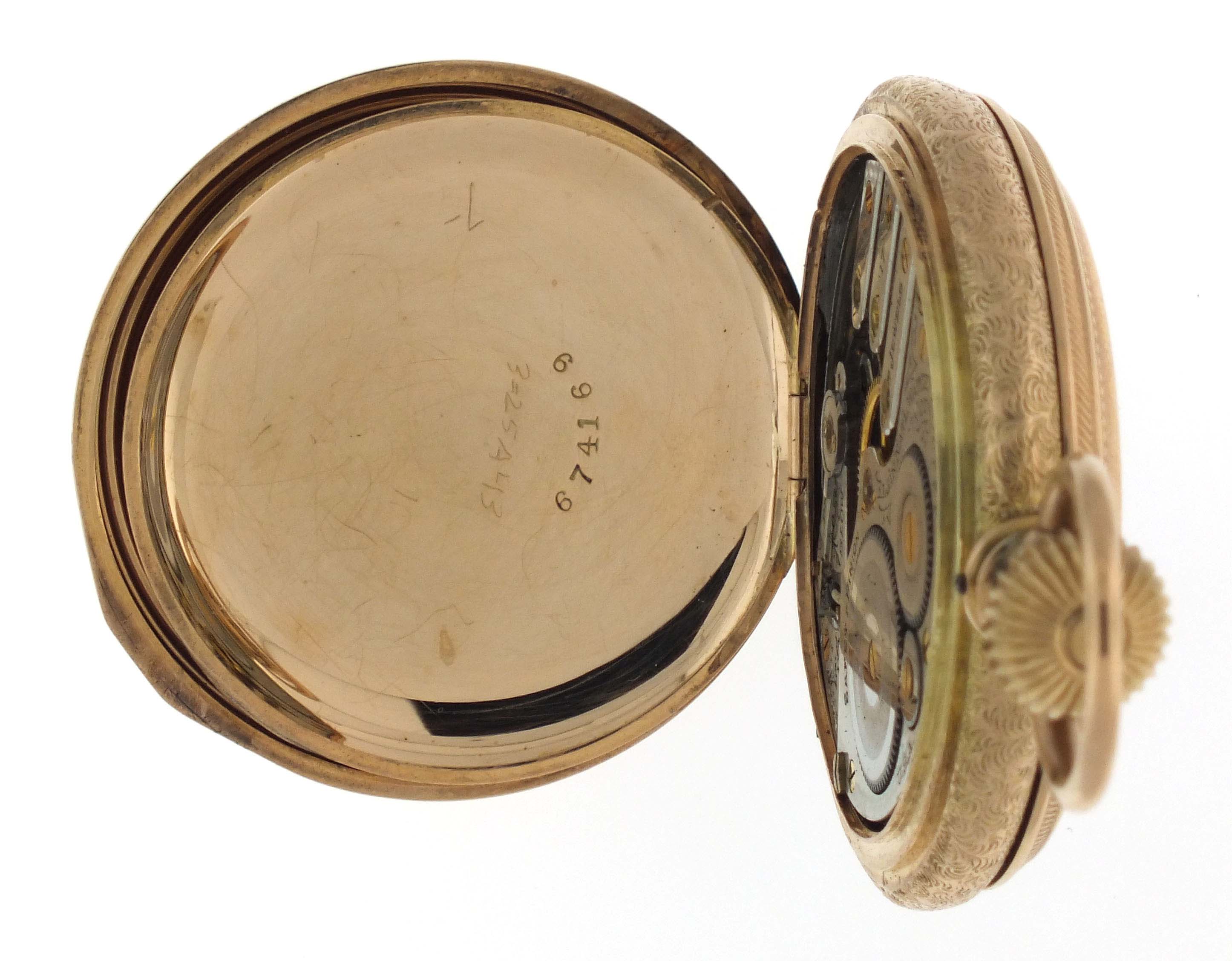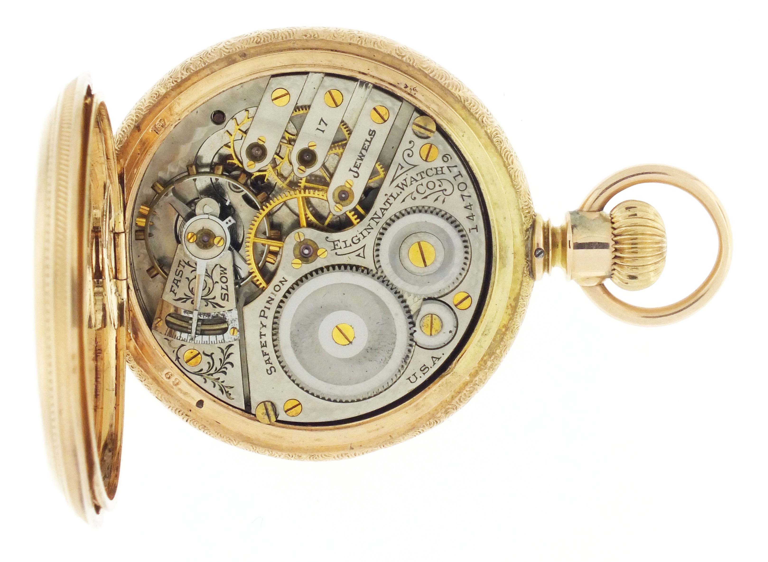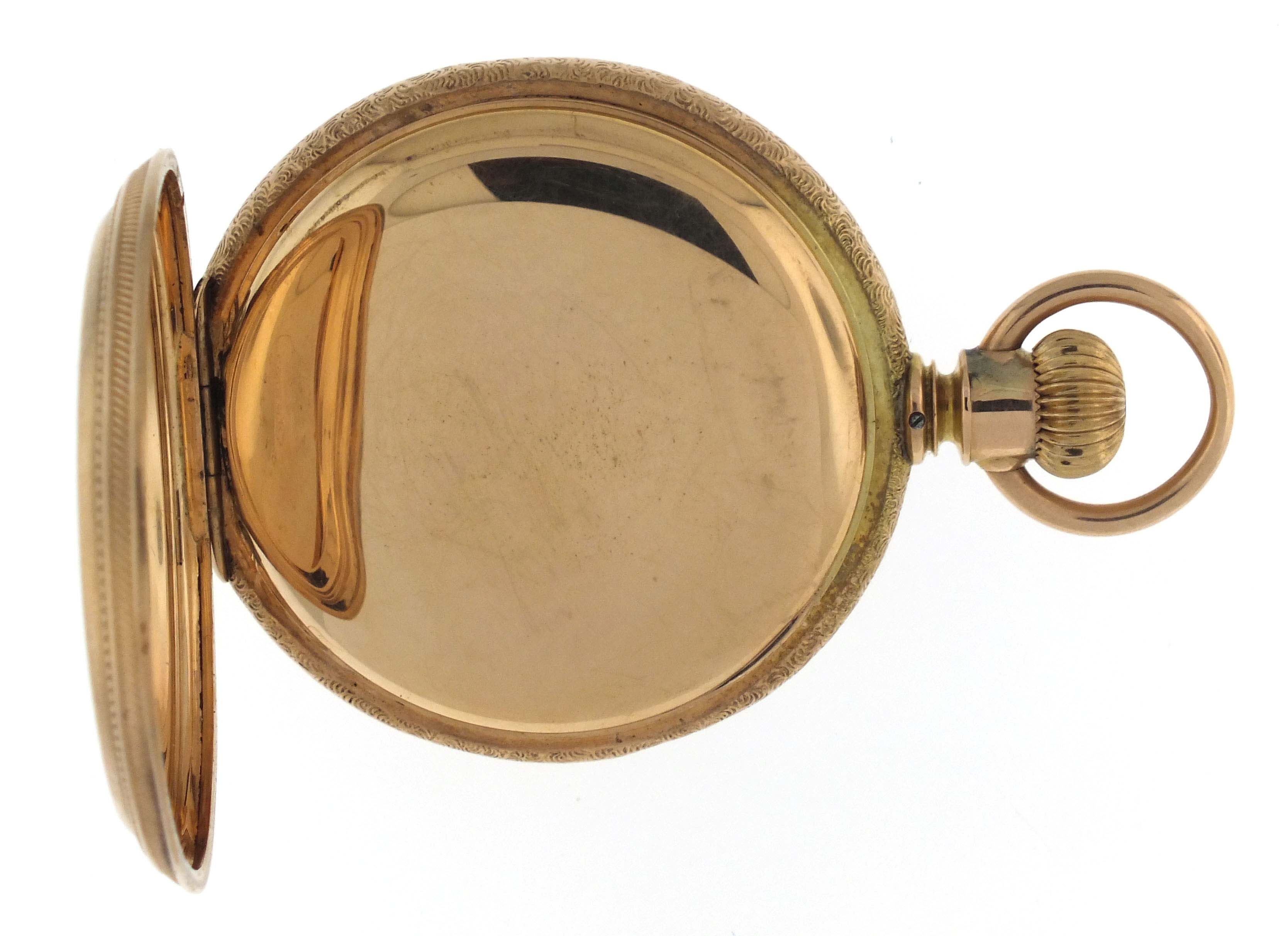 Elgin National Watch Co., Elgin, Illinois, an early 20th century gold pocket watch with fancy dial, 16 size, 17 jewels, stem wind and set, damascened, nickel plate movement with lever escapement, cut bimetallic balance, and Moseley micrometric regulator in a 14 karat, rose gold, engine turned and engraved hunting case, arabic numeral, single sunk O'Hara style multicolor enamel dial with gilt Louis XIV style hands, serial #14470179, 103.8g TW