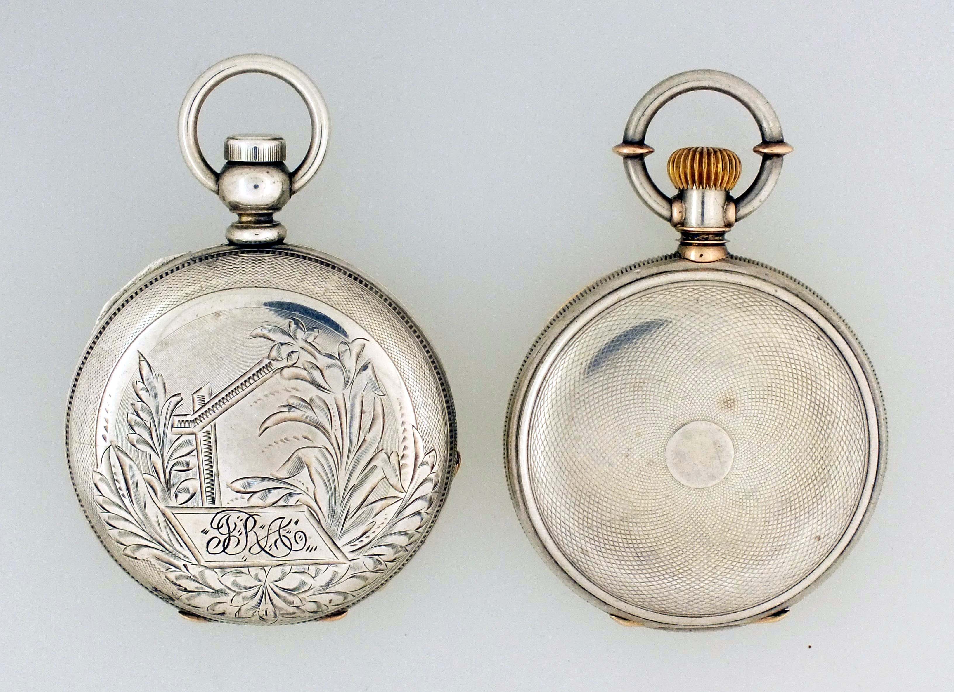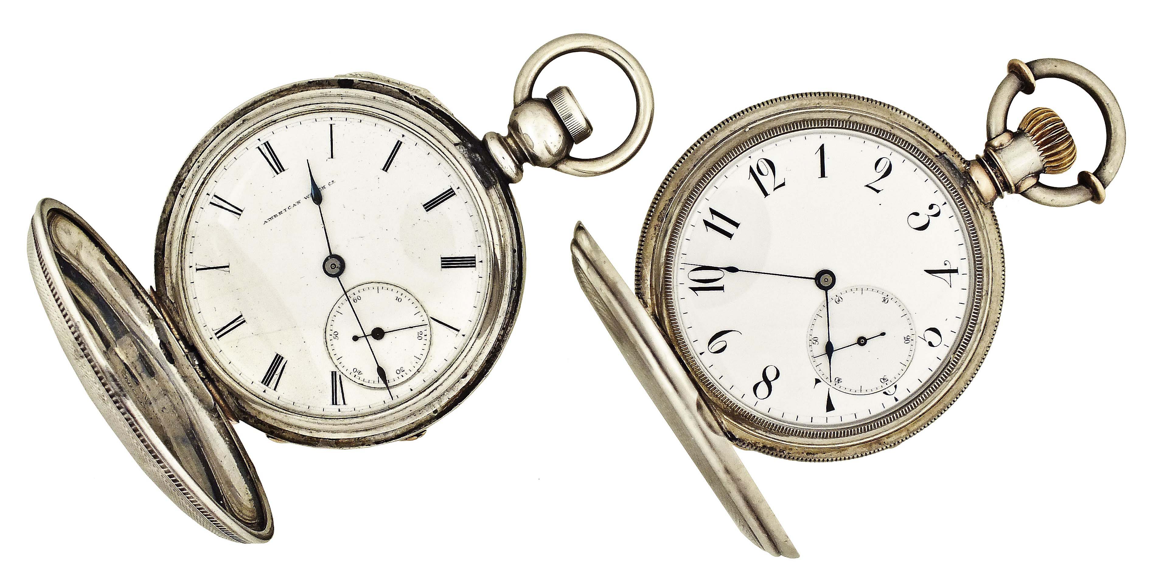 2 (Two) American pocket watches, 16 size, key wind, roman and arabic numeral enamel dials, gilt movements in coin silver hunting cases, including a Philadelphia Watch Co. "Paulus Patents", 15 jewel, serial #6564, and a Waltham model 1860, "Amn. Watch Co." 15 jewel, serial #330725