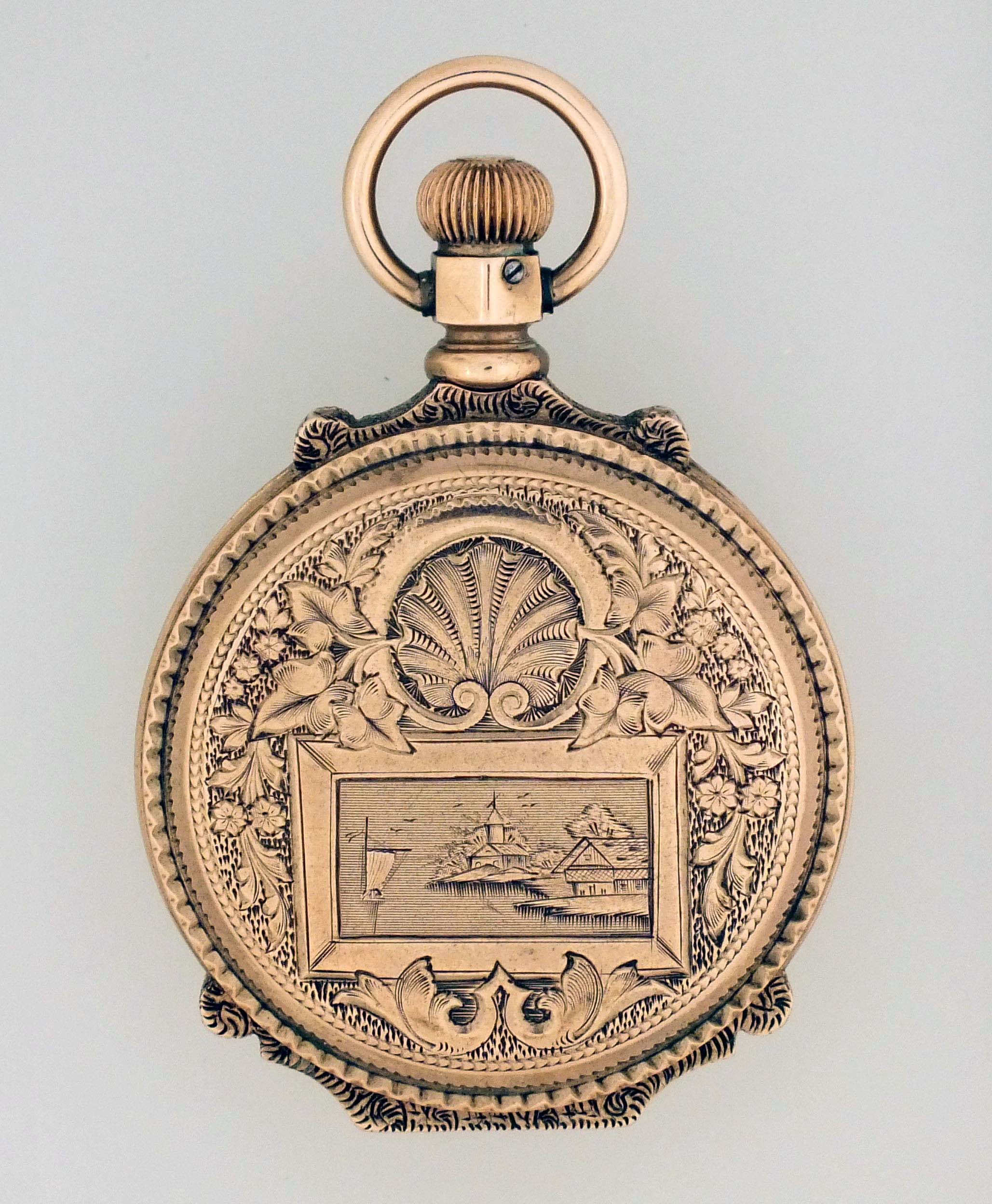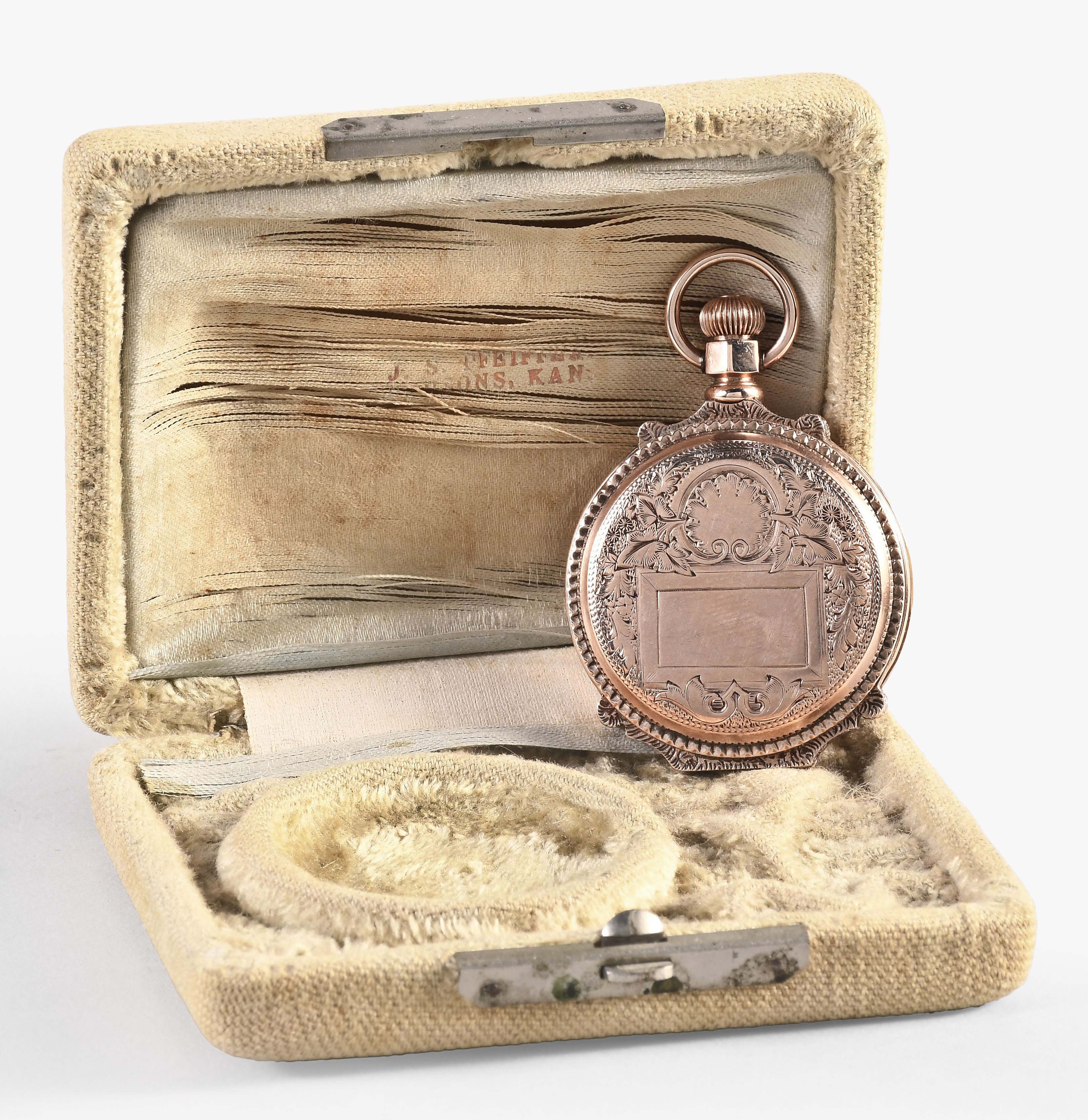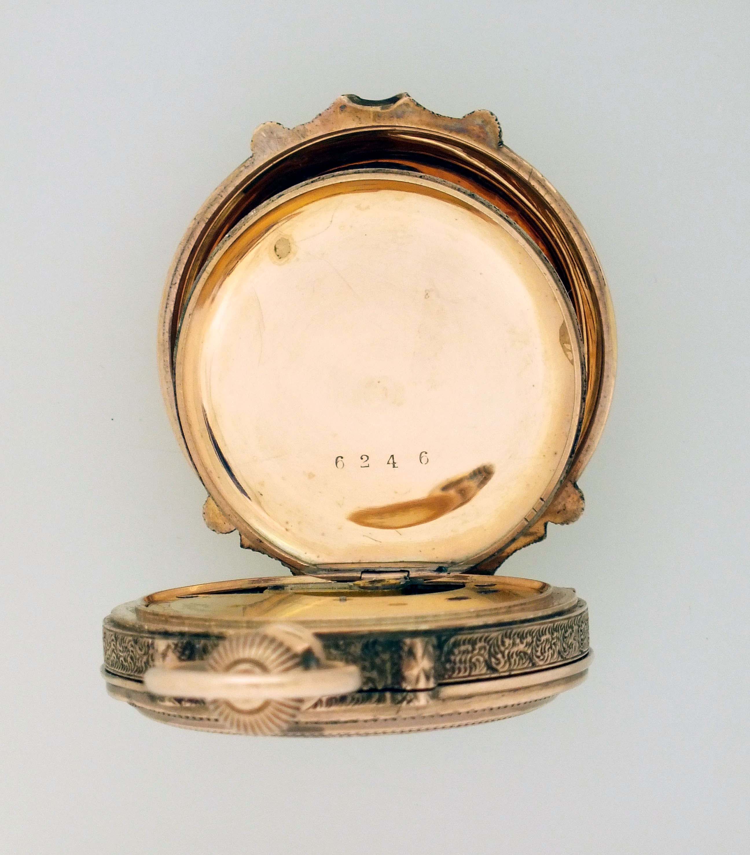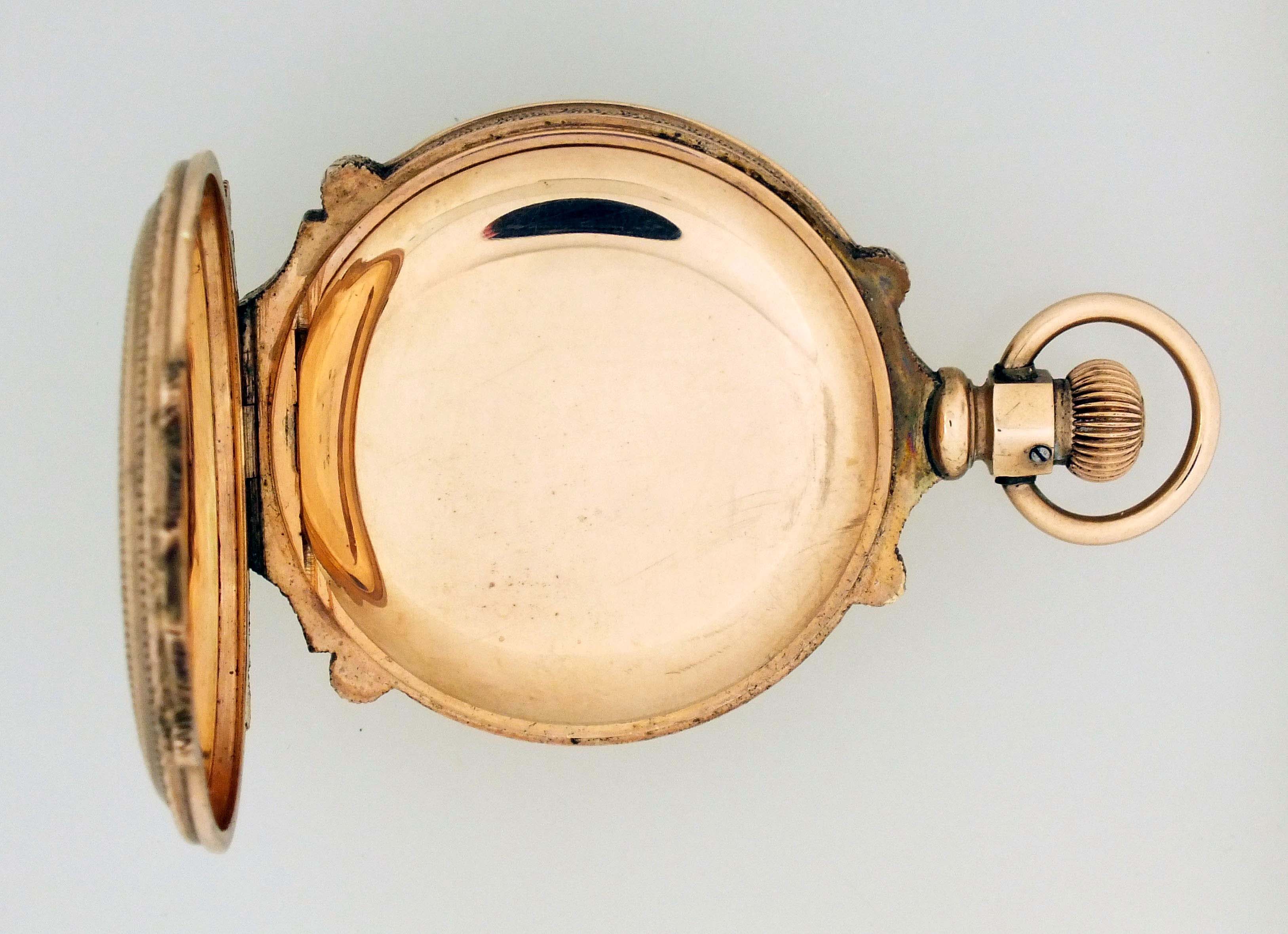 American Waltham Watch Co., Waltham, Mass., a late 19th century model 1873 pocket watch with gold case, 8 size, 11 jewel, stem wind and lever set gilt plate movement with lever escapement and cut bimetallic balance in a 9 - 10 karat, rose gold, engraved, box hinge hunting case, roman numeral, single sunk white enamel dial with blued steel spade hands, serial #1149291, 68.6g TW, with jeweler's box.