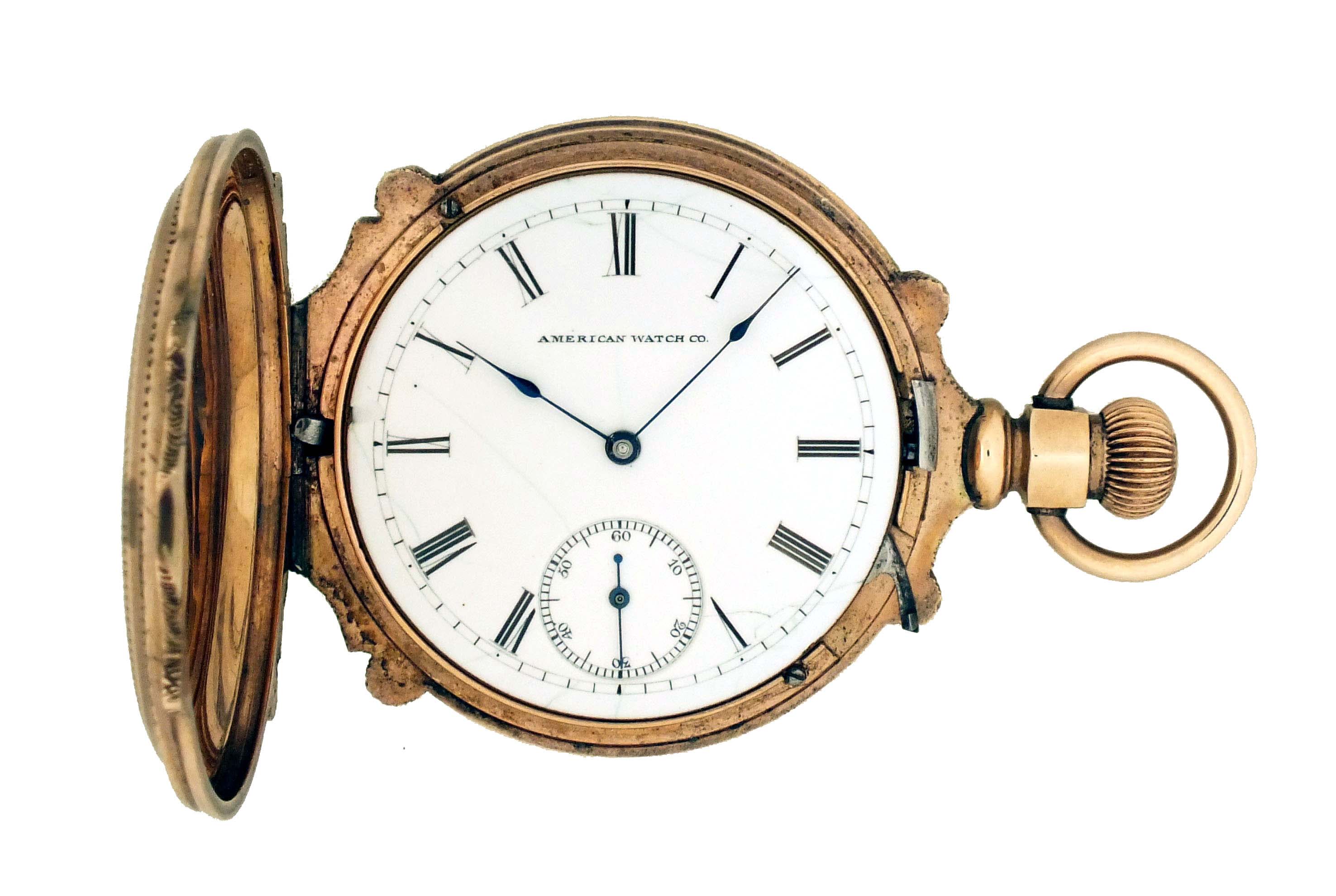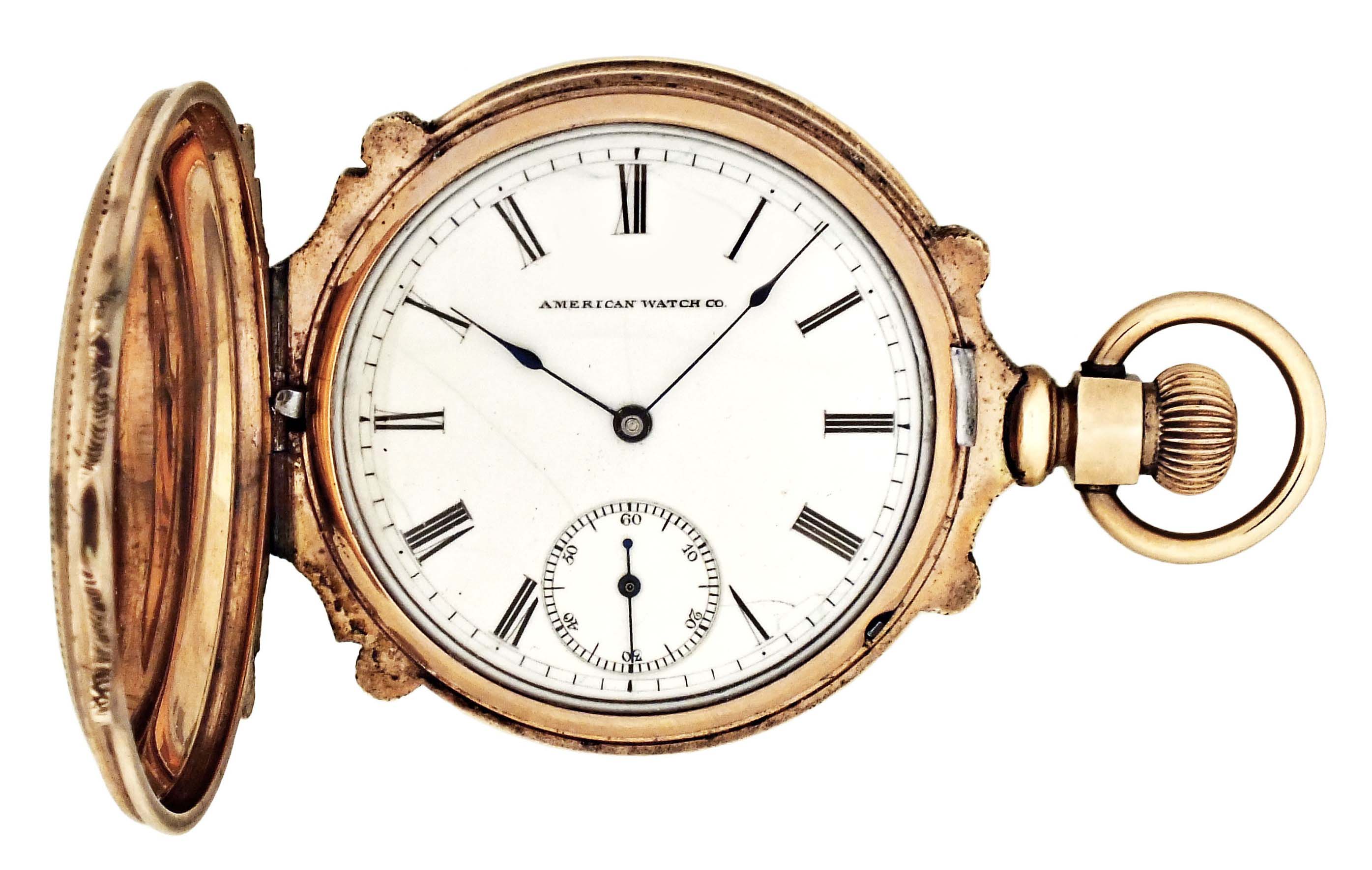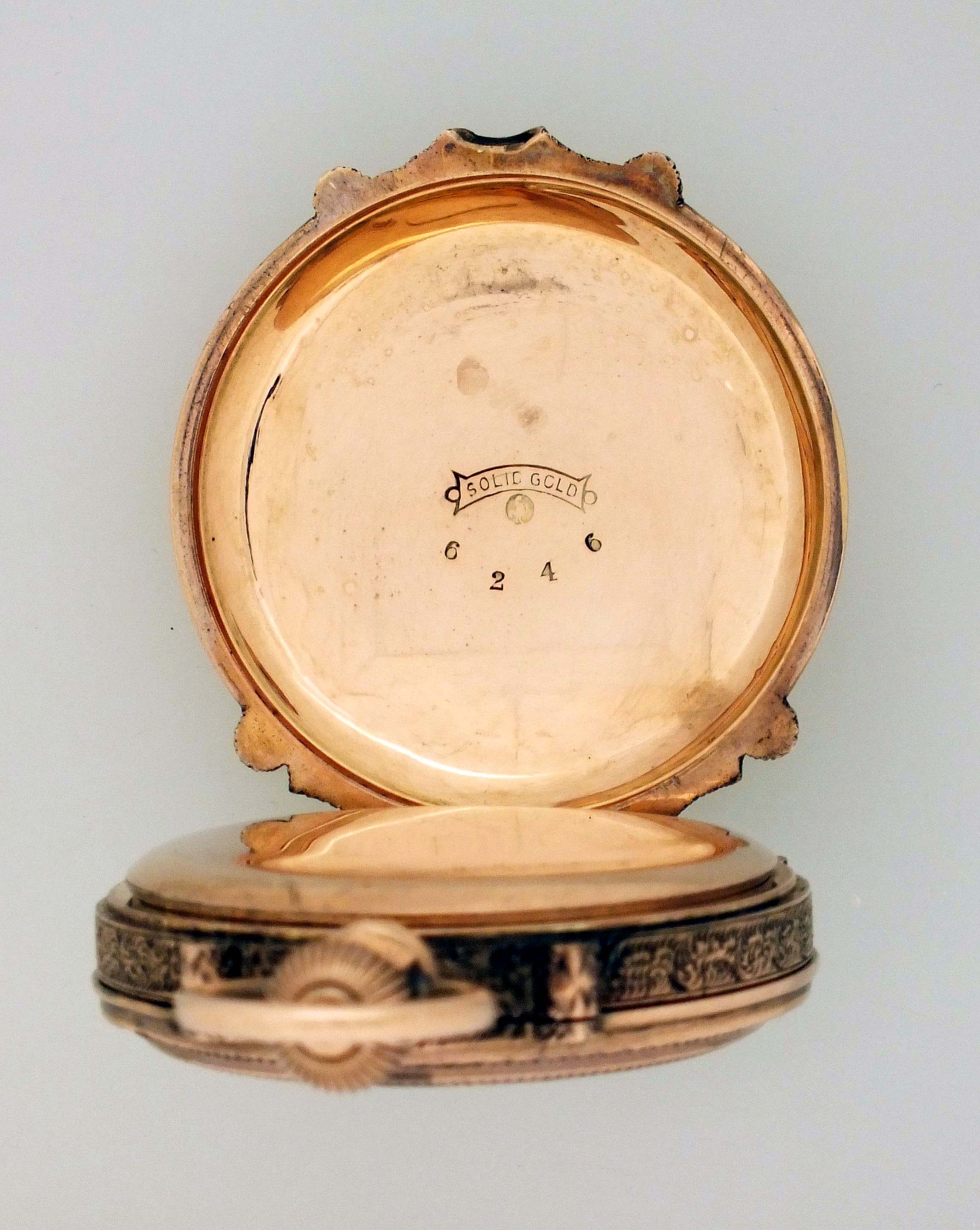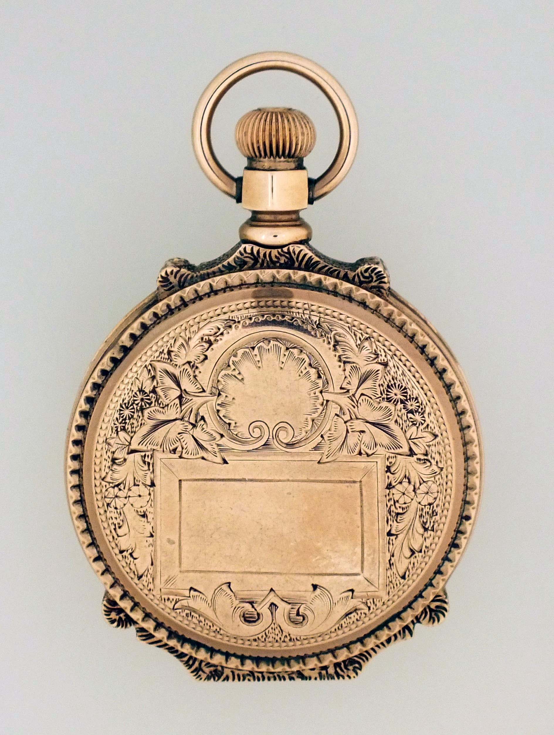 American Waltham Watch Co., Waltham, Mass., a late 19th century model 1873 pocket watch with gold case, 8 size, 11 jewel, stem wind and lever set gilt plate movement with lever escapement and cut bimetallic balance in a 9 - 10 karat, rose gold, engraved, box hinge hunting case, roman numeral, single sunk white enamel dial with blued steel spade hands, serial #1149291, 68.6g TW, with jeweler's box.