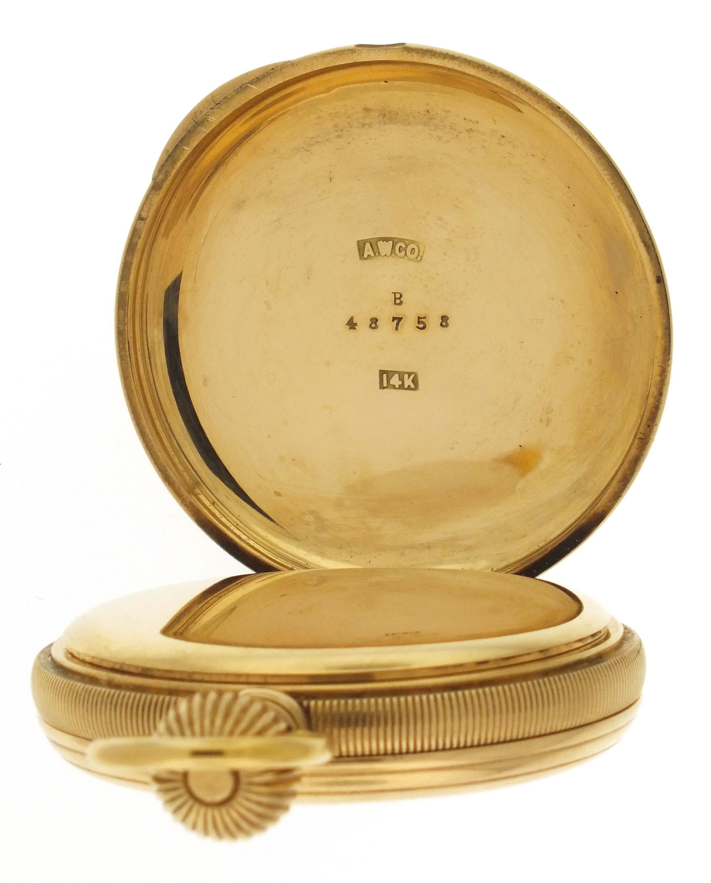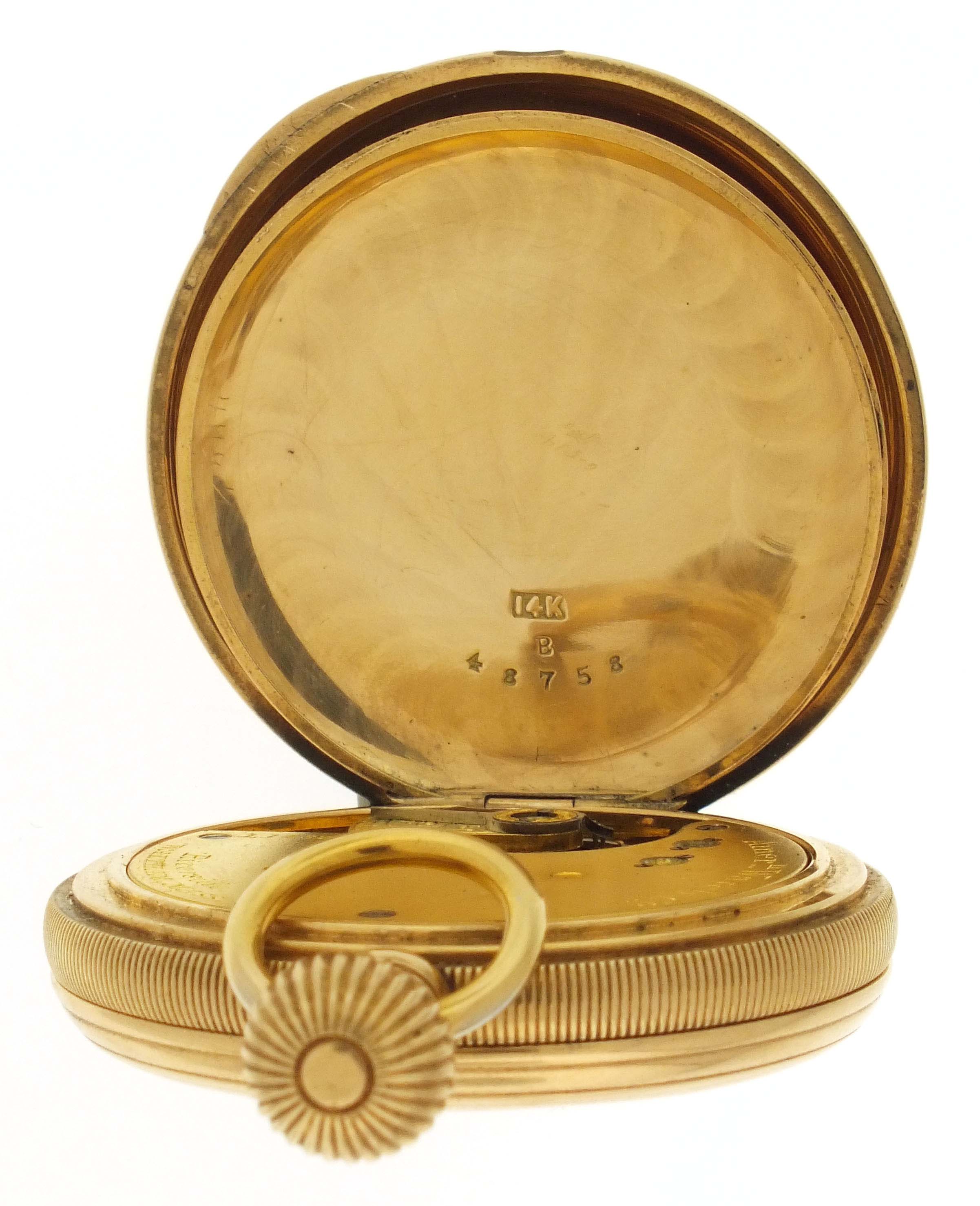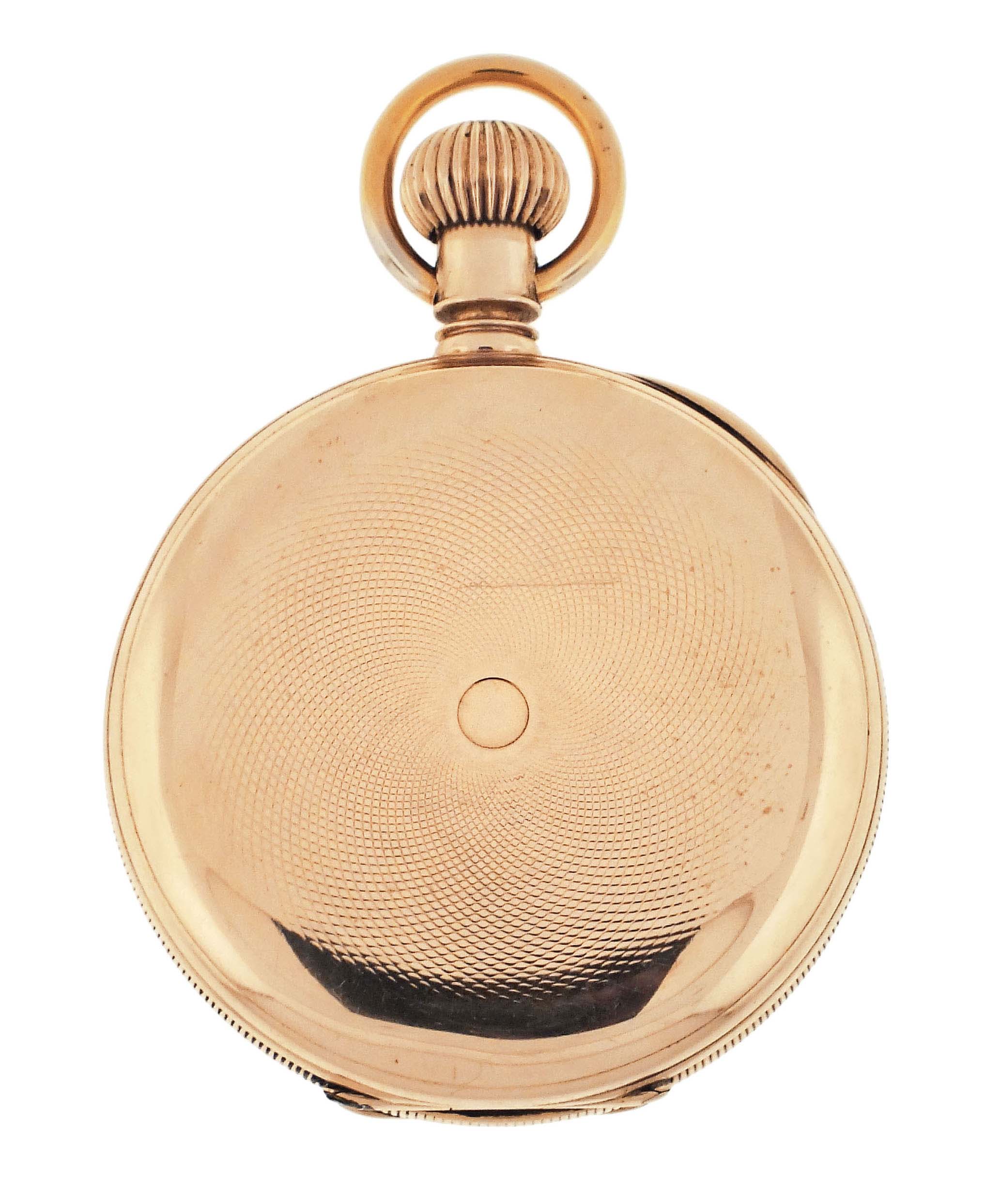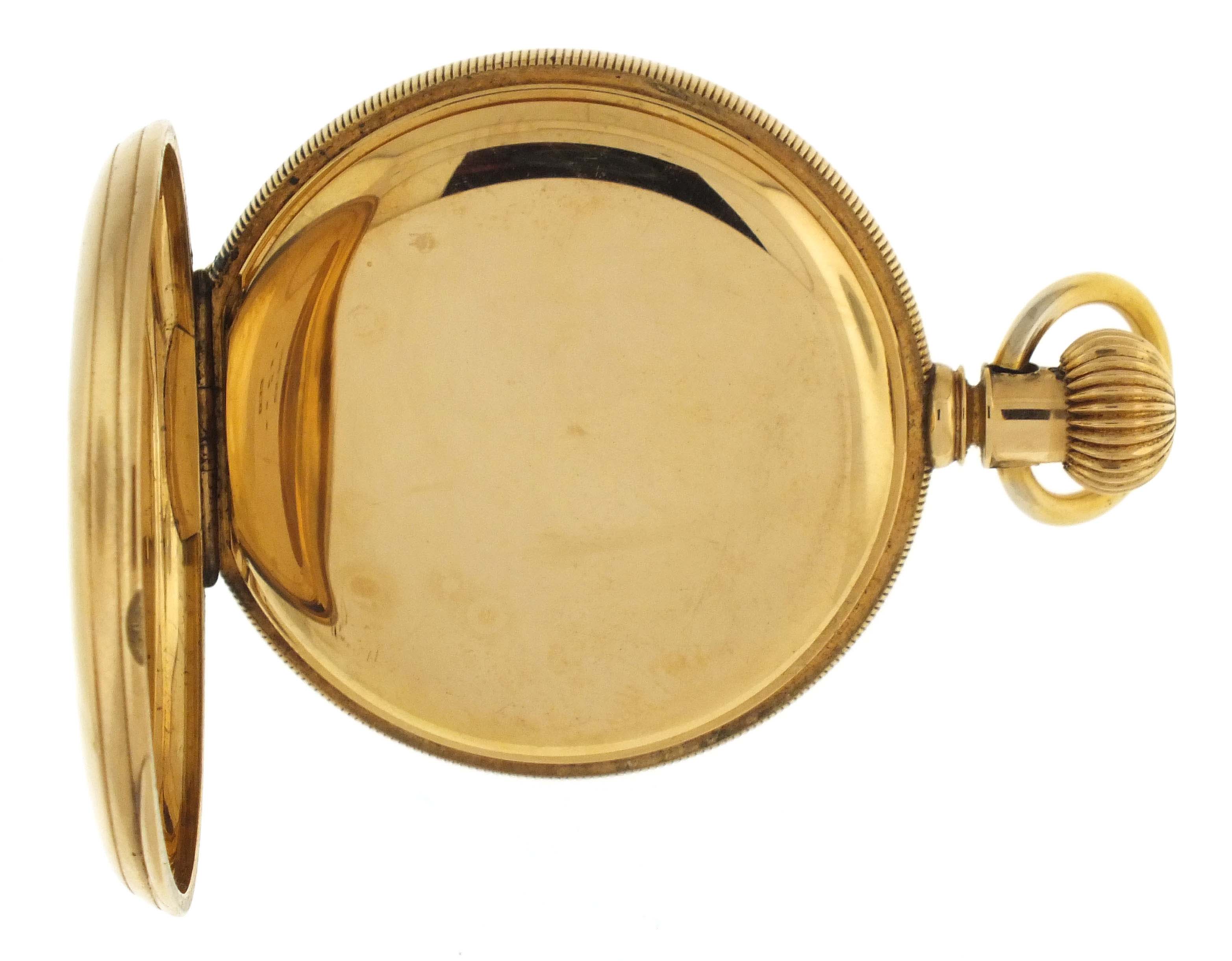 American Waltham Watch Co., Waltham, Mass., a late 19th century model 1874 "Riverside" pocket watch, 14 size, 13 jewels, stem wind and lever set gilt plate movement with lever escapement and cut bimetallic balance in a 14 karat, yellow gold, reeded edge, engine turned hunting case, roman numeral, single sunk white enamel dial with blued steel spade hands, serial #1143285,115.4g TW