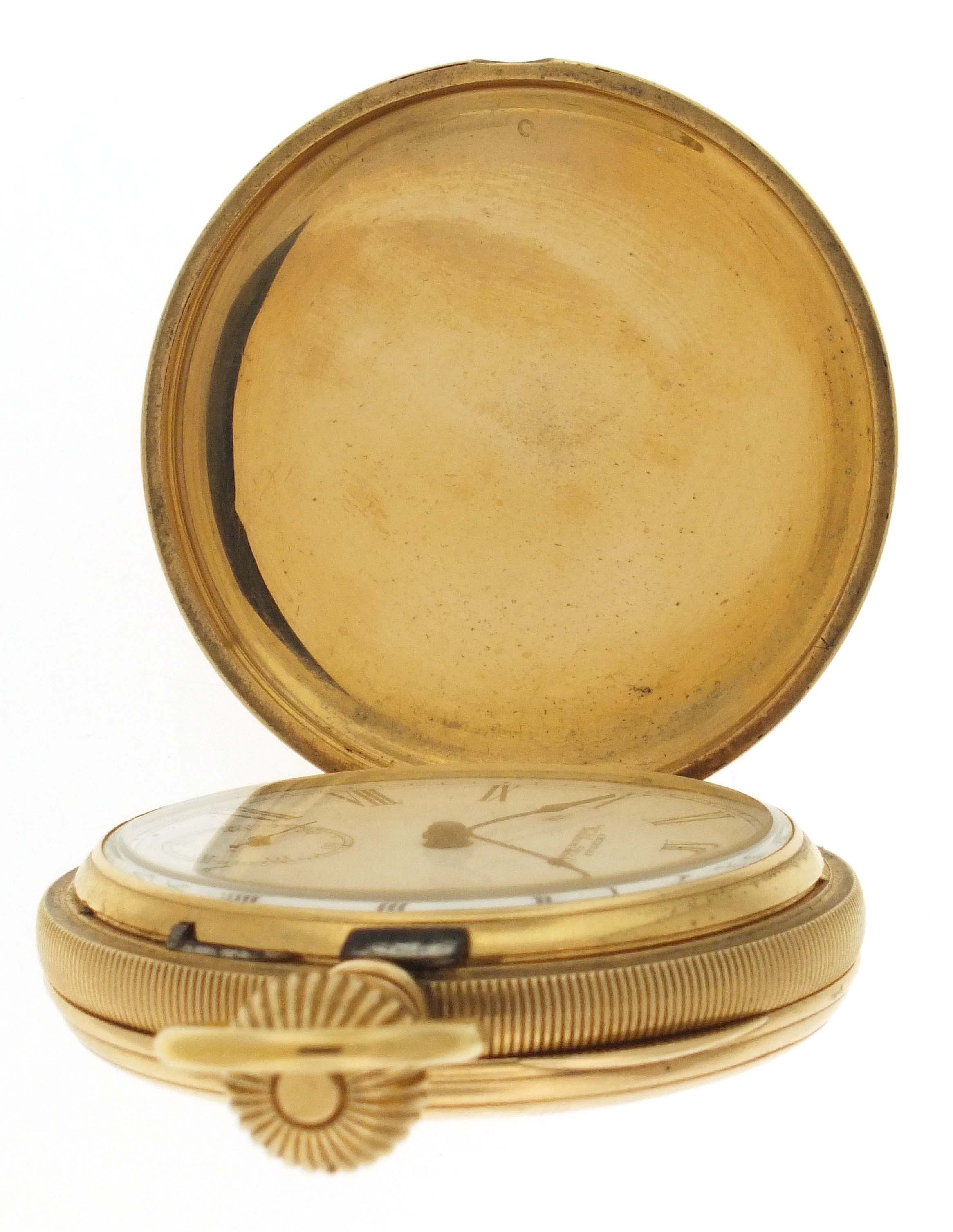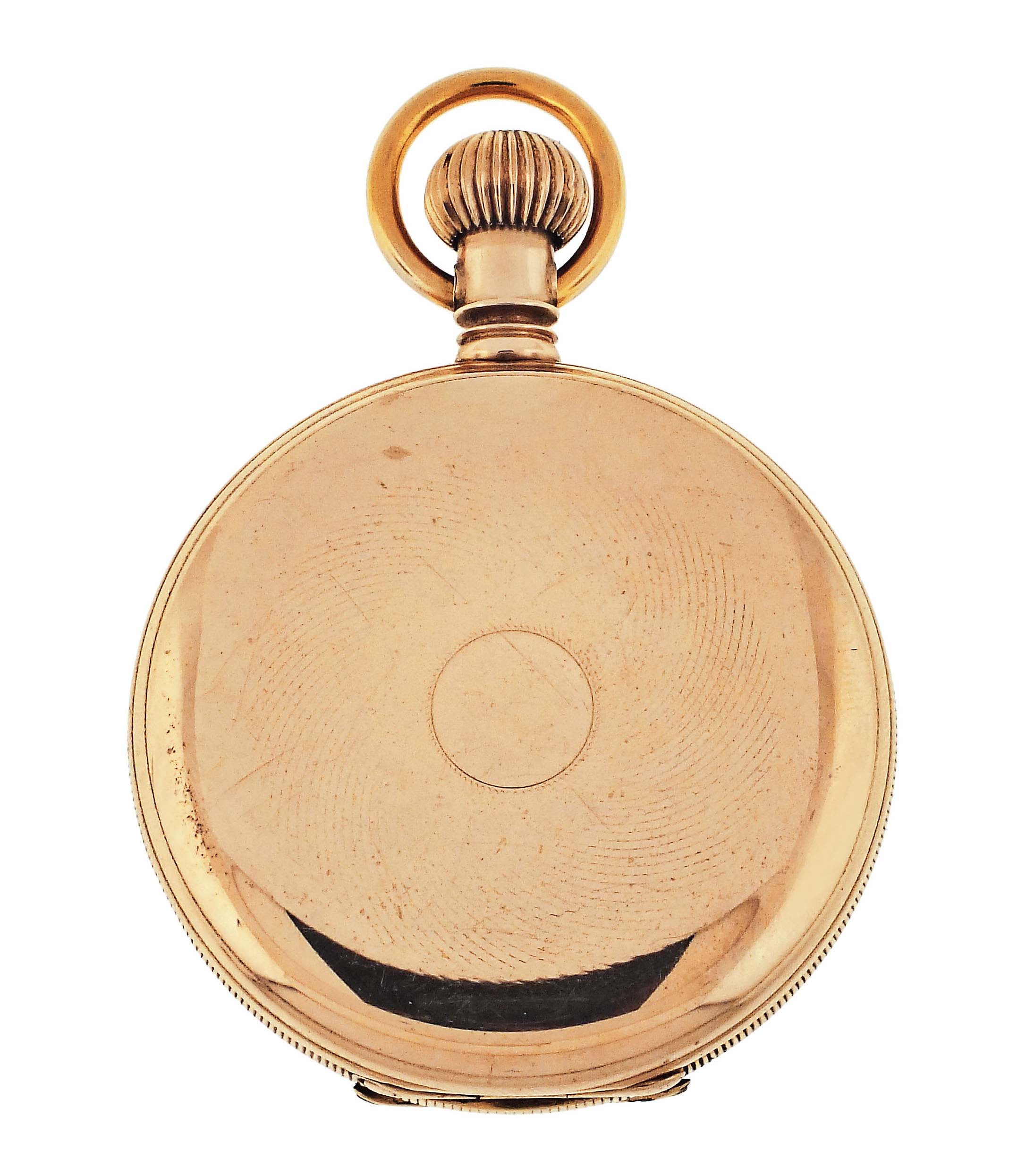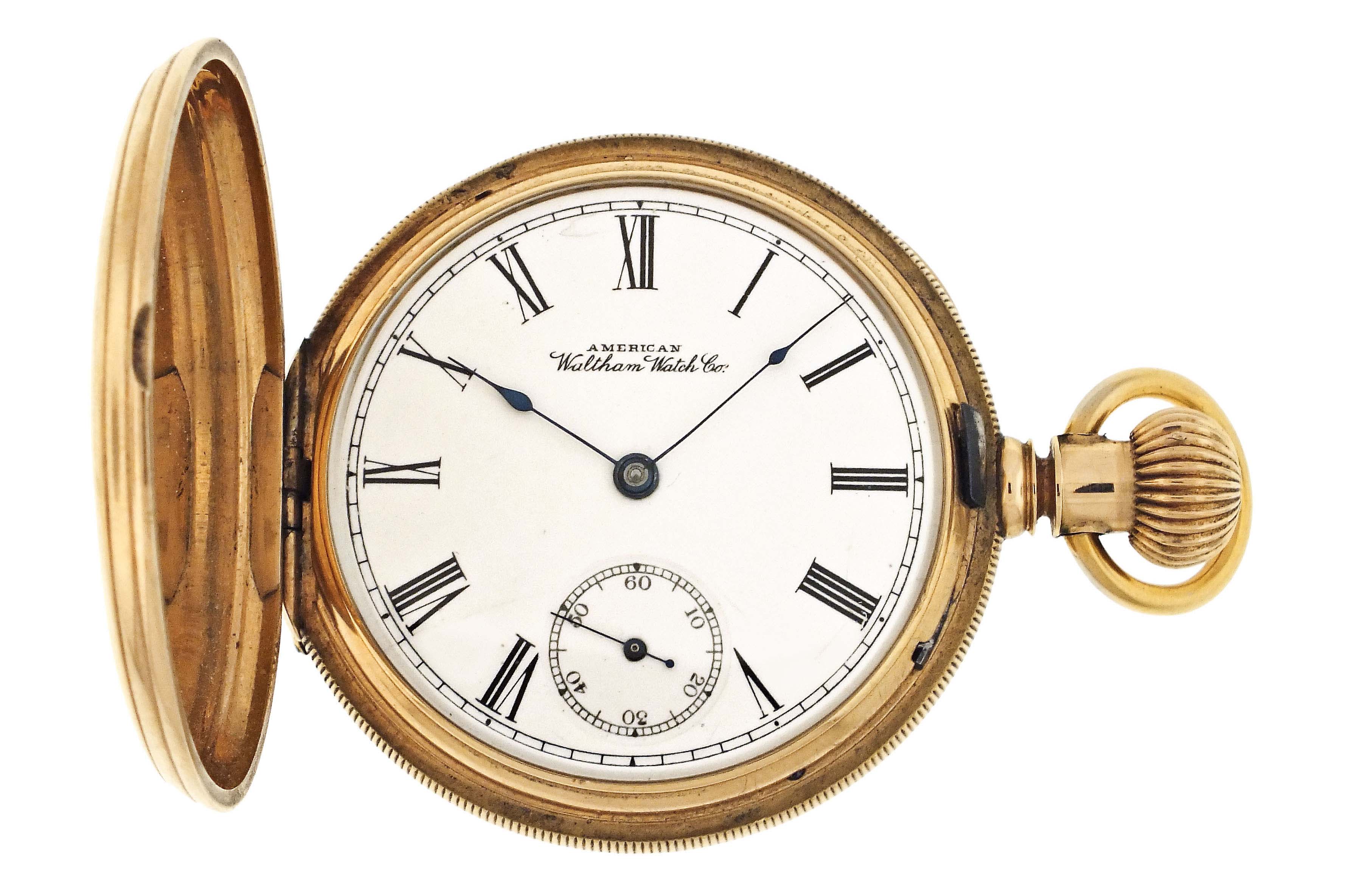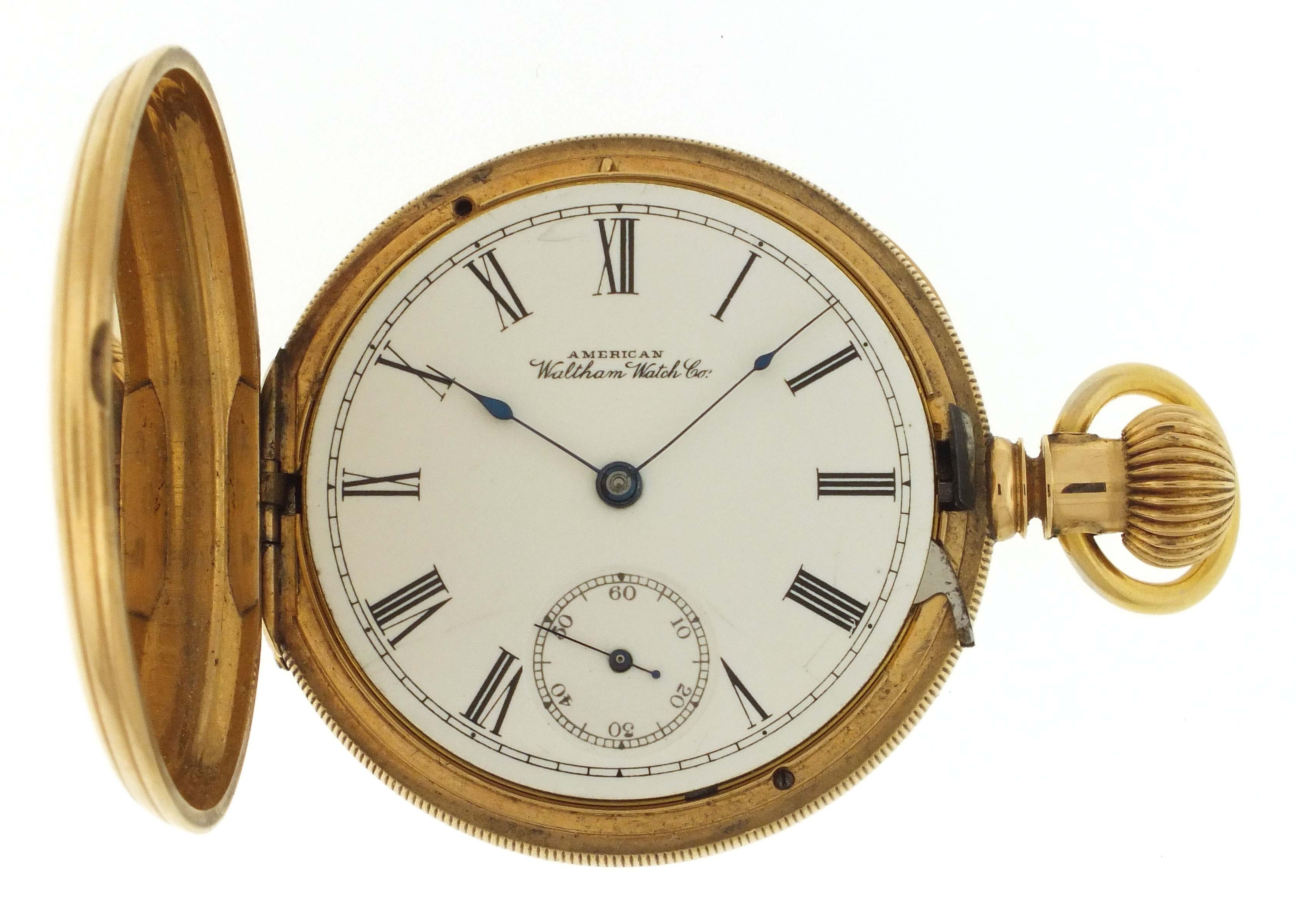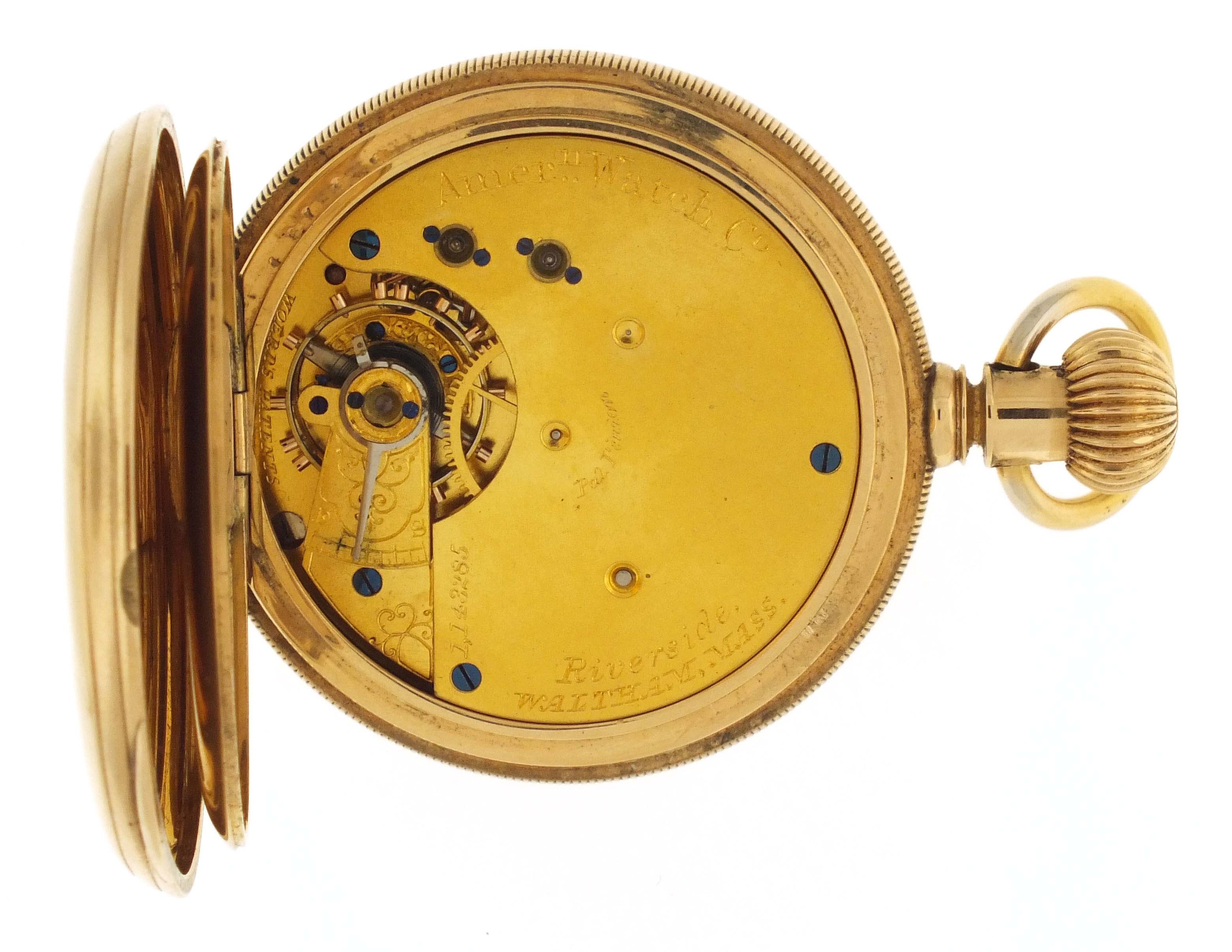 American Waltham Watch Co., Waltham, Mass., a late 19th century model 1874 "Riverside" pocket watch, 14 size, 13 jewels, stem wind and lever set gilt plate movement with lever escapement and cut bimetallic balance in a 14 karat, yellow gold, reeded edge, engine turned hunting case, roman numeral, single sunk white enamel dial with blued steel spade hands, serial #1143285,115.4g TW