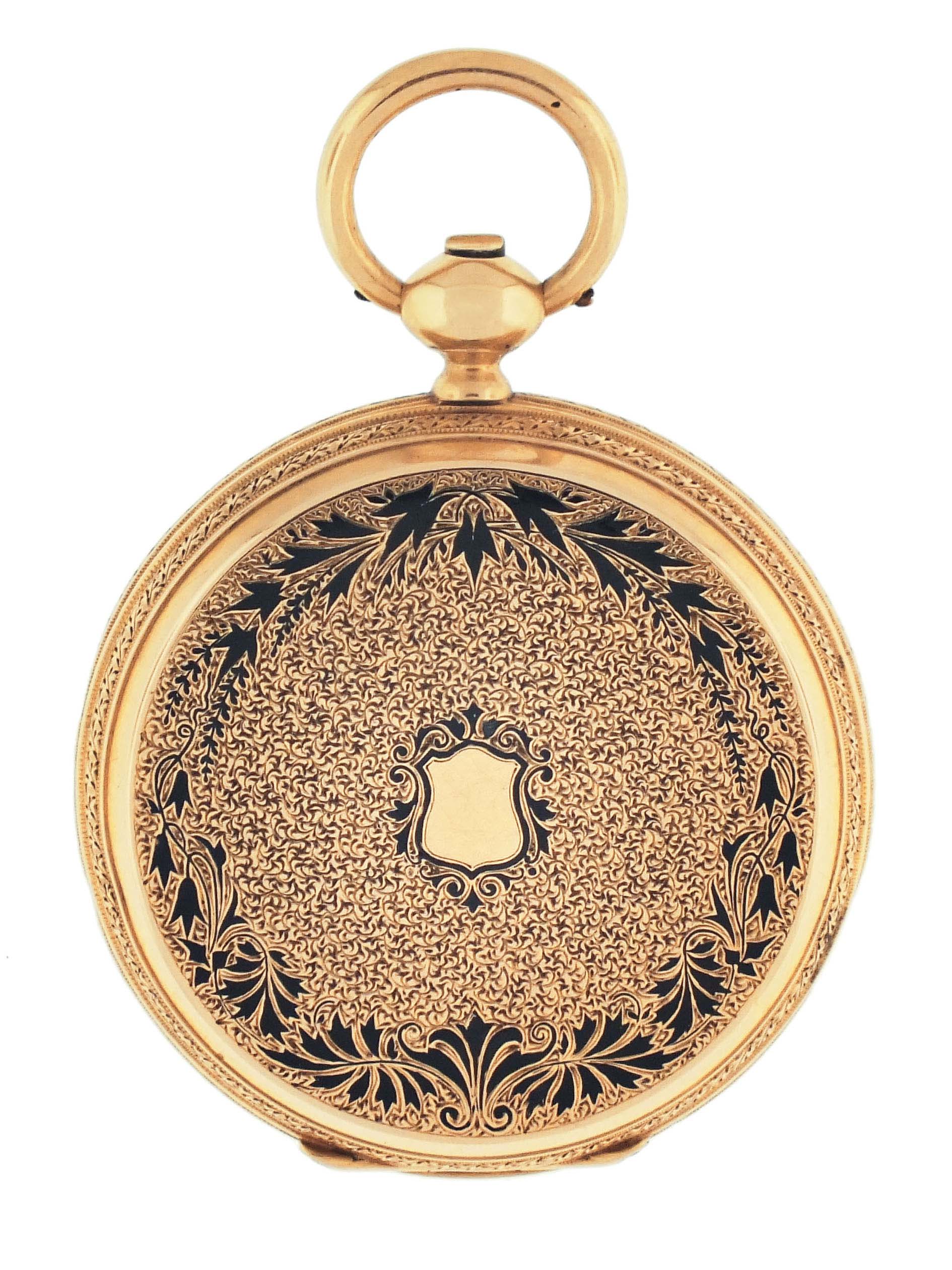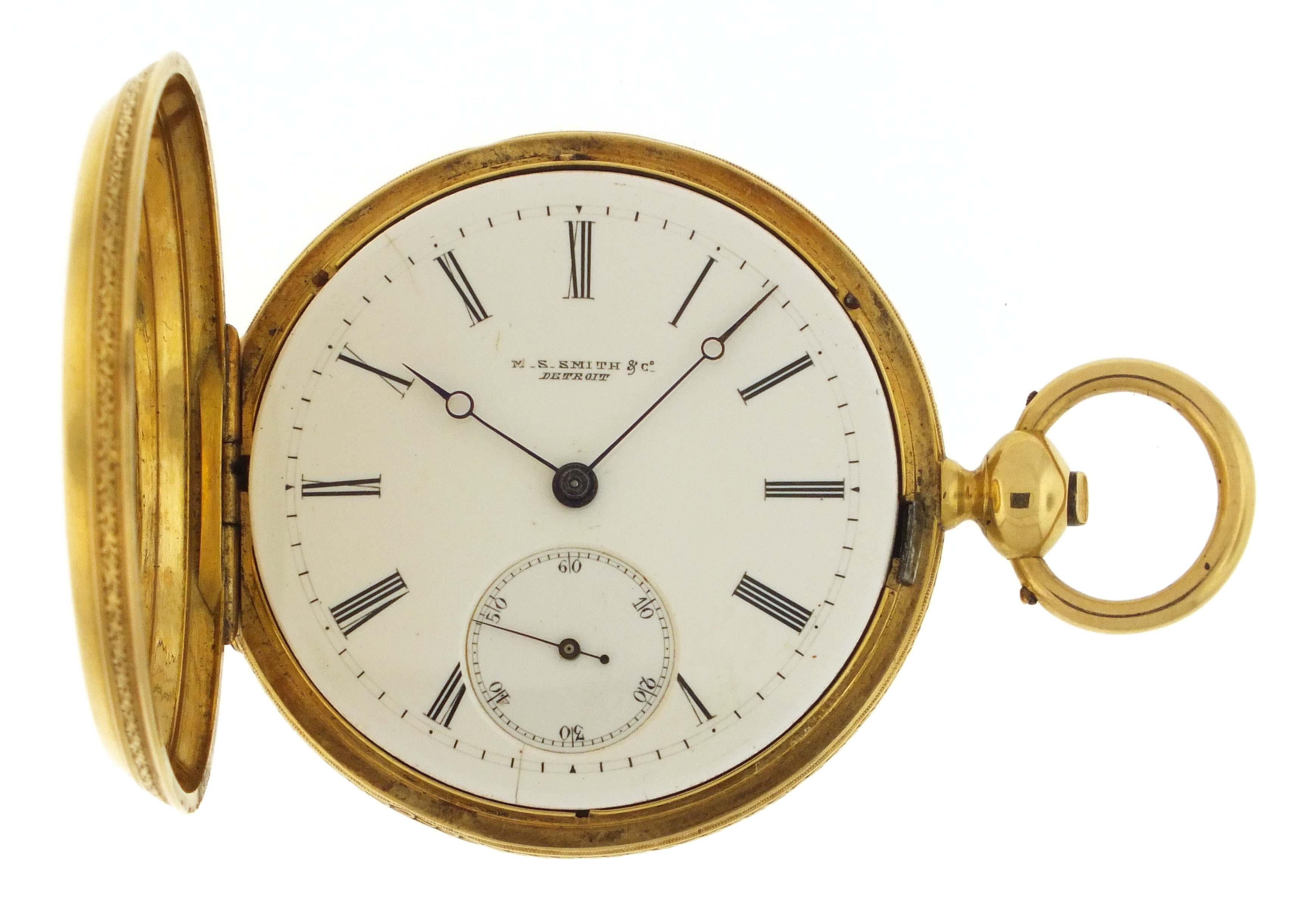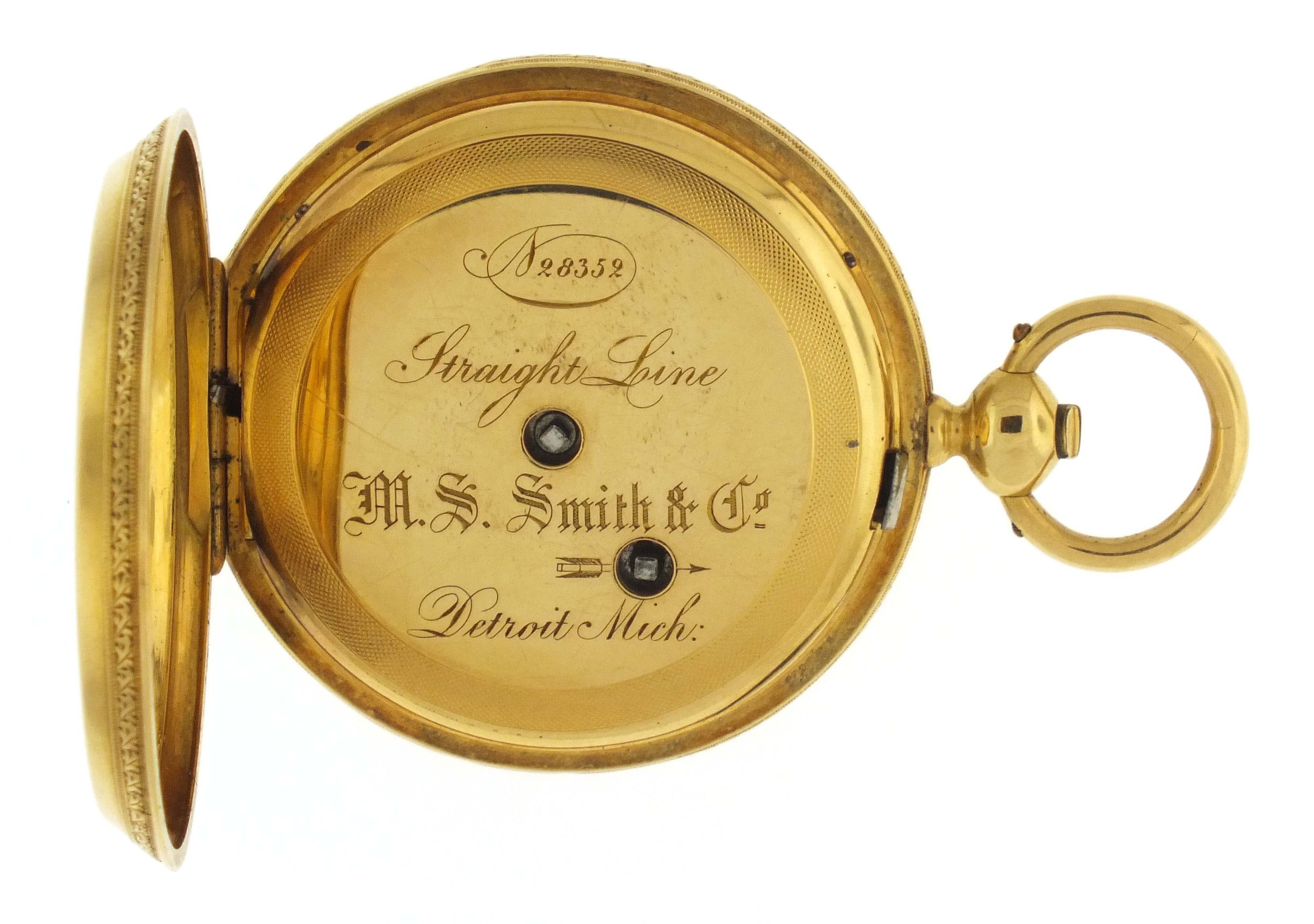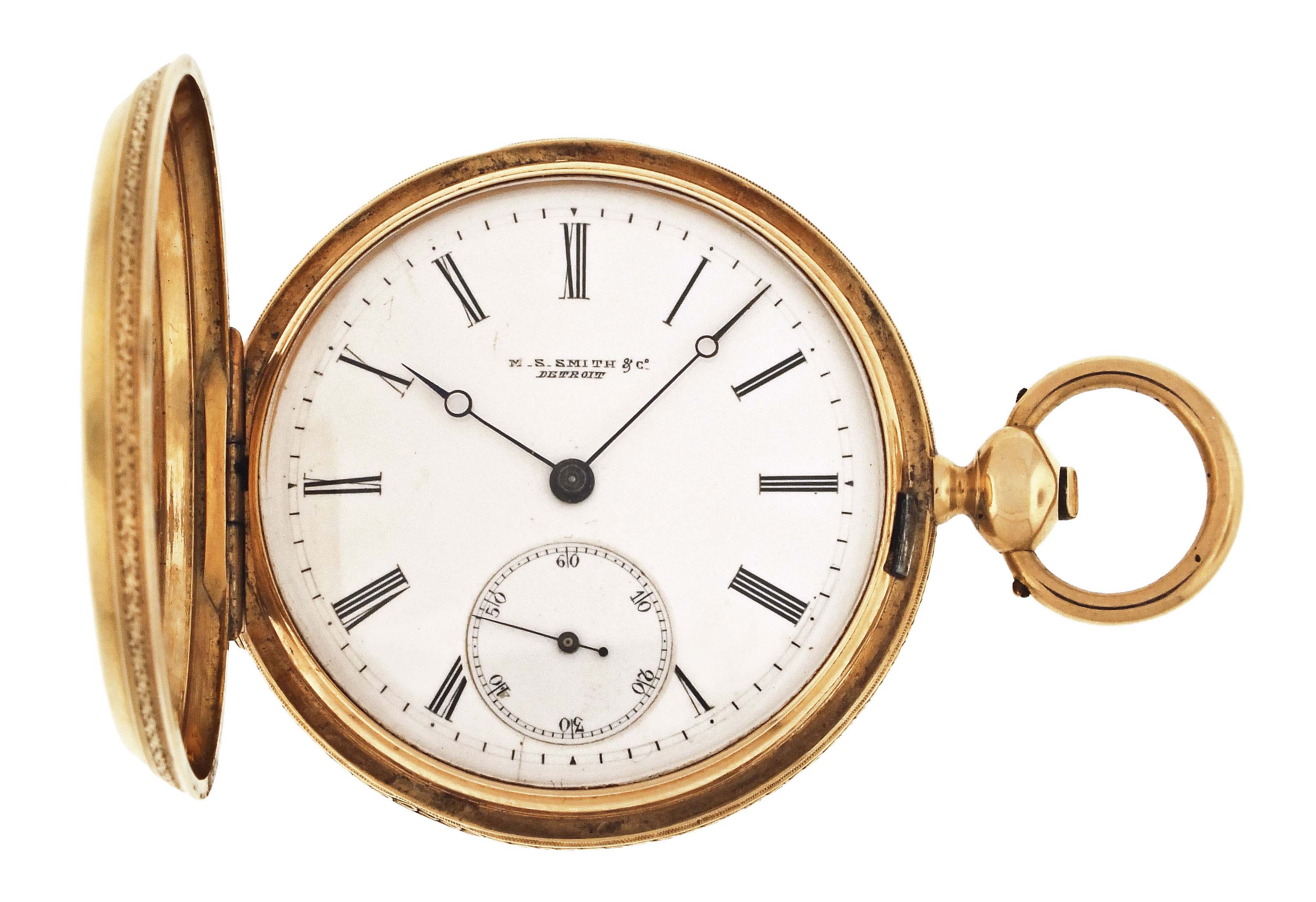 Switzerland, for M.S. Smith & Co., Detroit, a lady's 18 karat gold pocket watch, 15 jewels, key wind and set, cotes de Geneve decorated nickel bar movement with lever escapement and cut bimetallic balance in an 18 karat yellow gold, engraved hunting case with stylized foliate ornament filled with black enamel, pendant with split pusher, retailers details engraved on gold cuvette, and engraved presentation on inside of front cover, roman numeral single sunk white enamel dial with plum colored steel Breguet style hands, serial #28352, 41mm, 56.9g TW