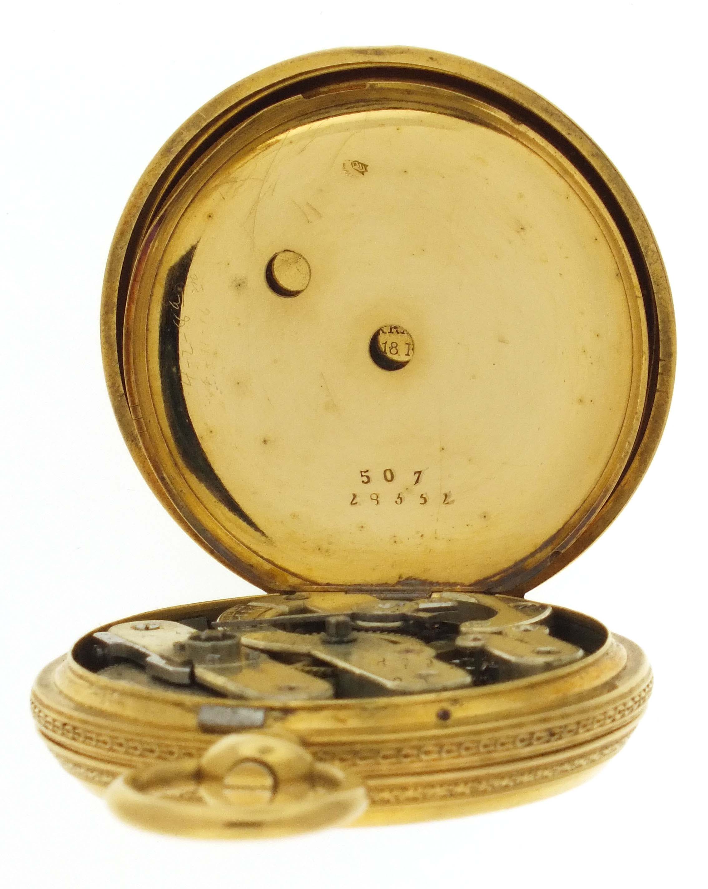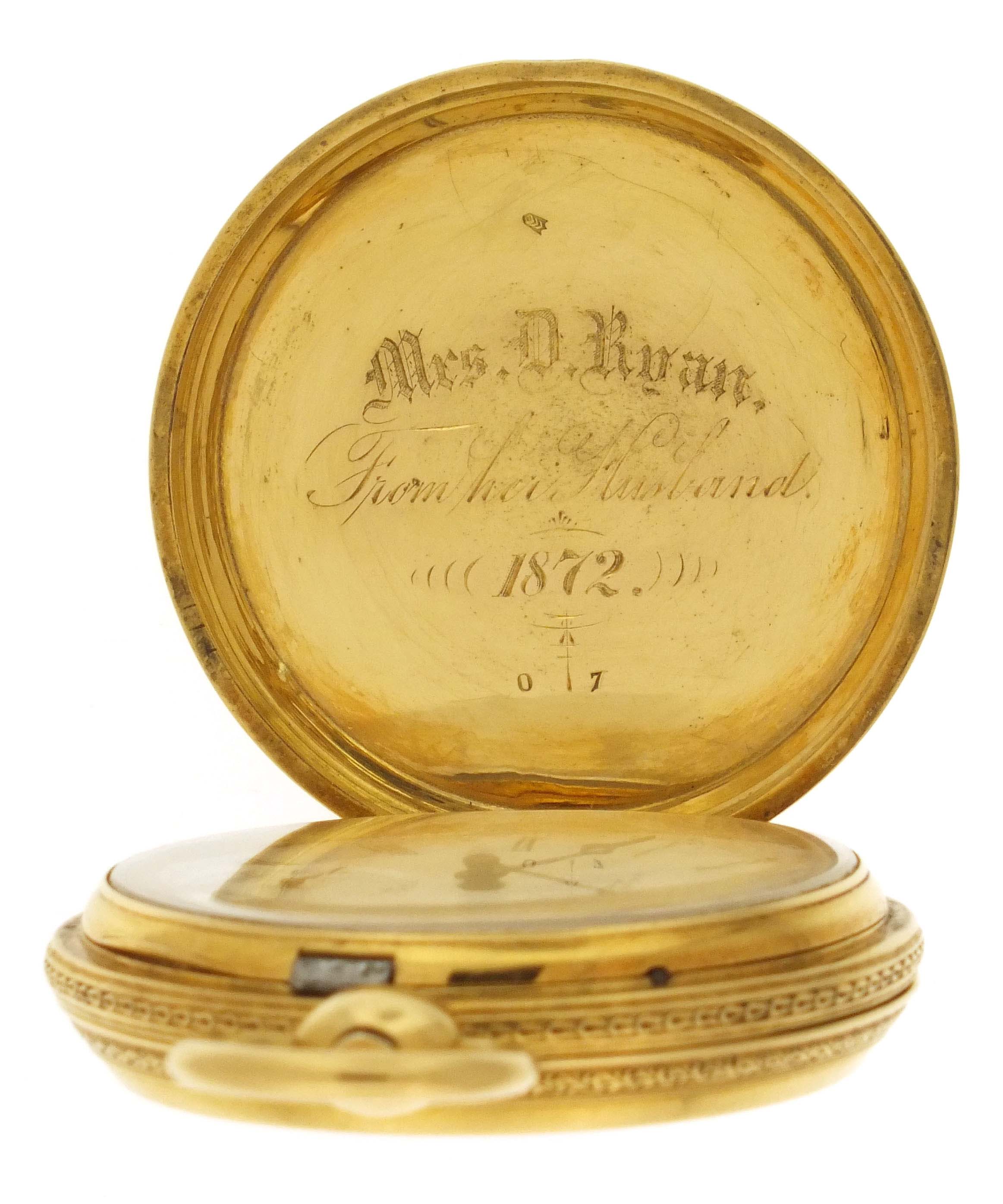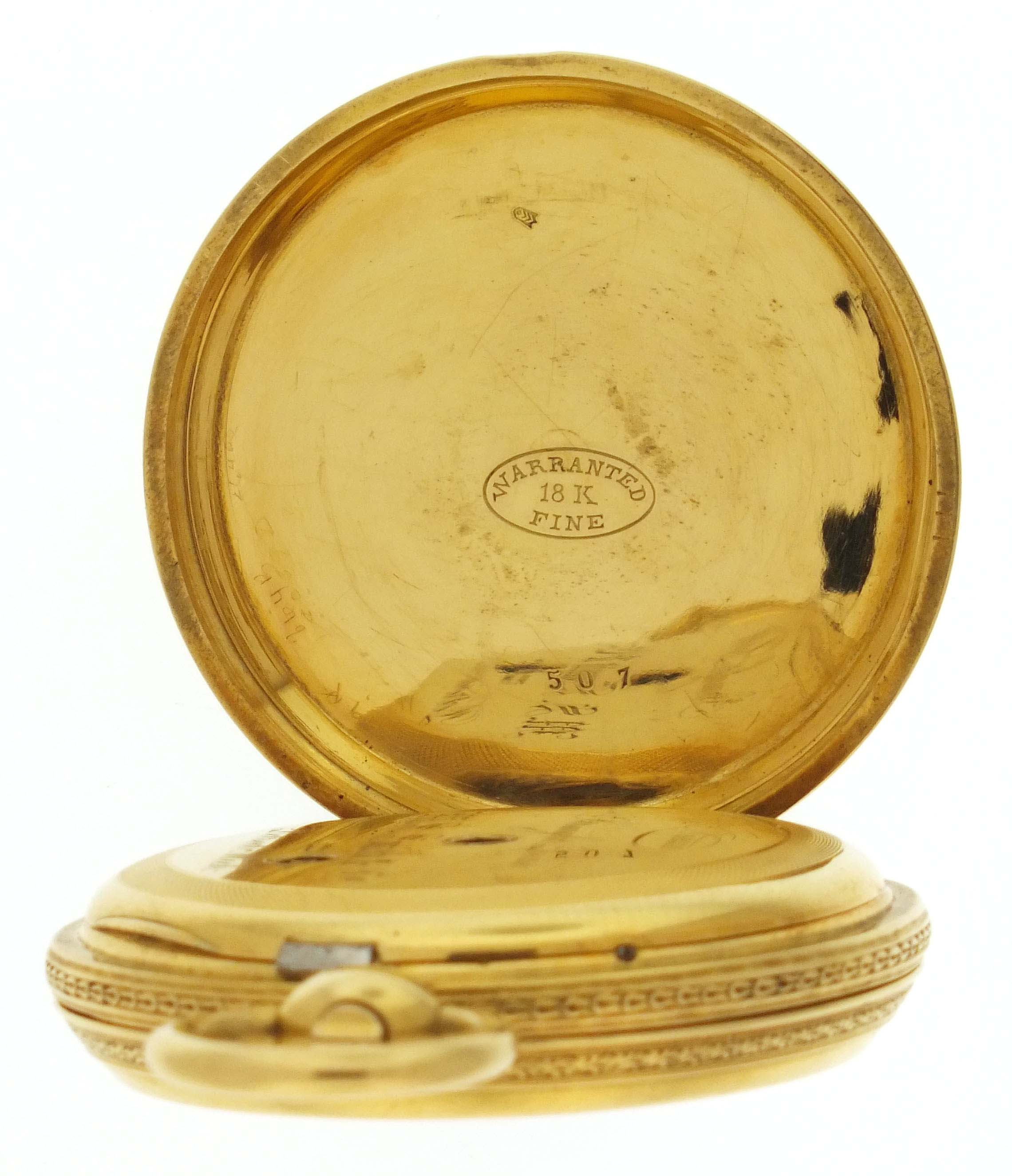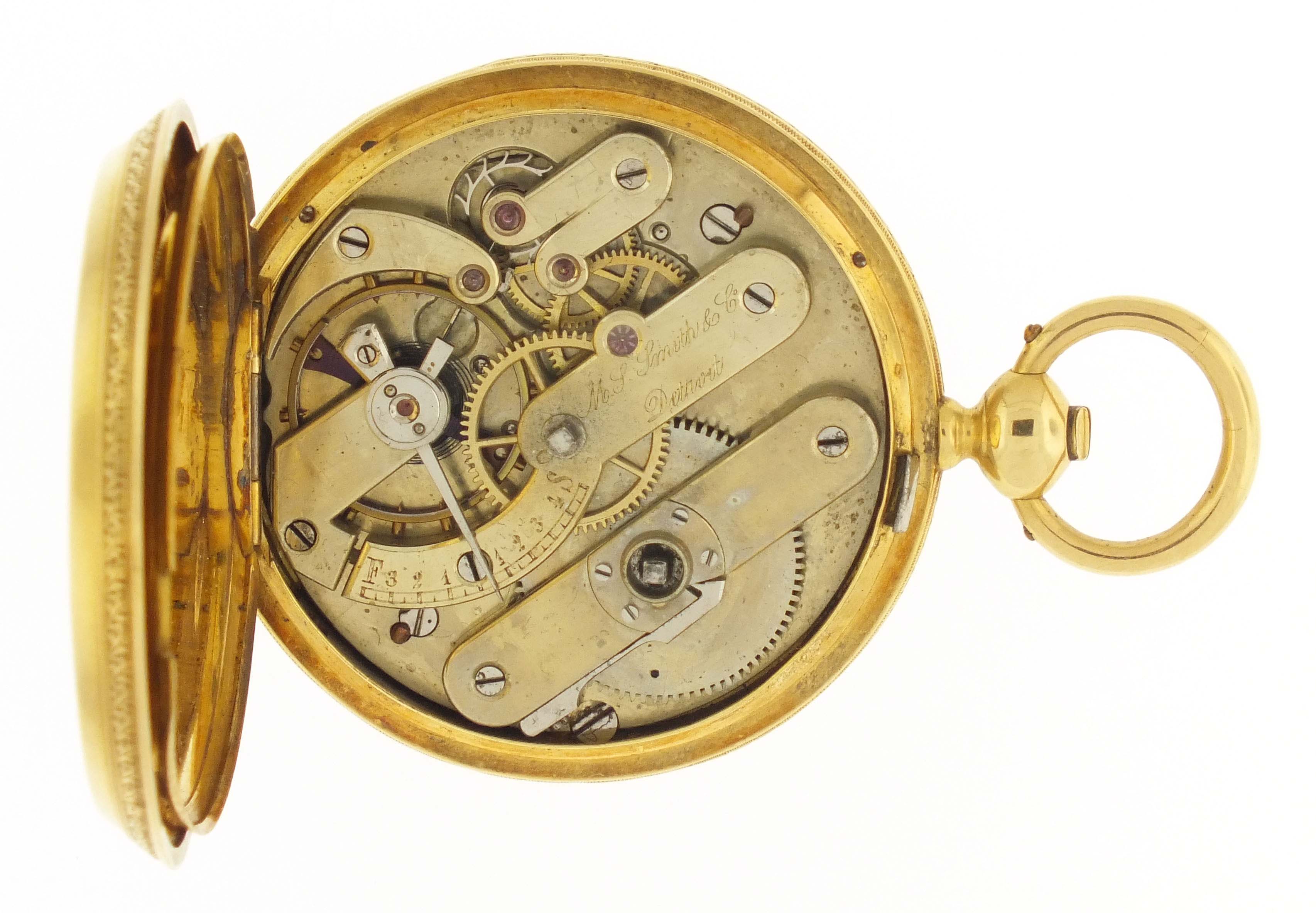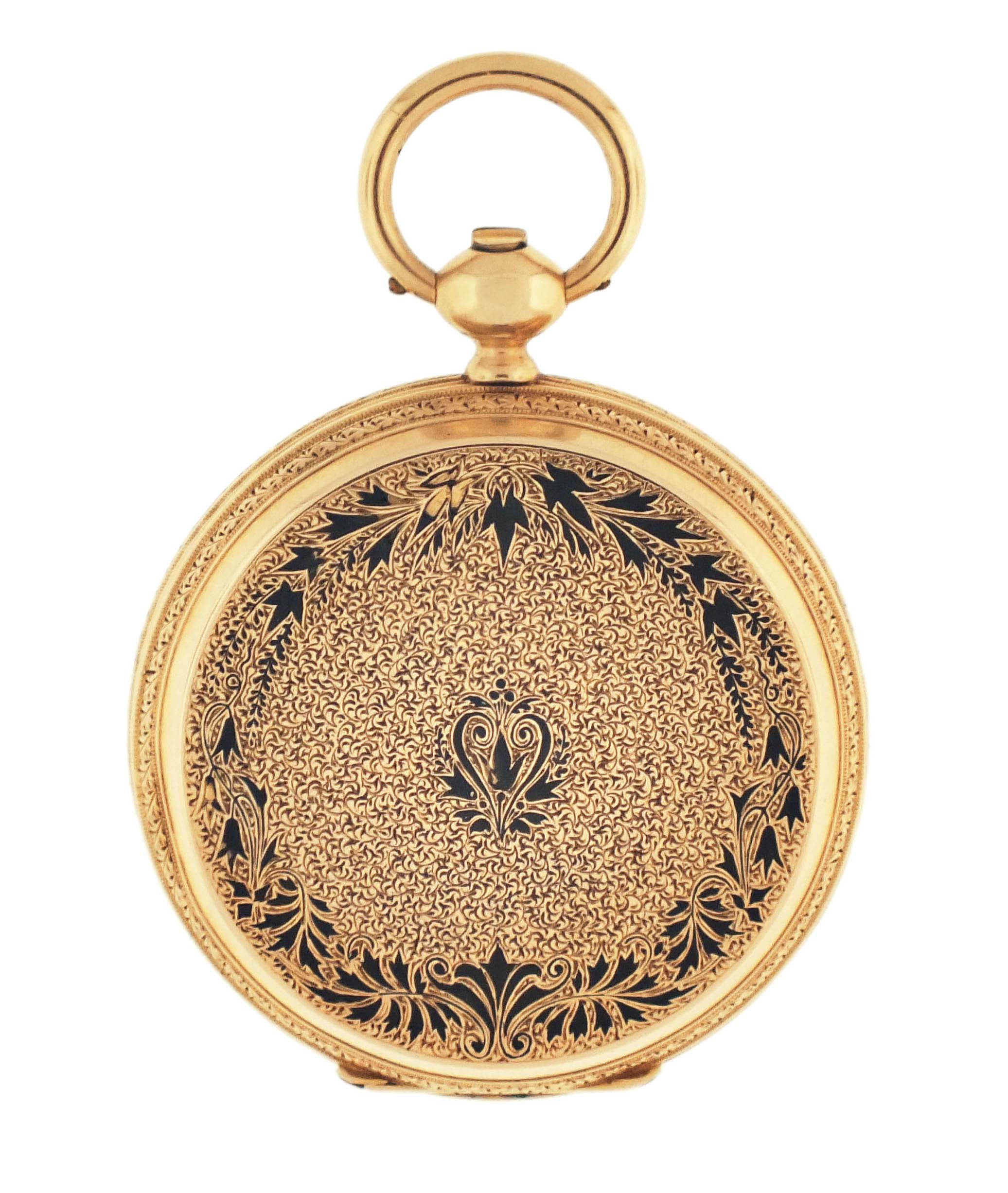 Switzerland, for M.S. Smith & Co., Detroit, a lady's 18 karat gold pocket watch, 15 jewels, key wind and set, cotes de Geneve decorated nickel bar movement with lever escapement and cut bimetallic balance in an 18 karat yellow gold, engraved hunting case with stylized foliate ornament filled with black enamel, pendant with split pusher, retailers details engraved on gold cuvette, and engraved presentation on inside of front cover, roman numeral single sunk white enamel dial with plum colored steel Breguet style hands, serial #28352, 41mm, 56.9g TW