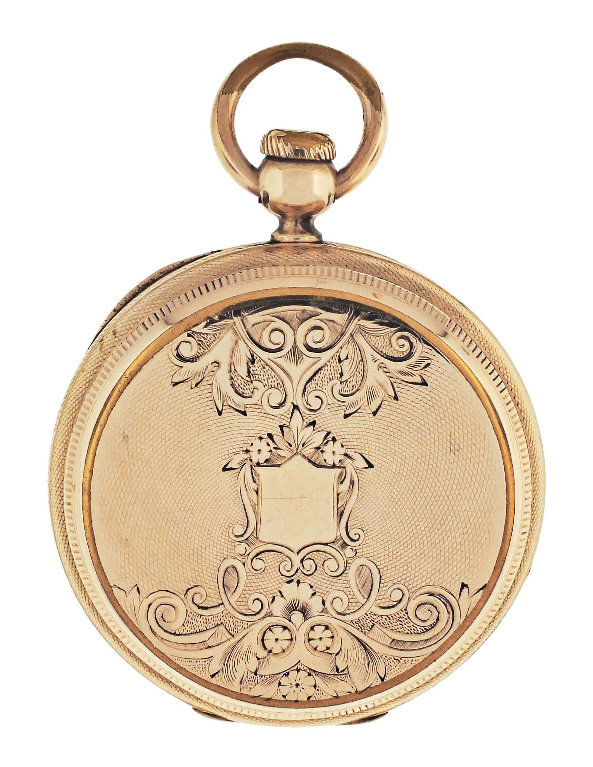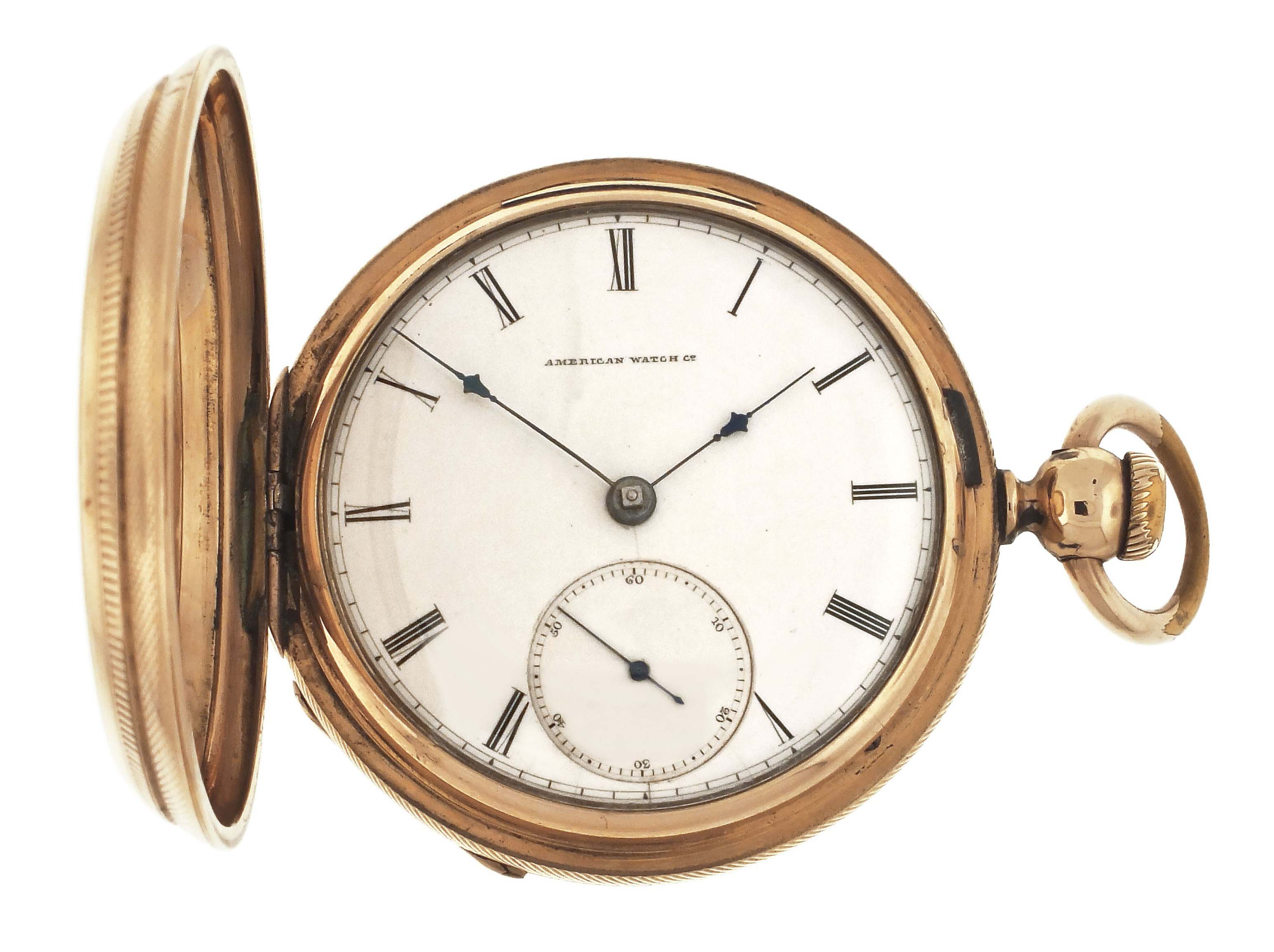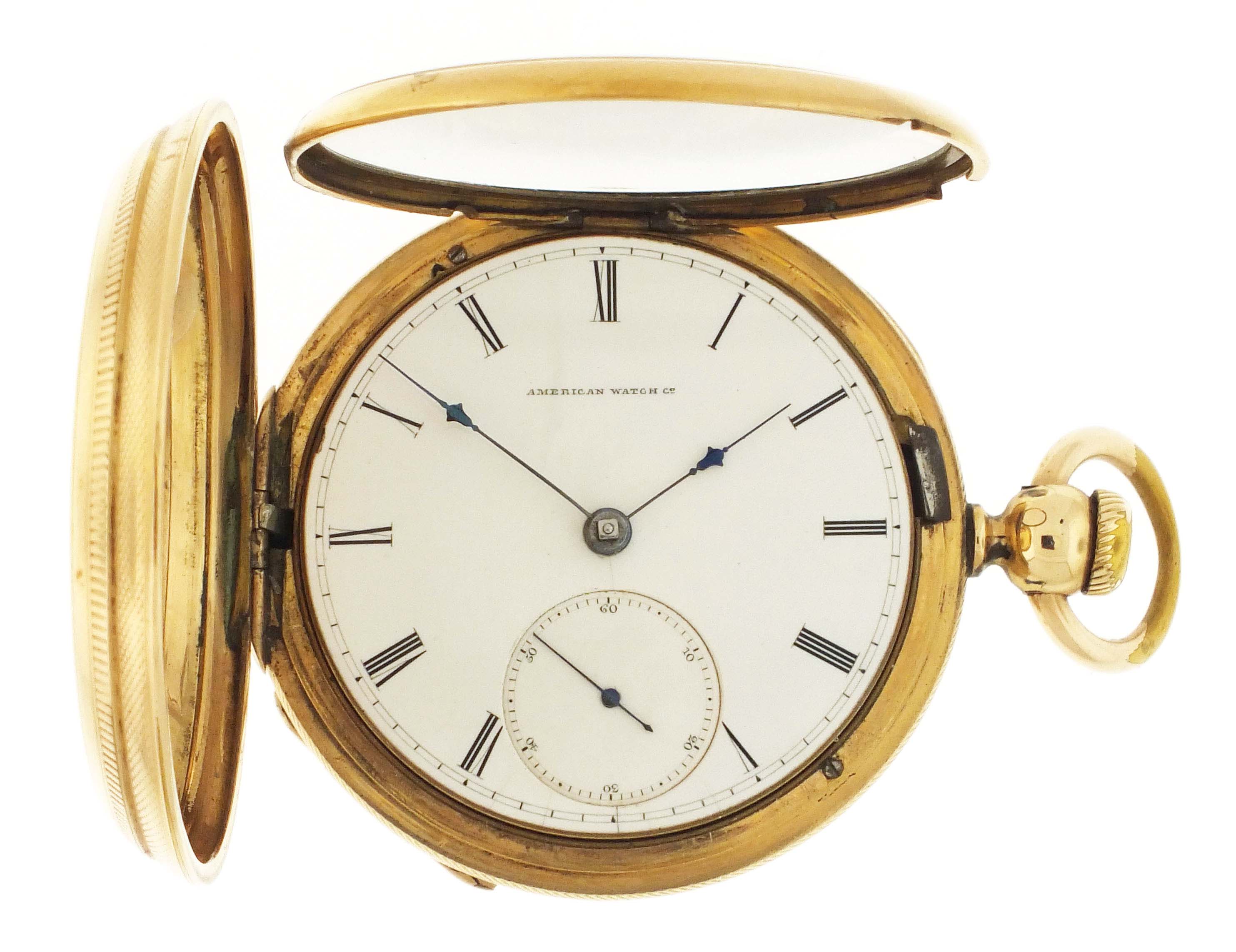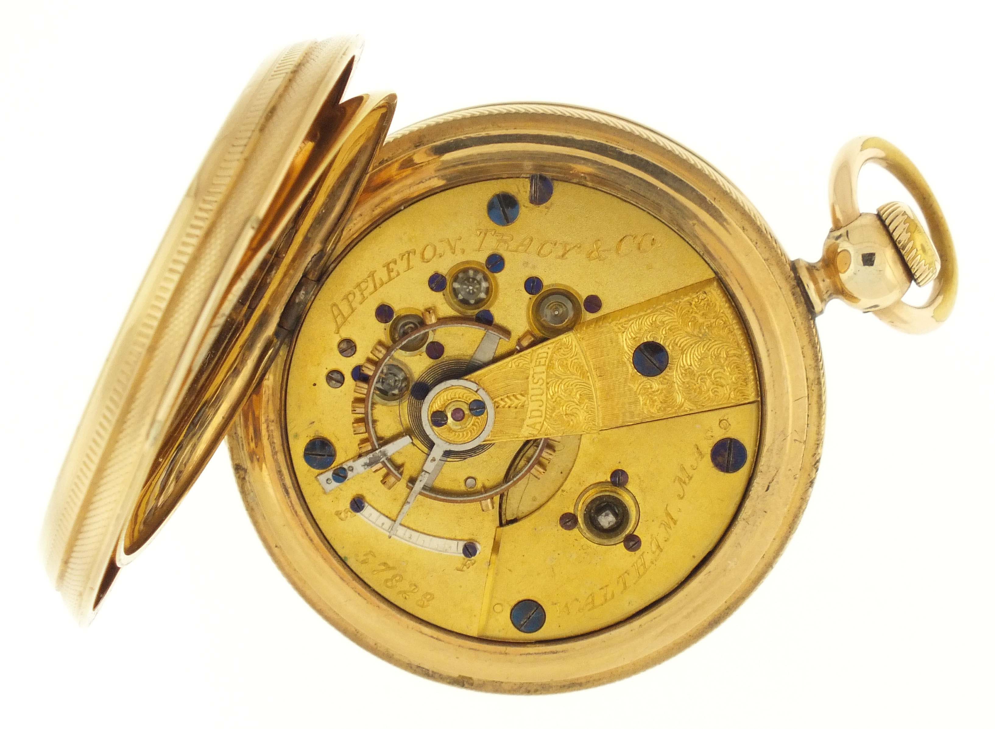 American Waltham Watch Co., Waltham, Mass., a Civil War era "Appleton, Tracy & Co." pocket watch, 18 size, 15 jewels, key wind and set gilt plate movement with lever escapement and cut, bimetallic balance in a gold filled, engine turned and engraved hunting case, roman numeral, single sunk white enamel dial signed "American Watch Co.", with blued steel hands, serial #57828