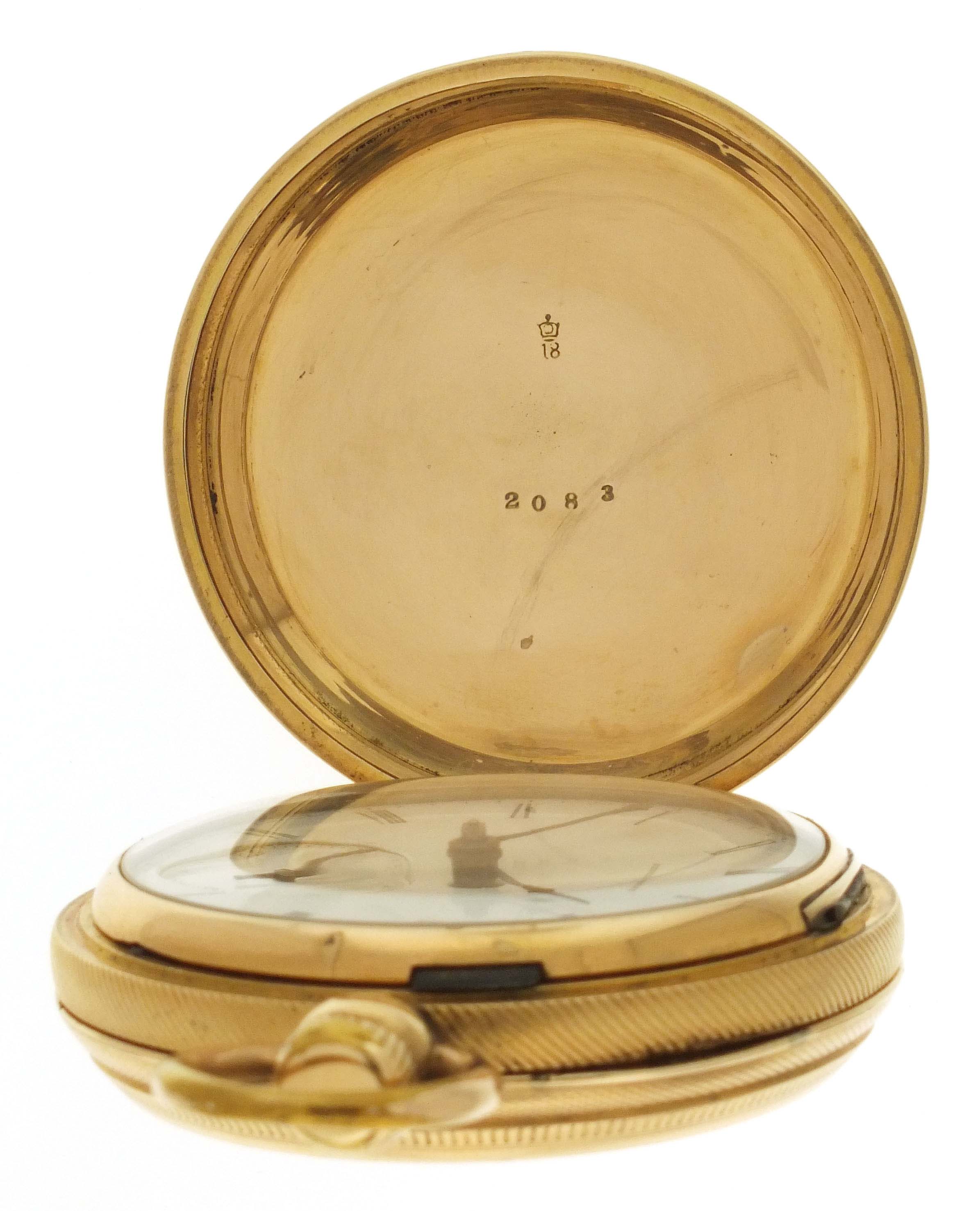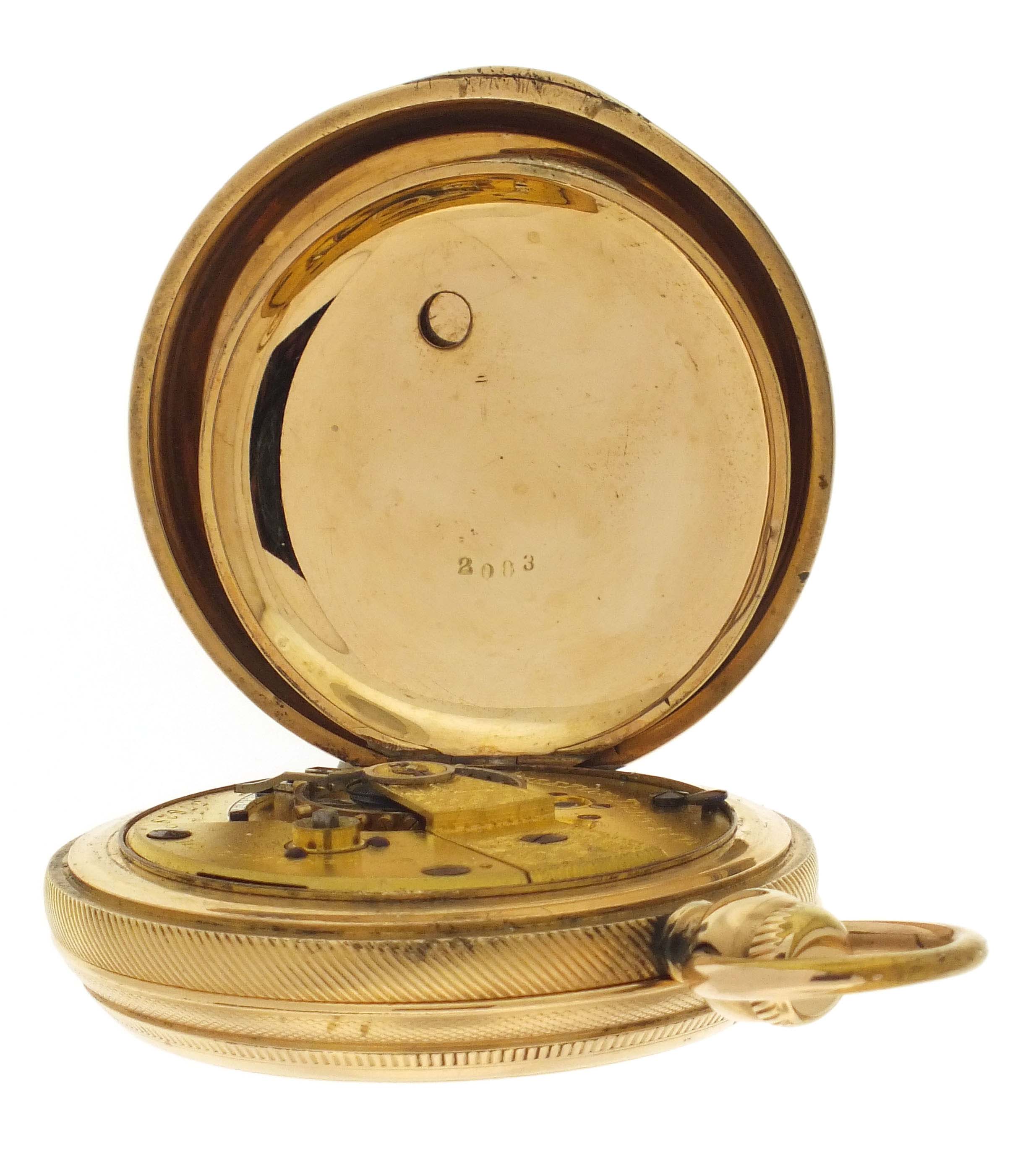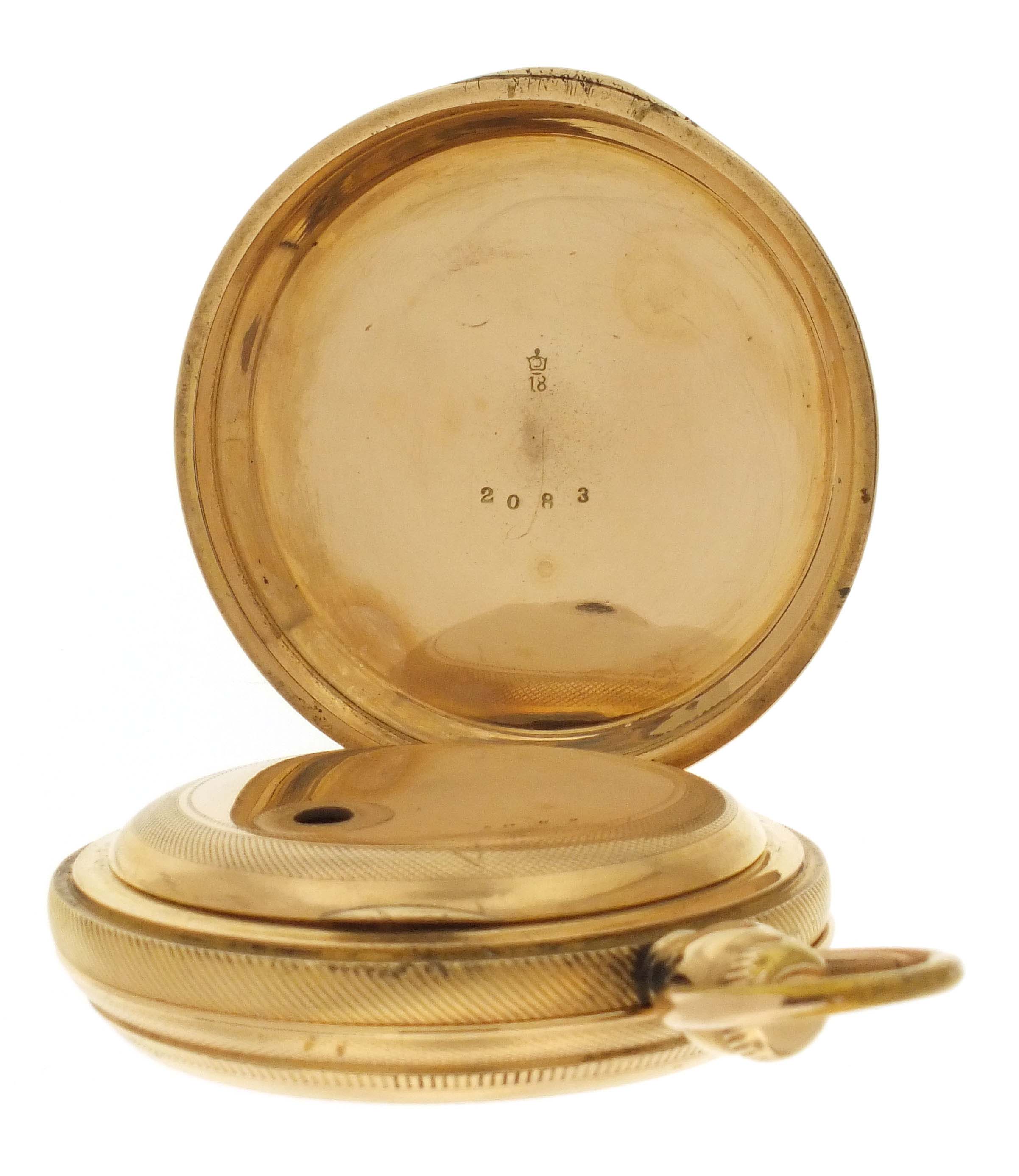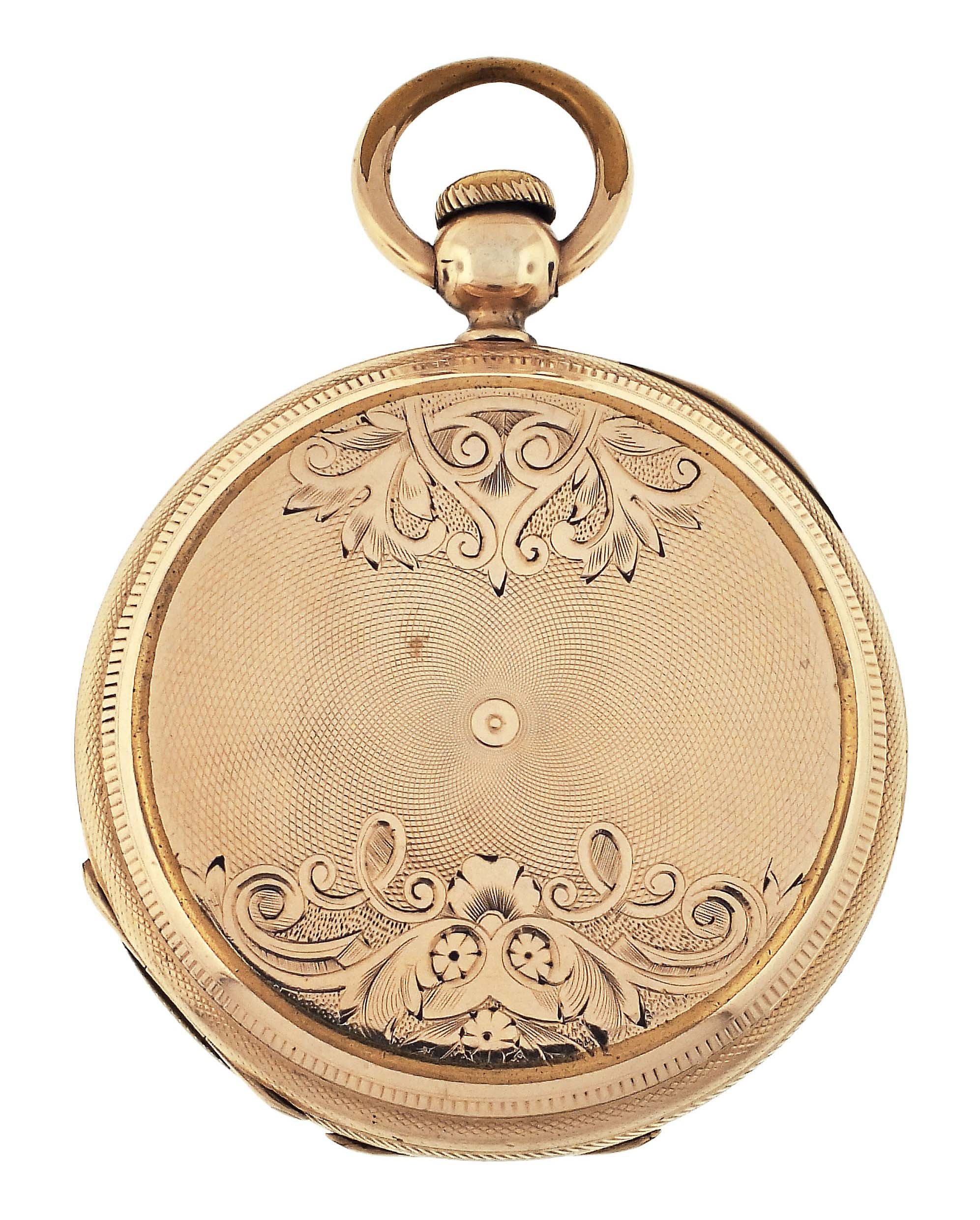 American Waltham Watch Co., Waltham, Mass., a Civil War era "Appleton, Tracy & Co." pocket watch, 18 size, 15 jewels, key wind and set gilt plate movement with lever escapement and cut, bimetallic balance in a gold filled, engine turned and engraved hunting case, roman numeral, single sunk white enamel dial signed "American Watch Co.", with blued steel hands, serial #57828
