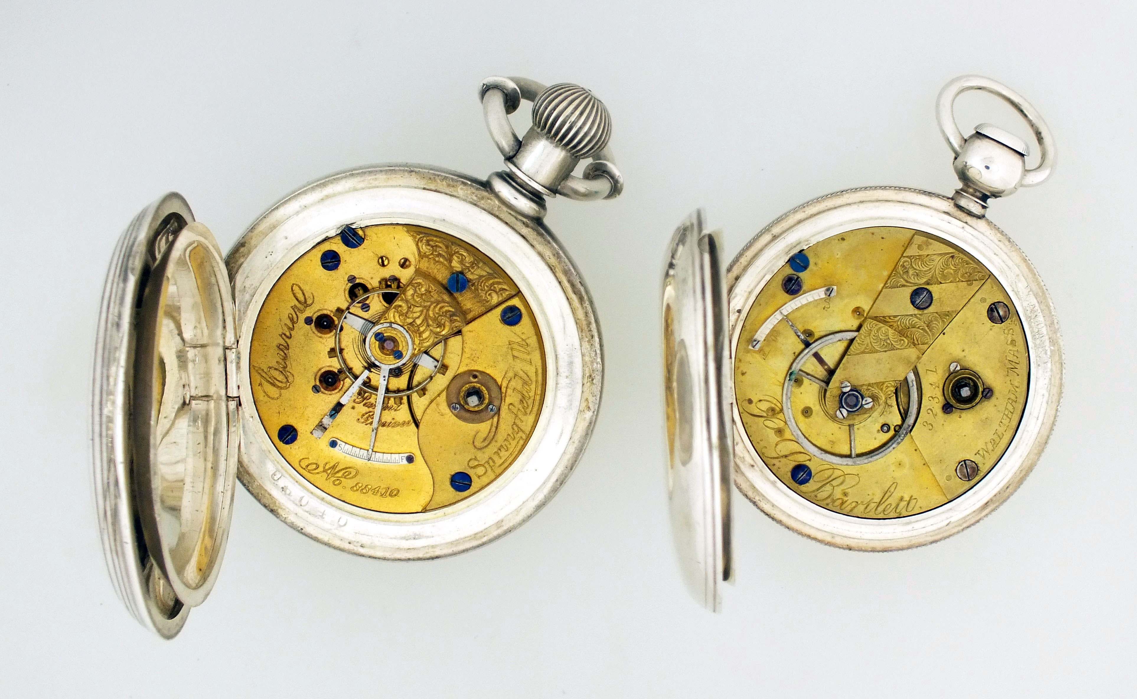 2 (Two) American pocket watches, 18 size, roman numeral enamel dial, key wind gilt movements in coin silver hunting cases including a Waltham model 1857, "P.S. Bartlett", 7 jewel, serial #32341, and an Illinois, model 1, "Currier", 11 jewel, serial #88410