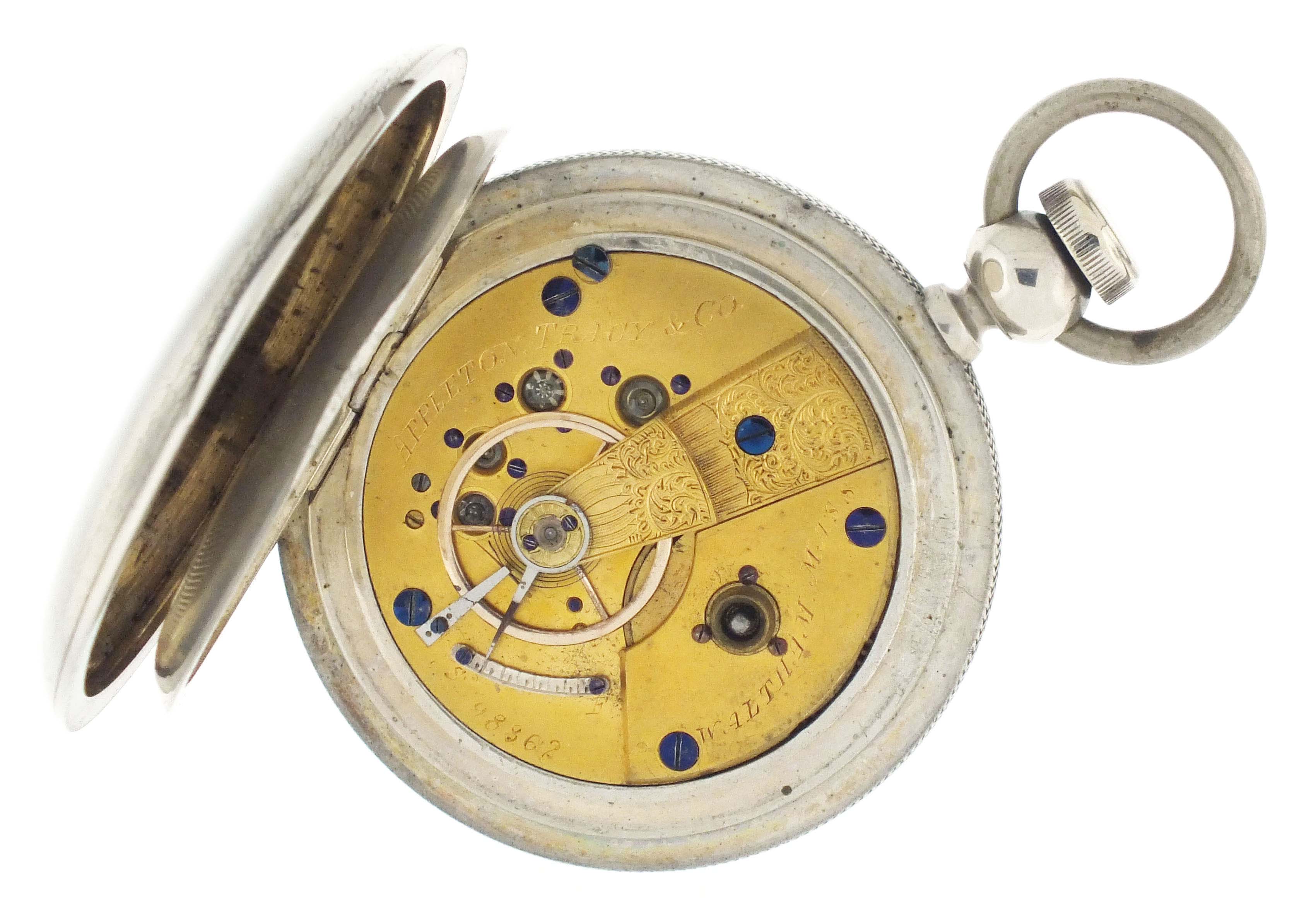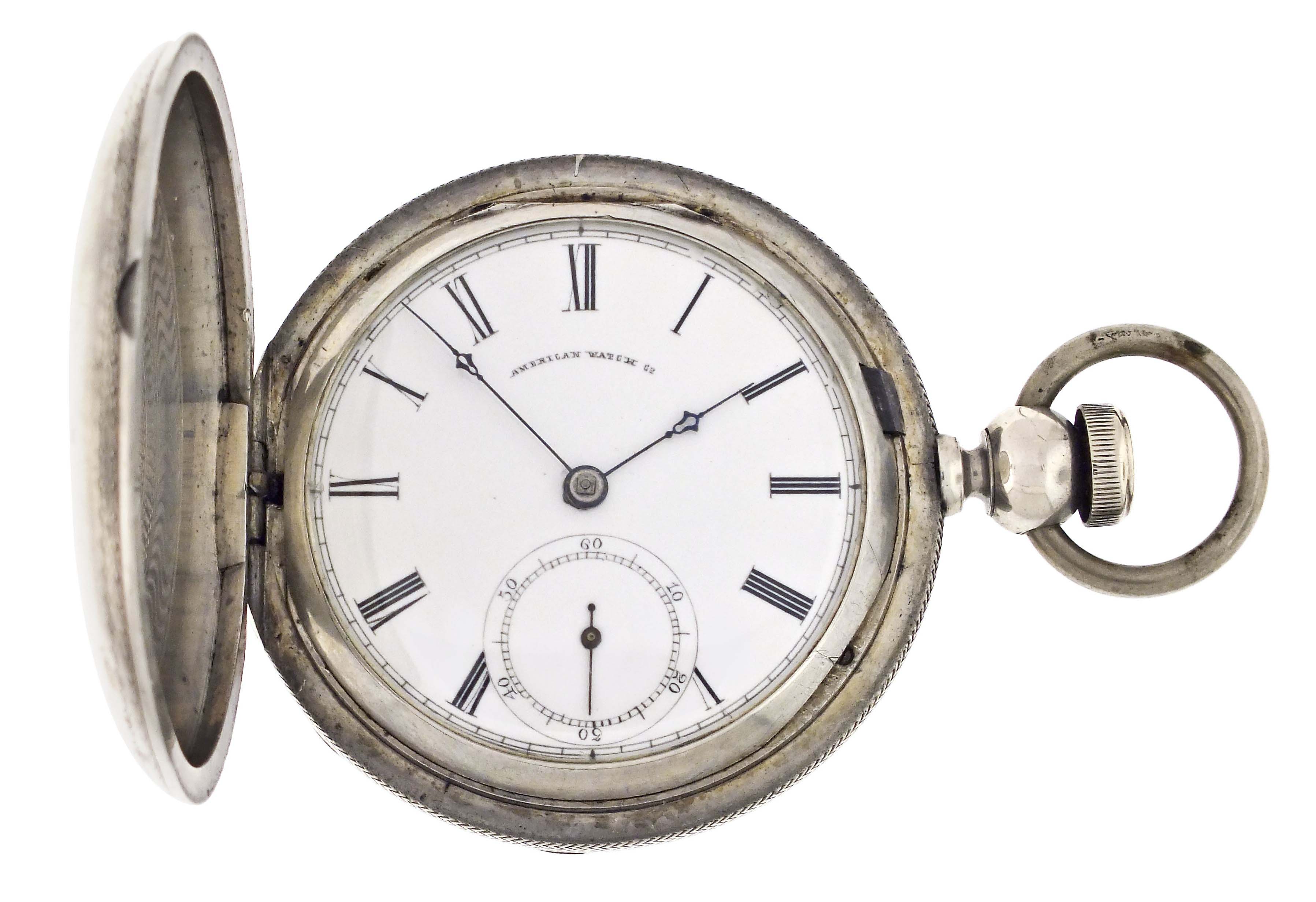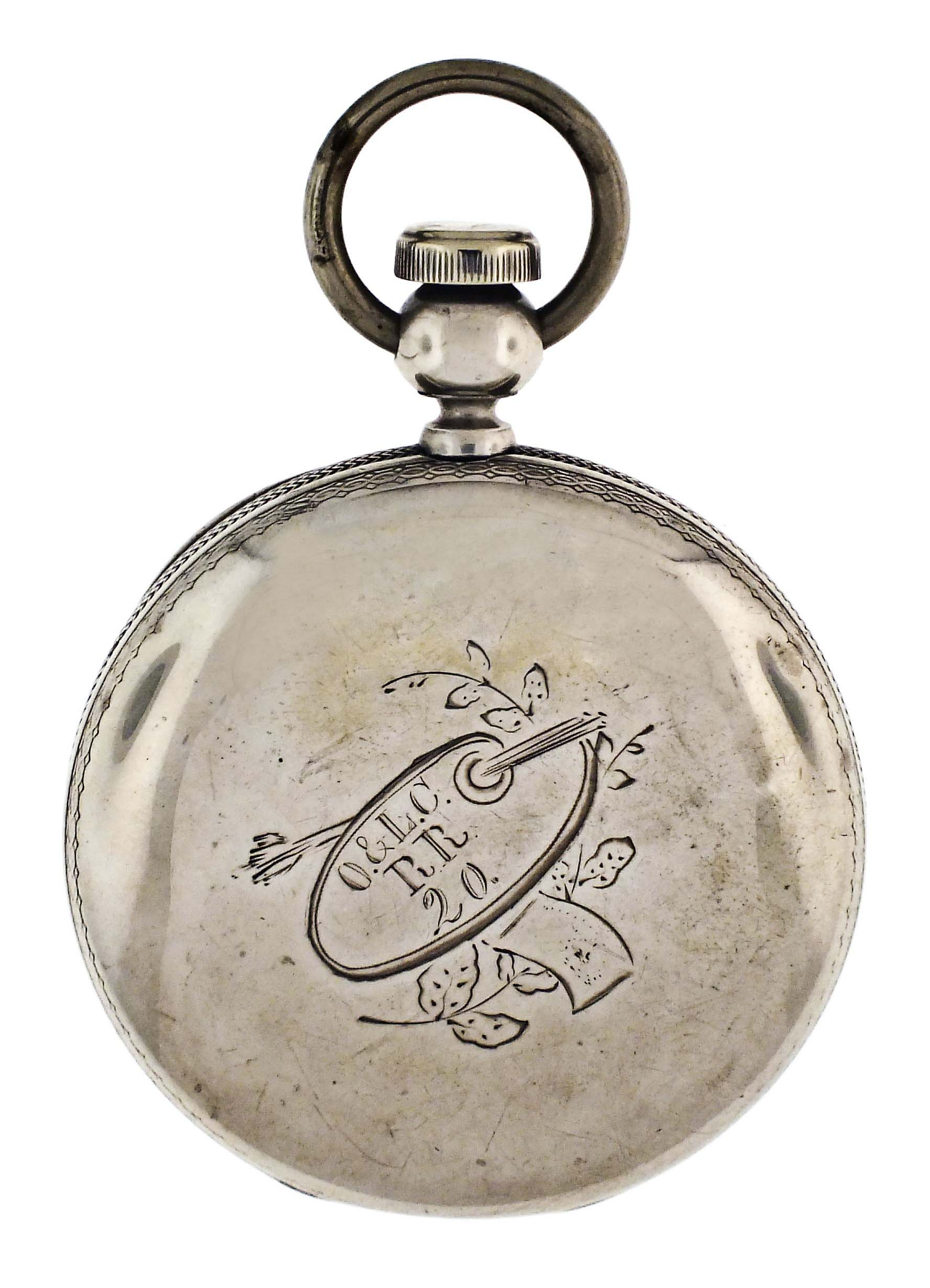 American Waltham Watch Co., Waltham, Mass., an "Appleton, Tracy & Co." pocket watch for the Ogdensburg and Lake Champlain railroad, 18 size, 15 jewels, key wind and set gilt plate movement with lever escapement and polished gold balance in a coin silver hunting case, the interior of the front cover engine turned, and the exterior with engraved artist's pallette with brushes, a branch with foliage, and "O. & L.C. R.R. 20.", roman numeral white enamel dial signed "American Watch Co.", with blued steel hands, serial #98862