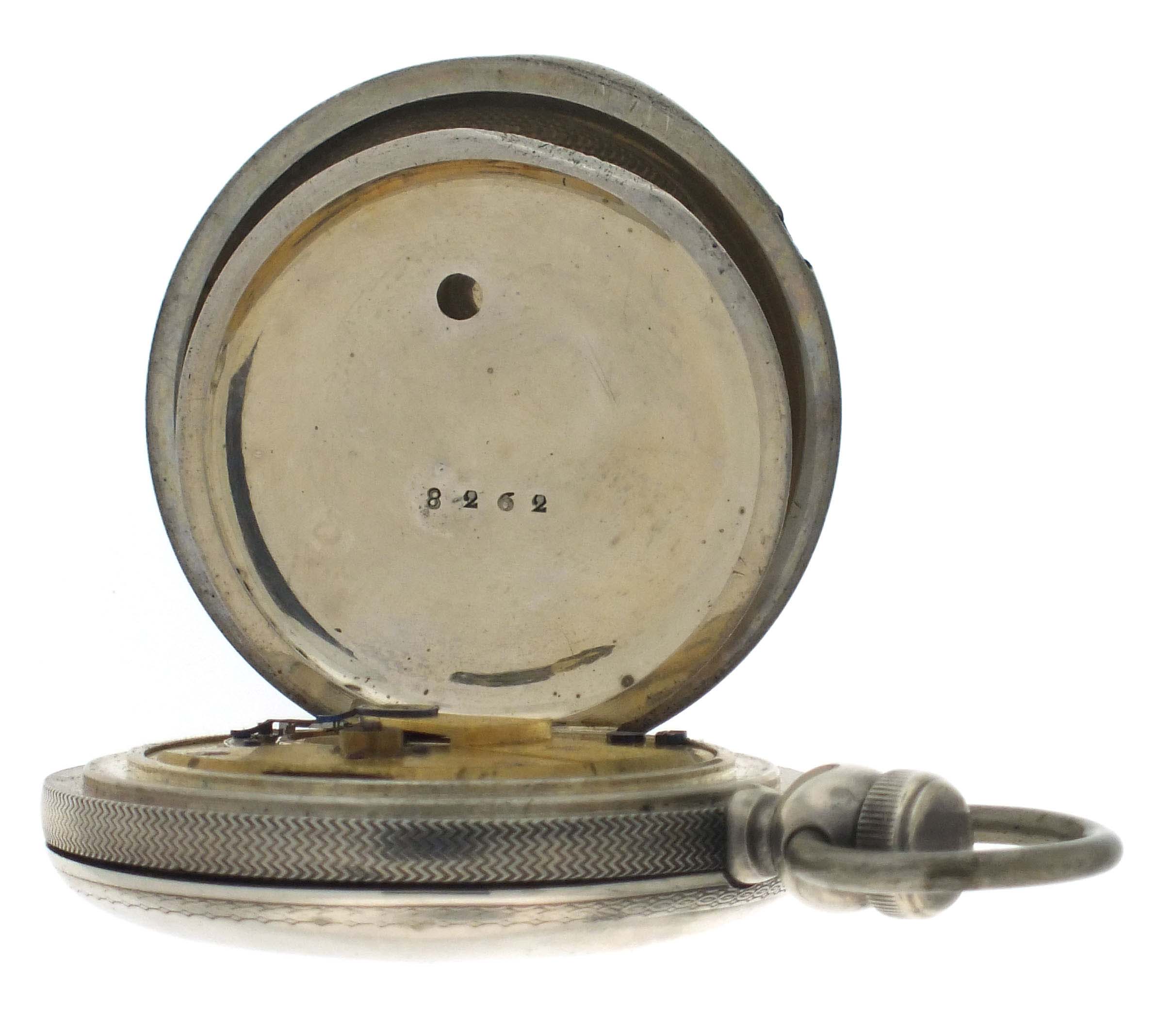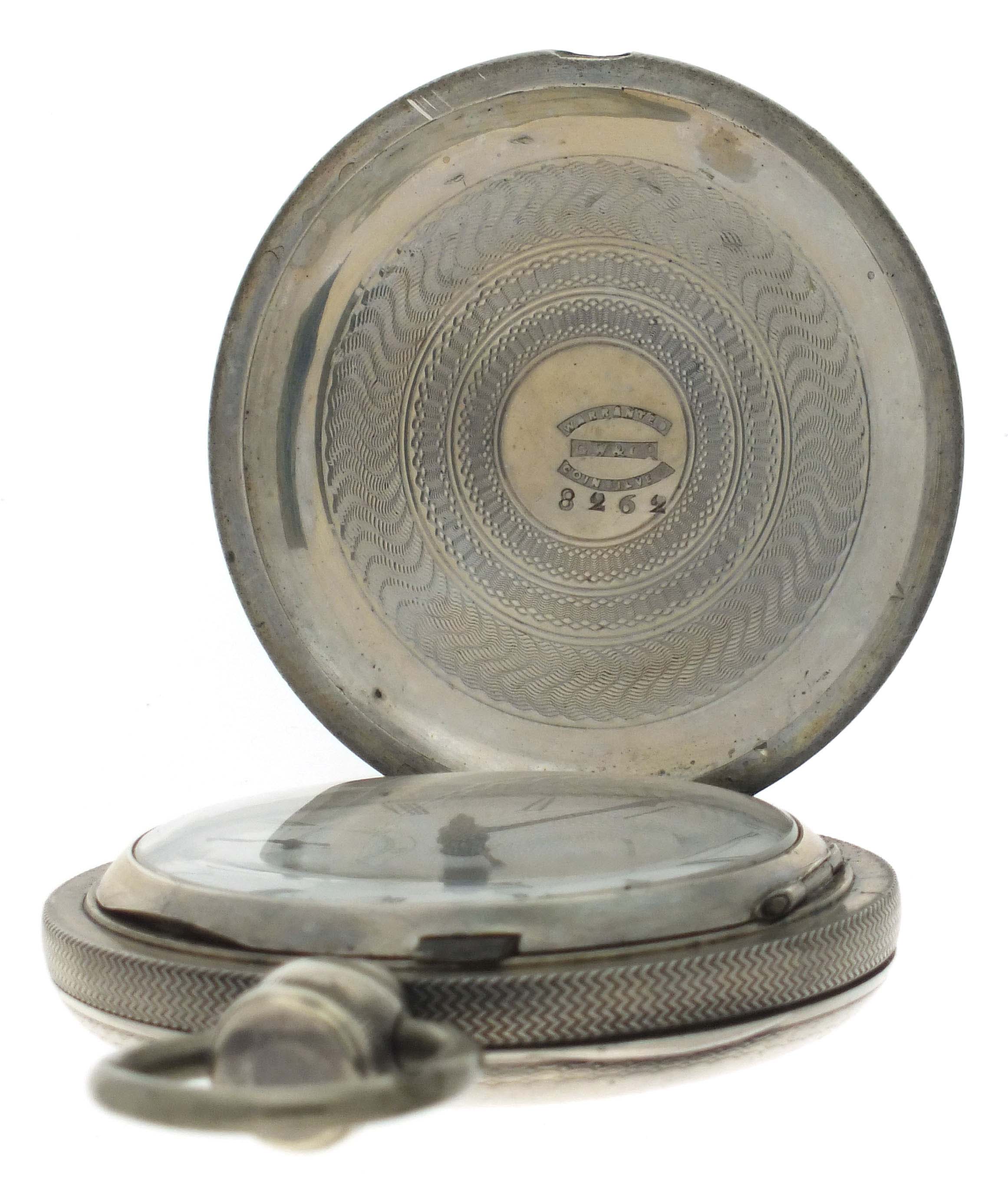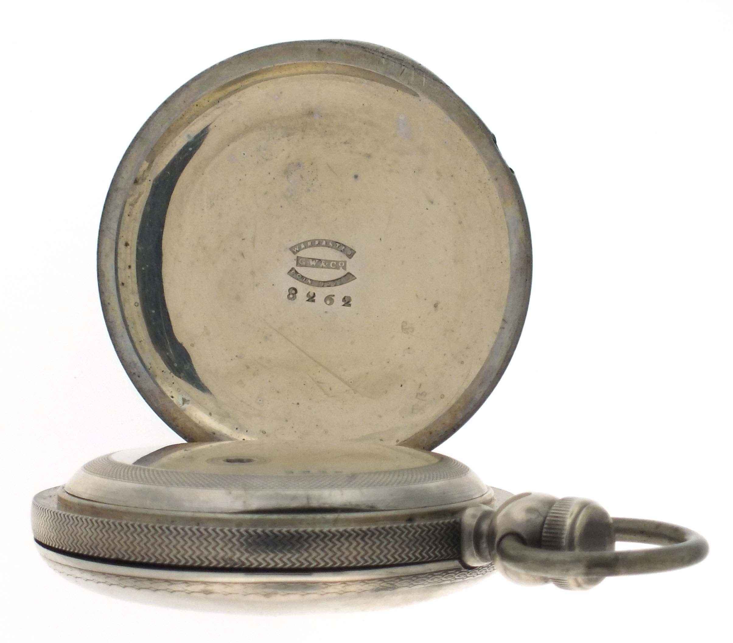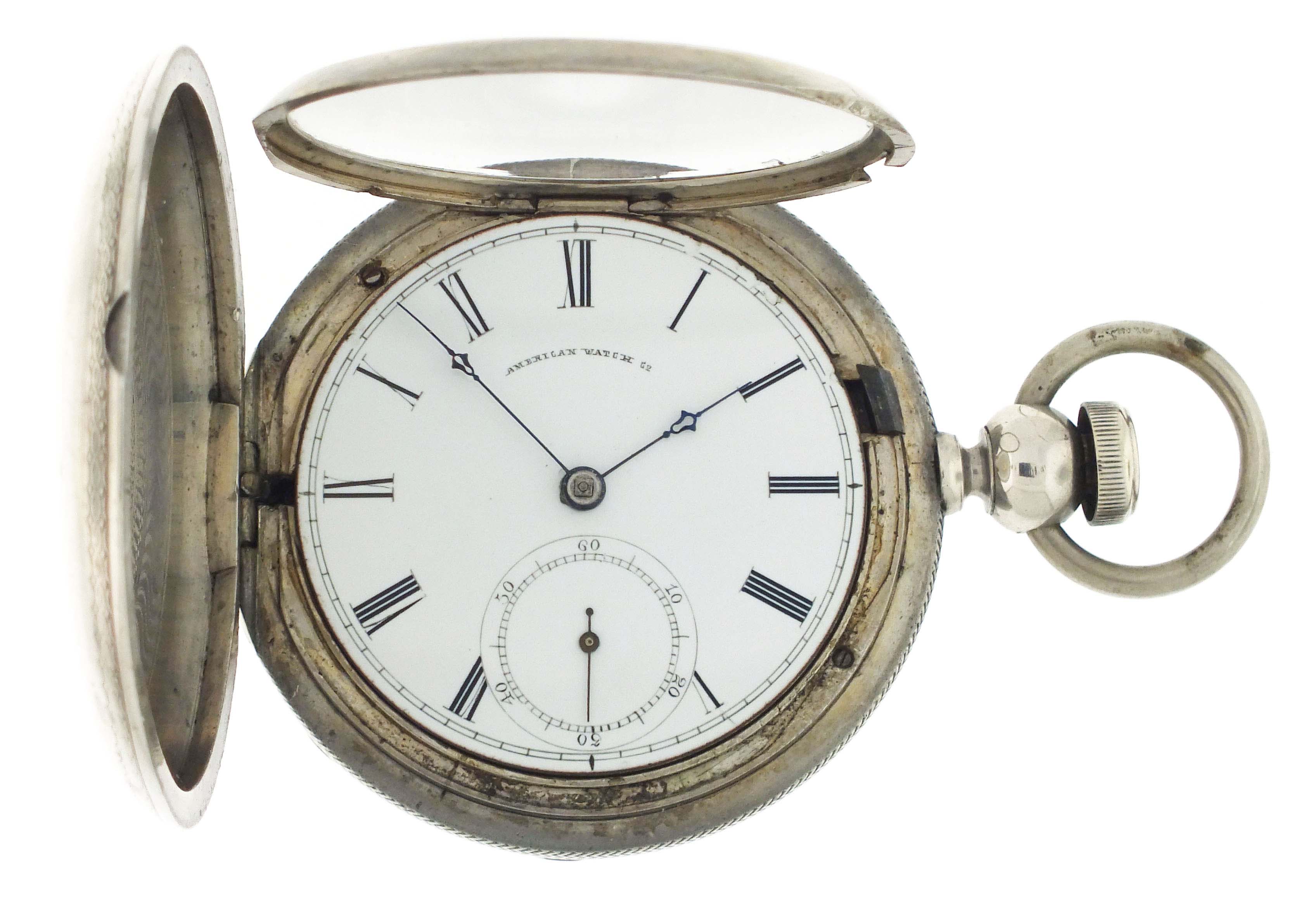 American Waltham Watch Co., Waltham, Mass., an "Appleton, Tracy & Co." pocket watch for the Ogdensburg and Lake Champlain railroad, 18 size, 15 jewels, key wind and set gilt plate movement with lever escapement and polished gold balance in a coin silver hunting case, the interior of the front cover engine turned, and the exterior with engraved artist's pallette with brushes, a branch with foliage, and "O. & L.C. R.R. 20.", roman numeral white enamel dial signed "American Watch Co.", with blued steel hands, serial #98862