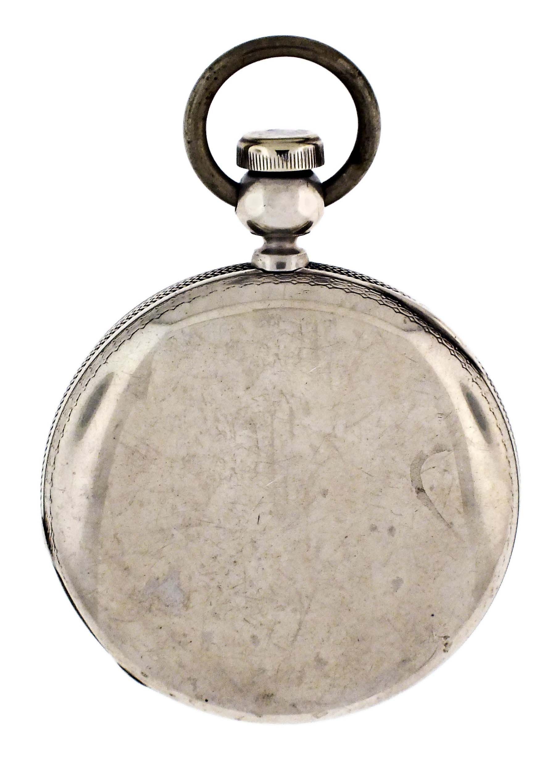 CASE: Minor dents; Dings; Fine scratches on outer surface of case; Fine scratches on cuvette; Case knife scratches; Punch marks on interior of case front from dent removal, some telegraphing through the cover; Engraving with minor wear; Front cover with gap at band when closed; Bow and pusher cap replaced; Precious metal content marked. DIAL: Faint hairline, 5:00; Flakes in enamel, most concealed by bezel. HANDS: Minor oxide. MOVEMENT PLATES: Fine marks and scratches on plate; Minor spotting; Balance stud and regulator with specks of oxide. MOVEMENT FUNCTION: Ticks briefly, needs service.