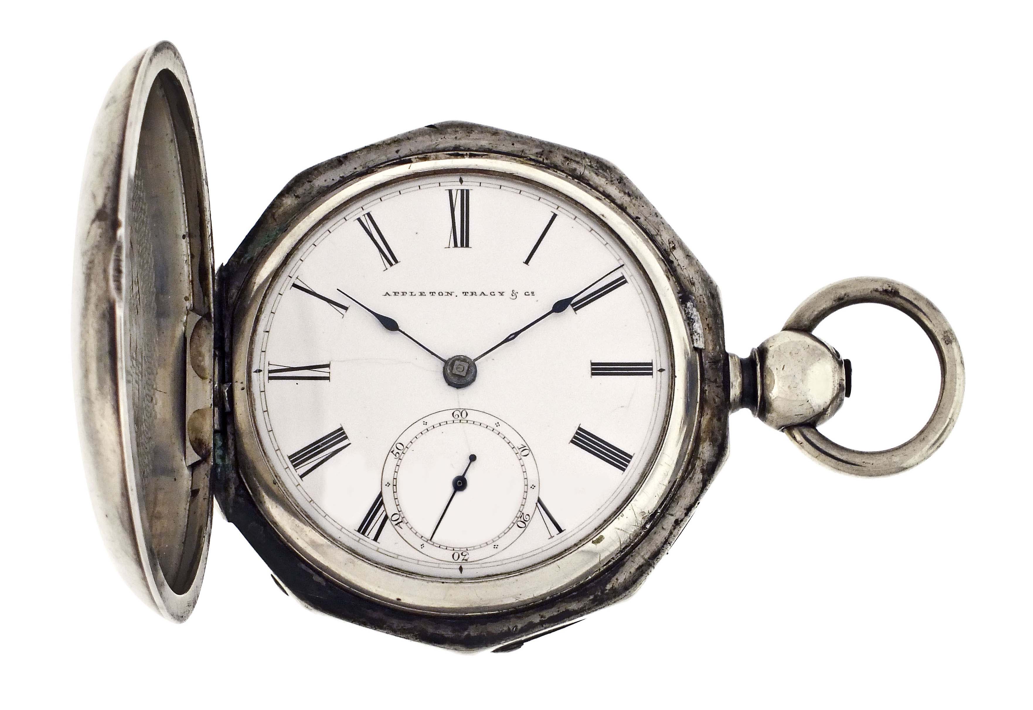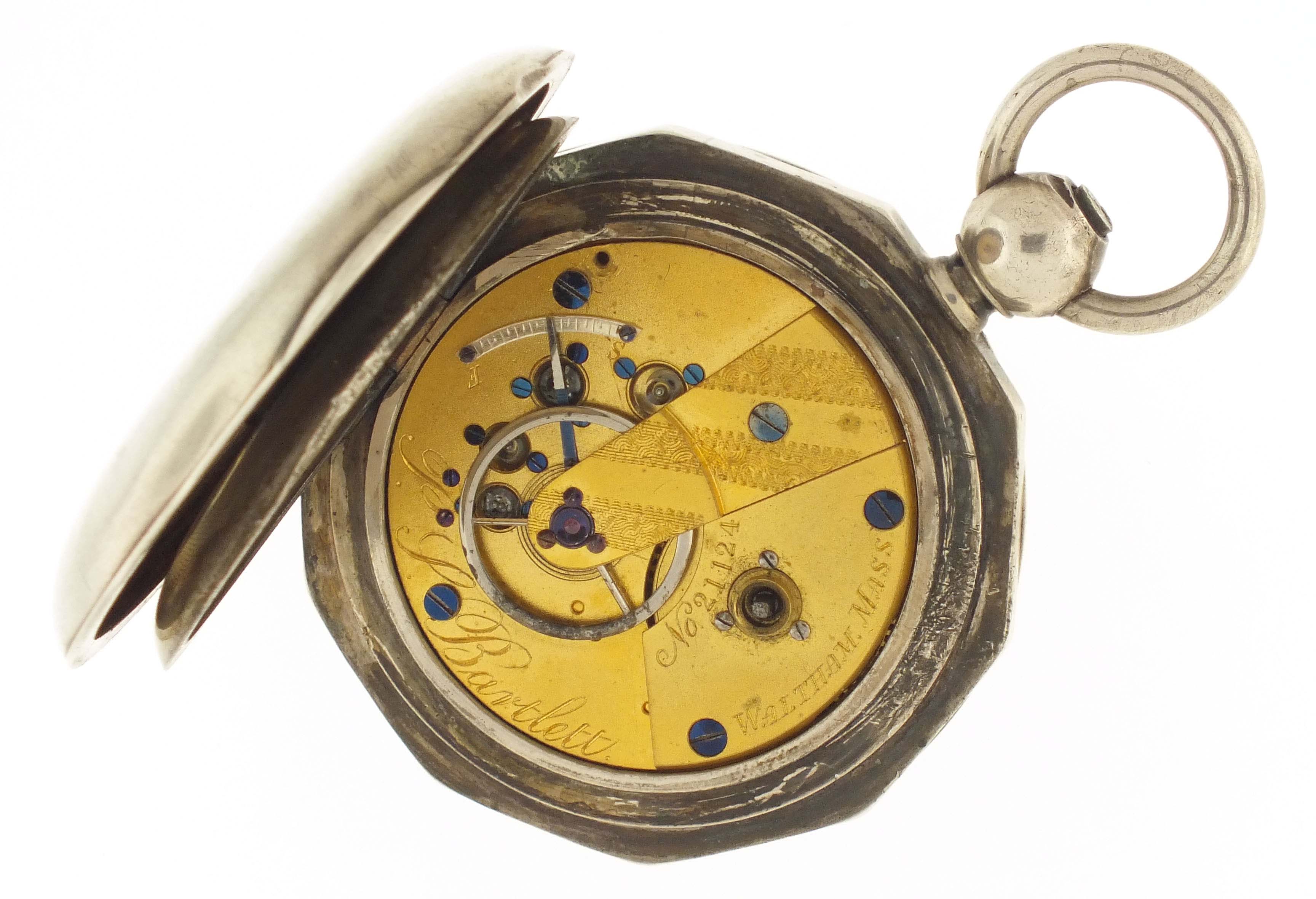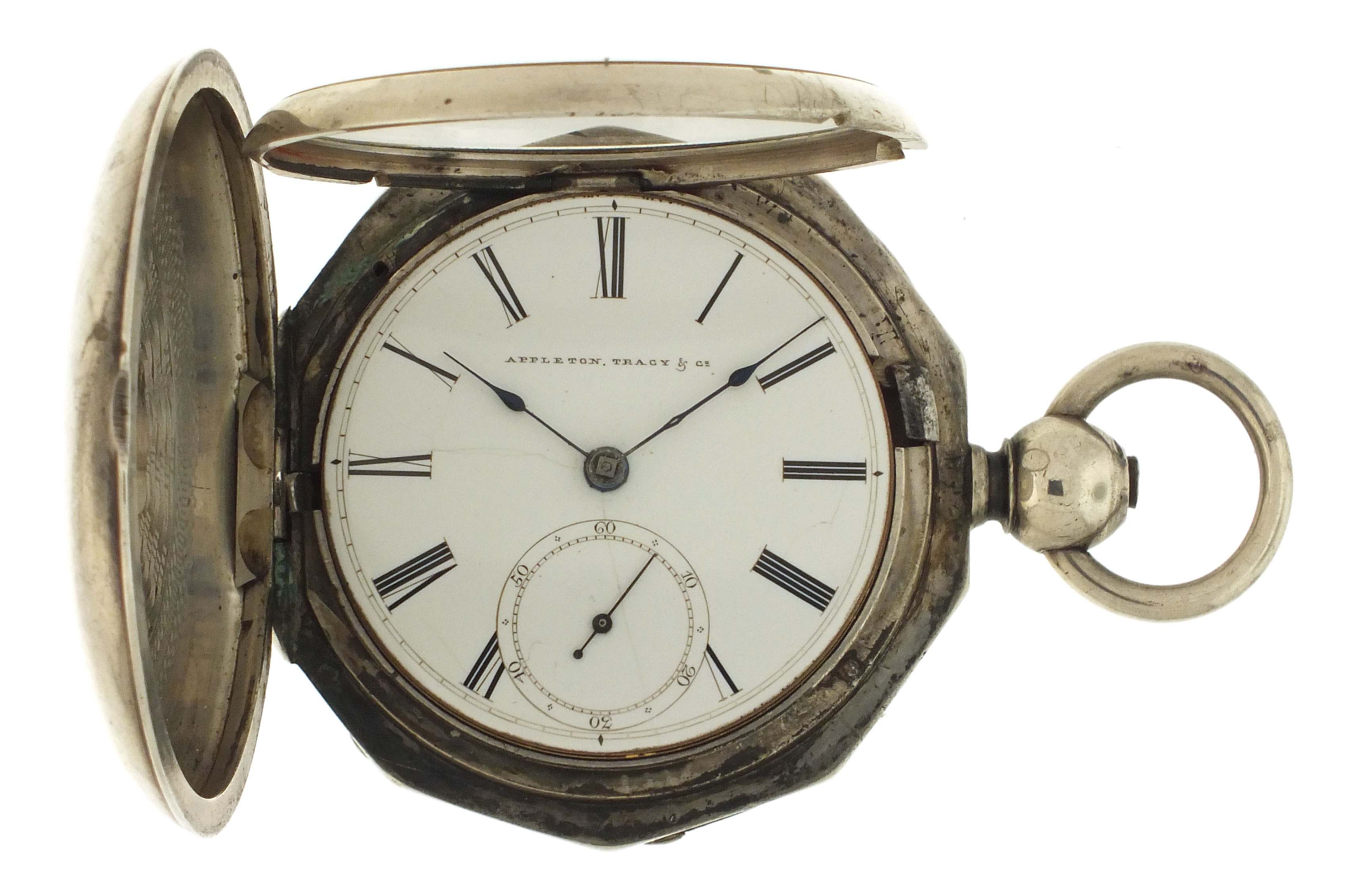 American Waltham Watch Co., Waltham, Mass., a Civil War era "P.S. Bartlett" pocket watch, 18 size, 11 jewels, key wind and set gilt plate movement with lever escapement and steel balance in a heavy coin silver hunting case with decagonal band and front cover with engraved American eagle, roman numeral white enamel dial signed "Appleton, Tracy & Co." with blued steel spade hands, serial #21124