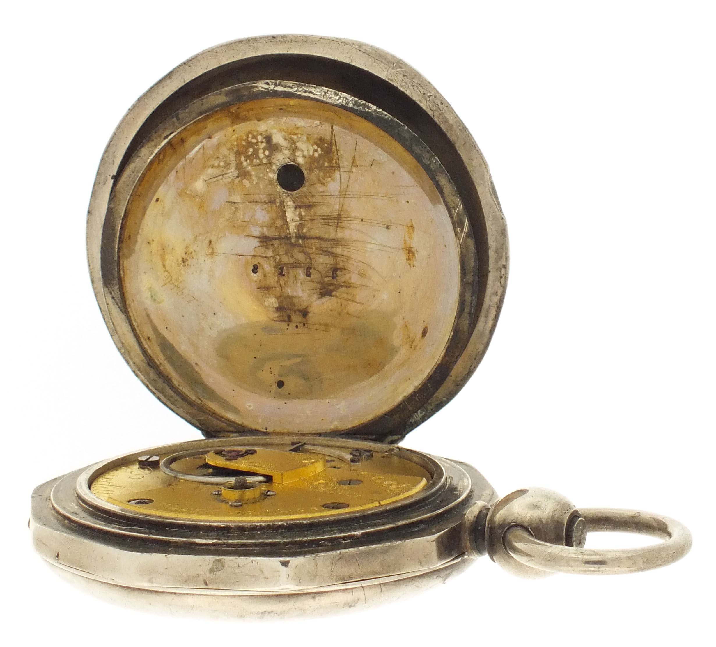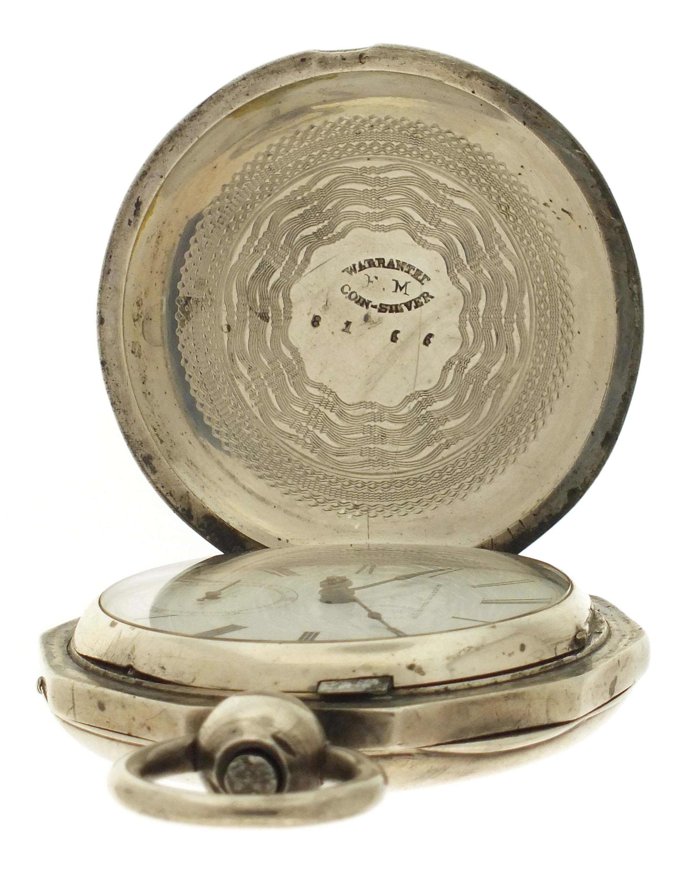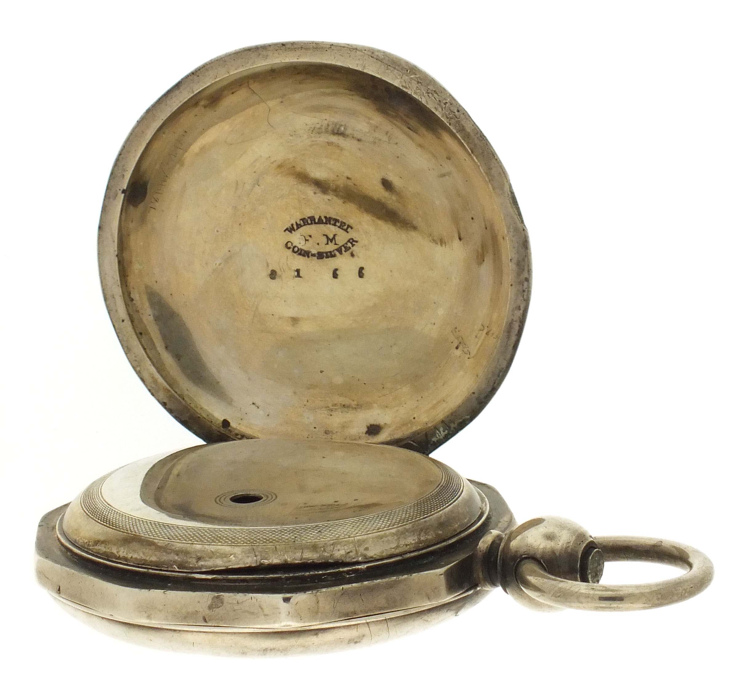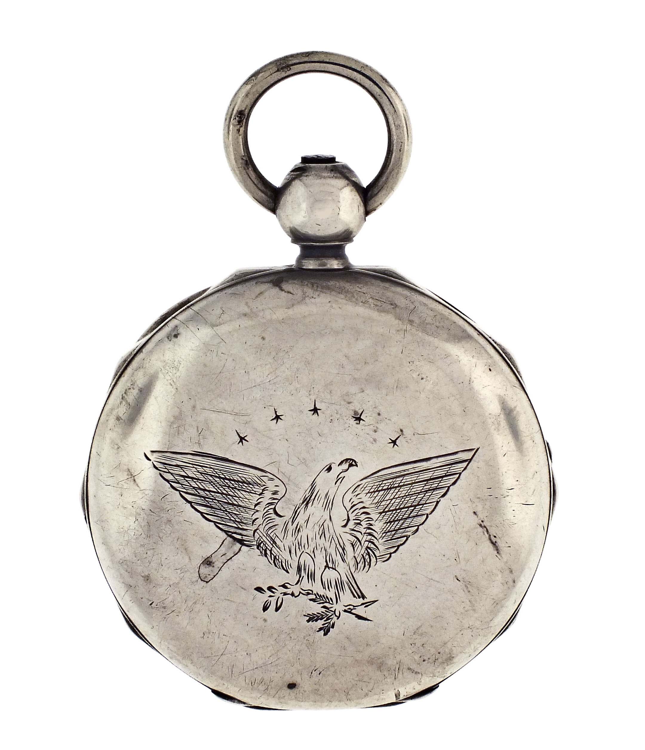 American Waltham Watch Co., Waltham, Mass., a Civil War era "P.S. Bartlett" pocket watch, 18 size, 11 jewels, key wind and set gilt plate movement with lever escapement and steel balance in a heavy coin silver hunting case with decagonal band and front cover with engraved American eagle, roman numeral white enamel dial signed "Appleton, Tracy & Co." with blued steel spade hands, serial #21124