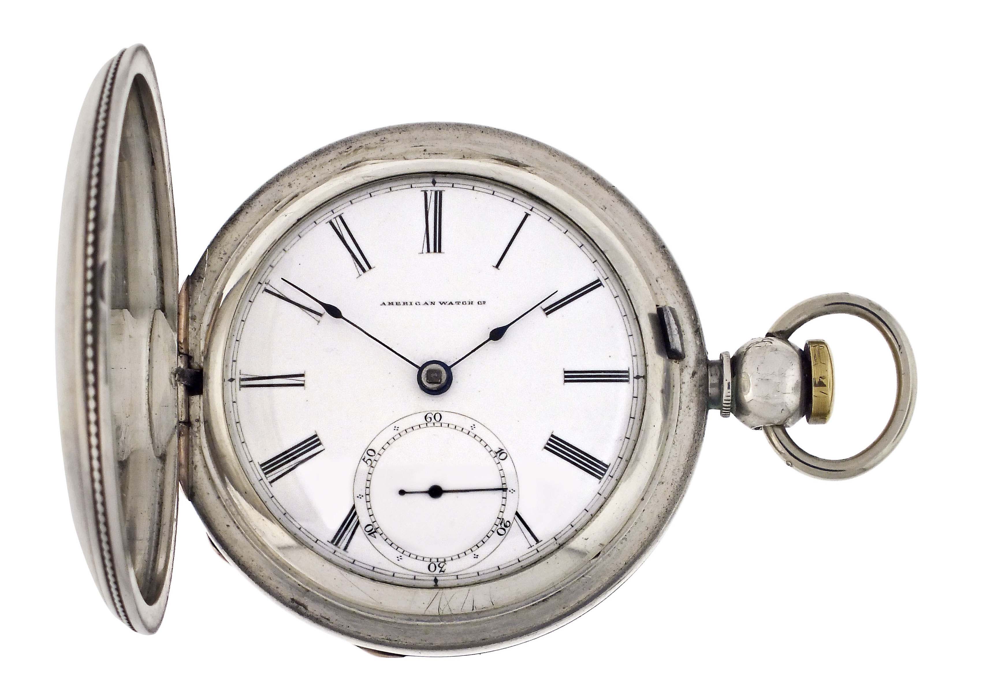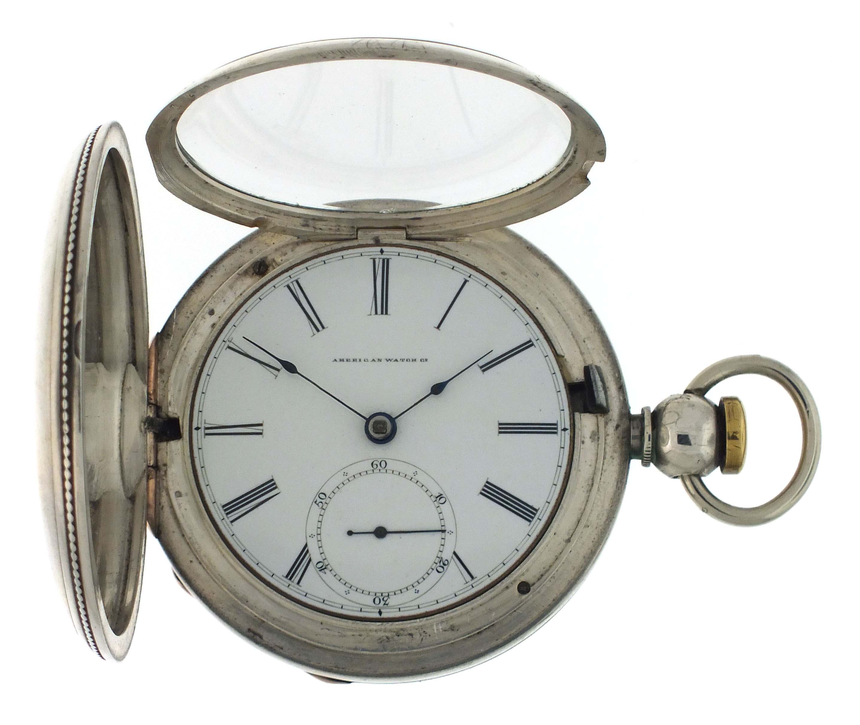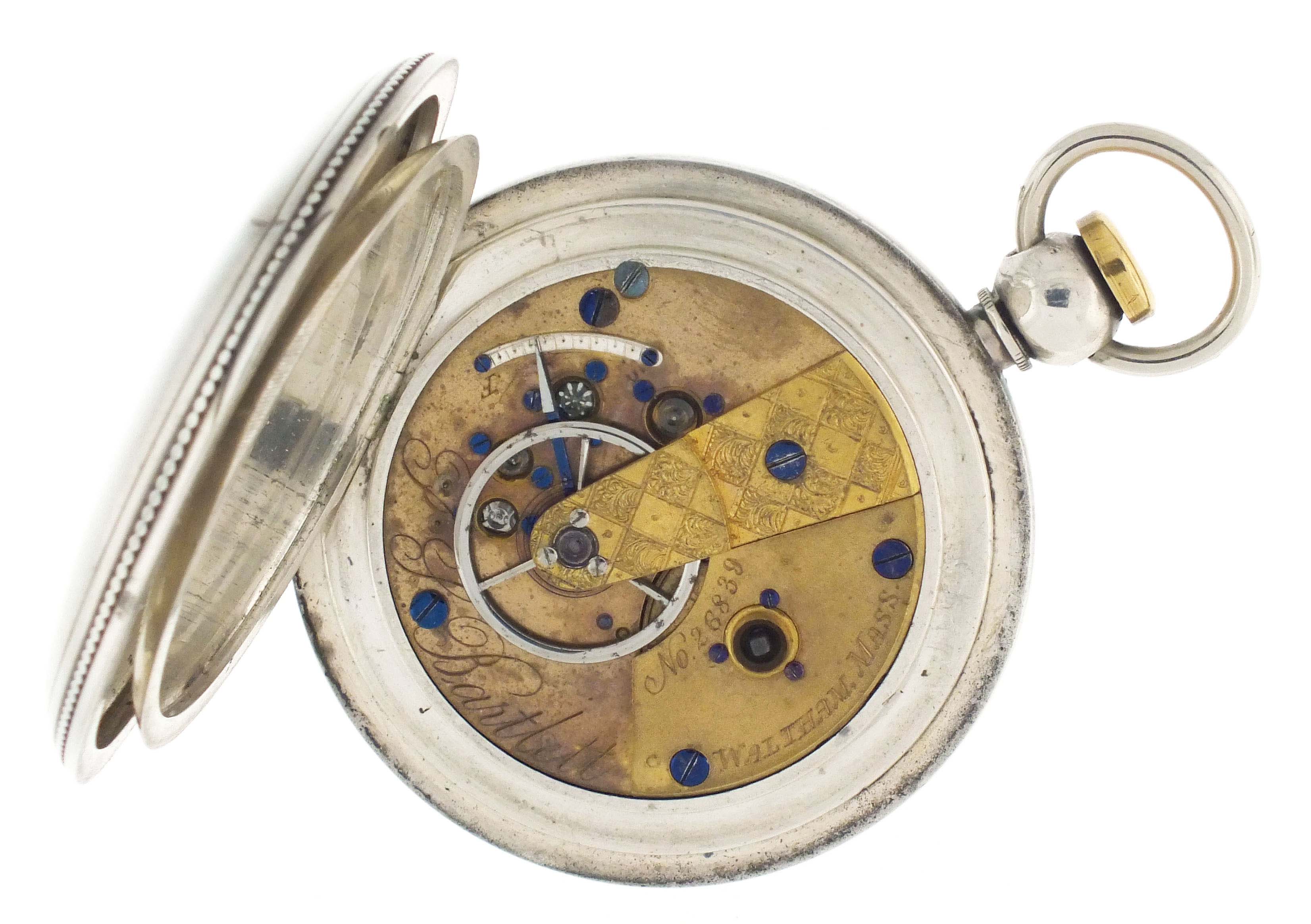 American Waltham Watch Co., Waltham, Mass., a Civil War era "P.S. Bartlett" pocket watch, 18 size, 11 jewels, key wind and set gilt plate movement with lever escapement and steel balance in a 4 oz. coin silver hunting case with engraved cartouche on front cover, roman numeral white enamel dial signed "American Watch Co." with blued steel spade hands, serial #26839
