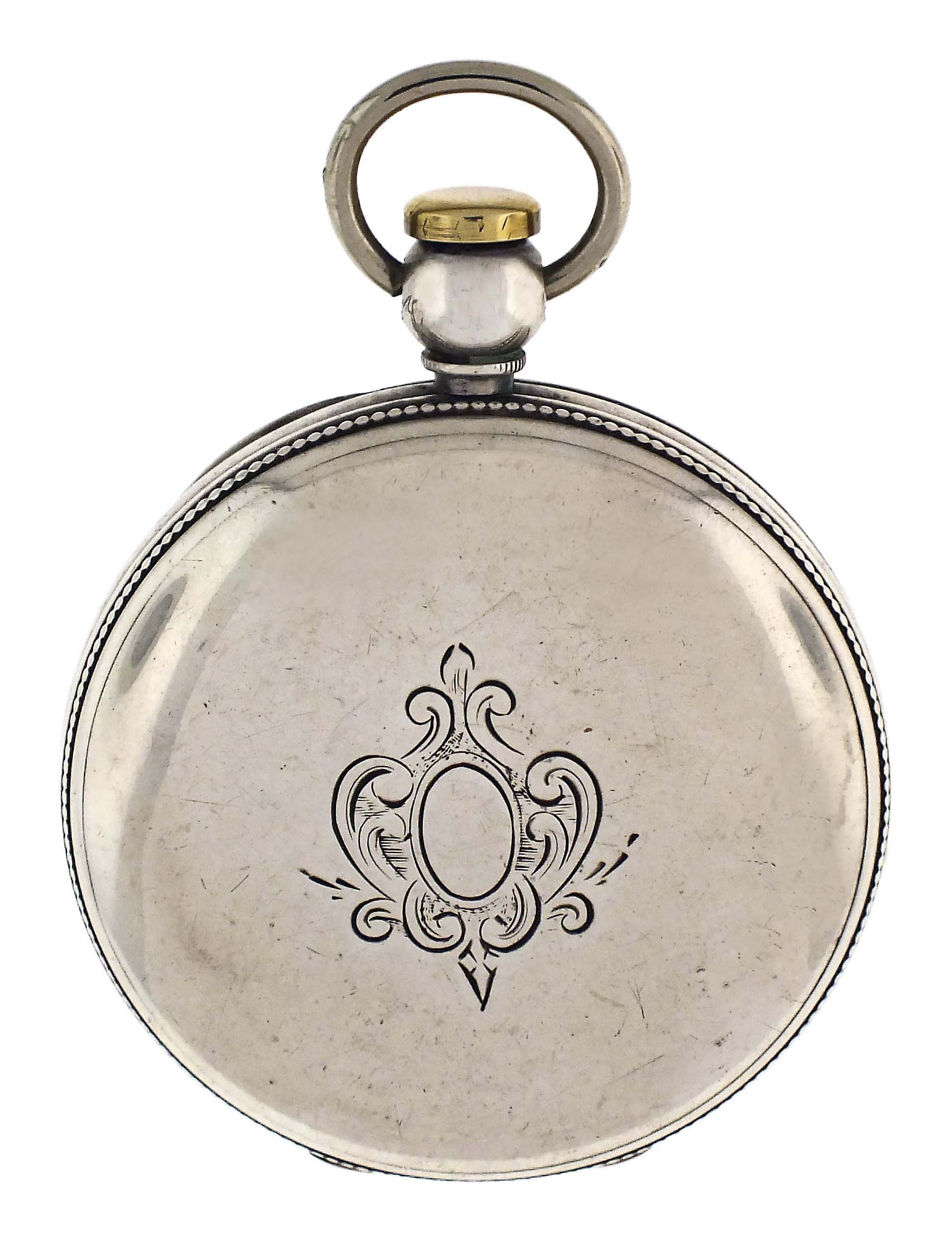 CASE: Dings and a few minor dents; One larger dent that has been pushed out; Fine scratches on outer surface of case; Fine scratches on cuvette; One hinge plug absent; Bow replaced; Pusher cap an incorrect replacement; Precious metal content marked. DIAL: Very good. HANDS: Replaced; Minute short. MOVEMENT PLATES: Fine scratches on plate; Spotting and staining; Losses to gilding; Balance with specks of oxide; Case screw replaced; One bridge screw with oxide; Balance cock screw with minor losses to blue; Winding arbor with rust. MOVEMENT FUNCTION: Running order (winds, sets and ticks); Would benefit from service.