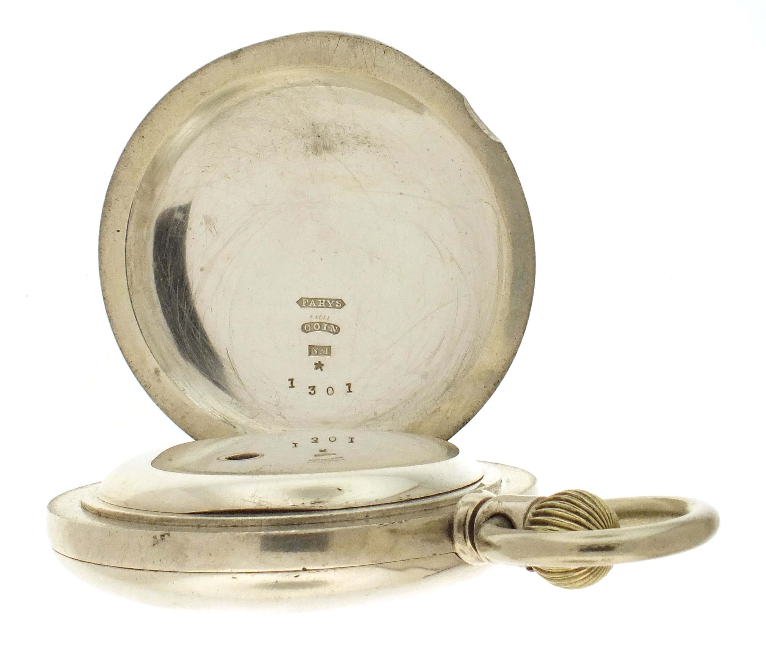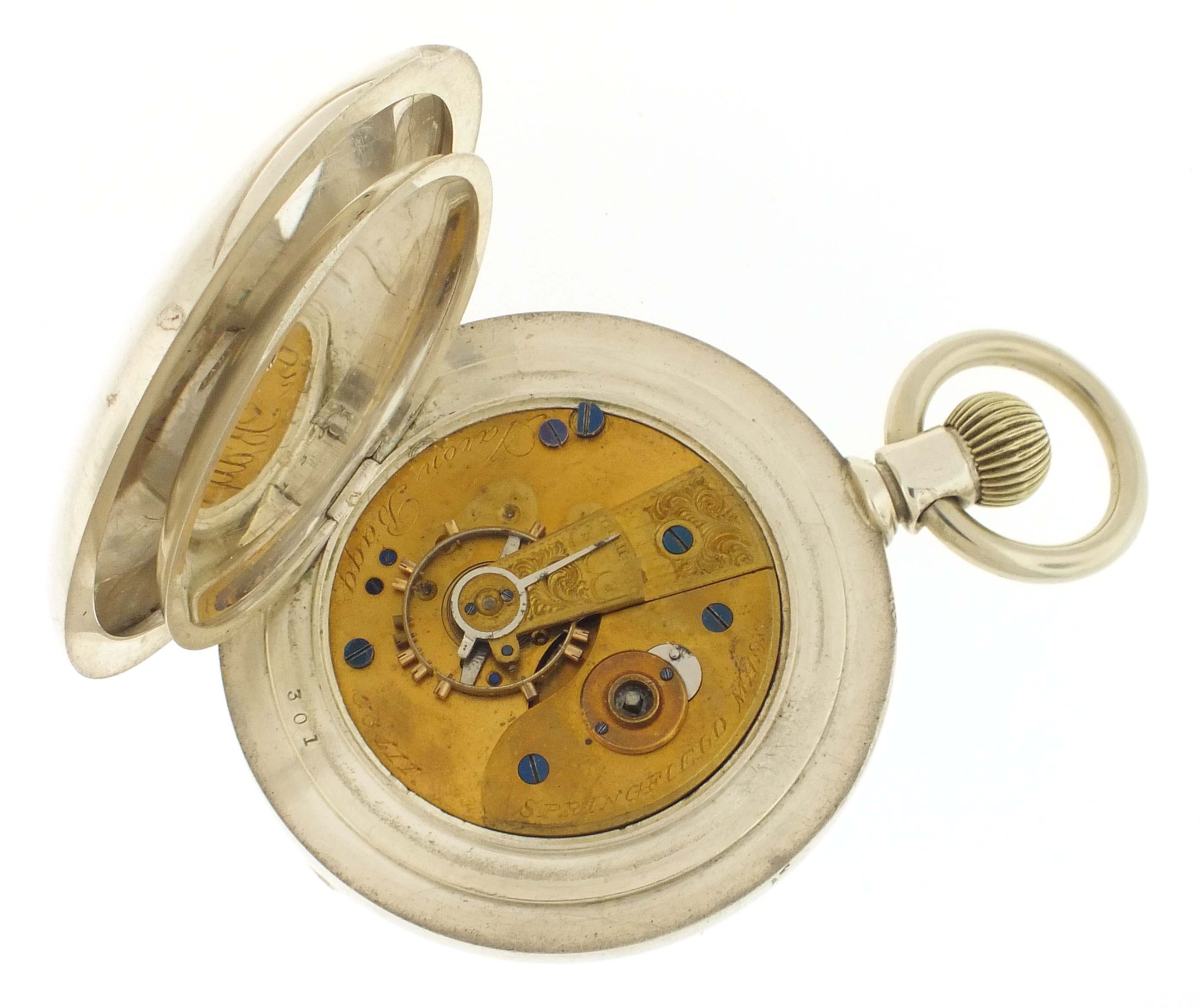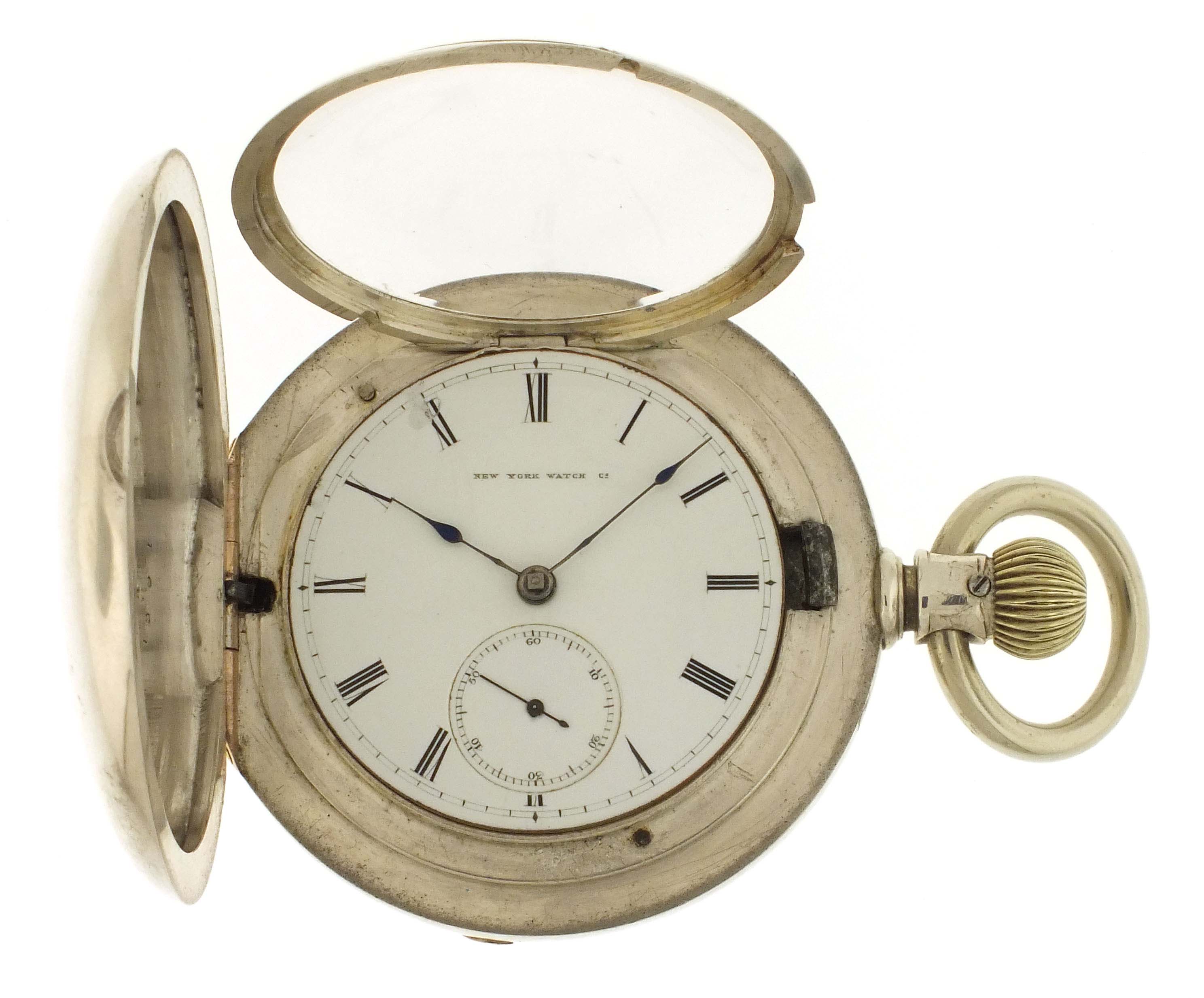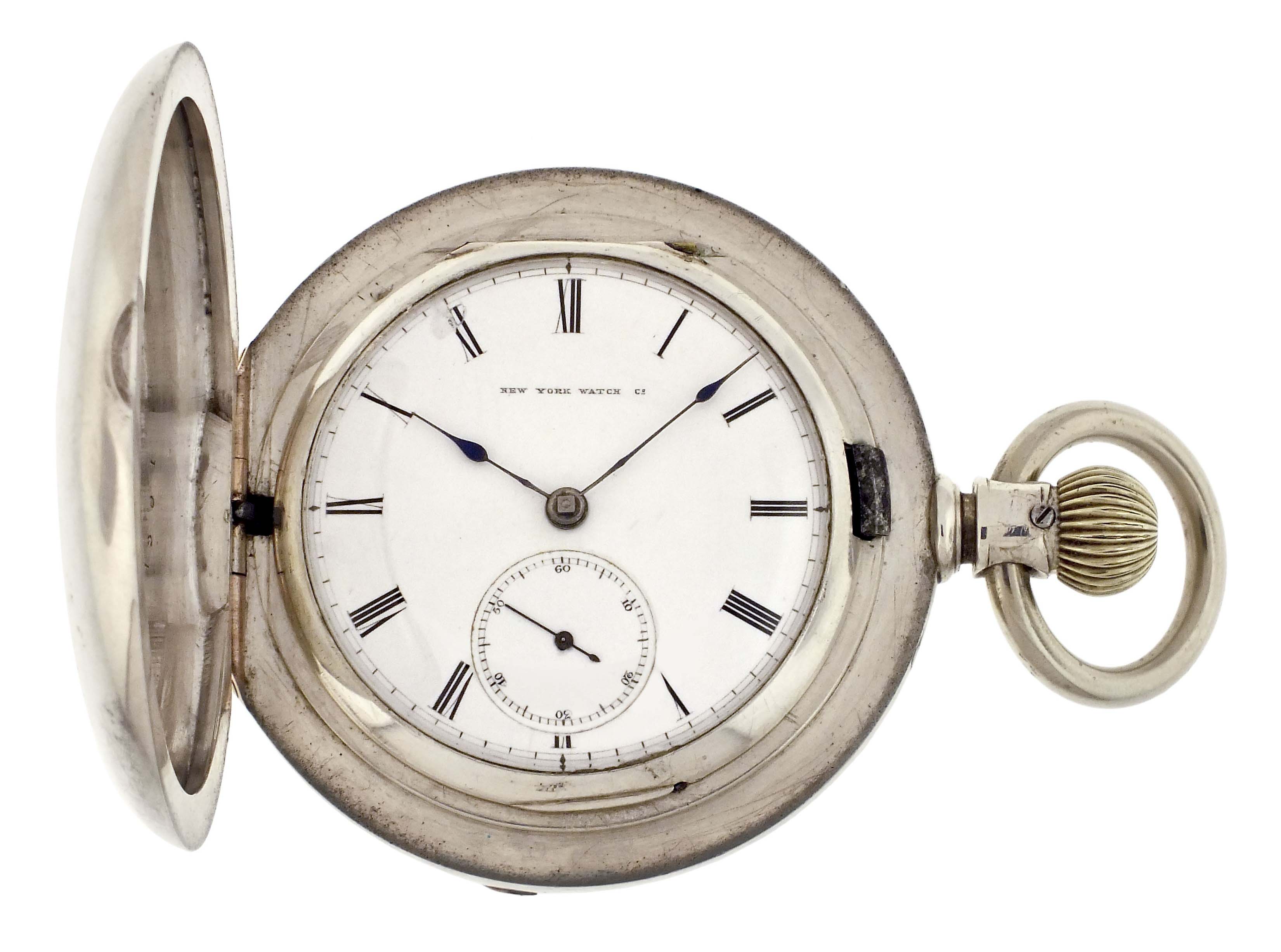 New York Watch Co., Springfield, Mass., a hunting cased "Aaron Bagg" pocket watch, 18 size, 7 jewels, key wind and set gilt plate movement with lever escapement, and cut bimetallic balance with gold screws in an 8 oz., plain polished coin silver hunting case, roman numeral, single sunk white enamel dial with blued steel spade hands, serial #38411