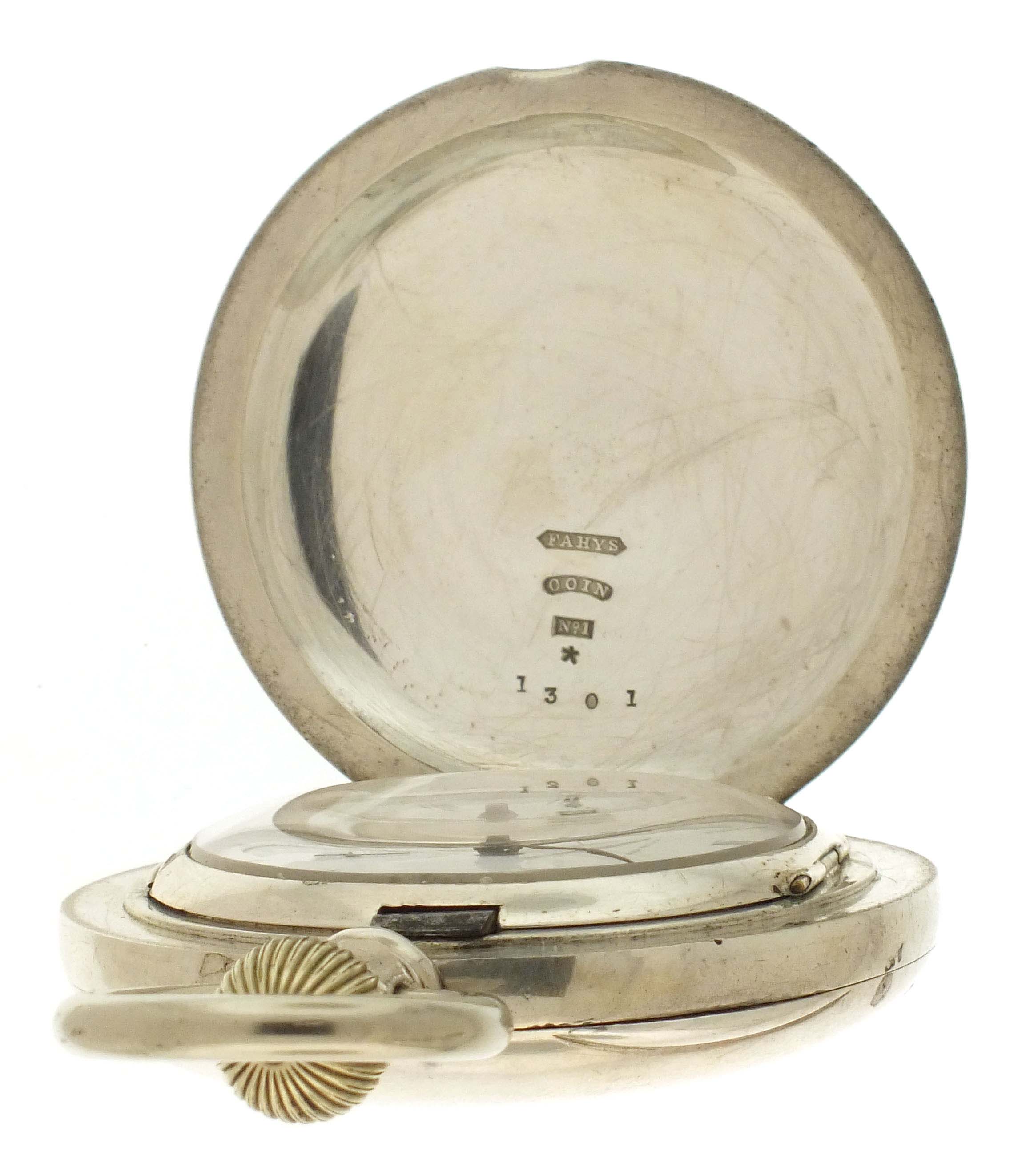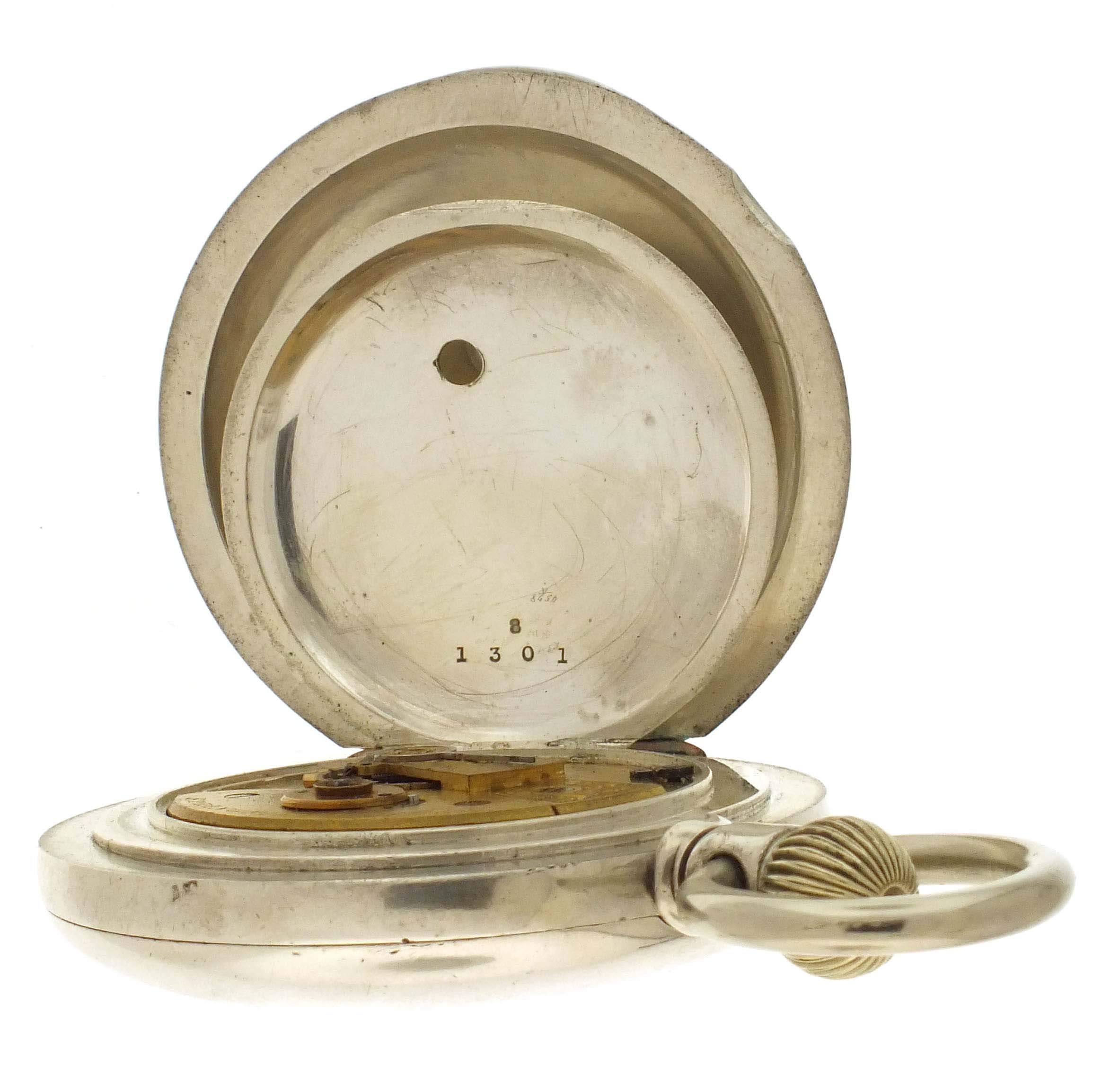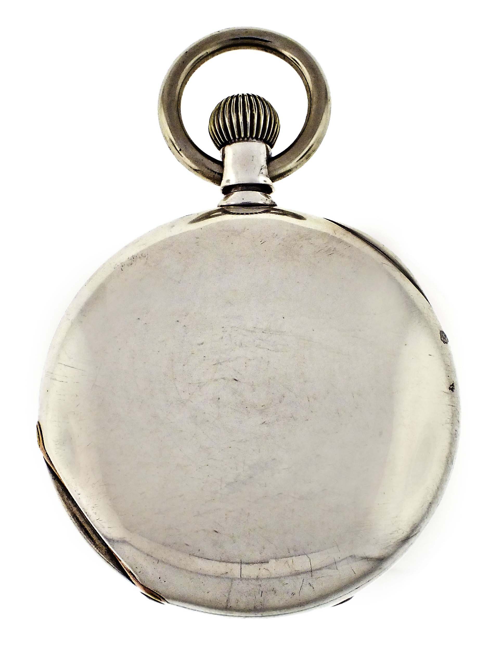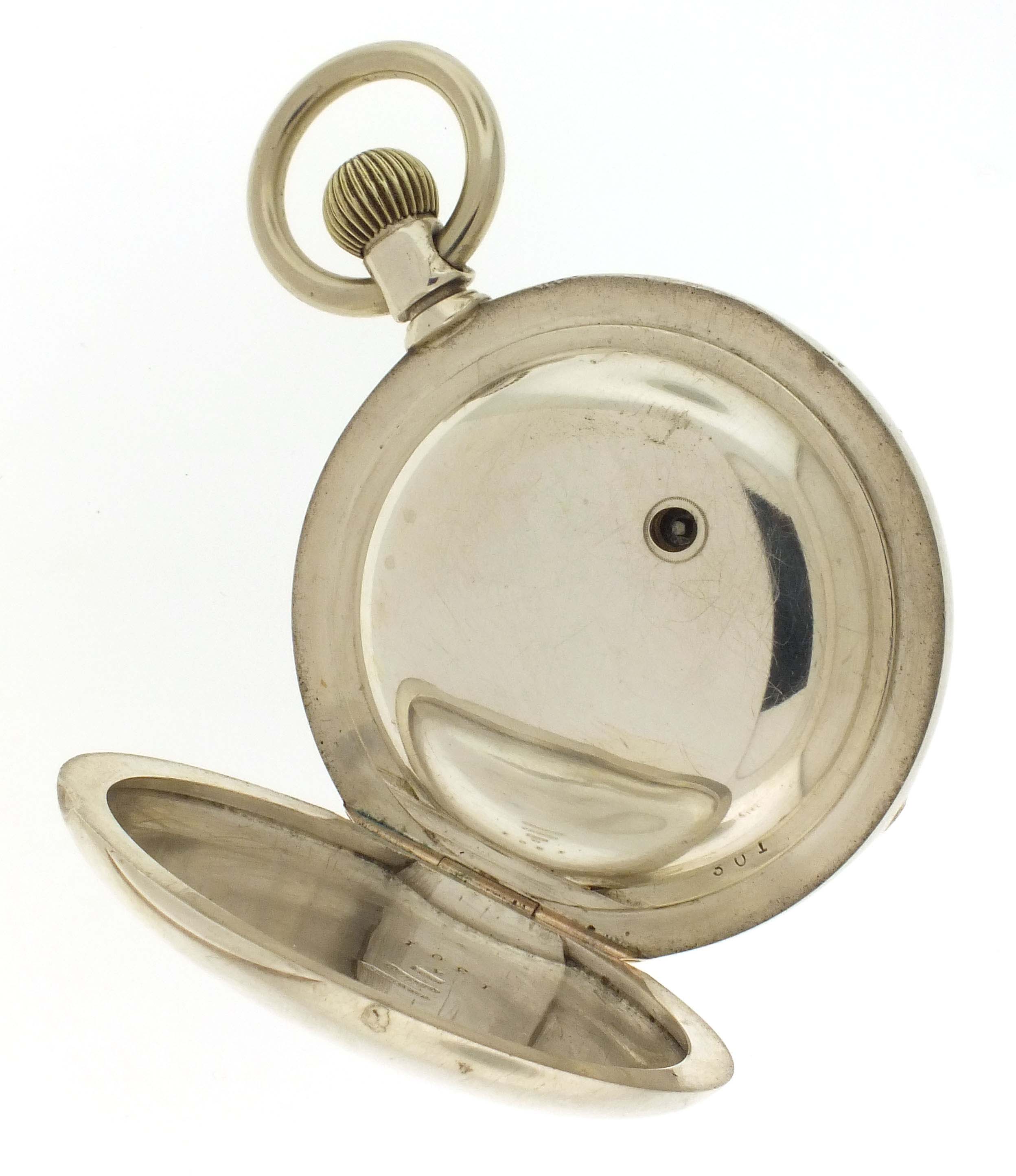 New York Watch Co., Springfield, Mass., a hunting cased "Aaron Bagg" pocket watch, 18 size, 7 jewels, key wind and set gilt plate movement with lever escapement, and cut bimetallic balance with gold screws in an 8 oz., plain polished coin silver hunting case, roman numeral, single sunk white enamel dial with blued steel spade hands, serial #38411