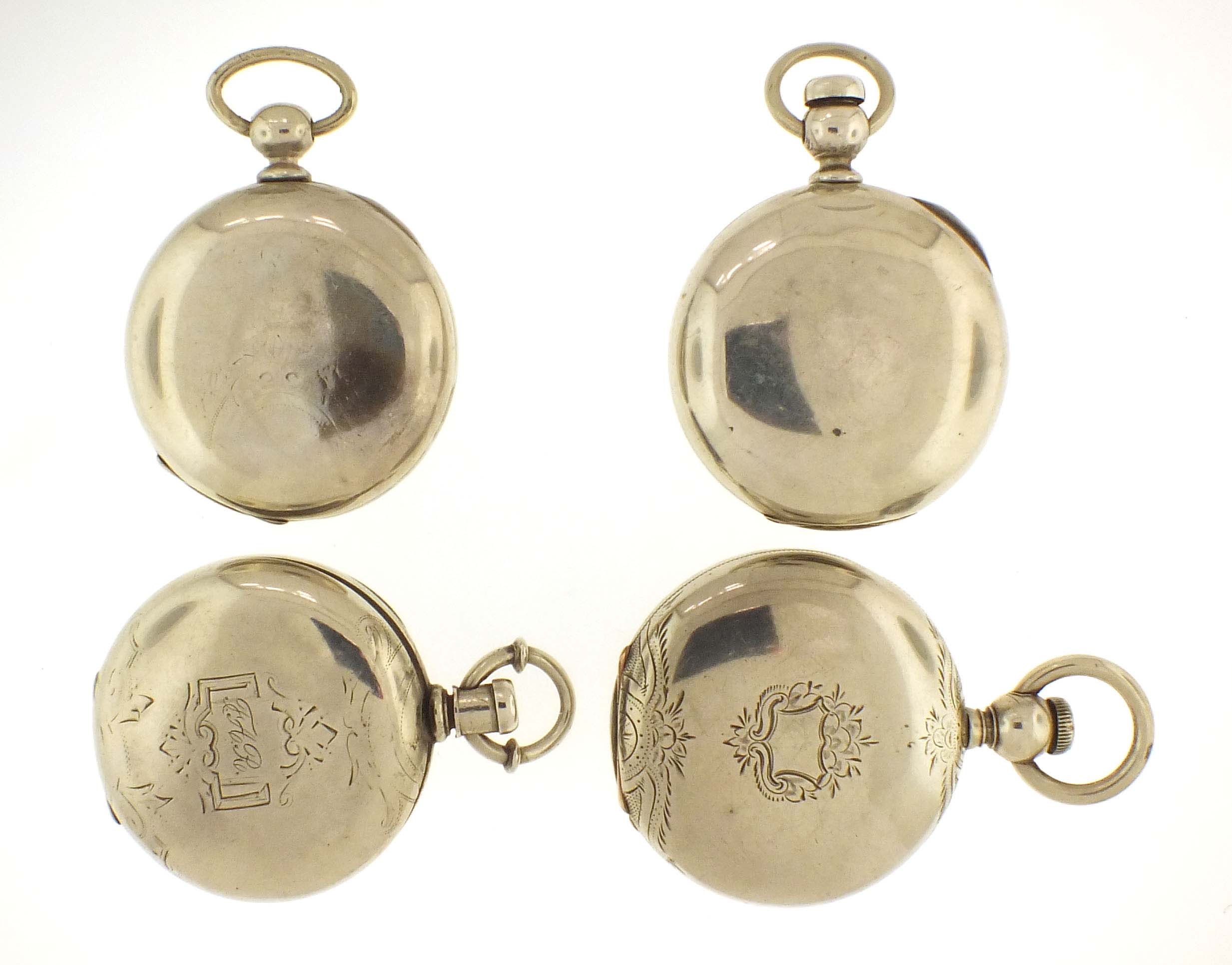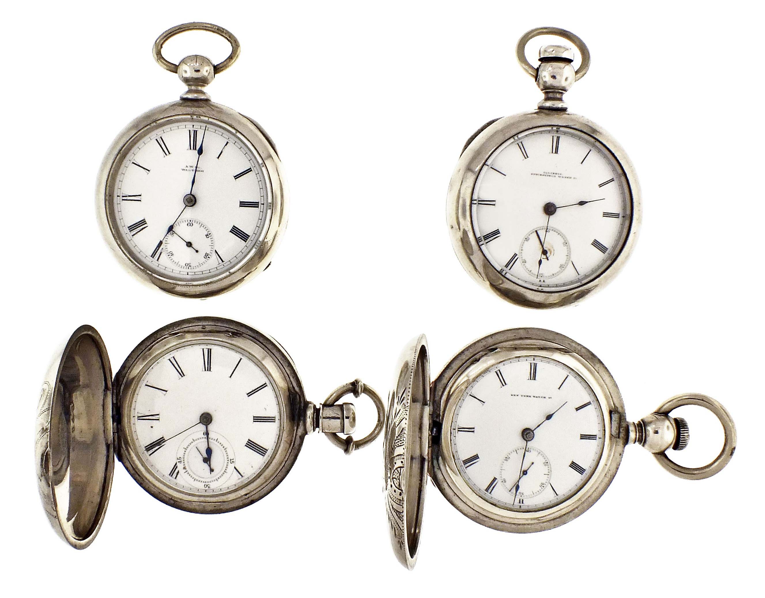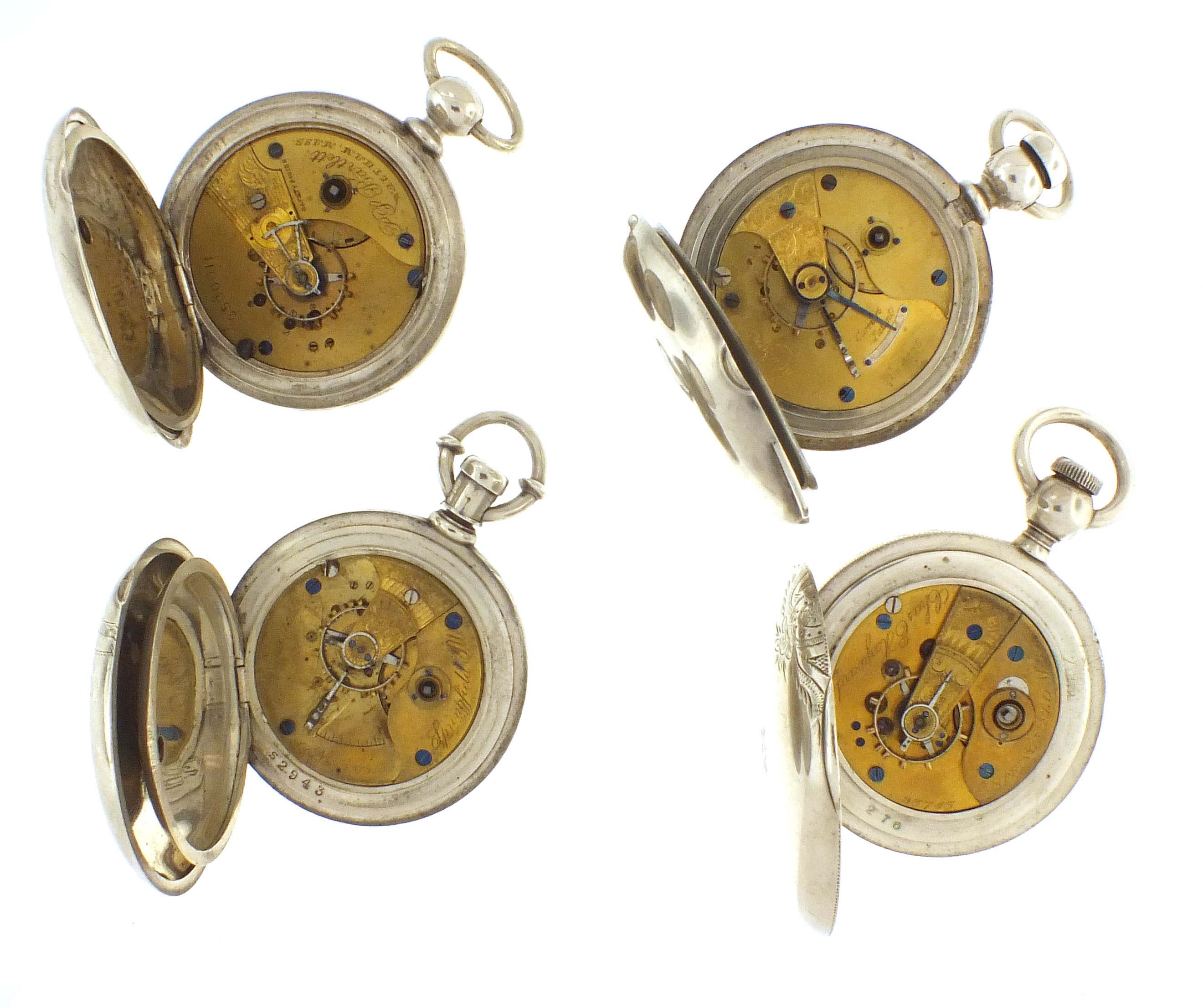 4 (Four) American pocket watches, 18 size, key wind movements, including Illinois, model 1, "America" 17 jewel movement in coin silver hunting case serial #197515, model 1870, "Aaron Bagg" 7 jewel movement in coin silver hunting case, serial #23743, a Waltham model 1883, "P.S. Bartlett" 13 jewel movement in coin silver open face case, serial #3530011, and an Illinois, model 1, "Mason", 7 jewel movement movement in coin silver case, serial #4223