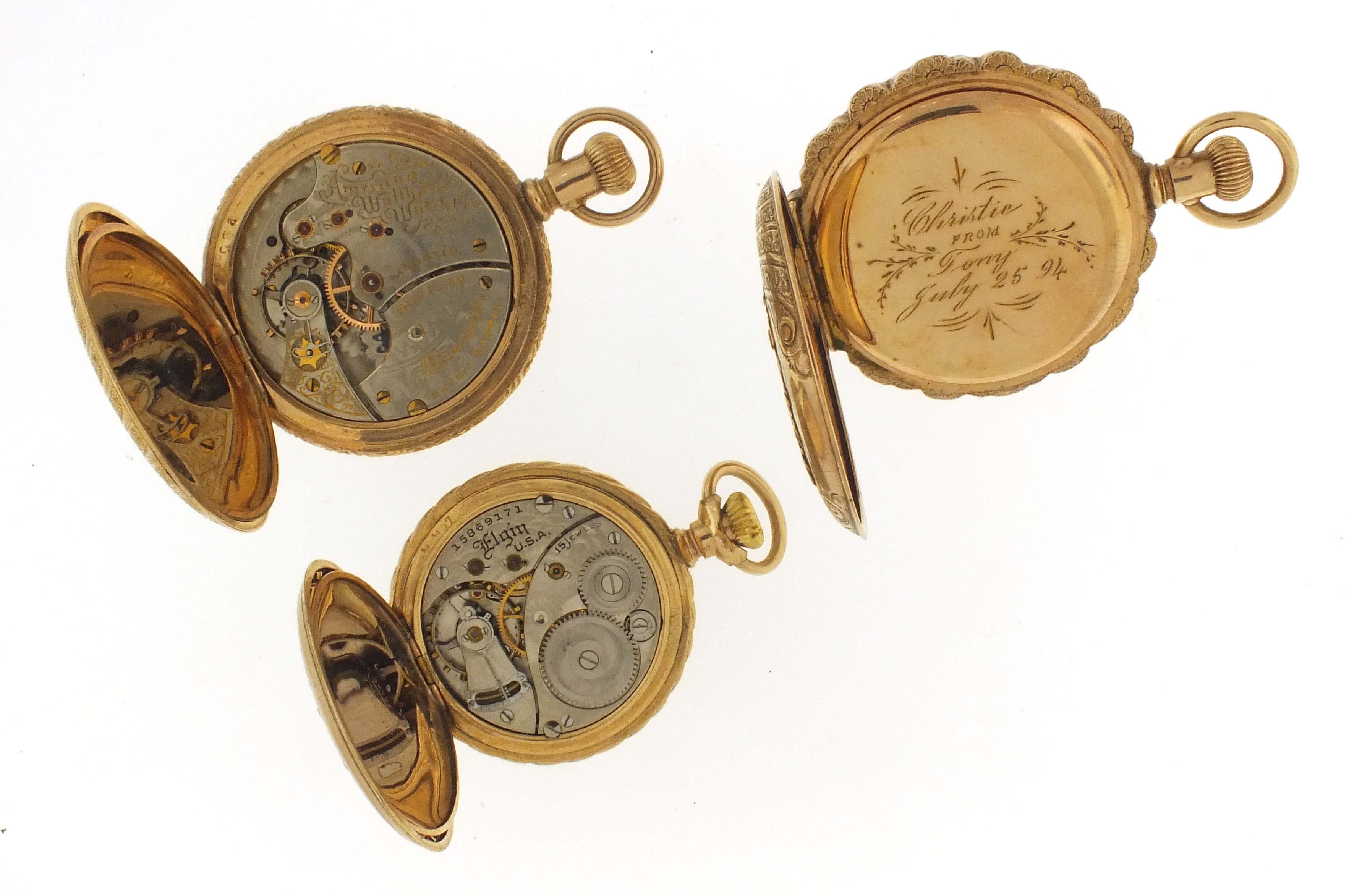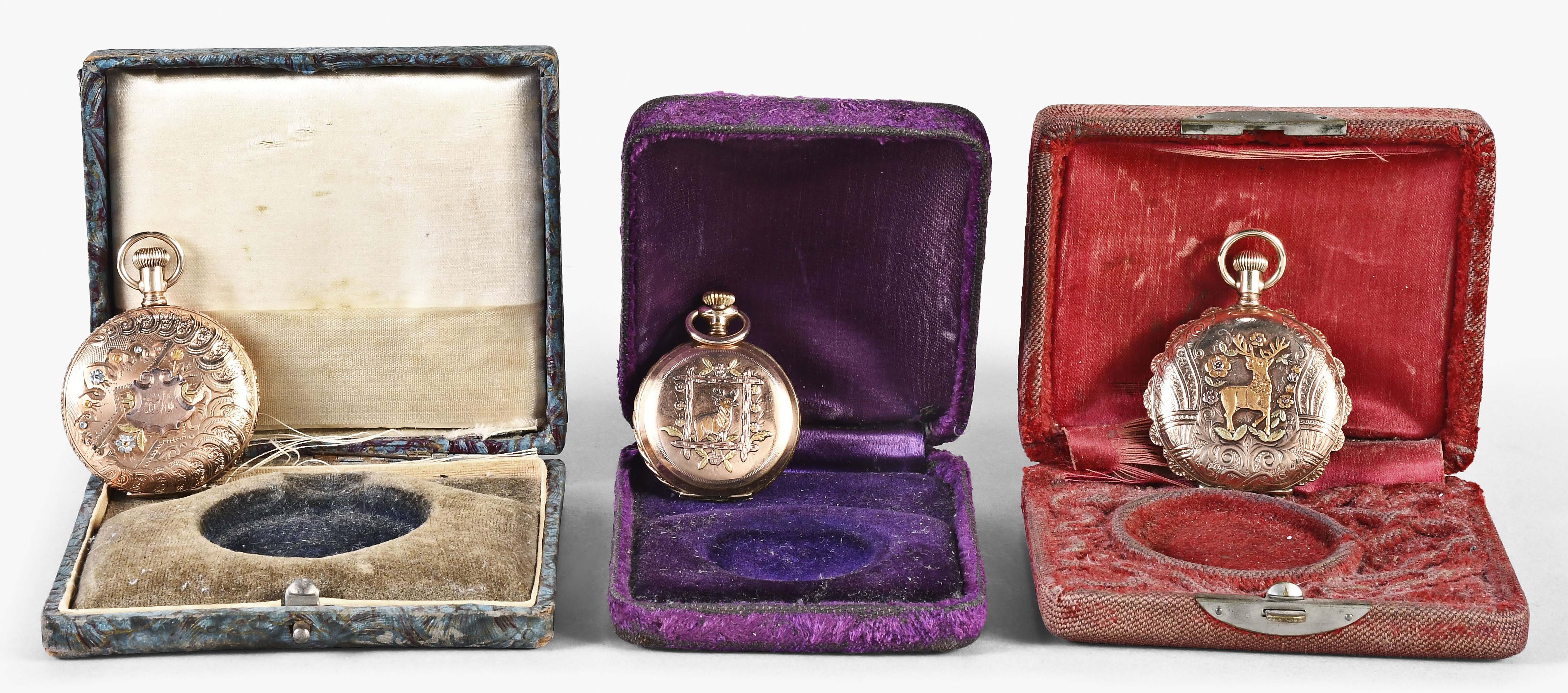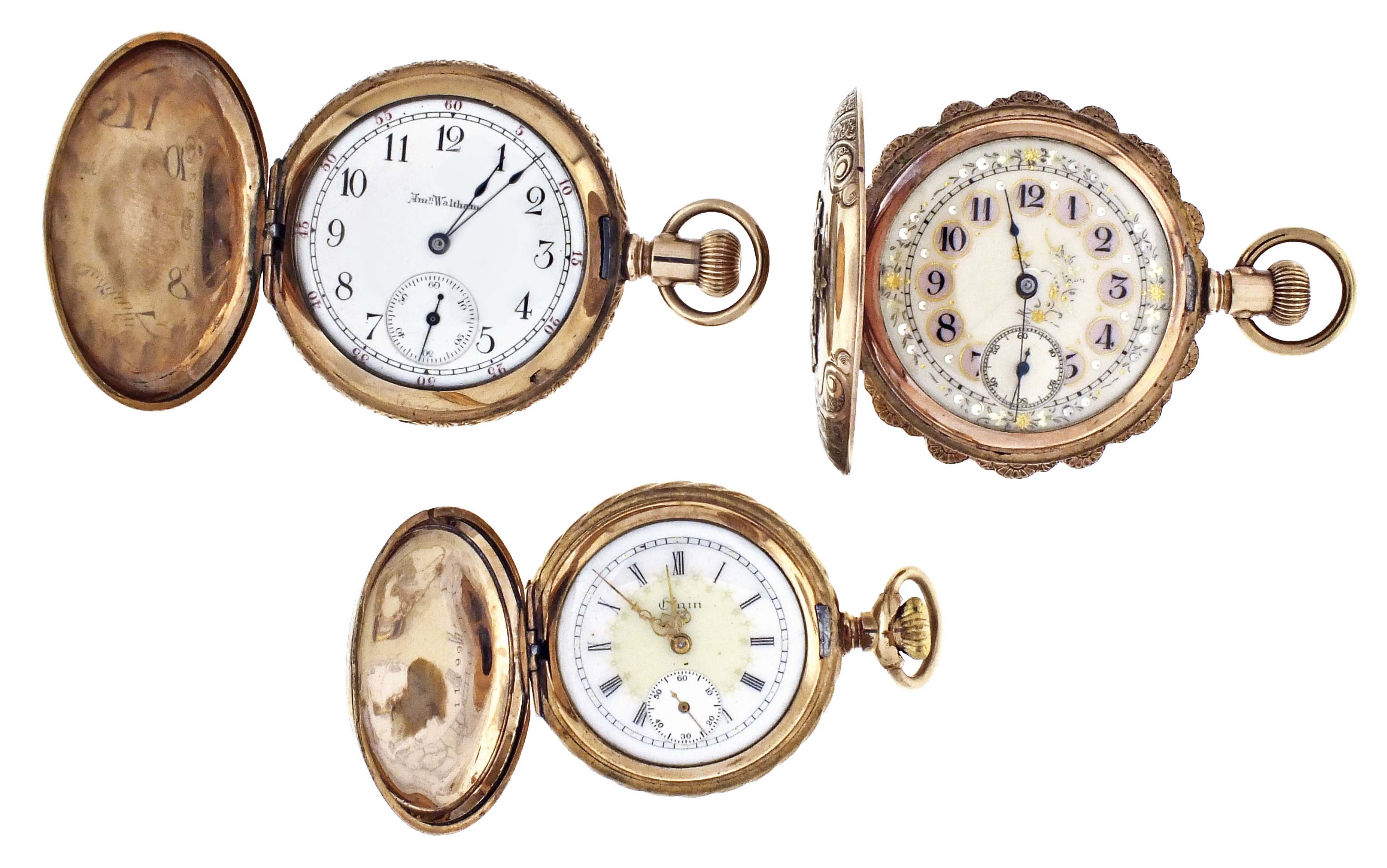 3 (Three) American pocket watches, all with boxes, including Elgin 6 size, model 2, grade 117, 7 jewel movement with multicolor O'Hara style dial in gold filled hunting case, serial #6277962, a Waltham 6 size, model 1890, "Riverside" 17 jewel damascened movement in gold filled hunting case, serial #6031539, and an Elgin 0 size, model 2, grade 354,in gold filled hunting case, serial #15869171