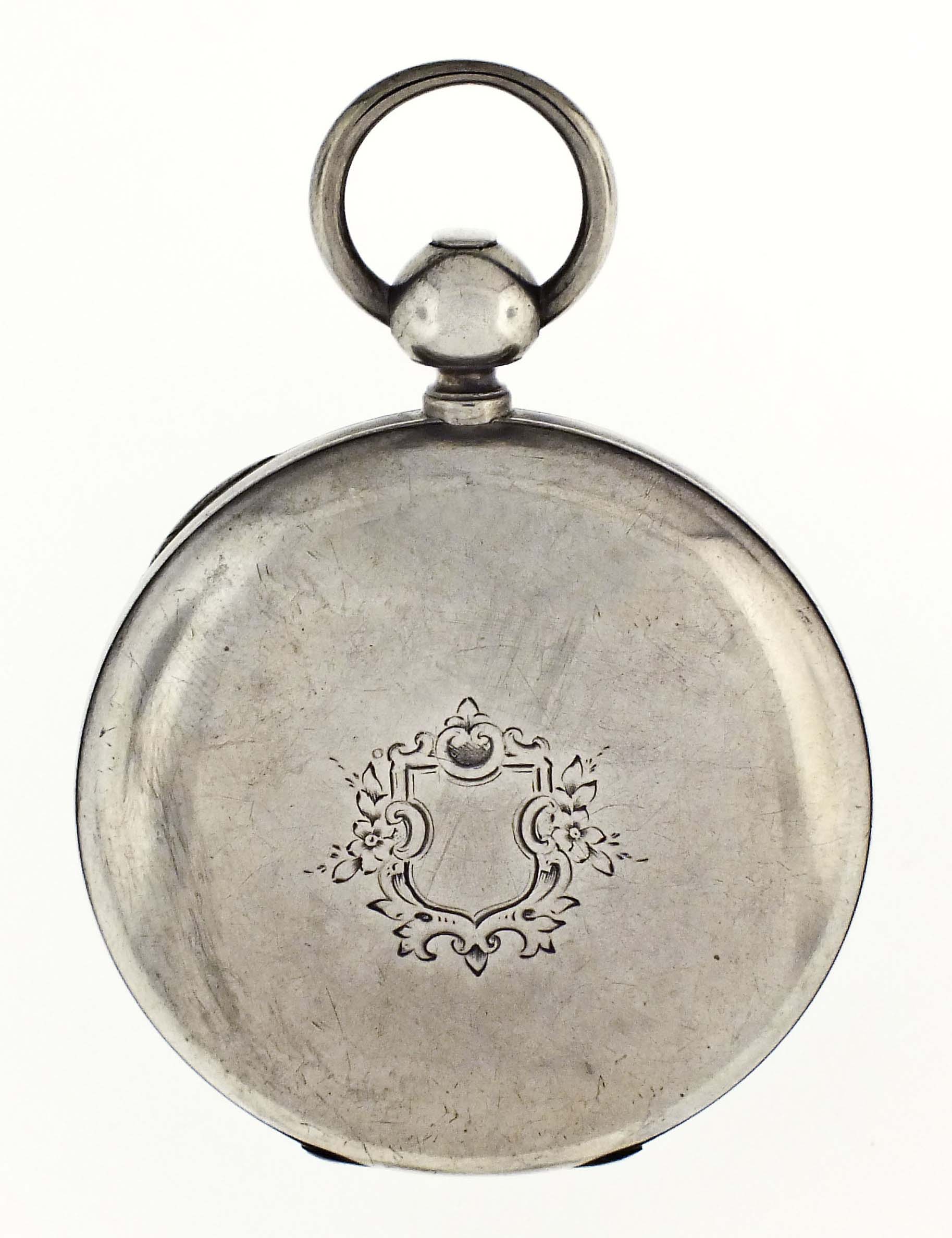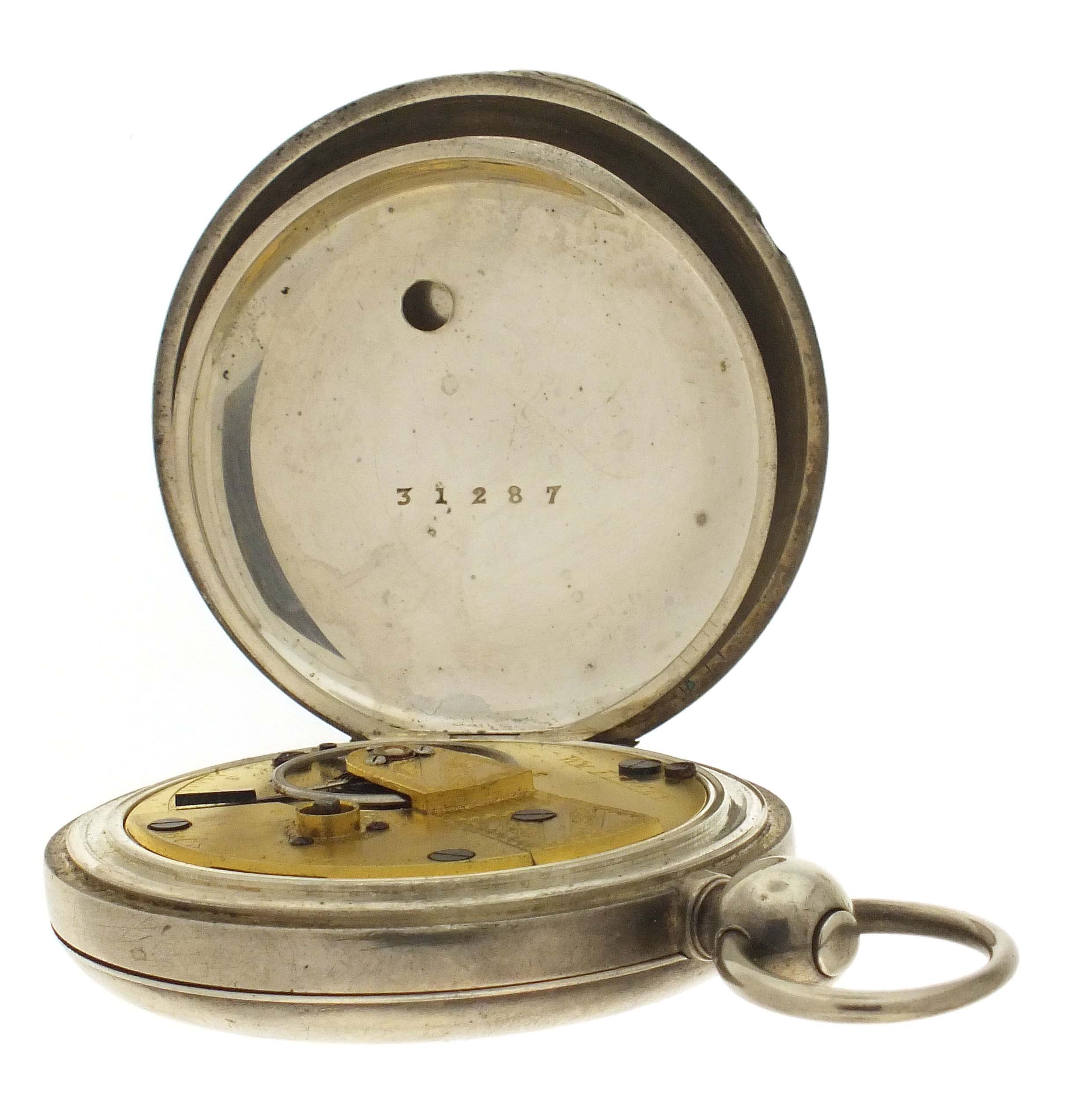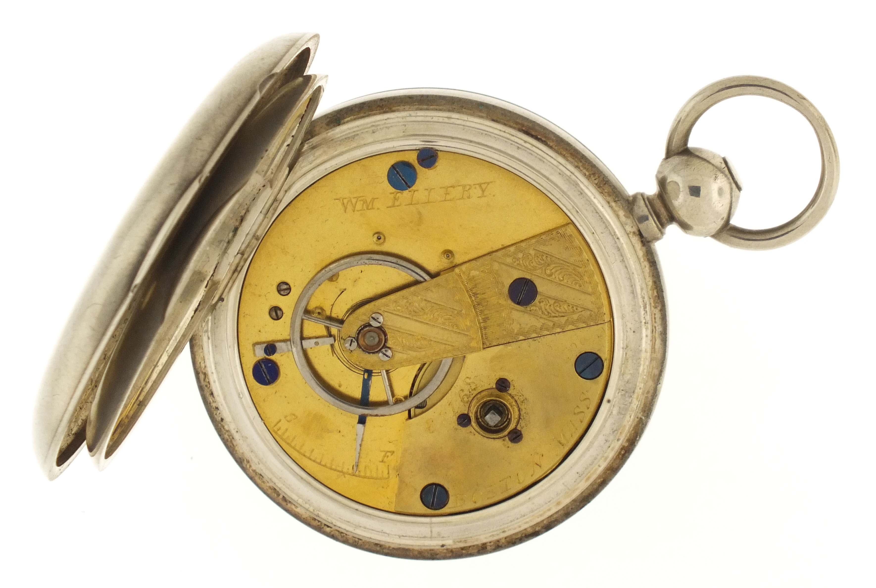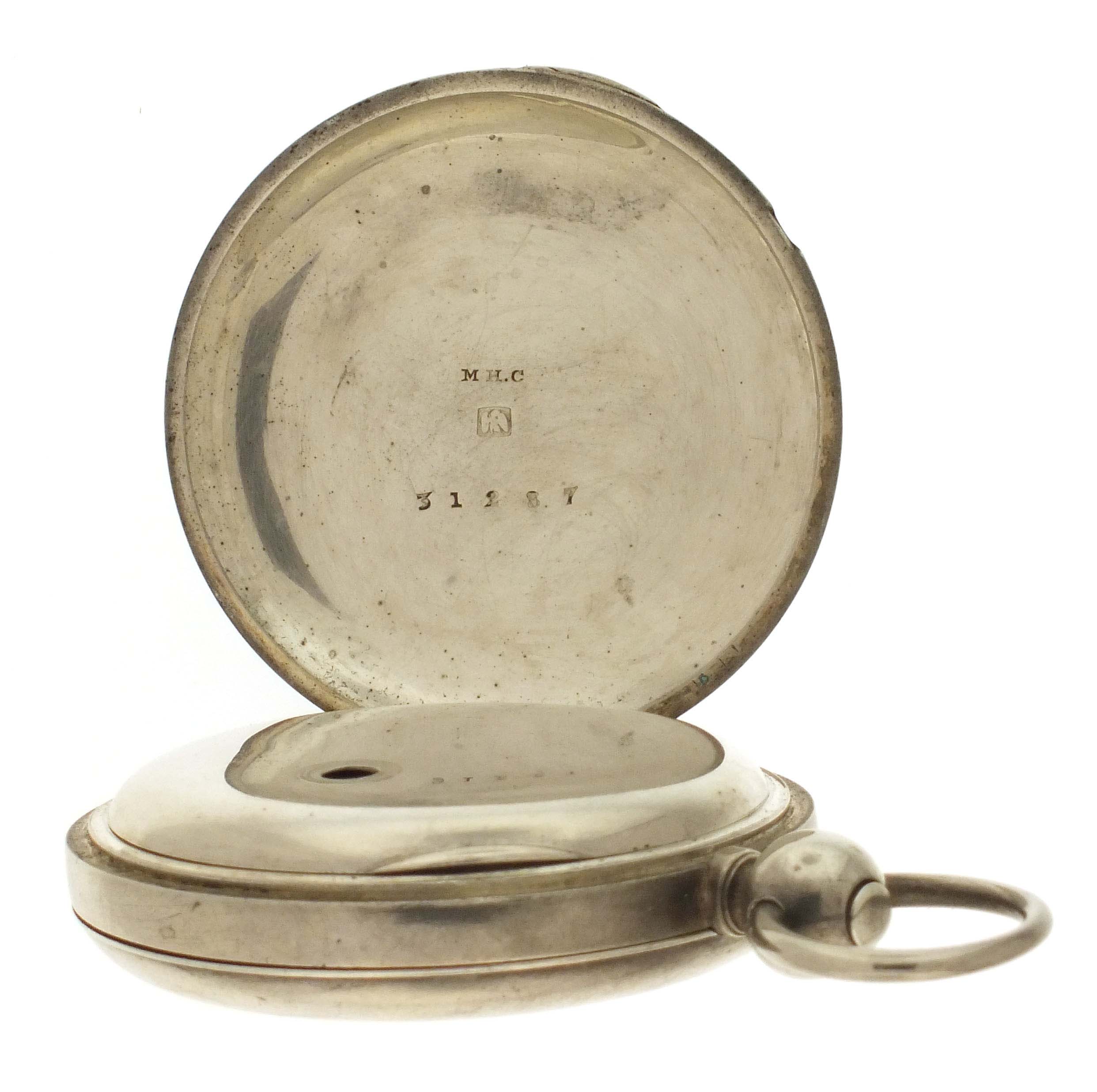 American Waltham Watch Co., Waltham, Mass., a Civil War era "Wm. Ellery" pocket watch, 18 size, 7 jewels, key wind and set gilt plate movement with lever escapement, polished steel balance and diamond endstone in a silver hunting case with engraved cartouche on front cover, roman numeral white enamel dial with blued steel spade hands, serial #61168