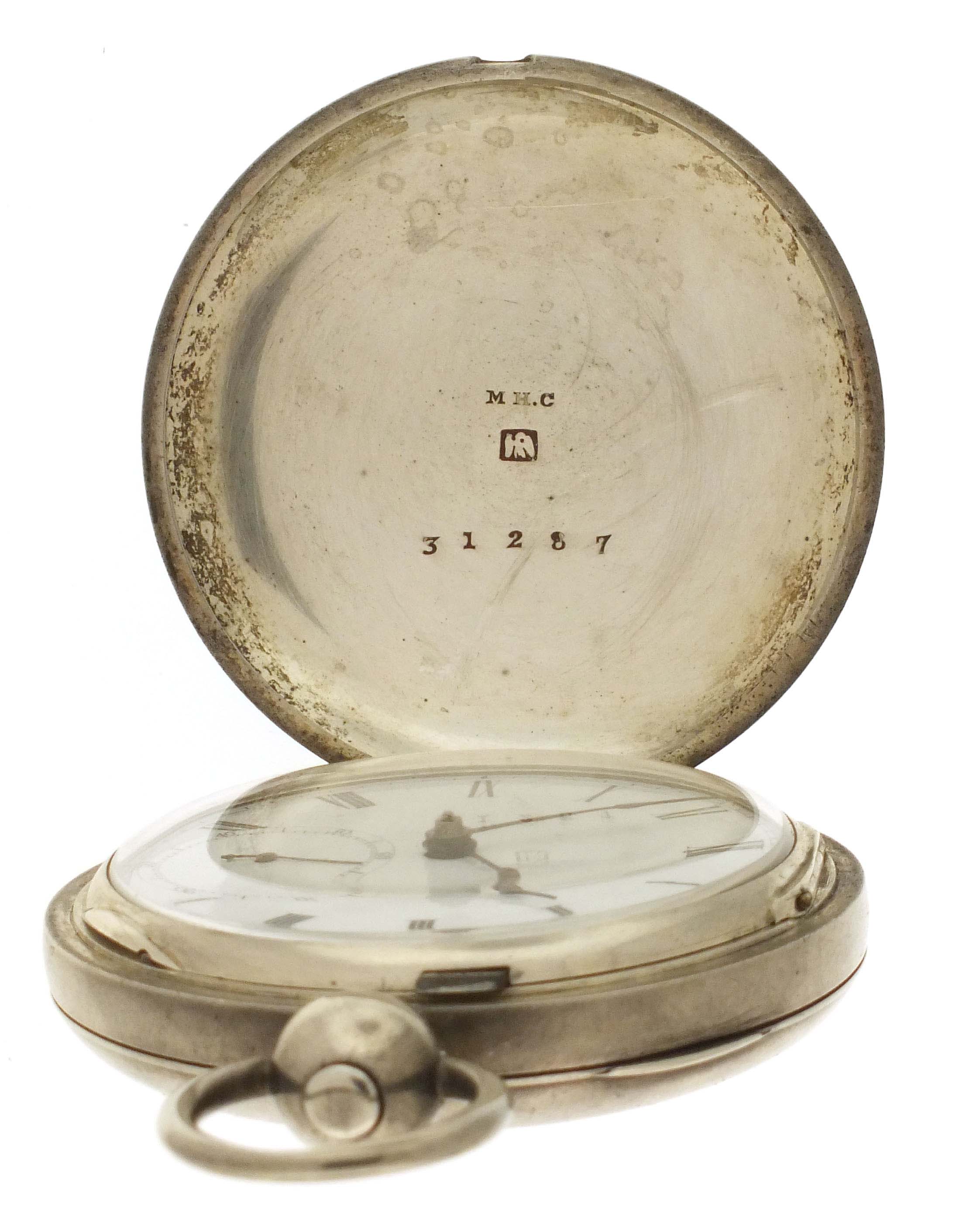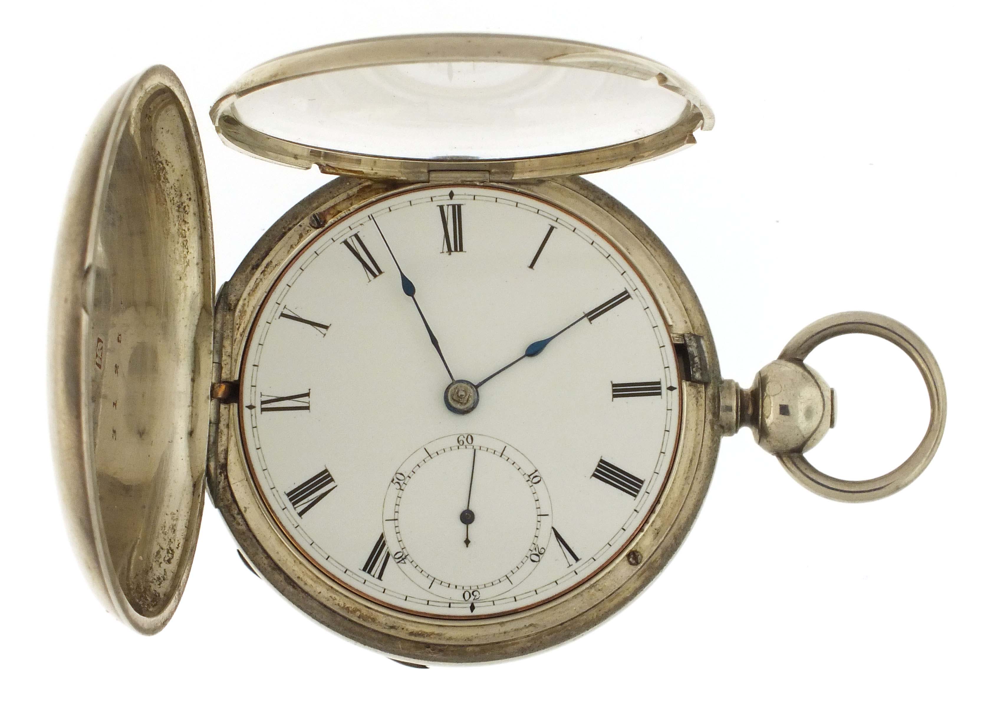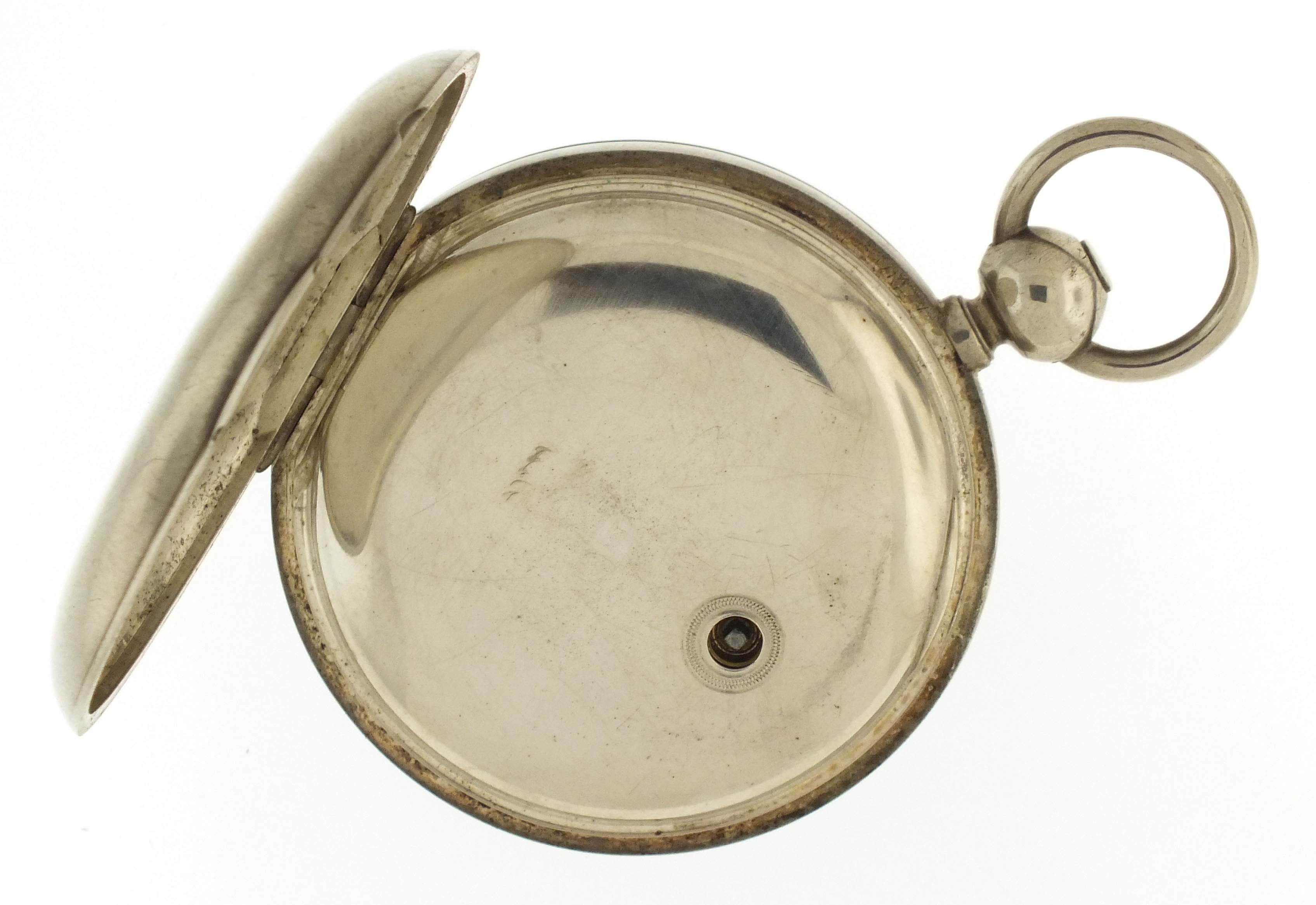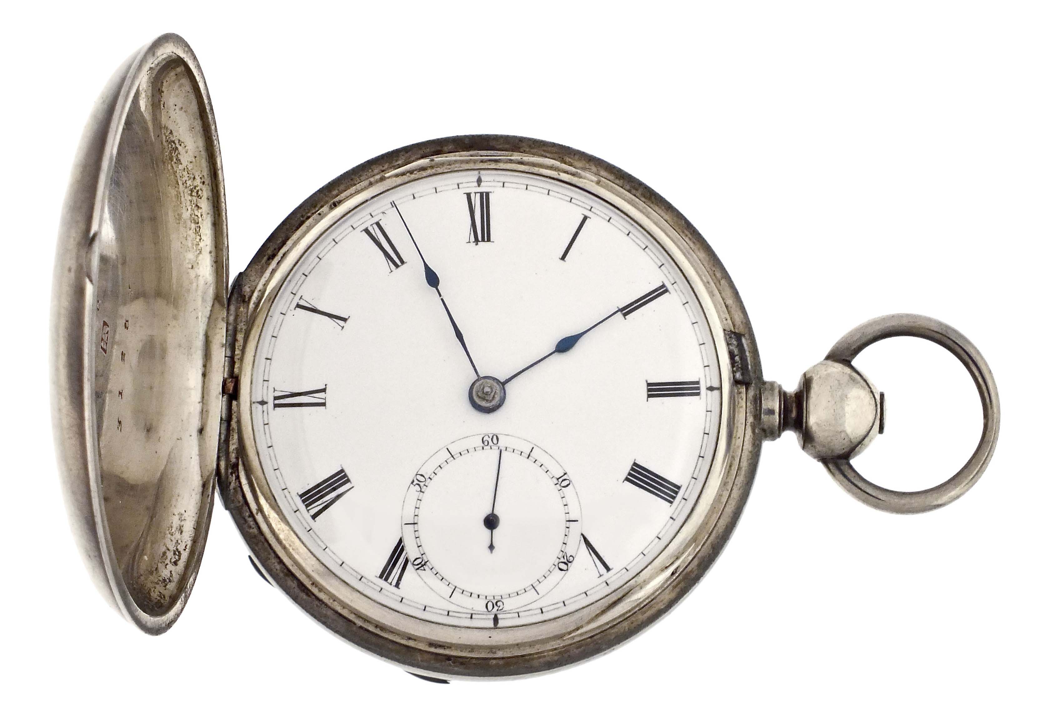 American Waltham Watch Co., Waltham, Mass., a Civil War era "Wm. Ellery" pocket watch, 18 size, 7 jewels, key wind and set gilt plate movement with lever escapement, polished steel balance and diamond endstone in a silver hunting case with engraved cartouche on front cover, roman numeral white enamel dial with blued steel spade hands, serial #61168