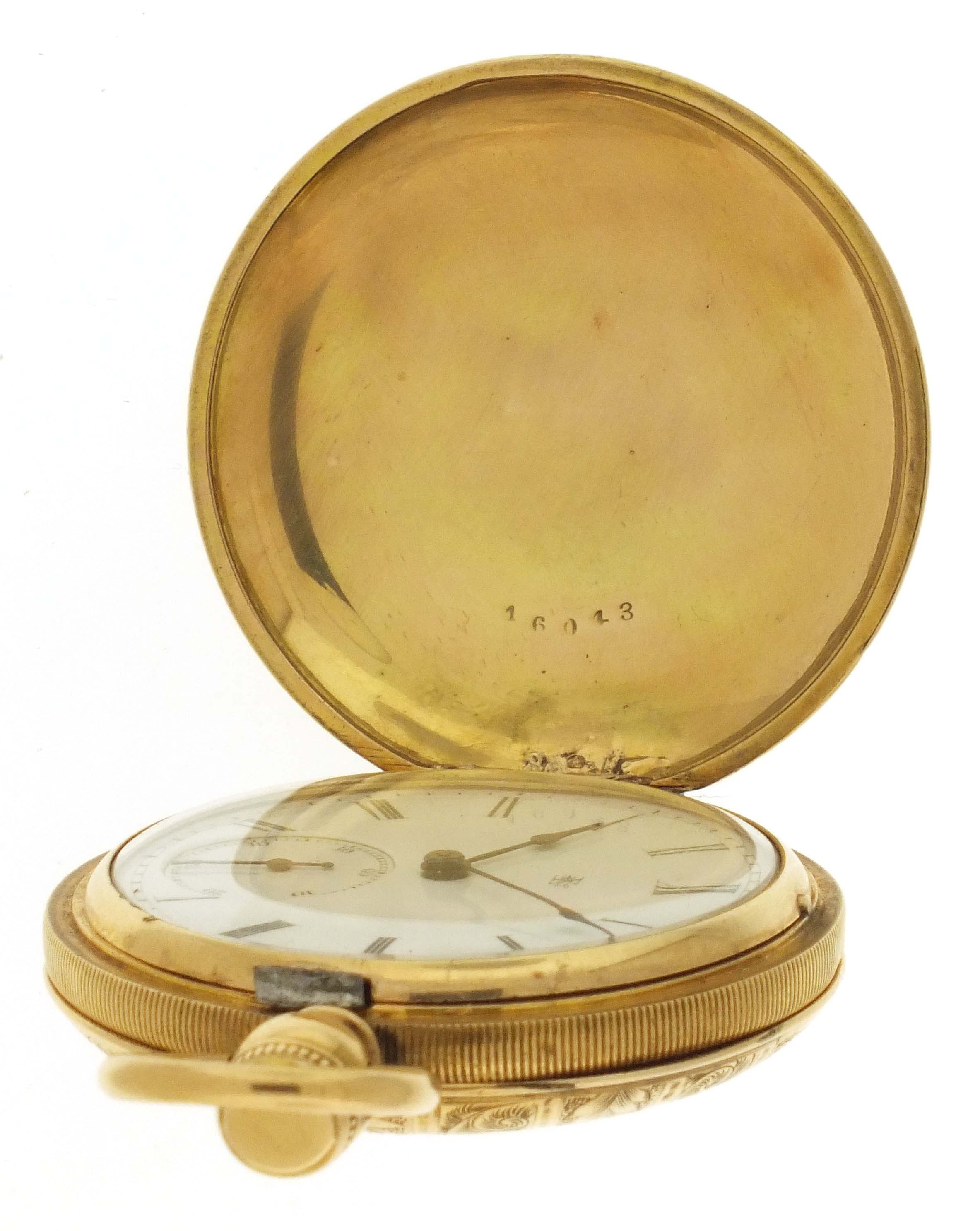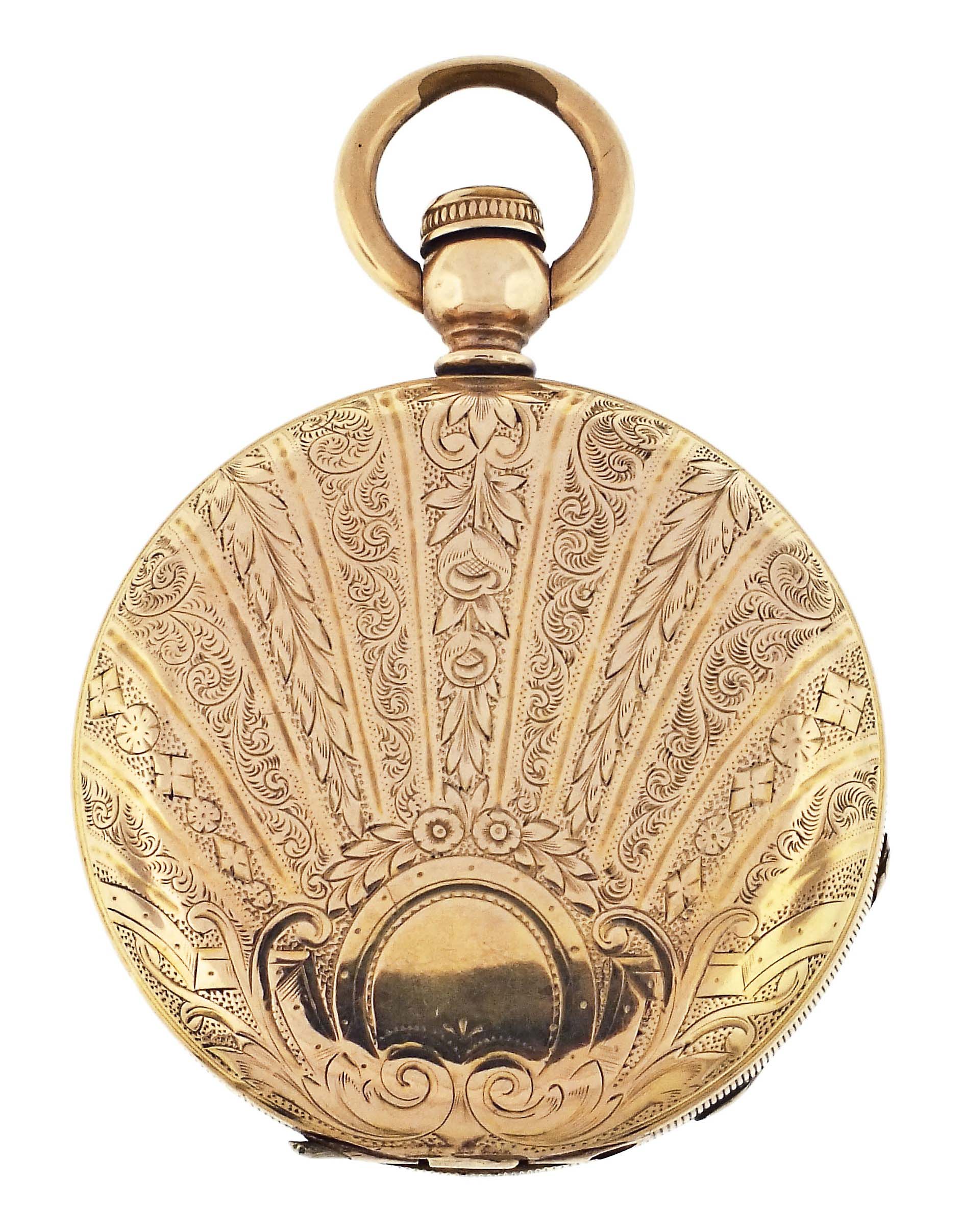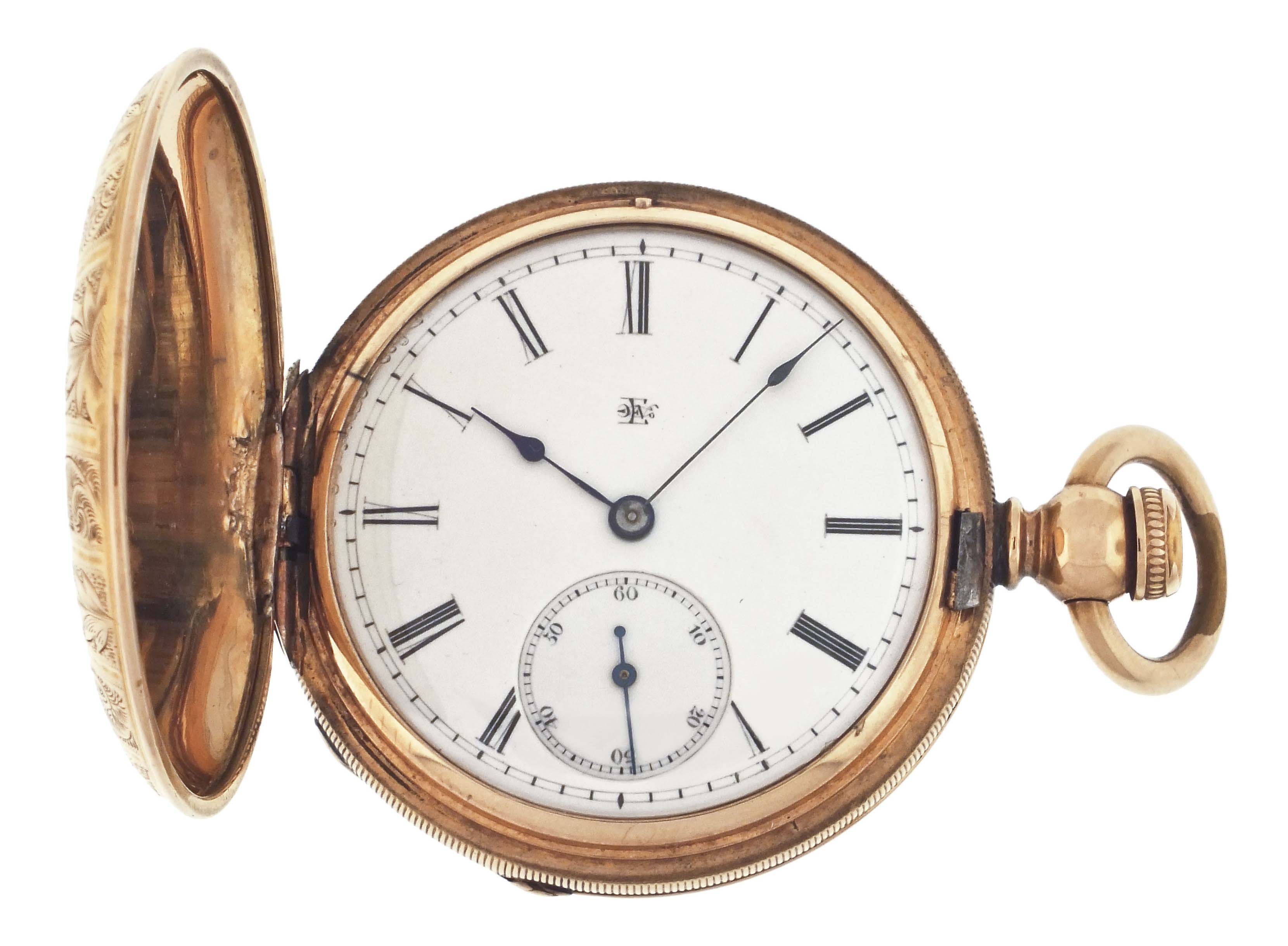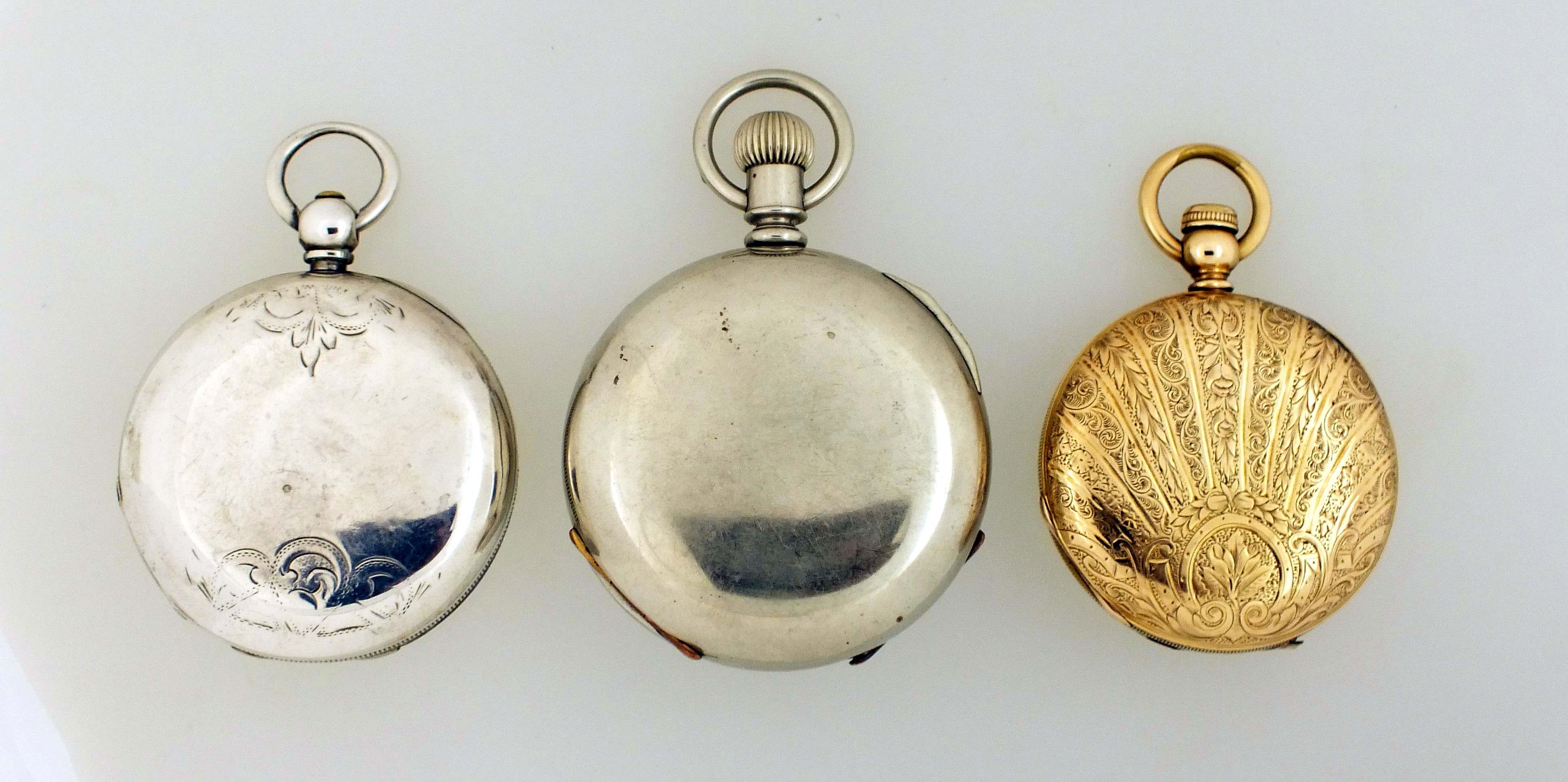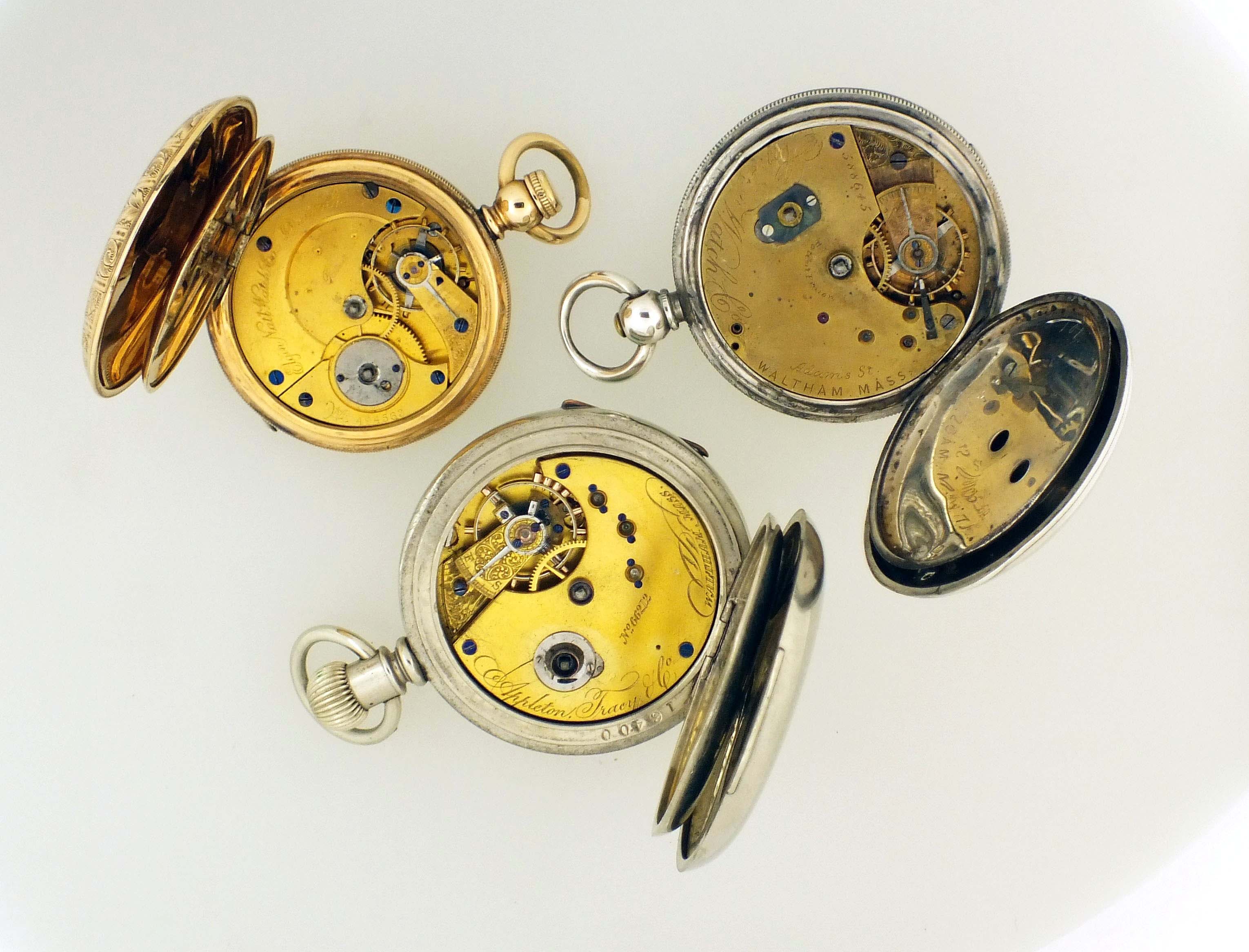 3 (Three) American pocket watches, roman numeral enamel dials, key wind gilt movements, hunting case, including a Waltham 16 size, model 1860, "A.T.& Co.", 15 jewel,silveroid case,serial #66212, a Waltham 14 size, model 1870, "Adams St."11 jewel, coin silver case, serial #588645, and an Elgin 10 size, model 4, "Dexter St.", 7 jewel, gold filled case, serial #494563