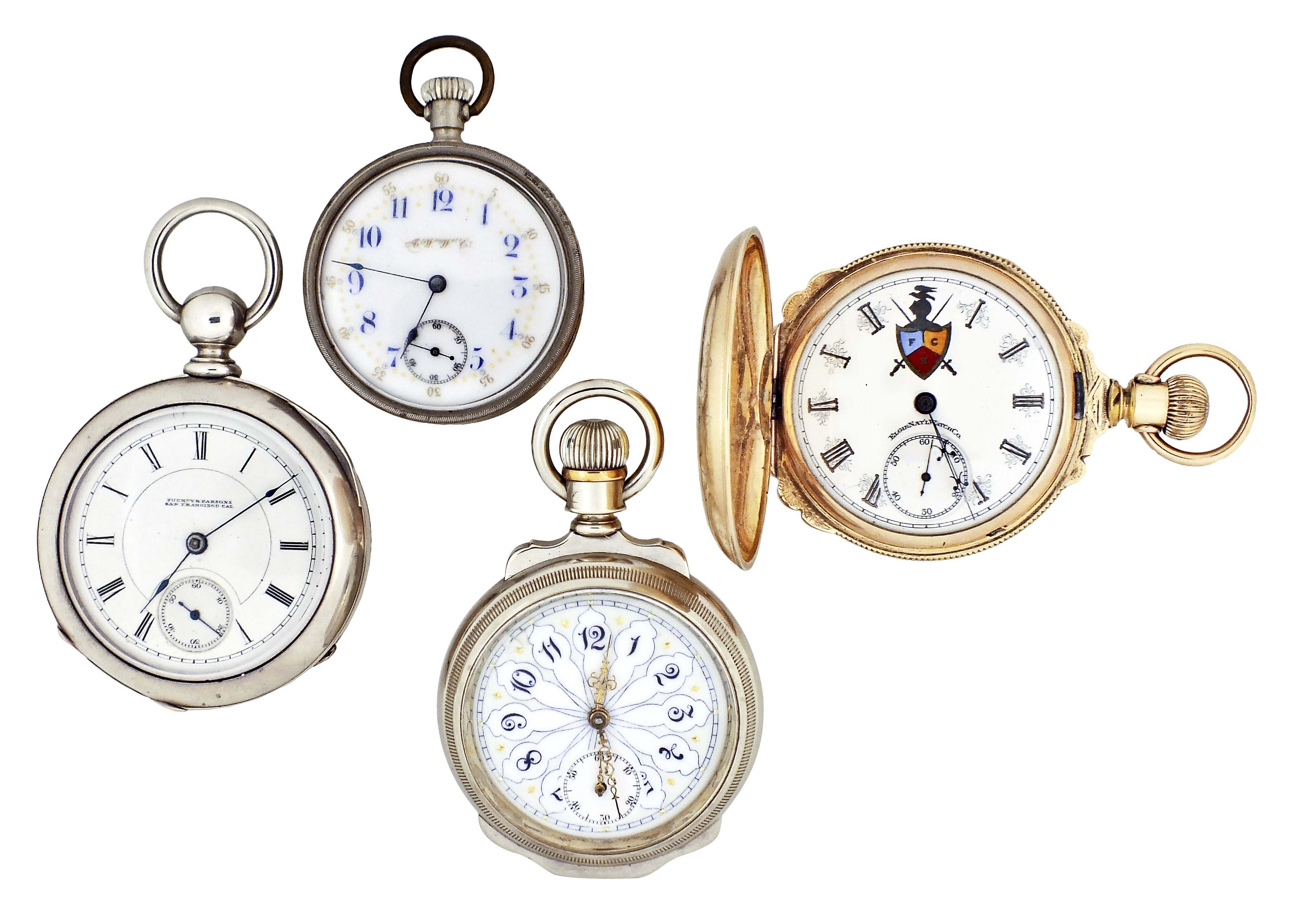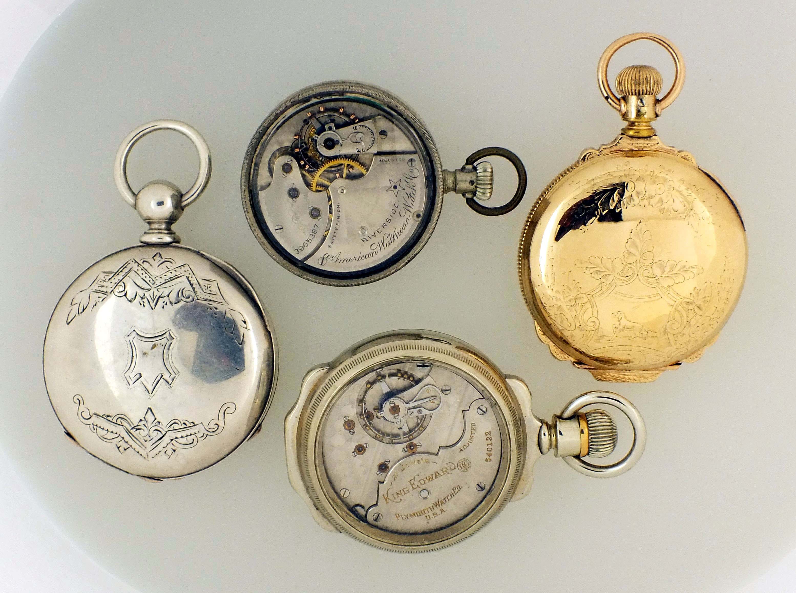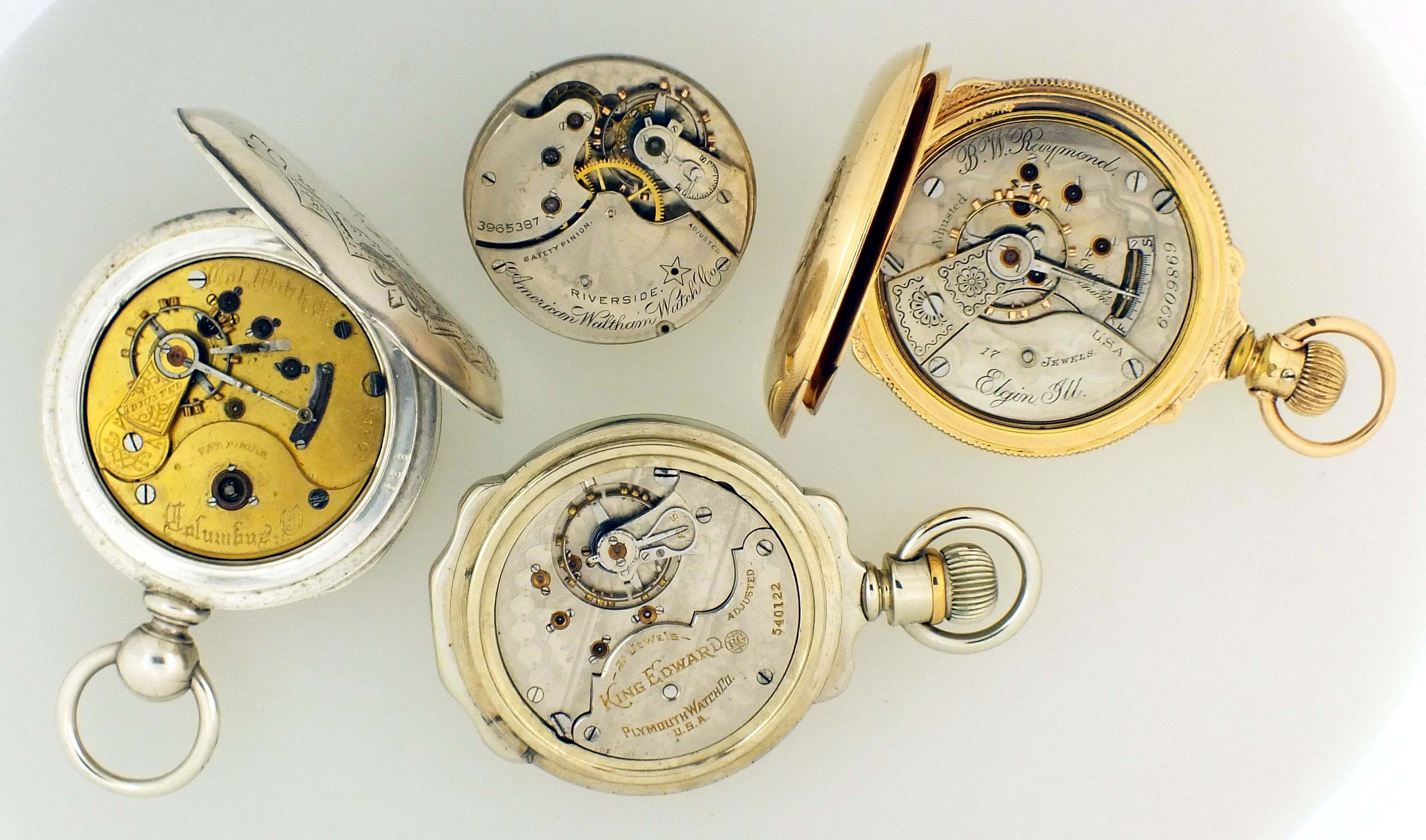 3 (Three) American pocket watches and one movement, 18 size, arabic and roman numeral dial, one O'Hara style, stem and keywind, including Elgin model 2. grade 27, "B.H. Raymond" 17 jewel damascened nickel movement, gold filled hunting case, serial #6986069, a Columbus, model 1,11 jewel gilt movement, coin silver hunting case, serial #21601, a Rockford model 9, grade 910, "King Edward", 21 jewel damascened nickel movement in open face display case, serial #540122, and a Waltham,14 size, model 1884, "Riverside", 15 jewel nickel movement in nickel open face display case serial #3965387