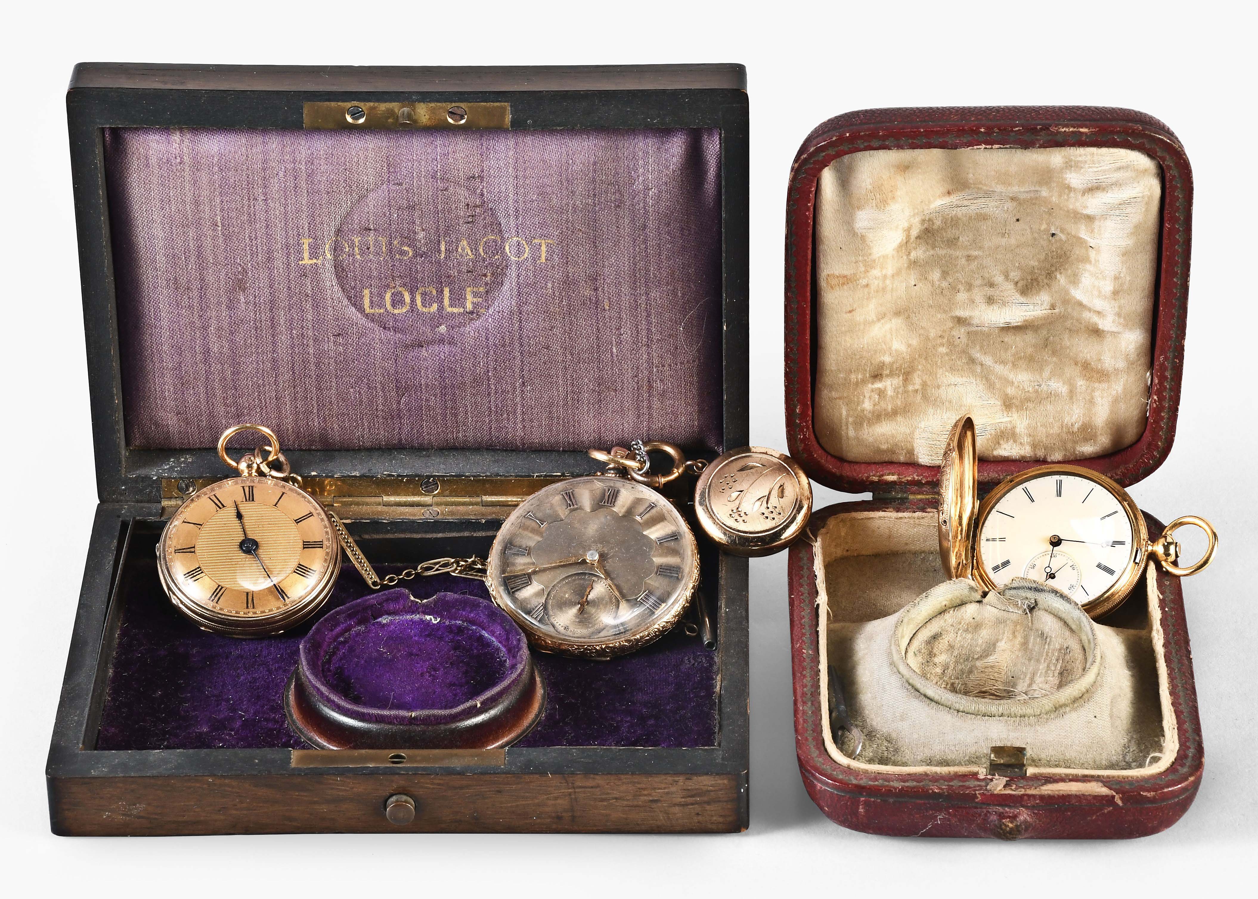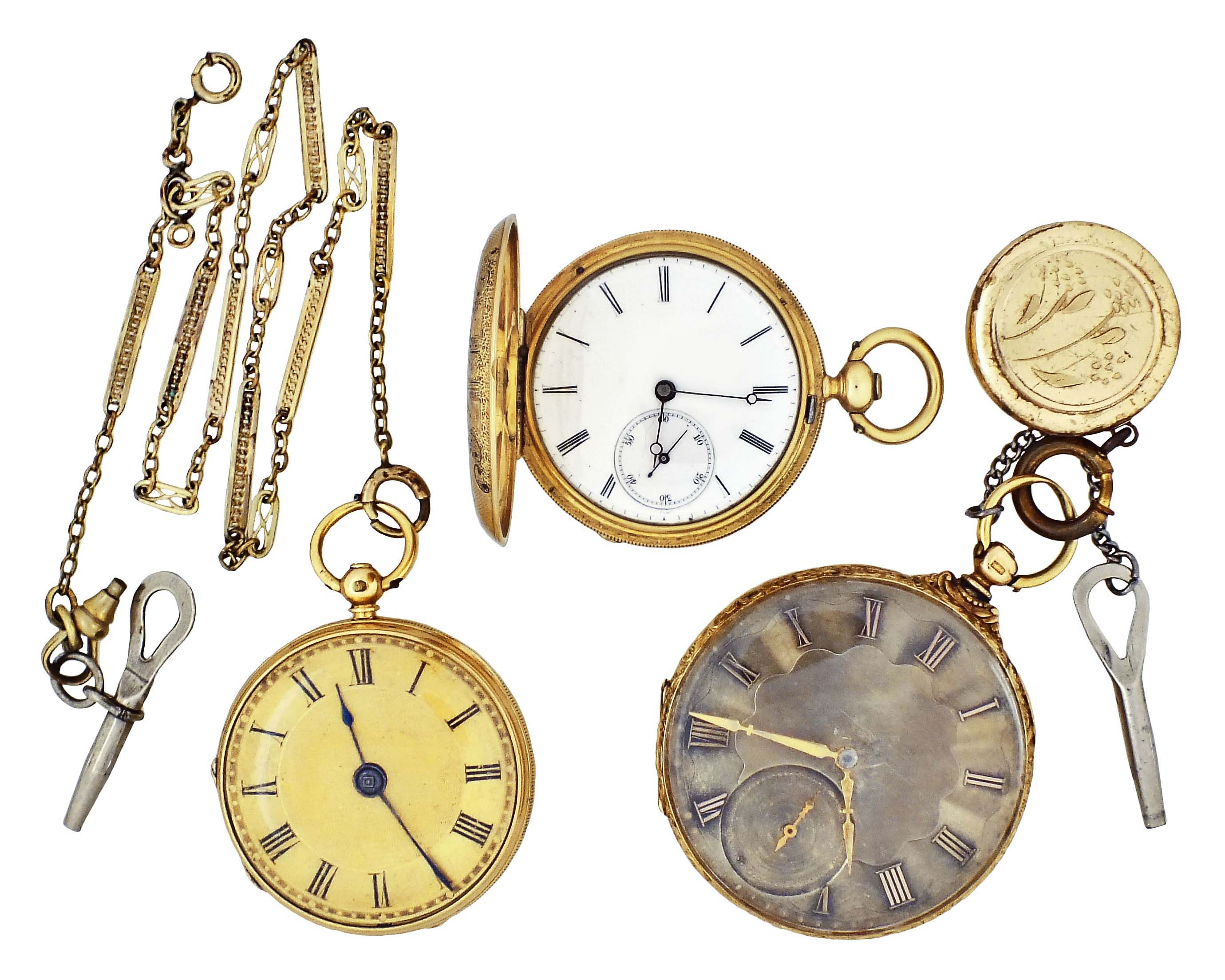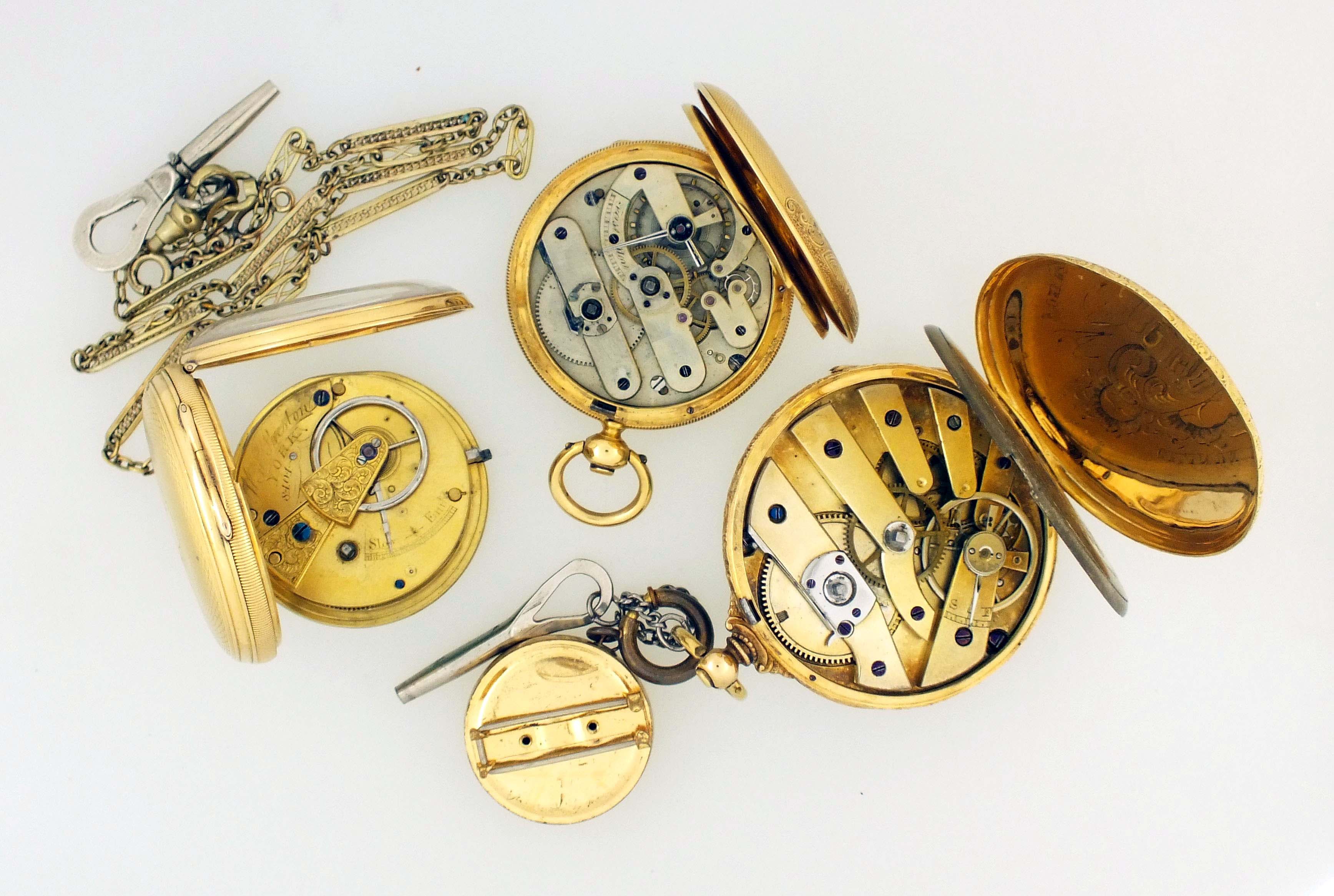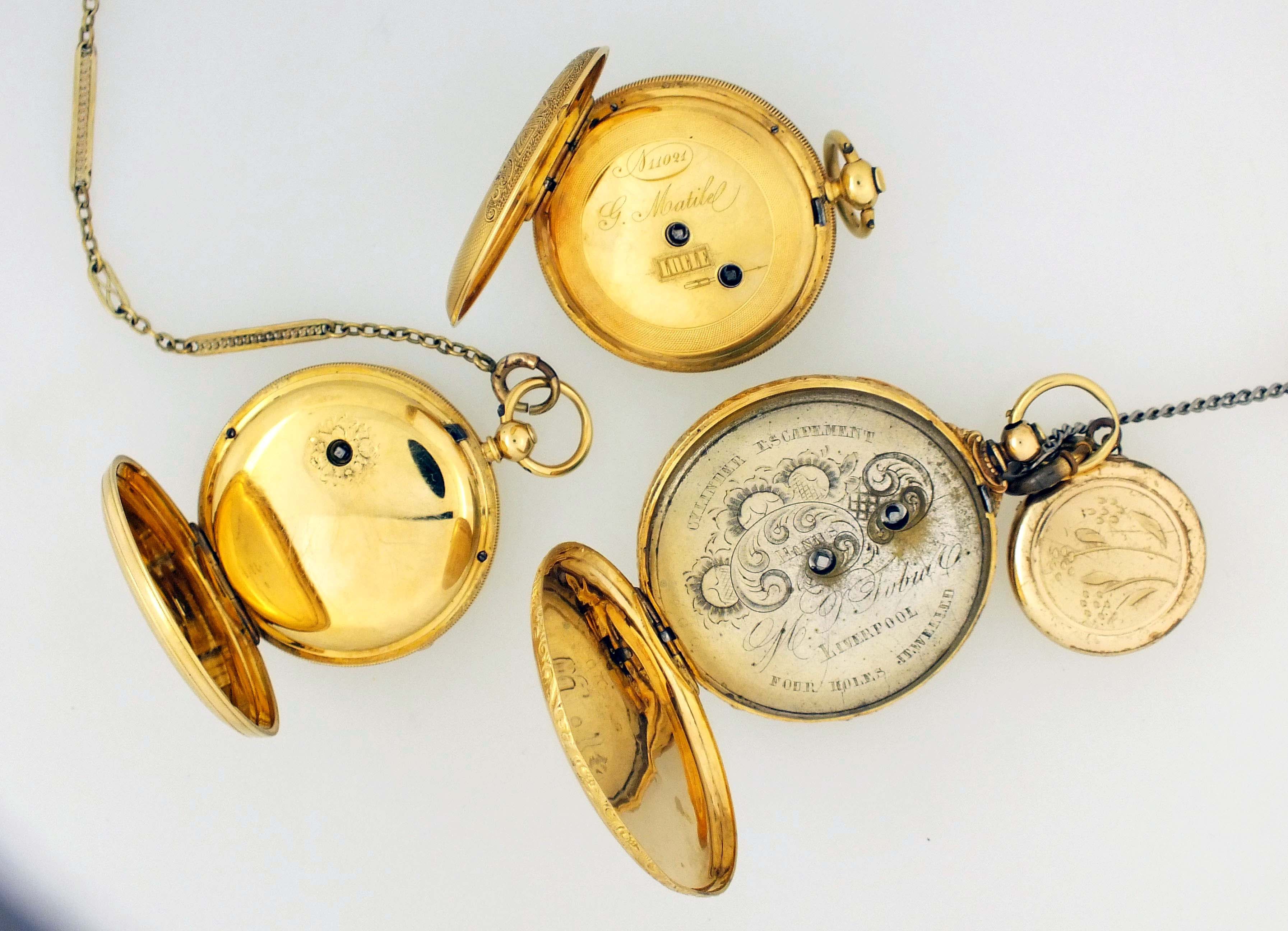 3 (Three) European lady's gold pocket watches including the first a G. Matile, Locle, Switzerland 18K gold hunting case with enamel highlights and key wound movement and roman numeral white enamel dial, 35mm, serial #11021, 37.2g TW in an associated box, the second a Hen. Preston, York in a heavy English hallmared 18K yellow gold open face case with gold roman numeral dial and key wound movement, serial #8404, 38mm, 45.8g TW not including chain, with associated box and chain, the third an M.J. Tobias, Liverpool with Swiss bar movement in a light gold open face case with engraved eagle on rear cover (probably 16 - 18K) with key wound movement, 50g TW not including fob, 44mm with associated fob