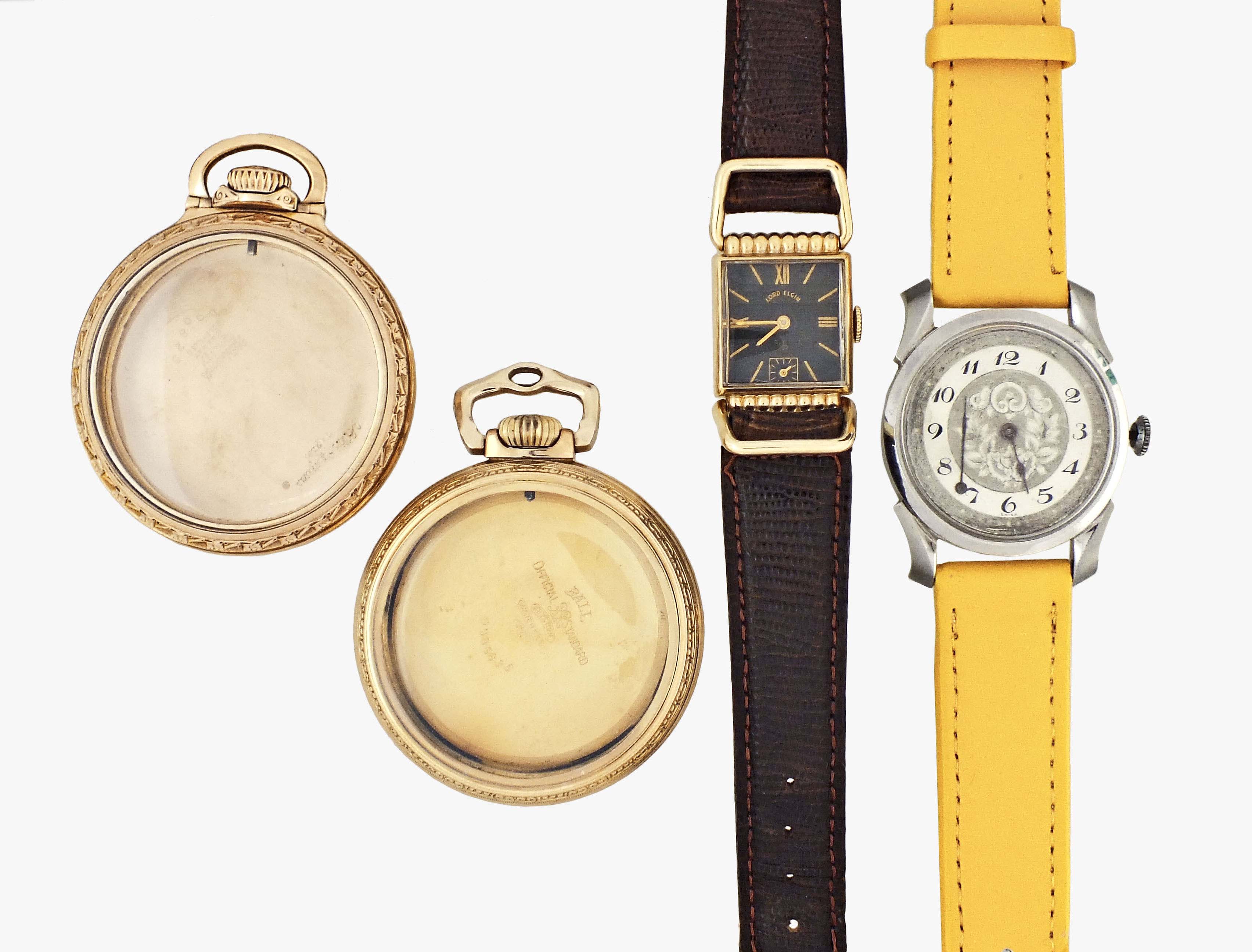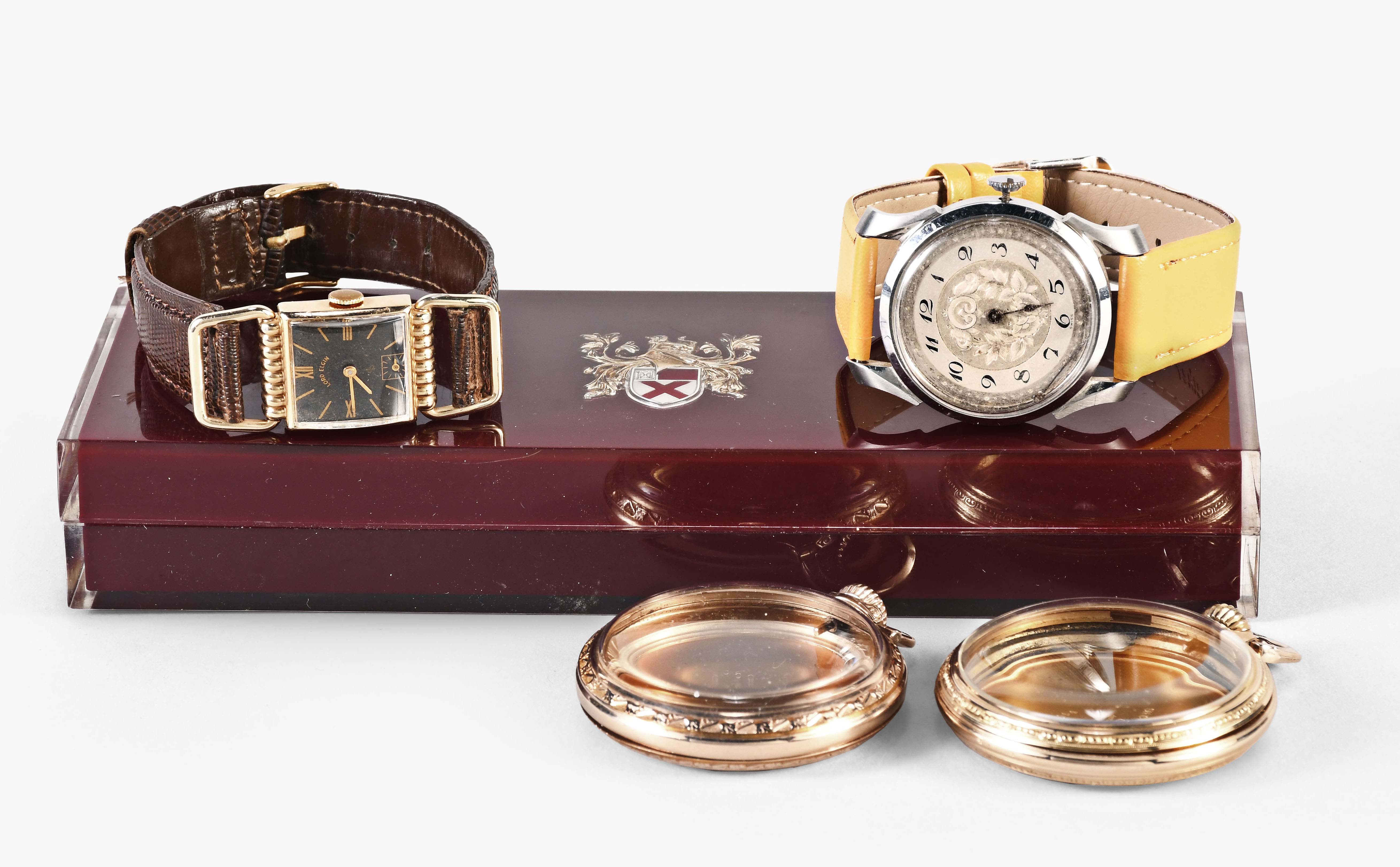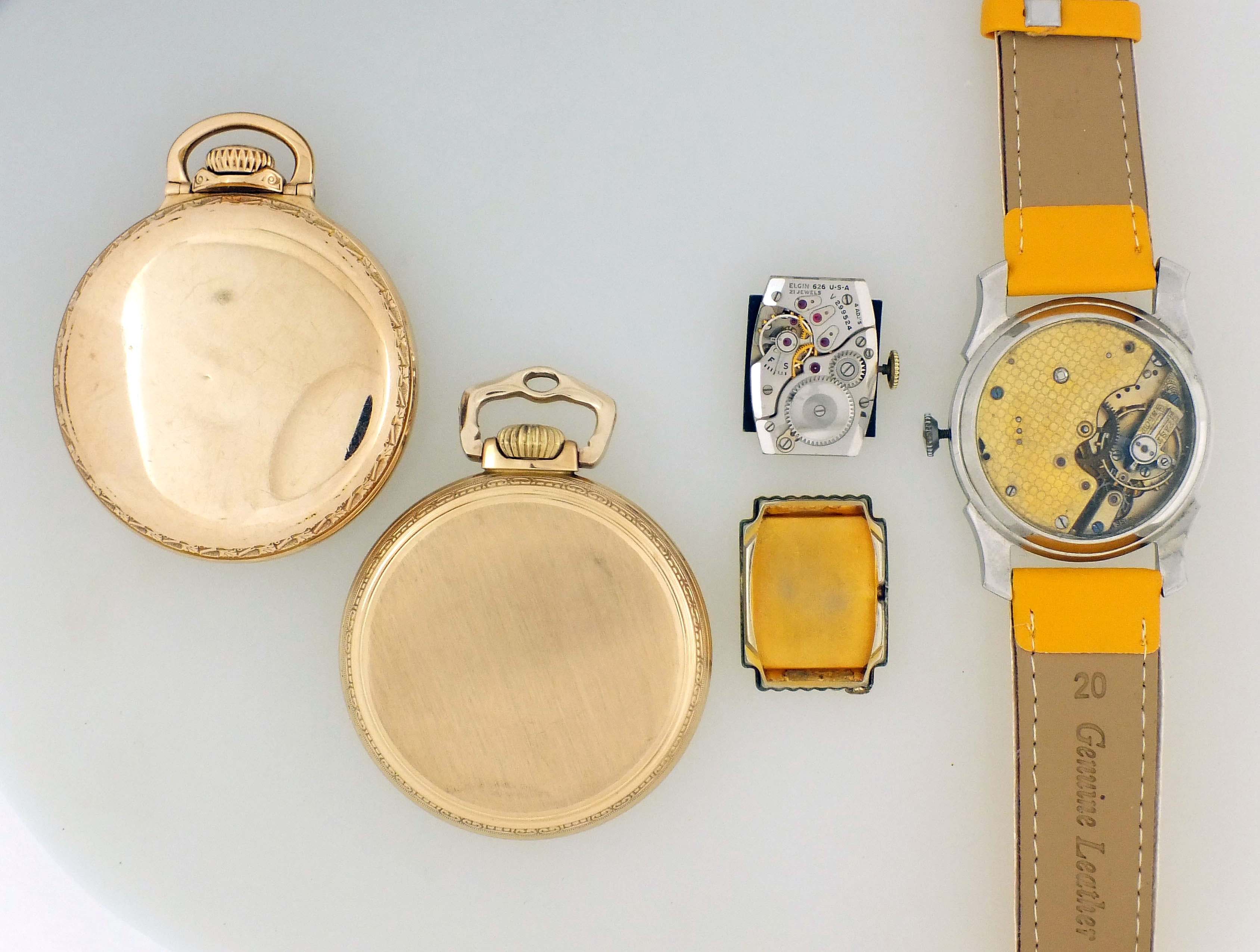 2 (Two) manual winding wrist watches including an Elgin Lord Elgin, grade 626, 21 jewel in a yellow gold filled case with Lord Elgin box, serial #V299524 and a generic Swiss in a nickel plated case together with two yellow gold filled open face cases for American railroad grade watches, one by Wadsworth marked for B.W. Raymond and the other by Keystone marked for Ball Official Standard