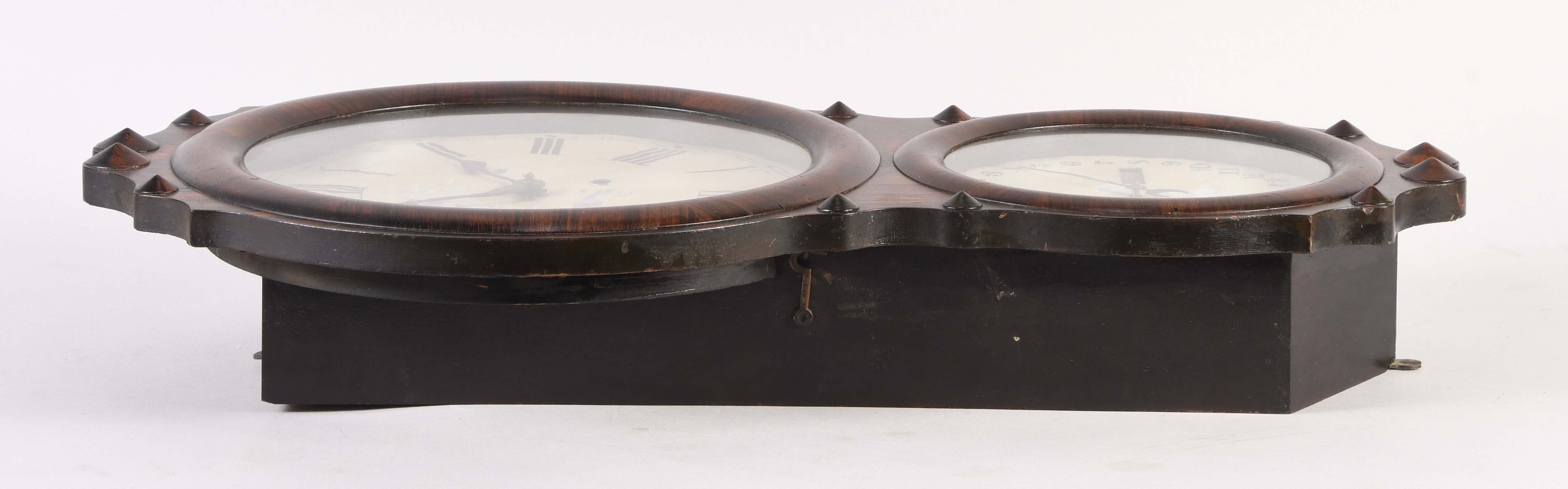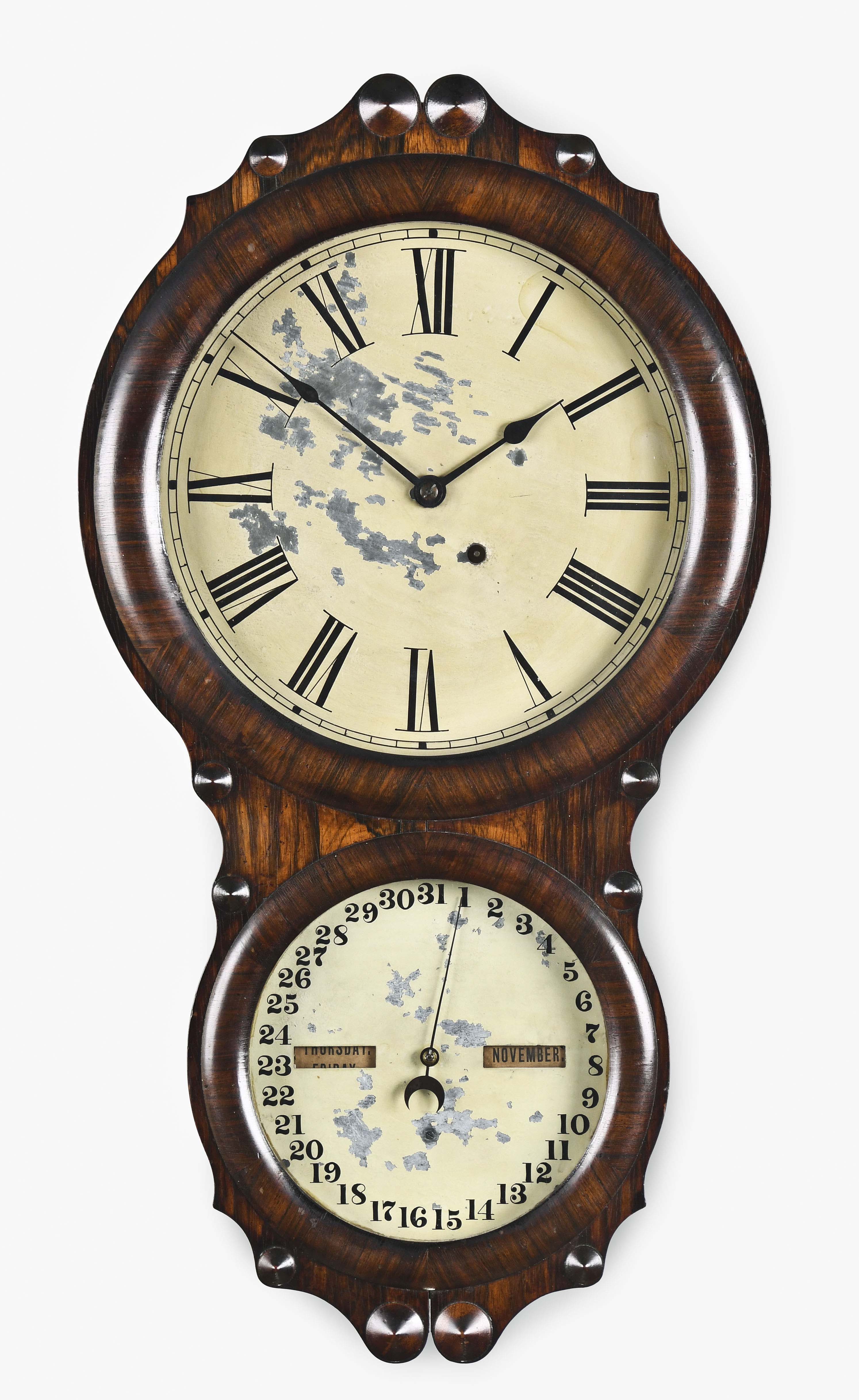 Seth Thomas Clock Co., Thomaston, Conn., "Office Calendar No. 4", double dial hanging calendar clock in a rosewood veneered case, roman numeral painted metal dial, spade hands, eight day, spring driven brass movement