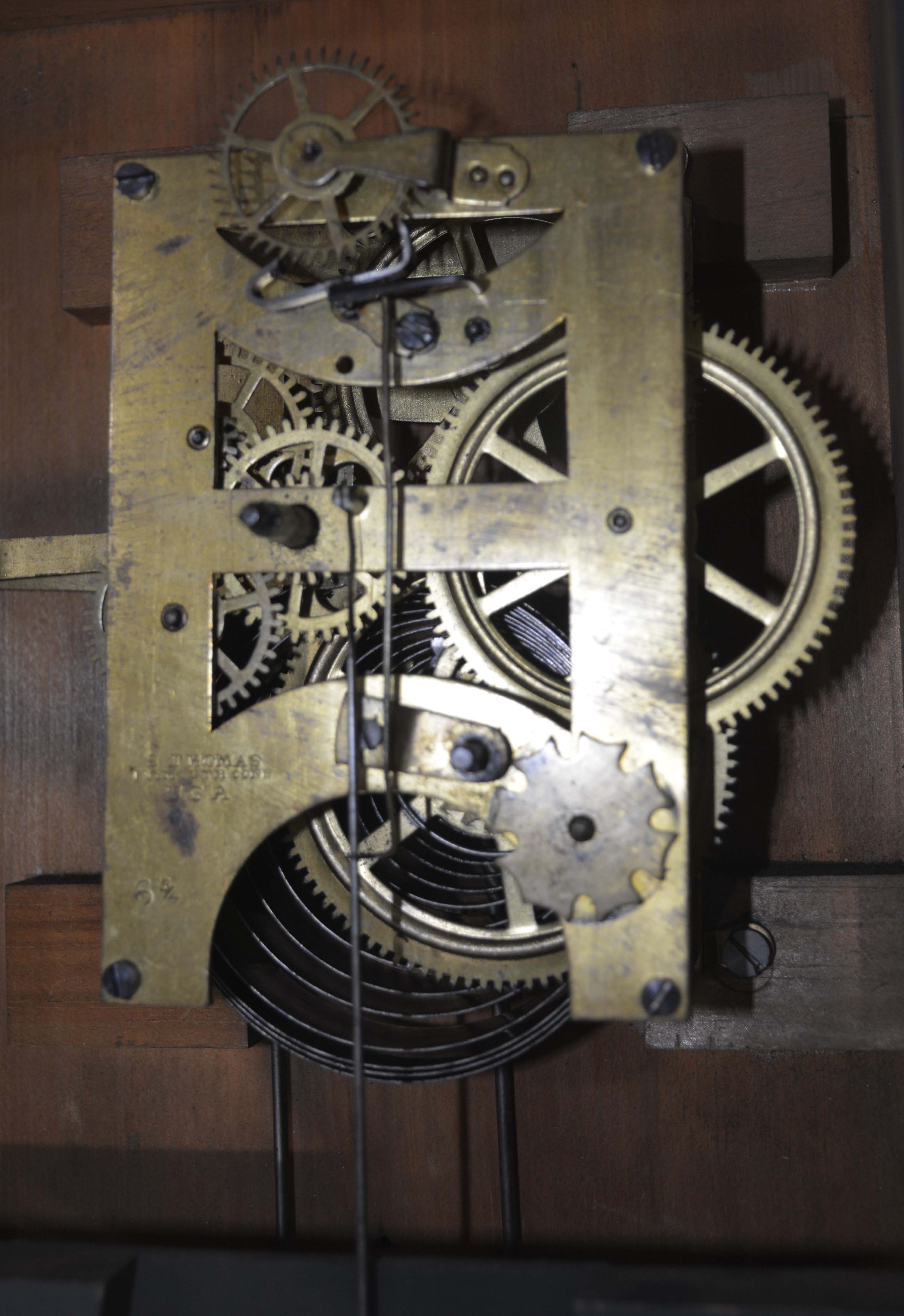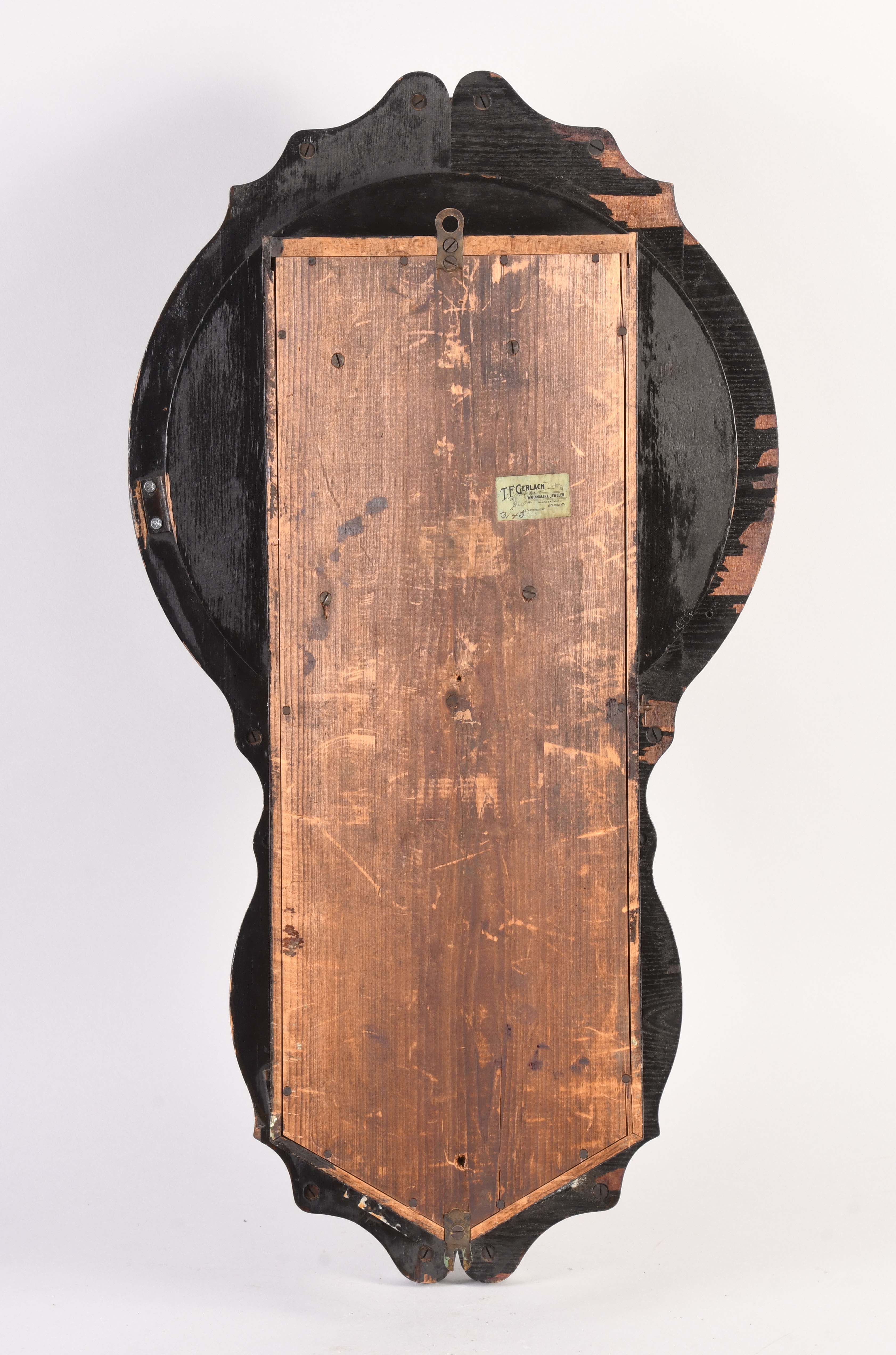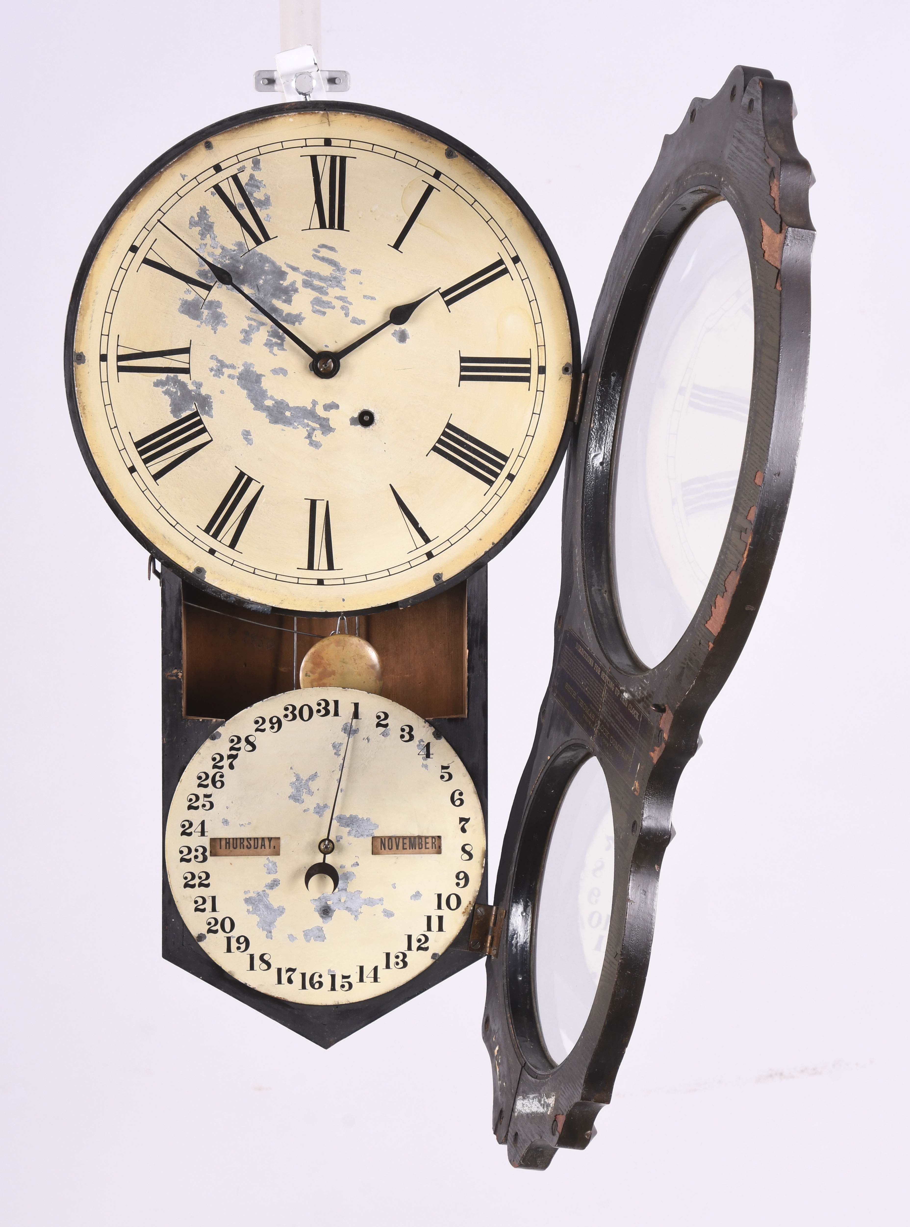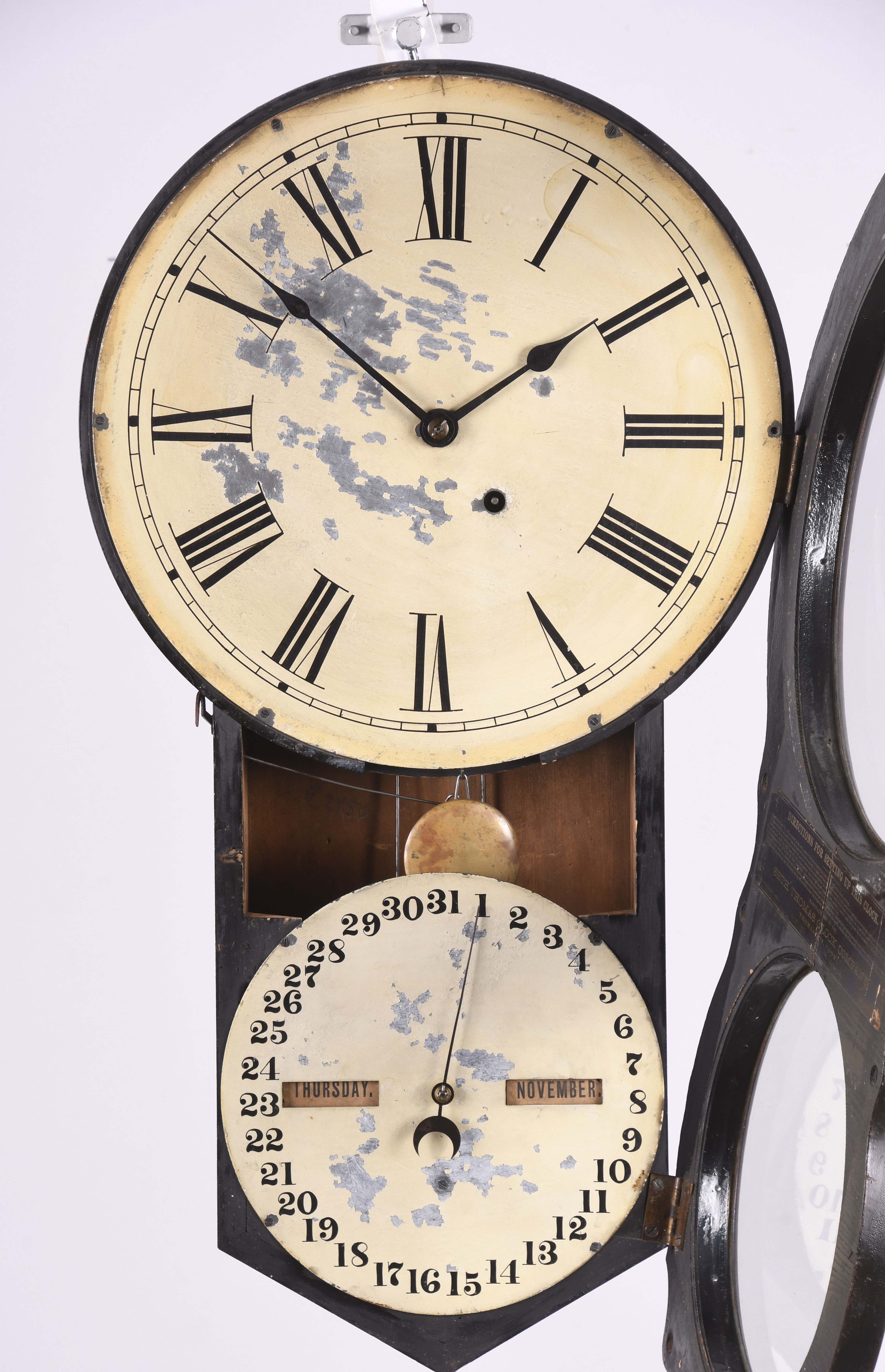 case in good condition in an old finish, both original dials have paint loss, original hands, original date rollers have age darkened, some veneer loss on the back of the door, clean label inside. This is an excellent example of this model.