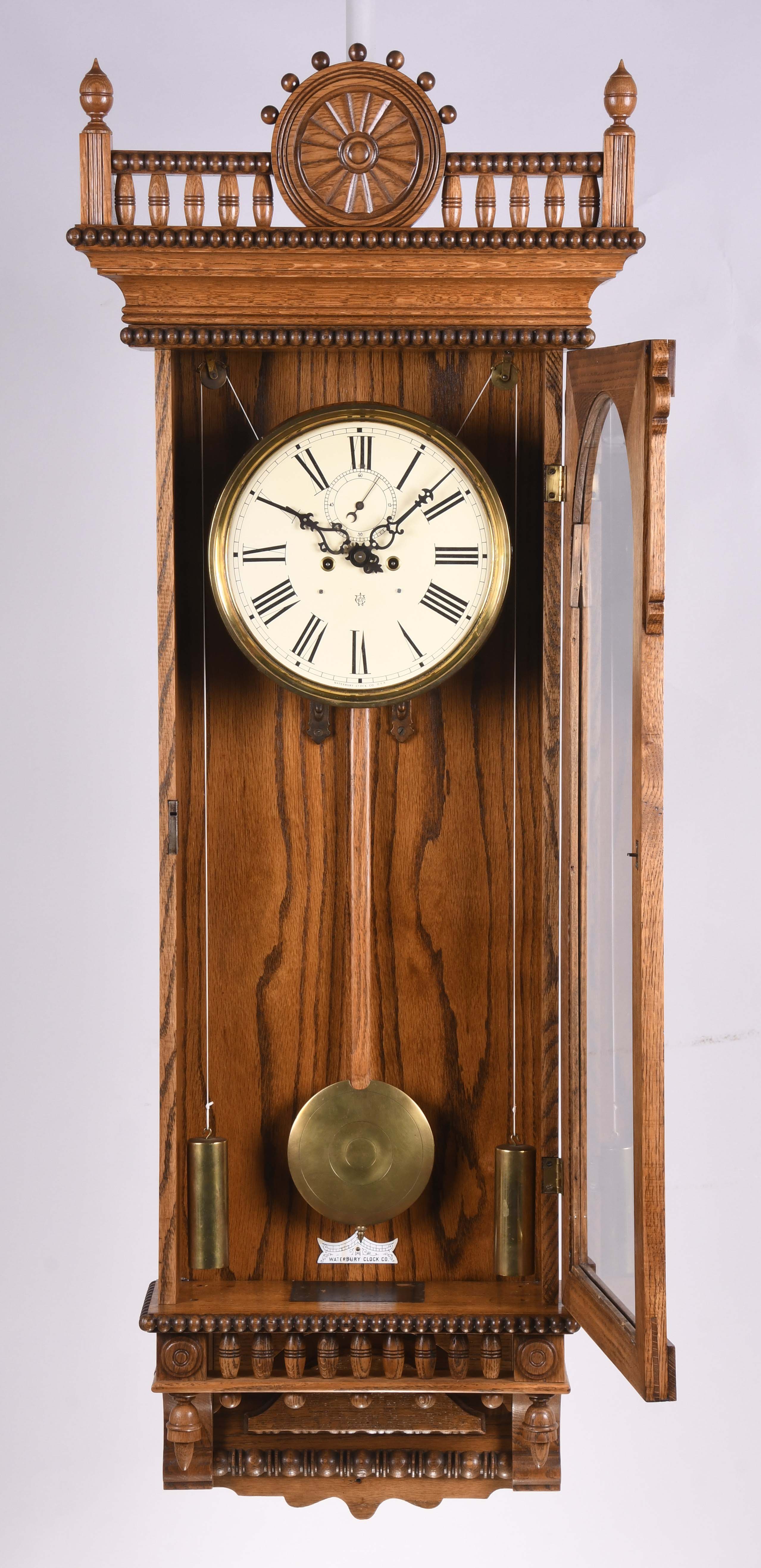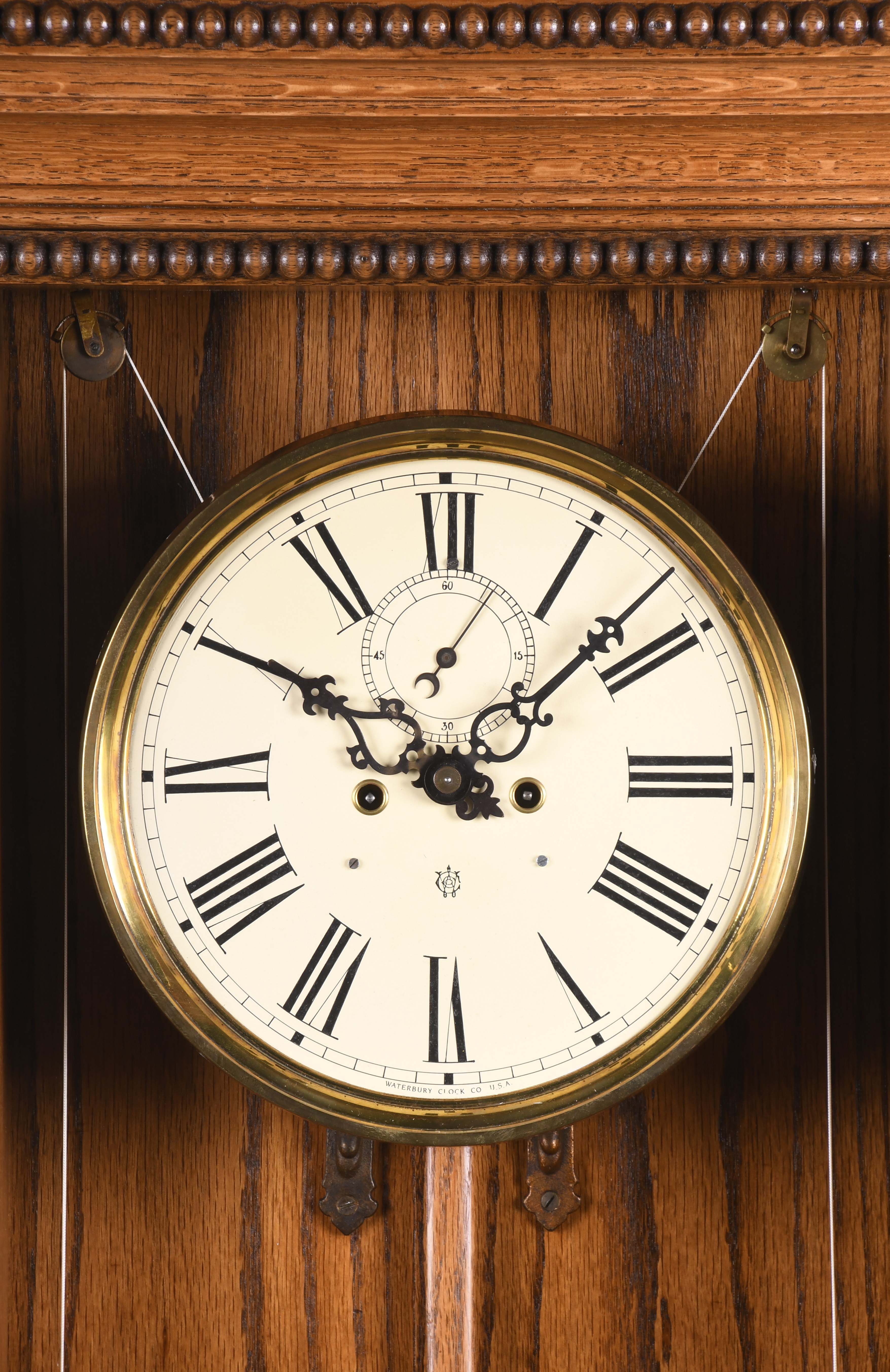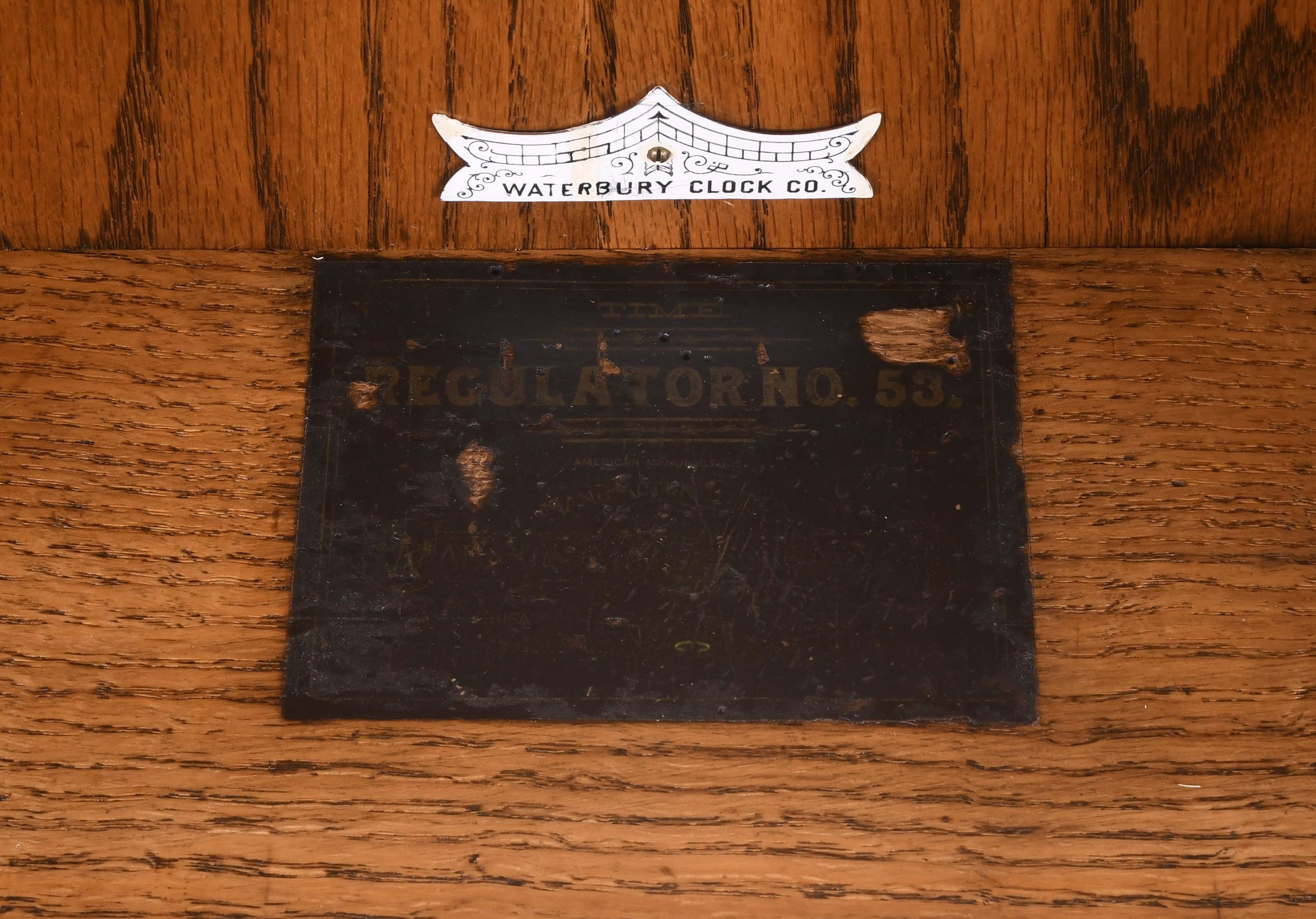 Waterbury Clock Co., Waterbury, Conn., "Regulator No. 53" hanging clock in an oak case, roman numeral painted metal dial, serpentine hands, eight day, time only brass movement driven by two weights