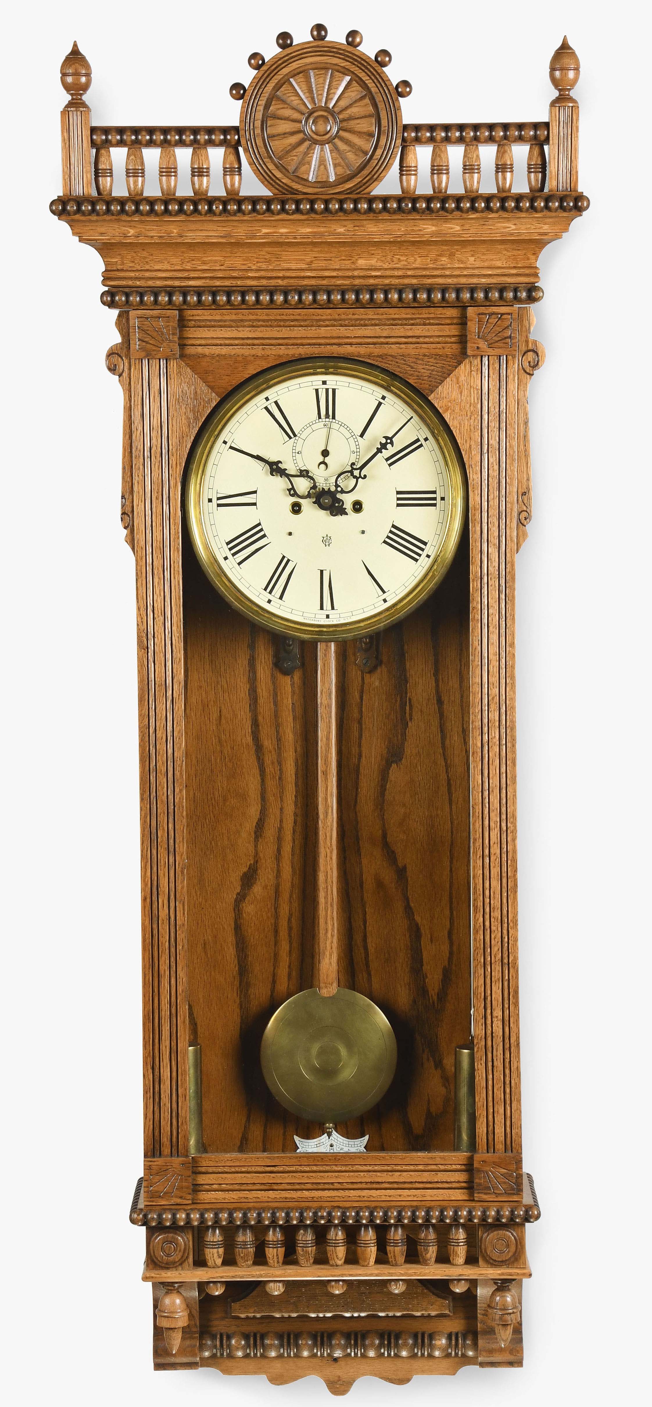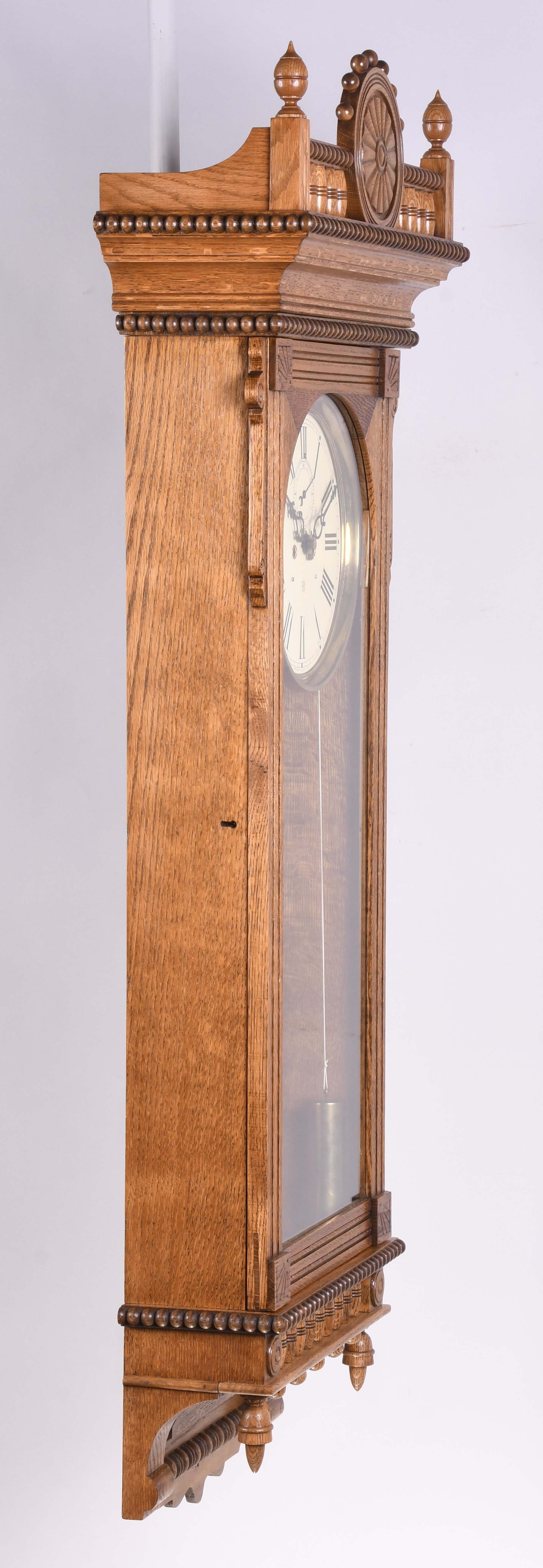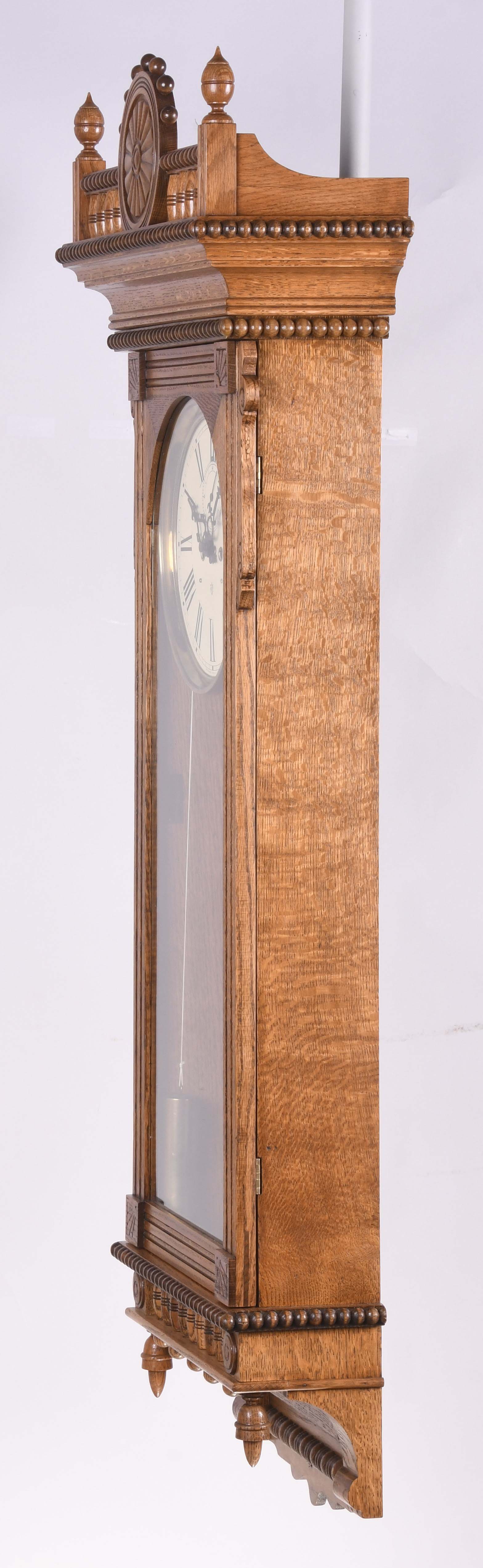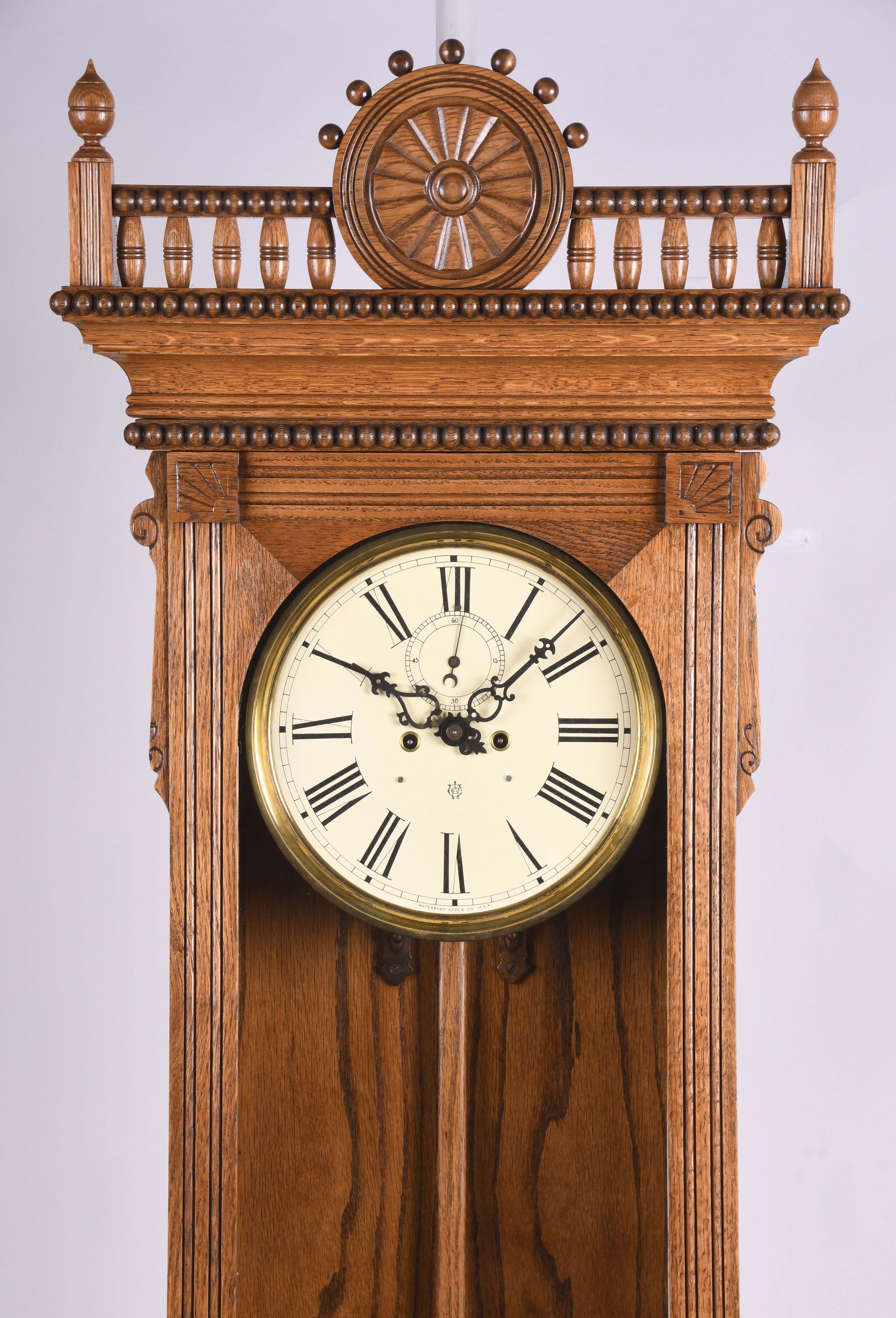 Waterbury Clock Co., Waterbury, Conn., "Regulator No. 53" hanging clock in an oak case, roman numeral painted metal dial, serpentine hands, eight day, time only brass movement driven by two weights