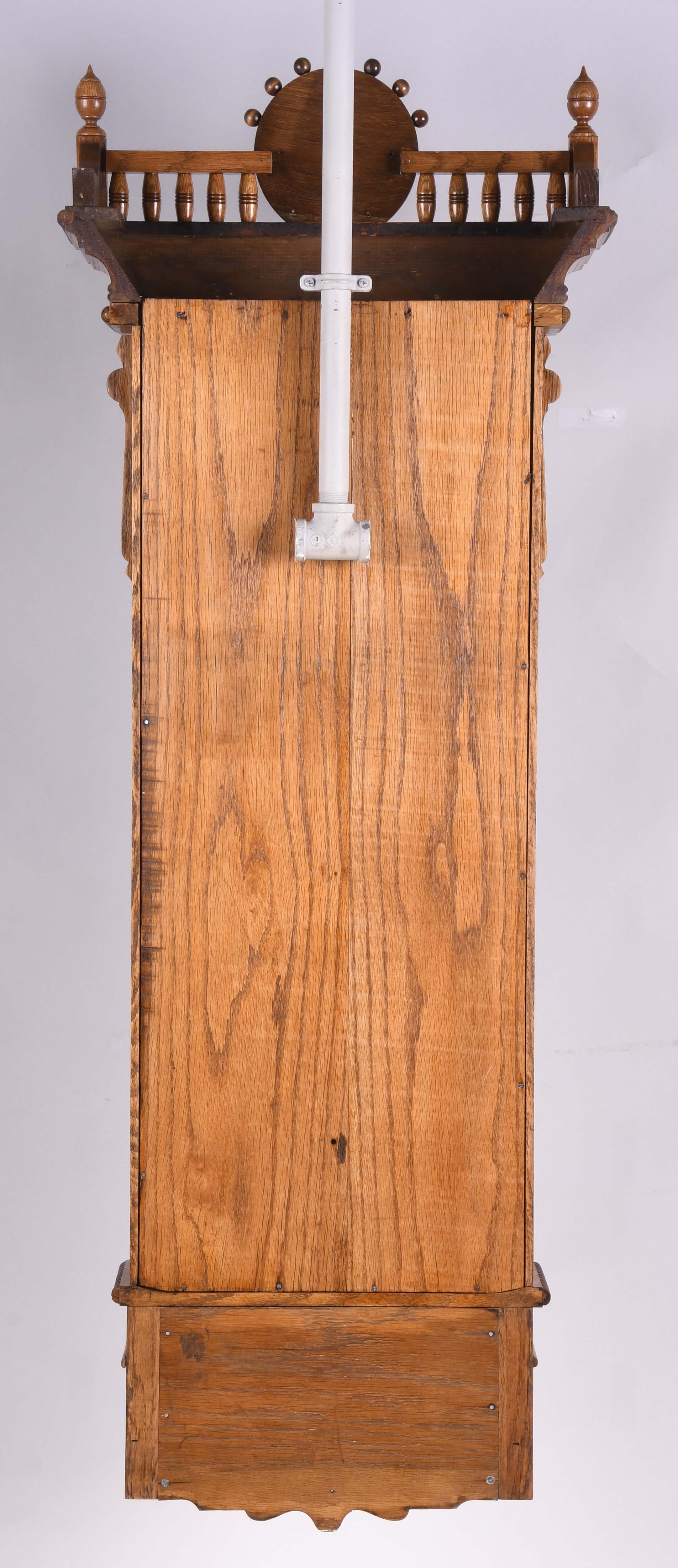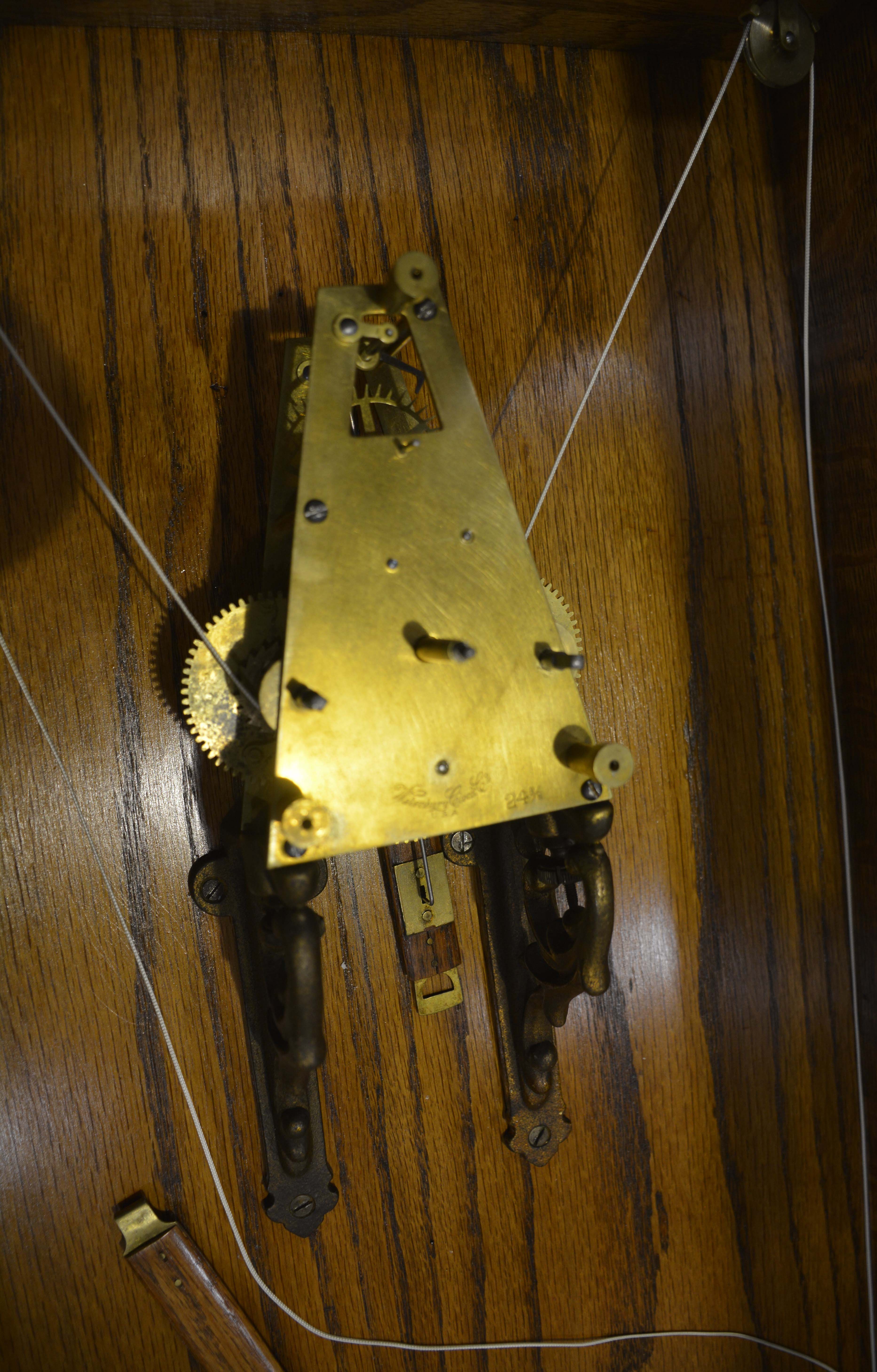 refinished oak case in good clean condition, repainted dial, original hands and pendulum, movement is signed, partial label inside.