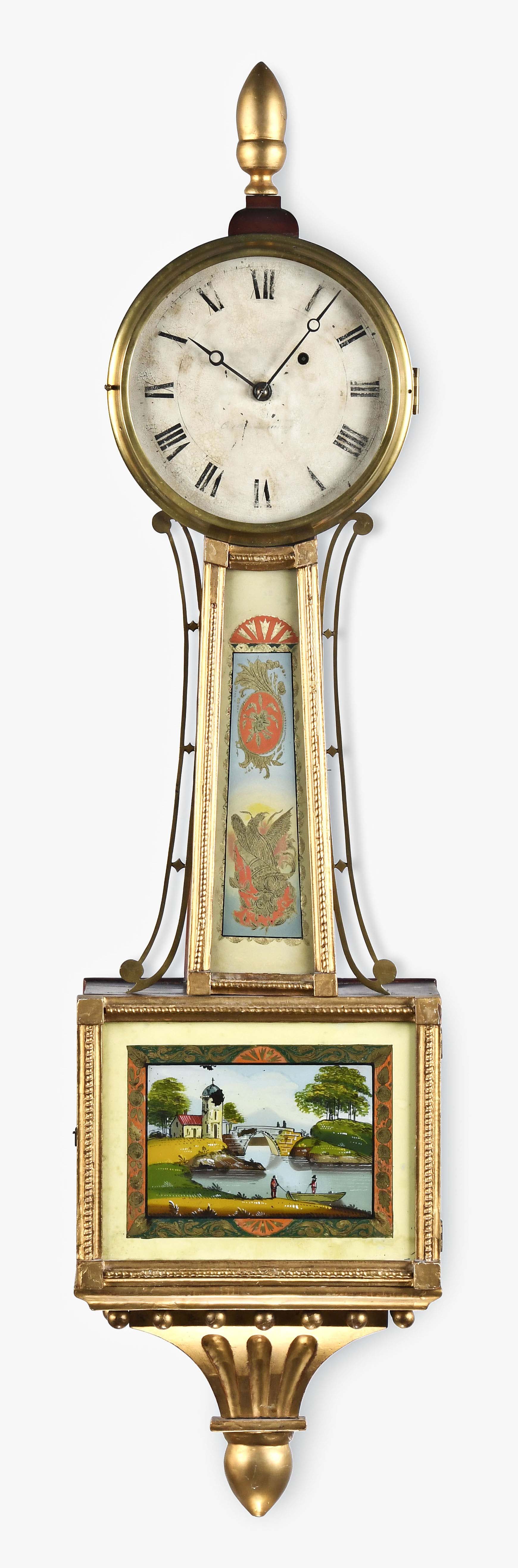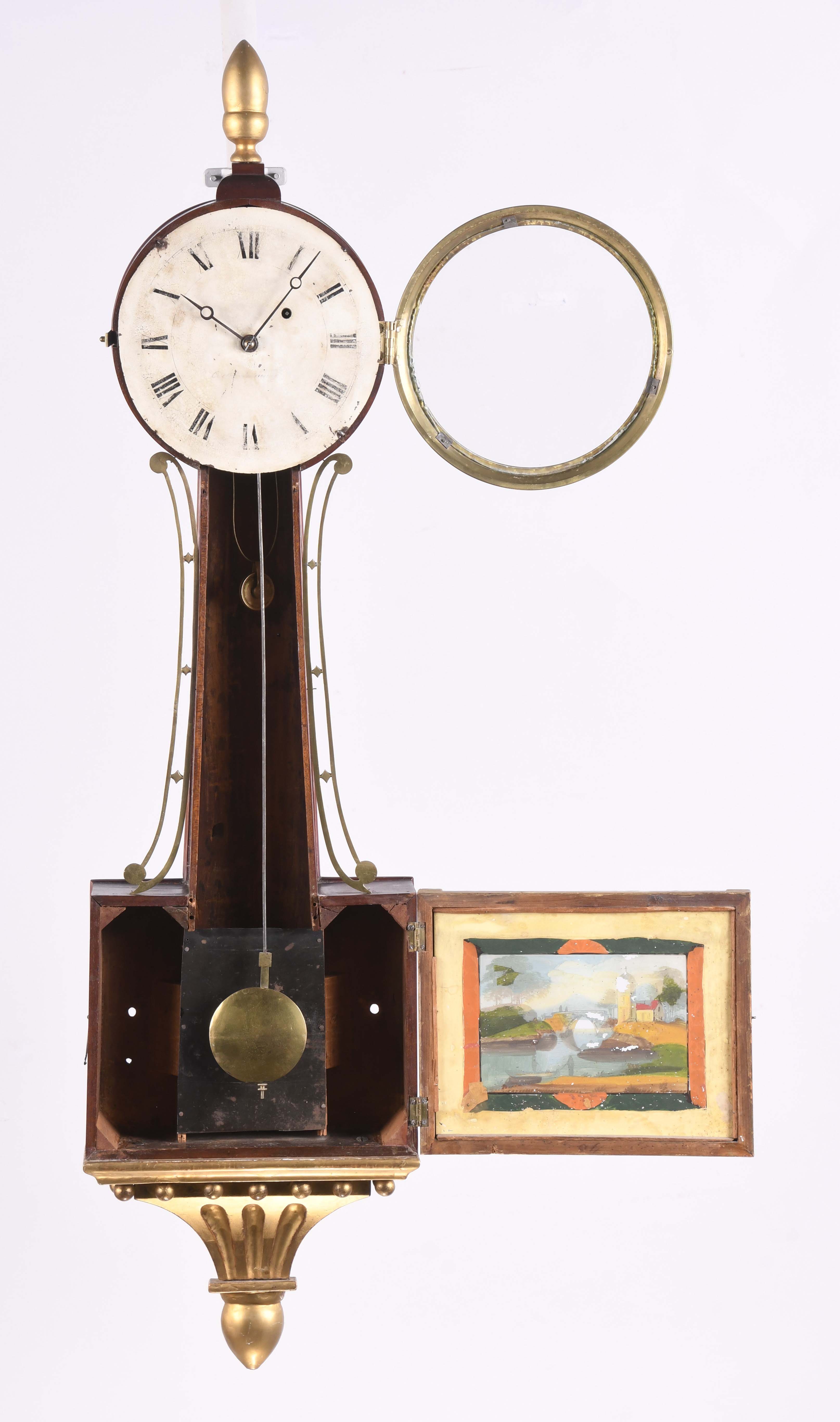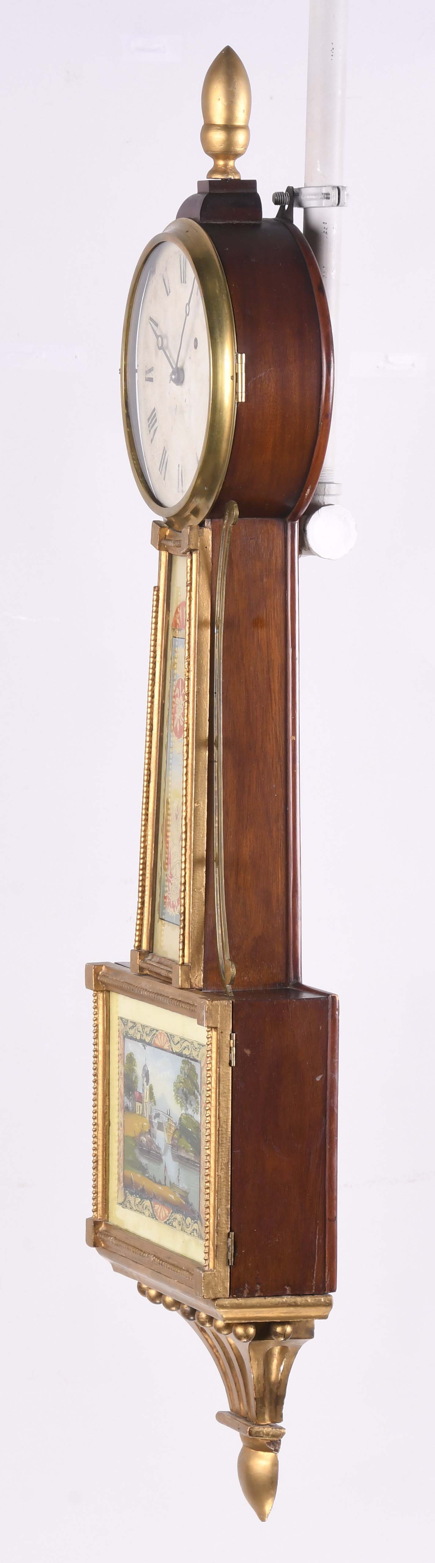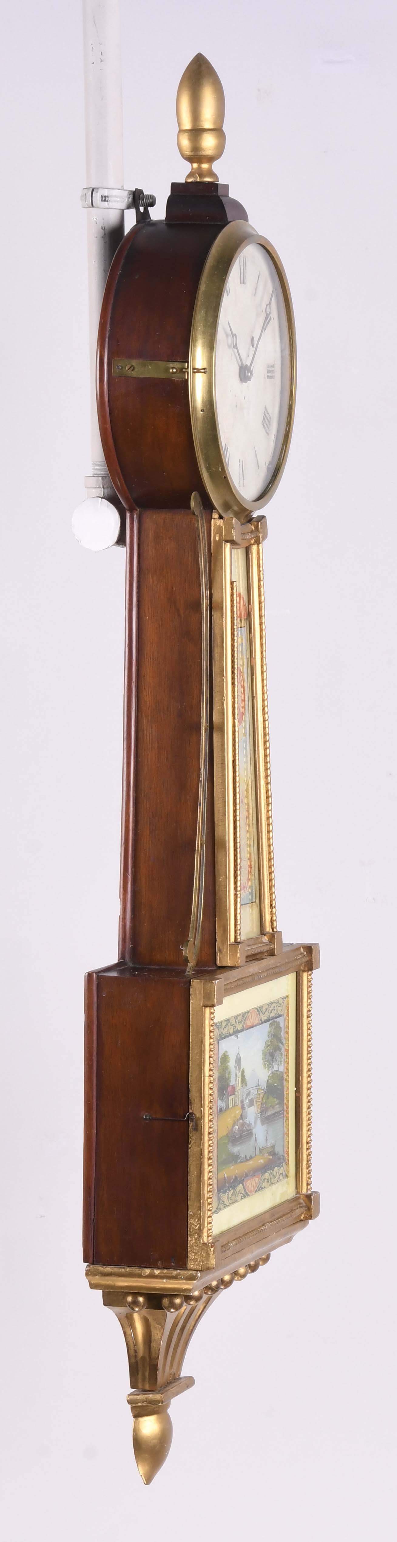 Curtis & Dunning, Concord, Mass., patent timepiece or hanging banjo clock in a gilt and mahogany case, roman numeral painted metal dial, moon hands, eight day, time only, weight driven brass movement